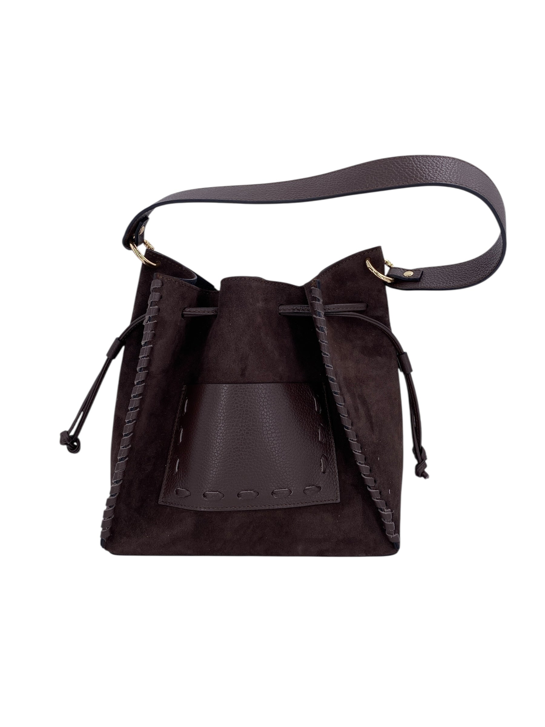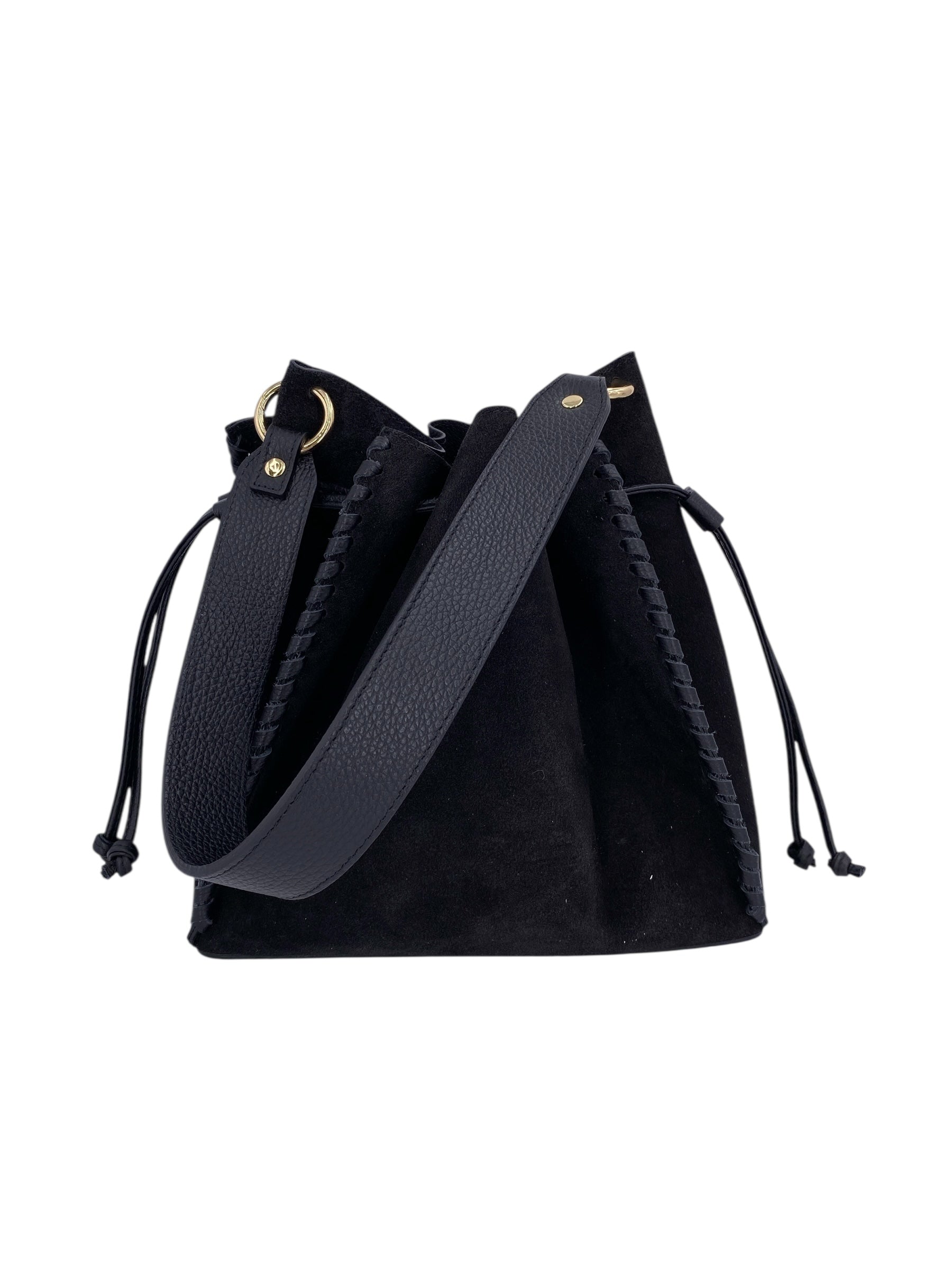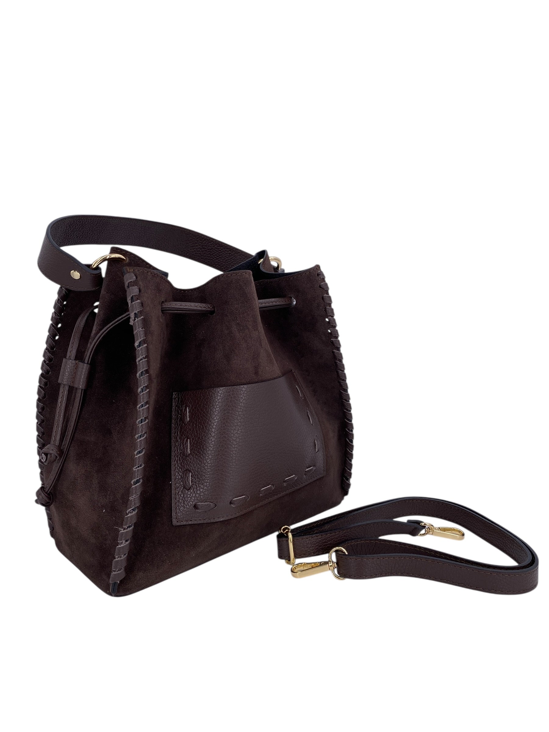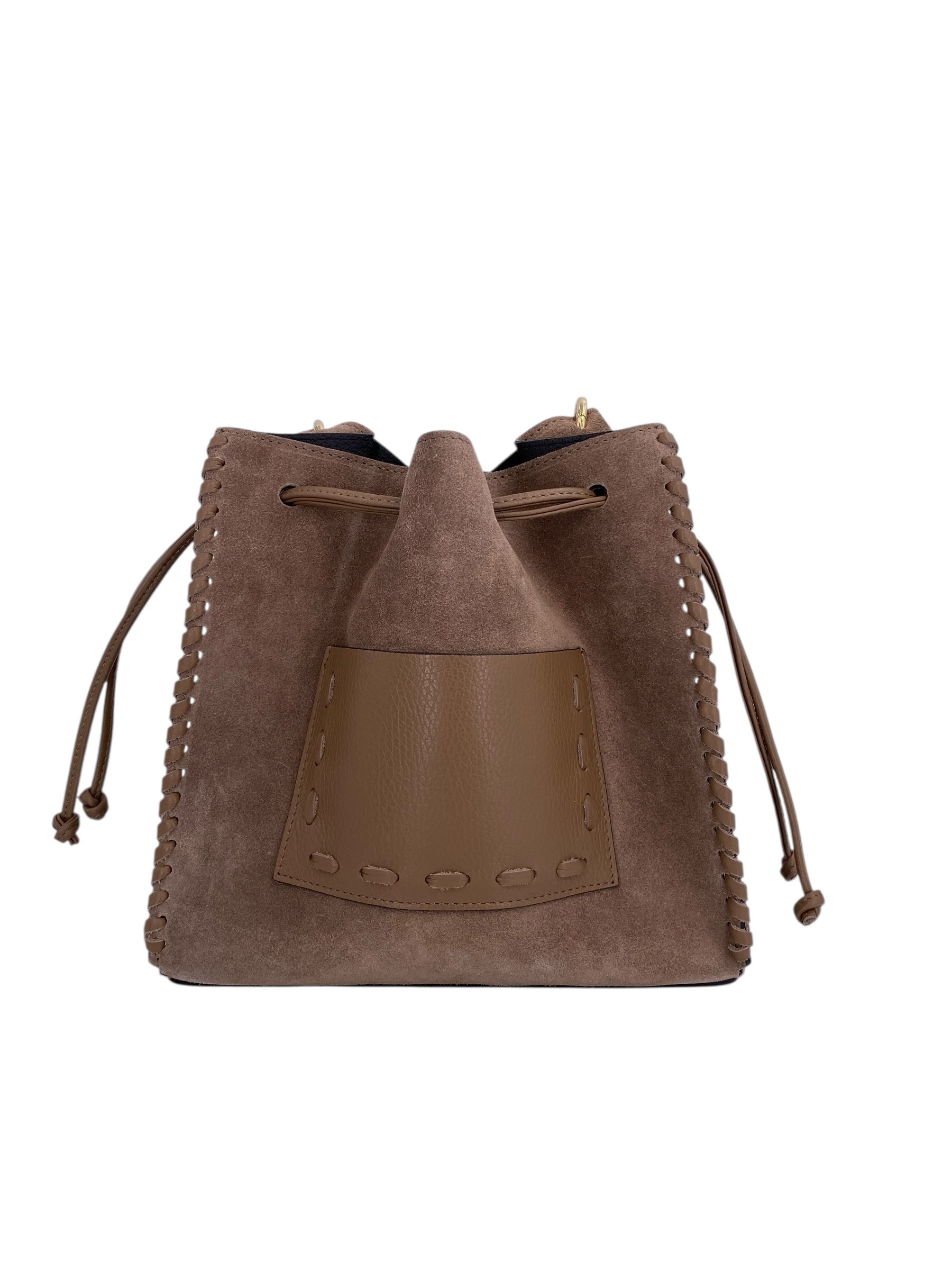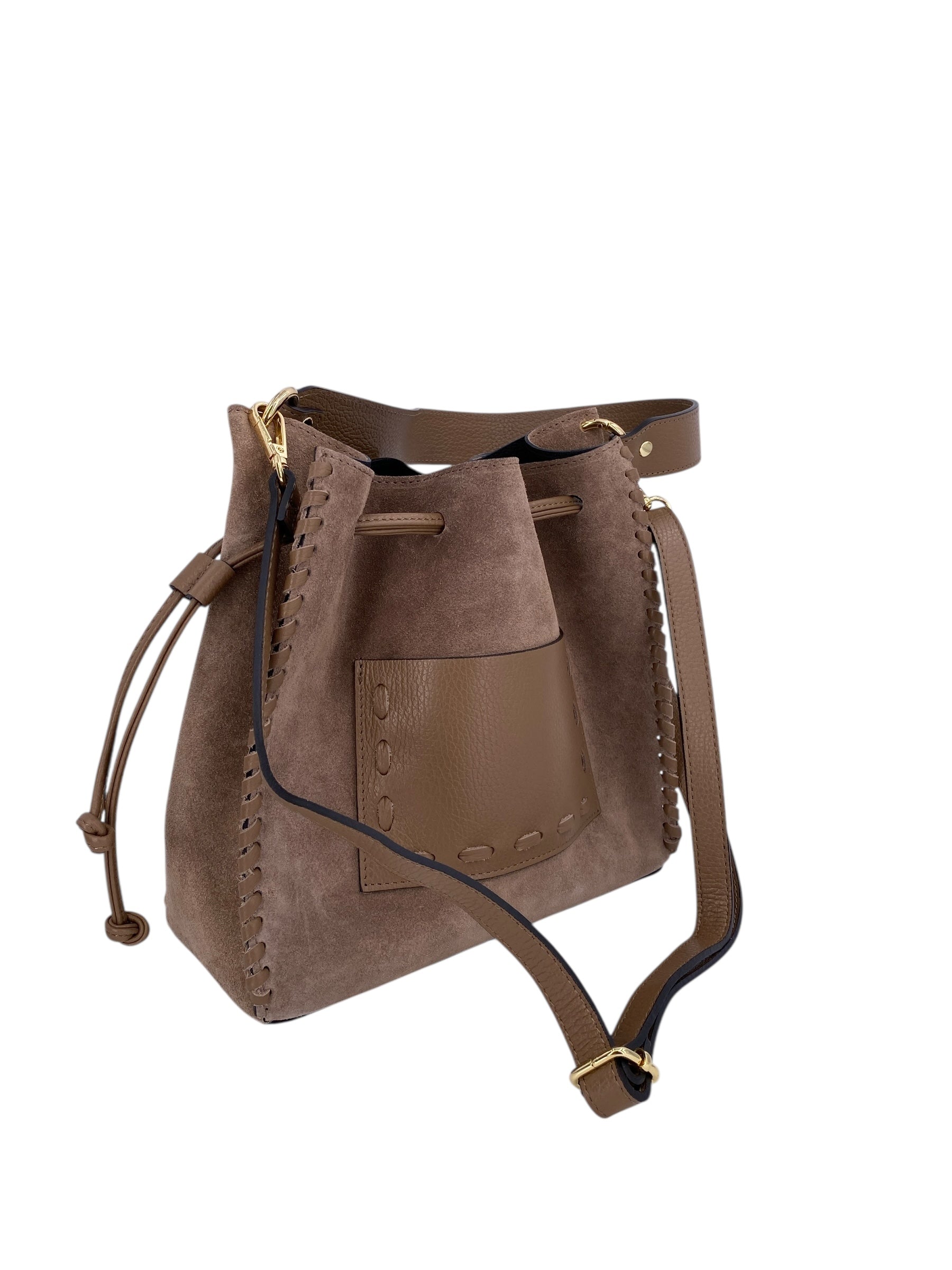 La borsa Alix è un elegante secchiello che unisce tradizione artigianale e design contemporaneo. Realizzata in vera pelle e morbido camoscio, si distingue per le sue linee pulite, i dettagli ricercati e la praticità che la rende perfetta per l’uso quotidiano.
