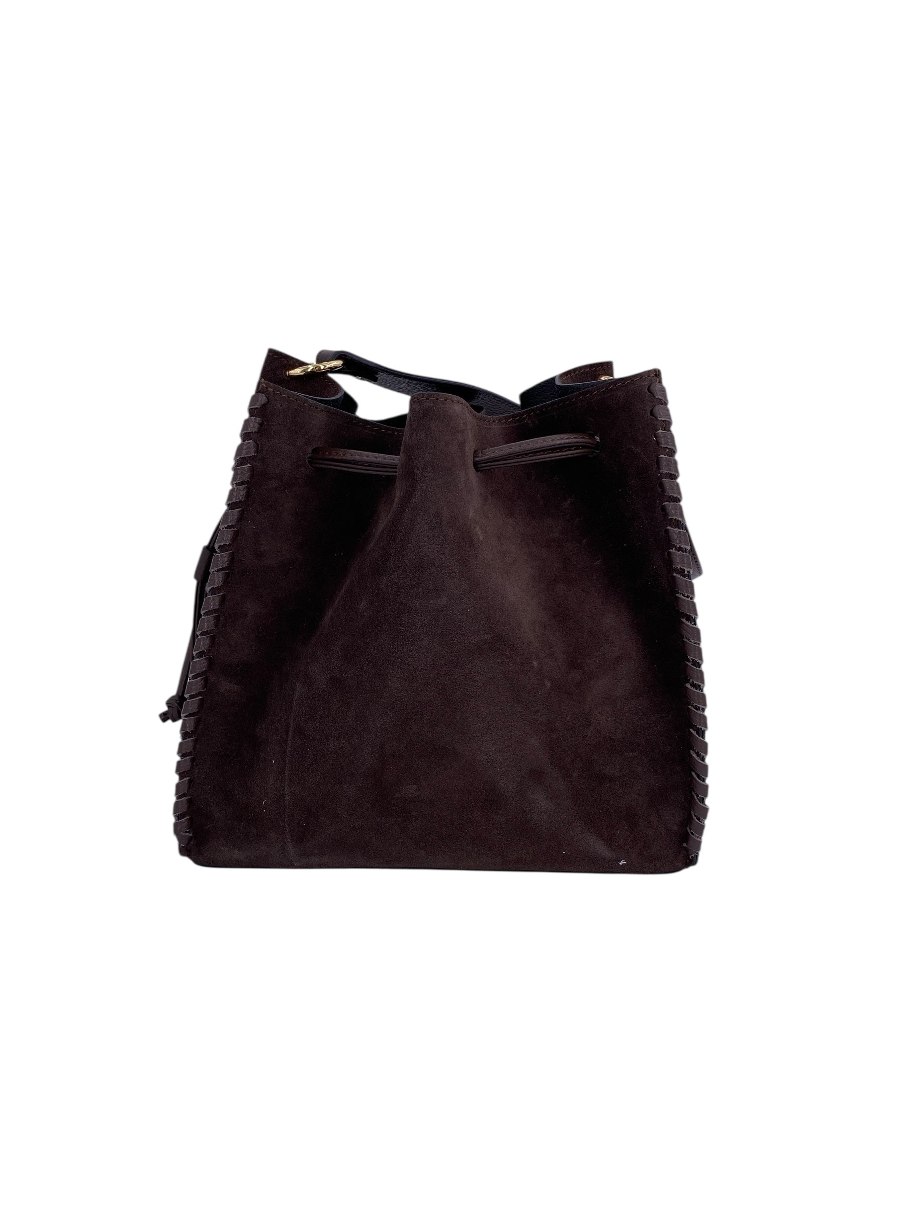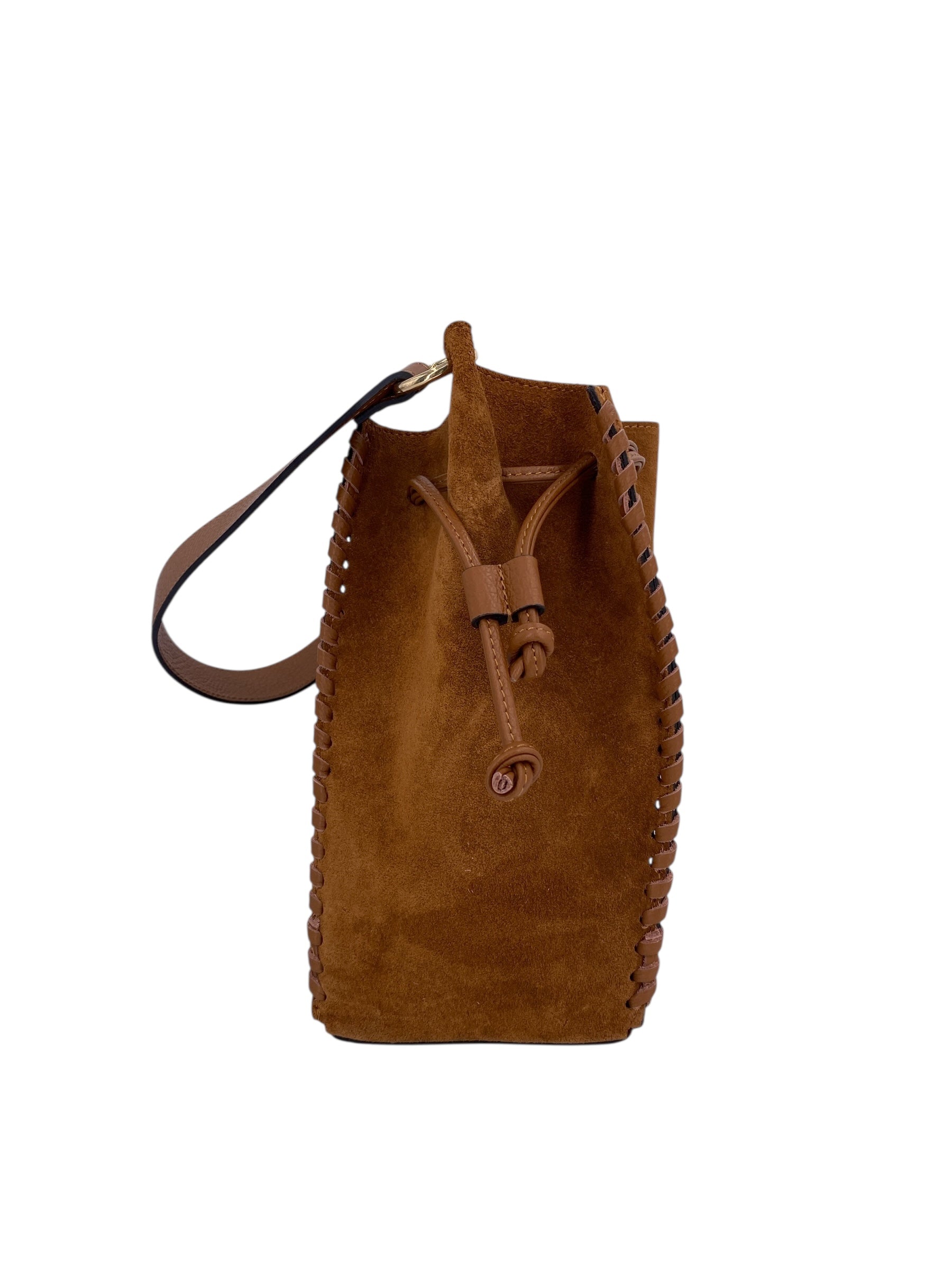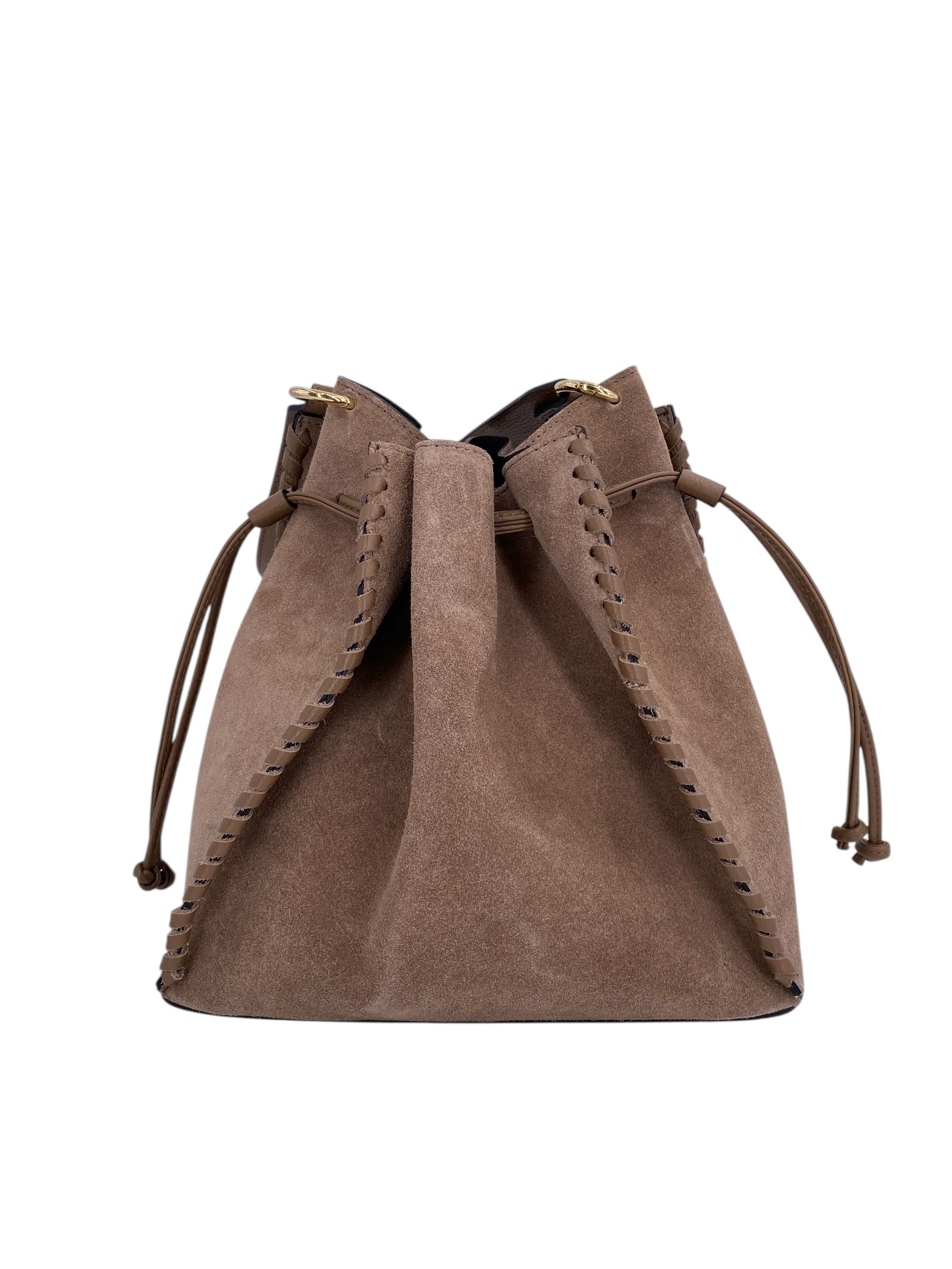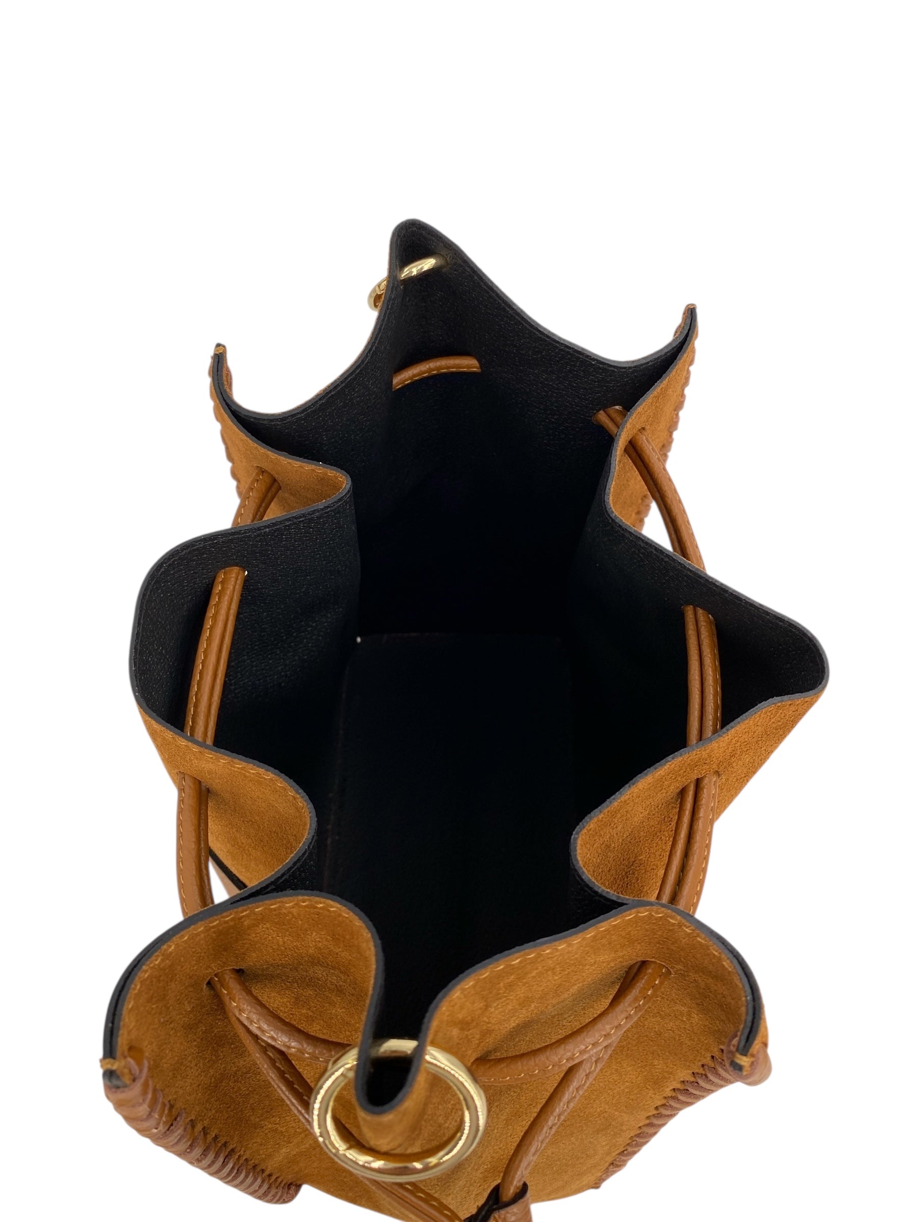 Struttura: forma a secchiello morbida ma strutturata, con cuciture a vista e dettagli intrecciati sui lati che ne esaltano lo stile artigianale.