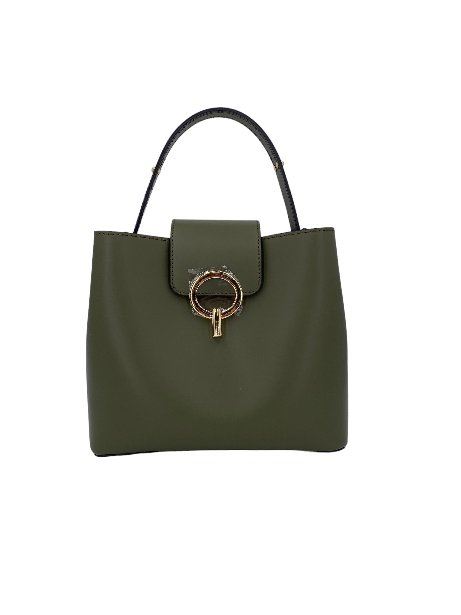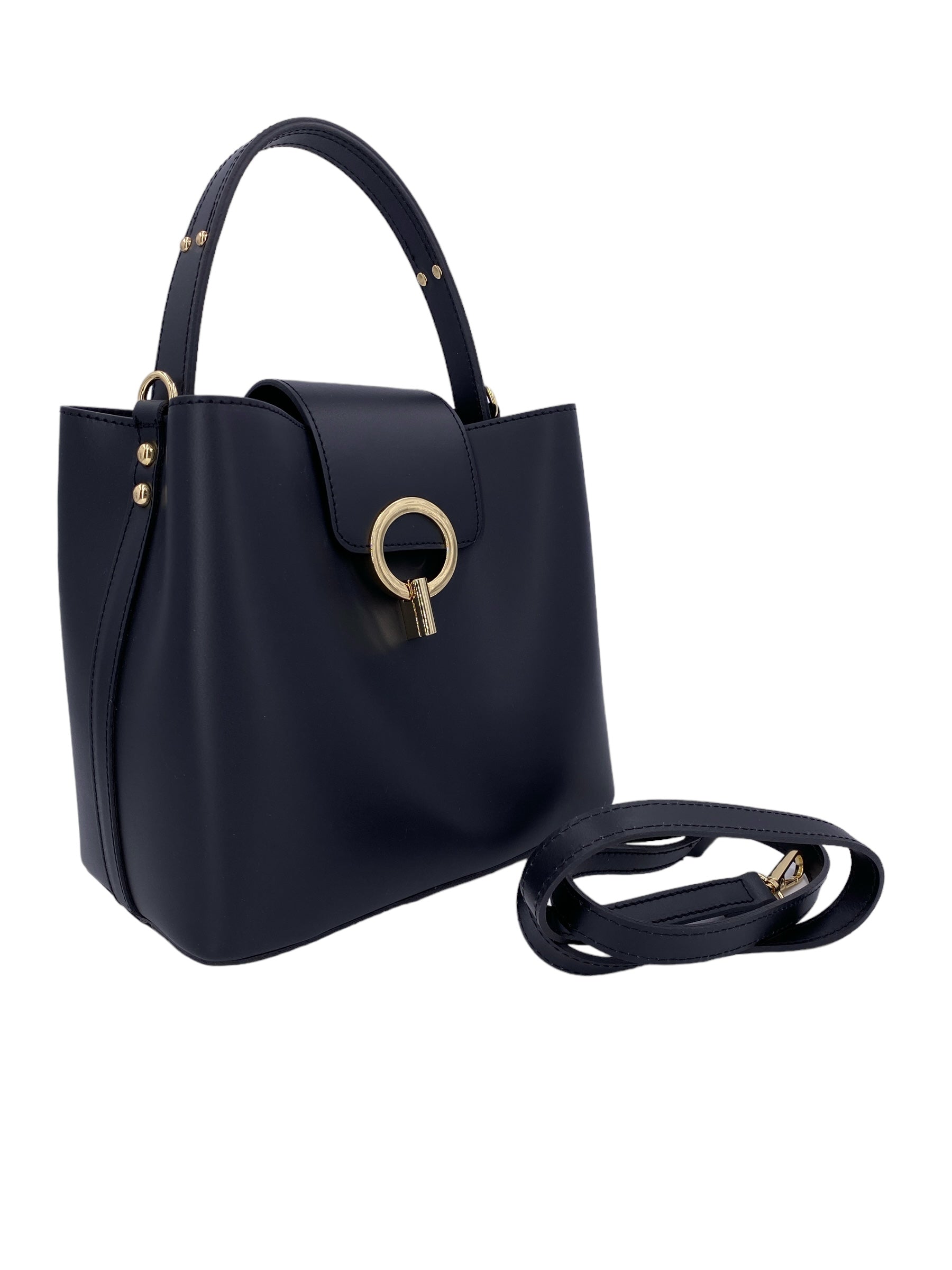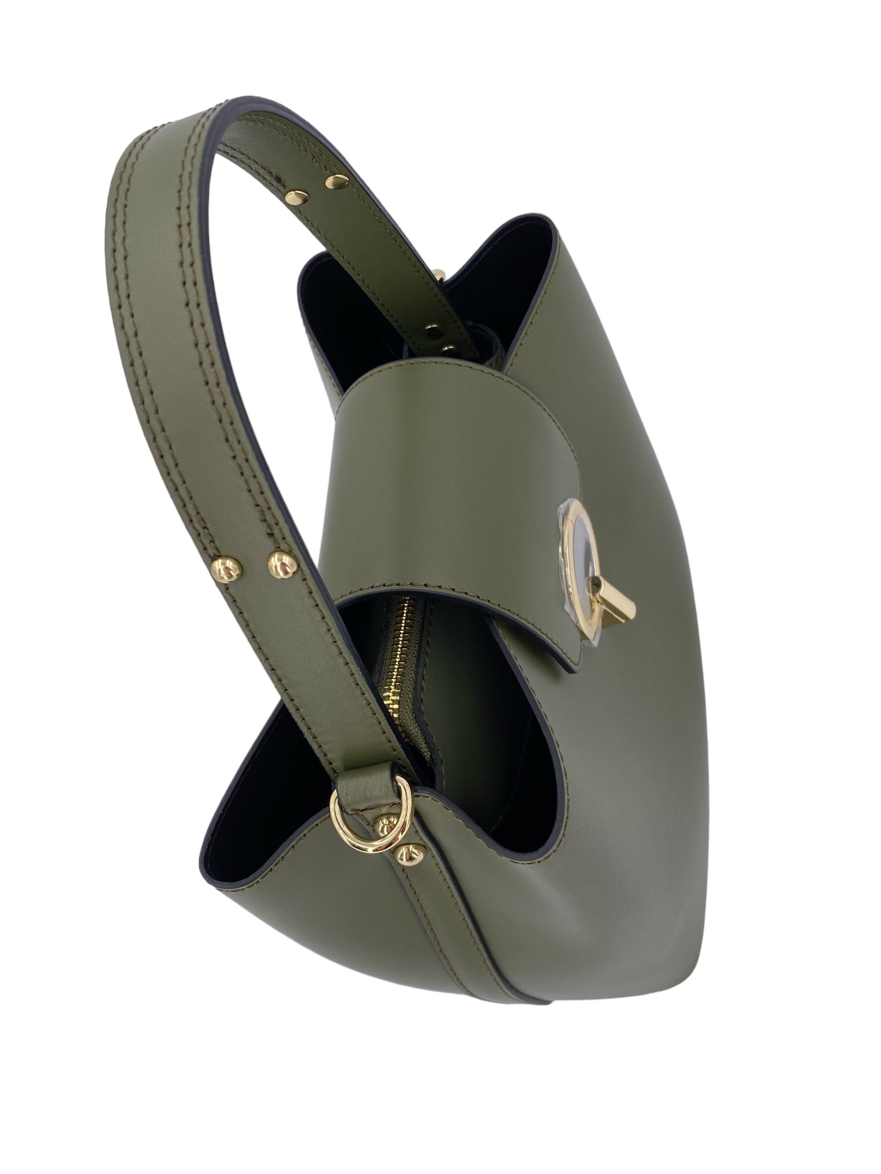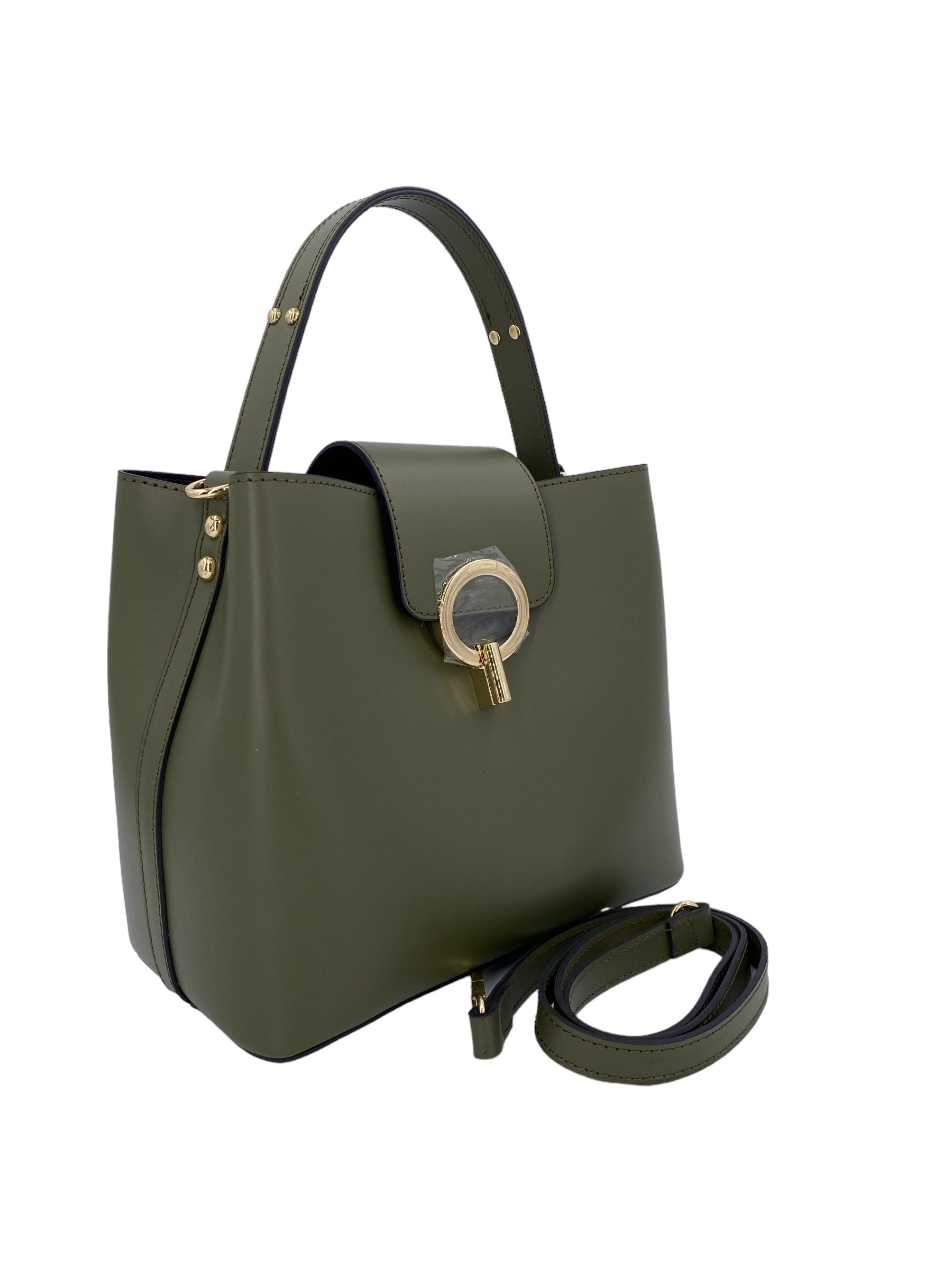 Chiusura con patta a calamita impreziosita da un anello metallico dorato con chiusura a girello: un dettaglio iconico dal carattere deciso.