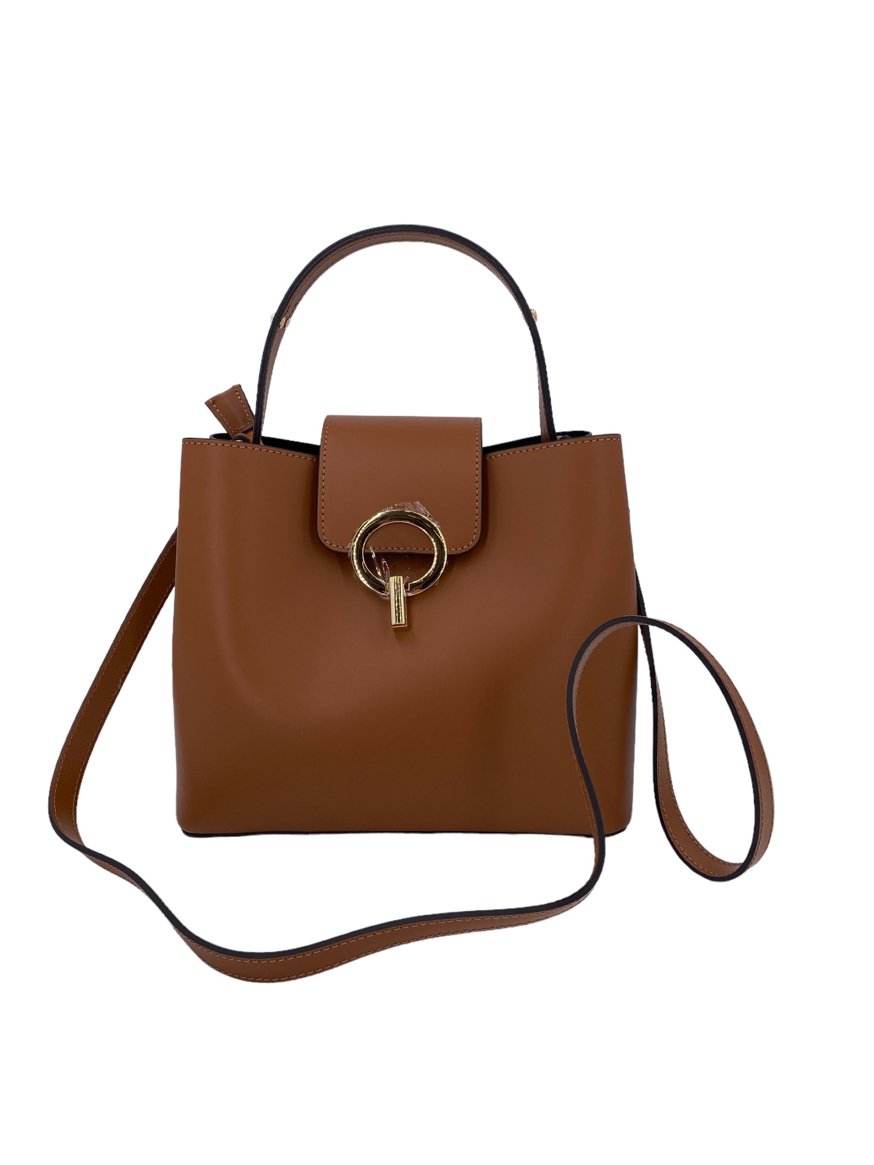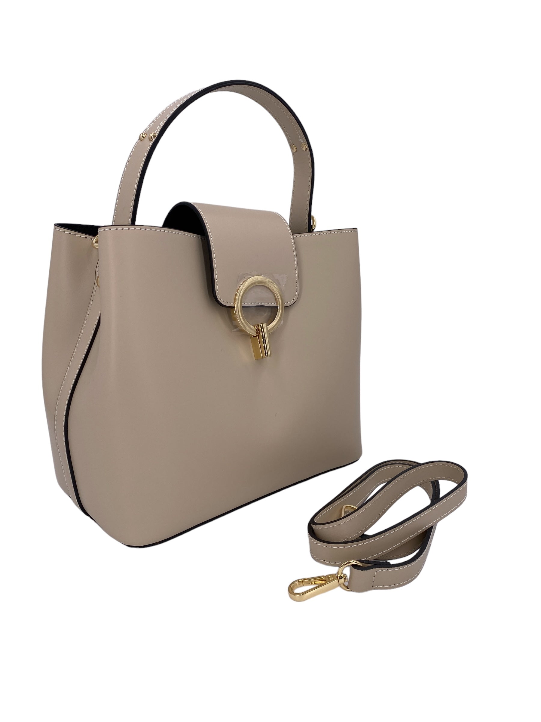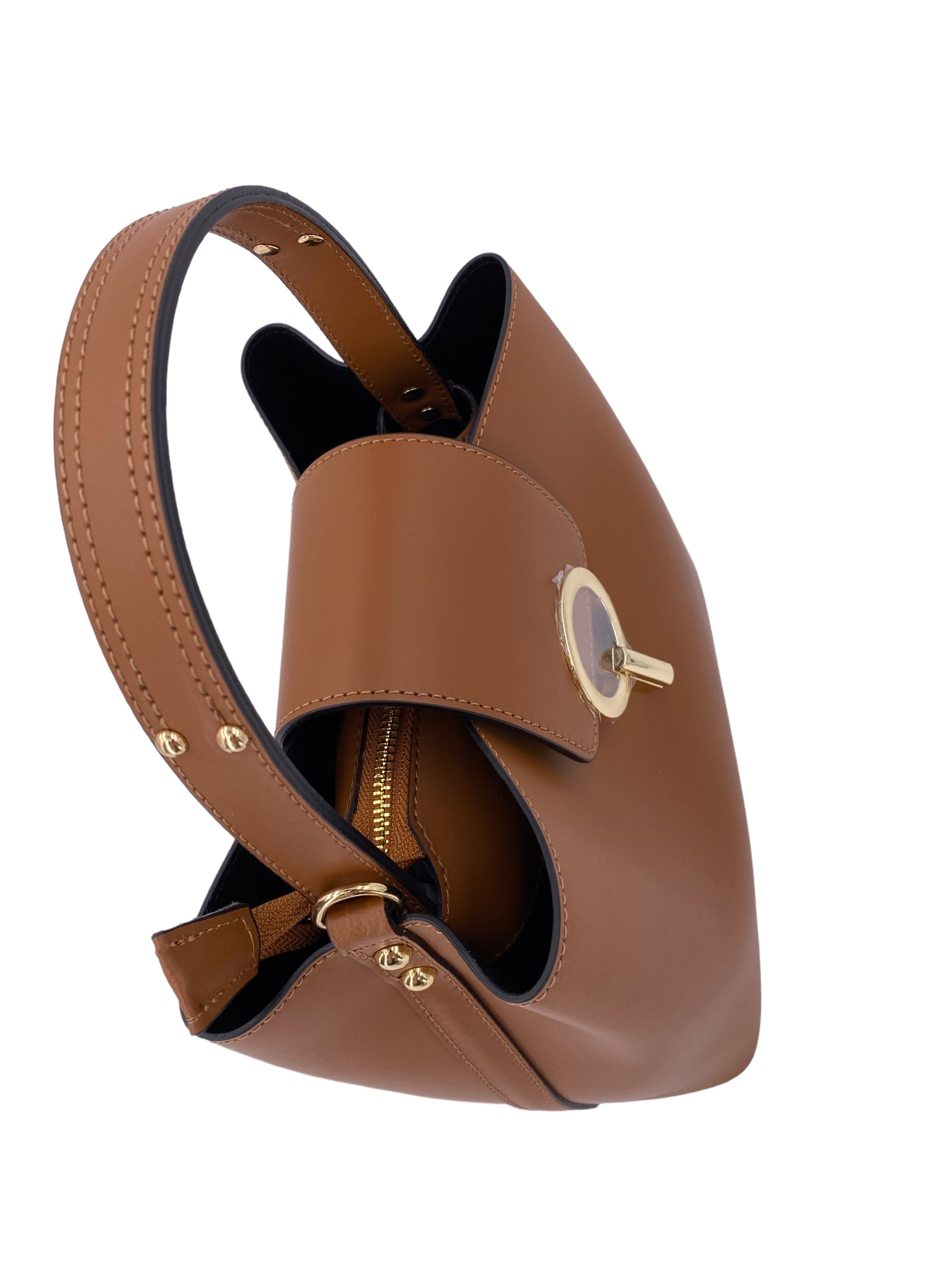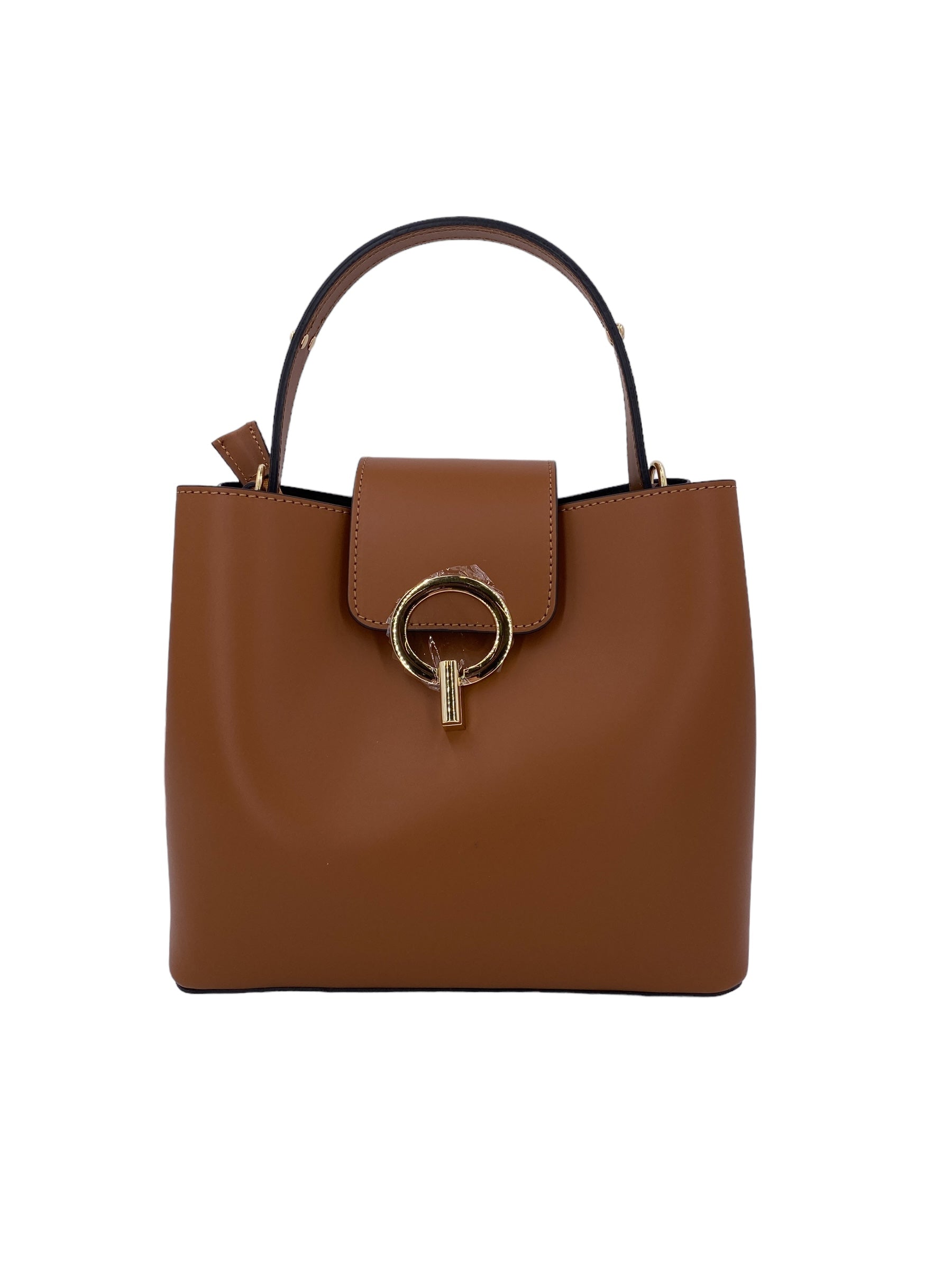 Chiusura con patta a calamita impreziosita da un anello metallico dorato con chiusura a girello: un dettaglio iconico dal carattere deciso.
