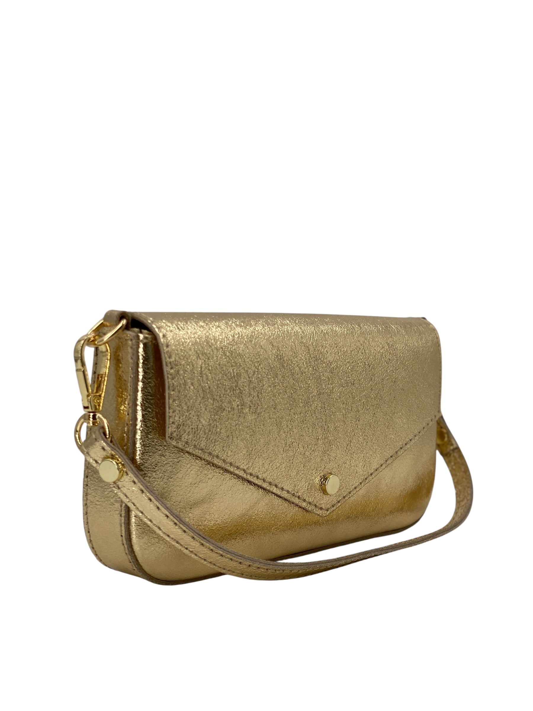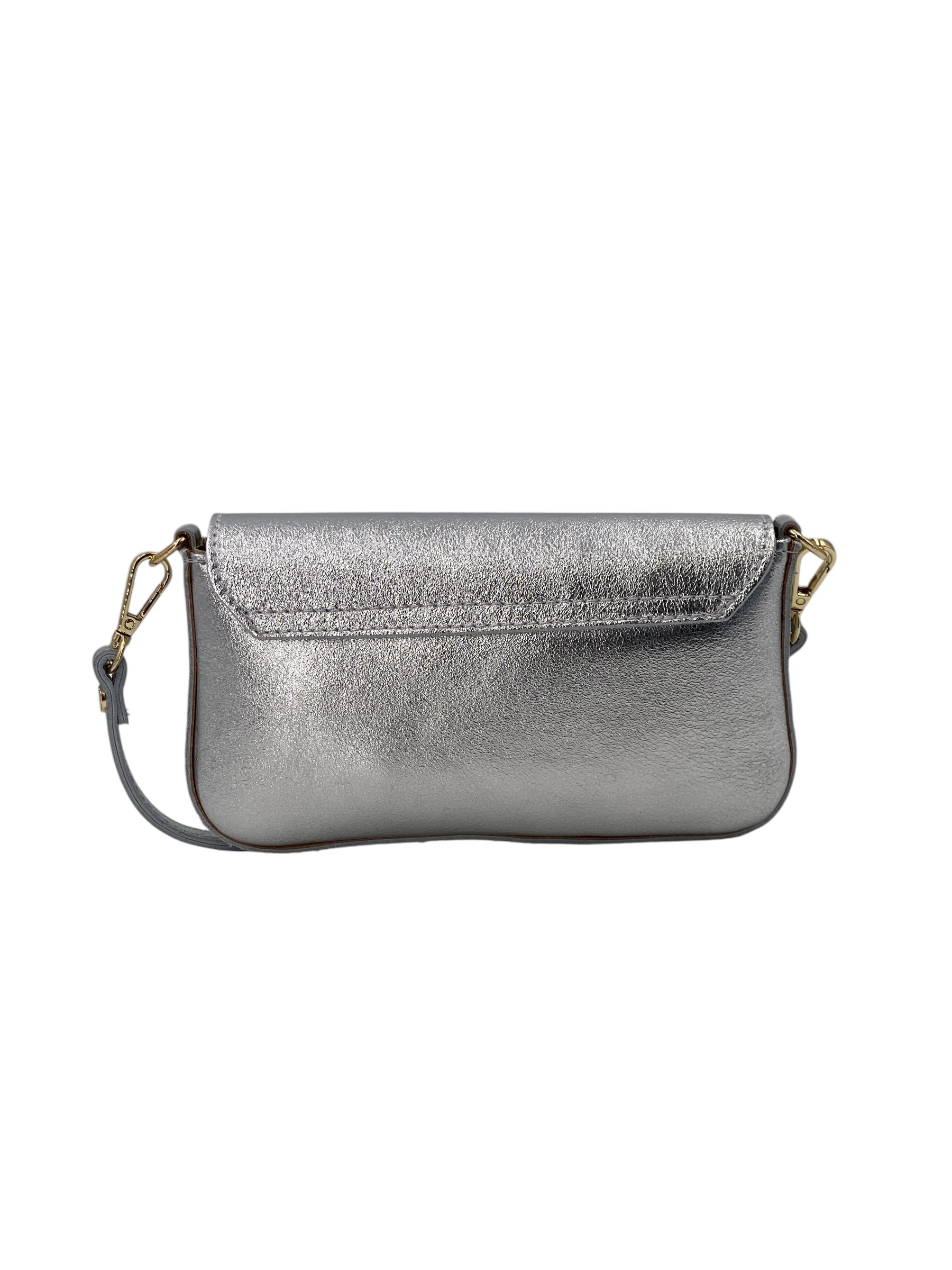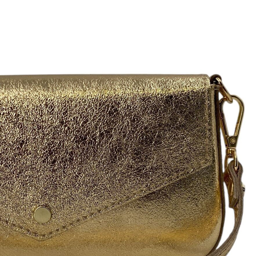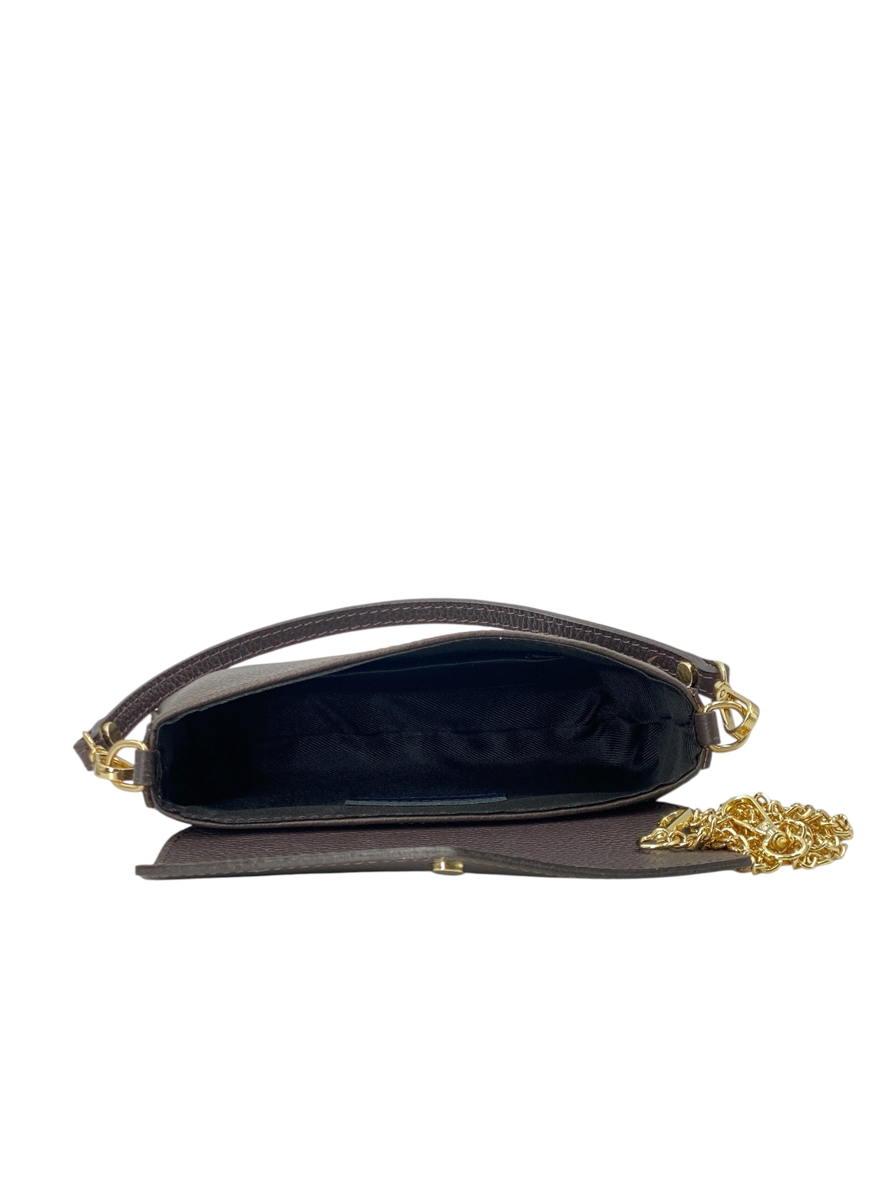 Il manico corto amovibile e la tracolla a catena dorata anch'essa removibile e inclusa permettono di indossarla sia a mano che a spalla, adattandosi con naturalezza dal giorno alla sera. L’interno foderato offre lo spazio giusto per smartphone, chiavi e piccoli oggetti indispensabili.