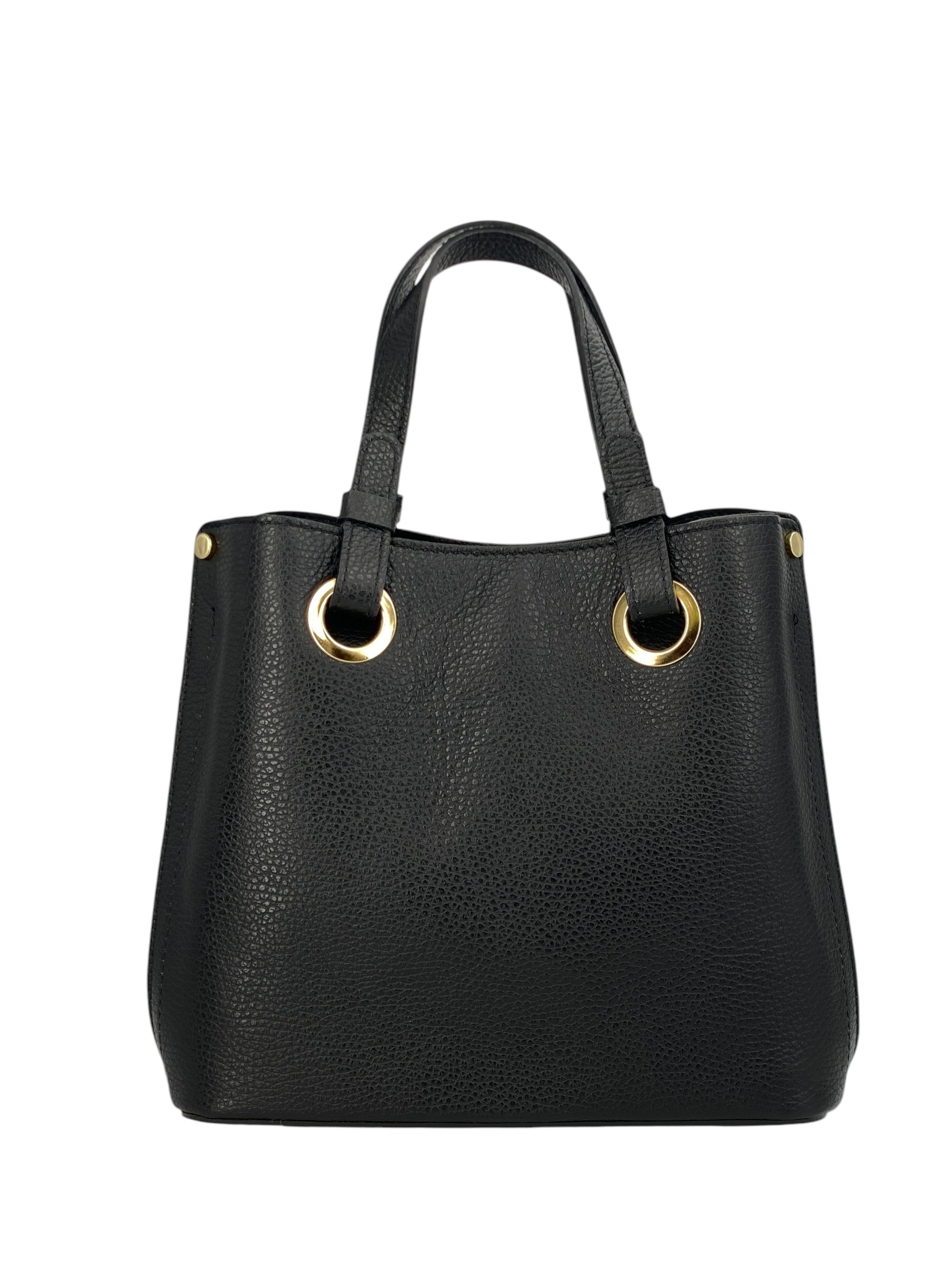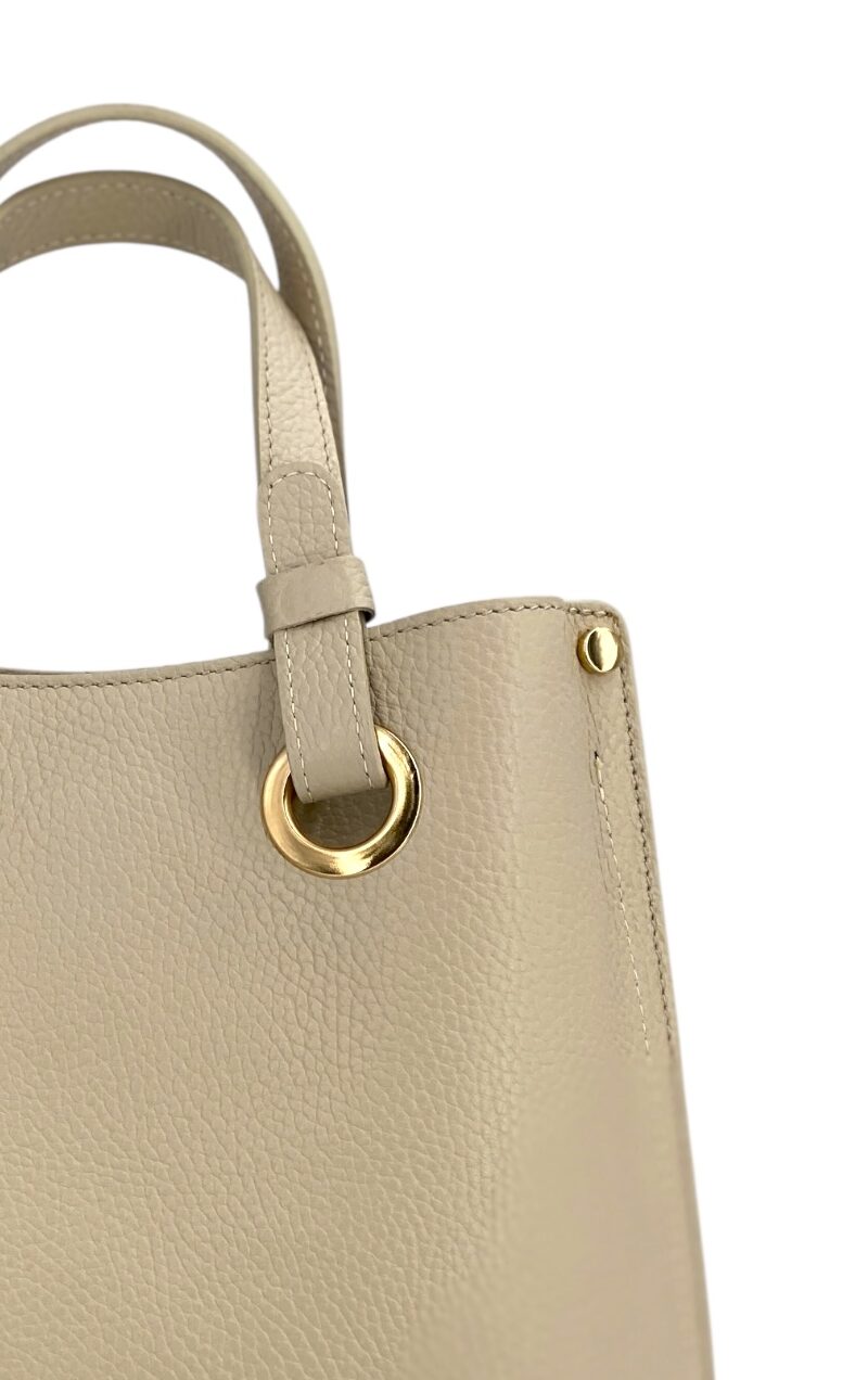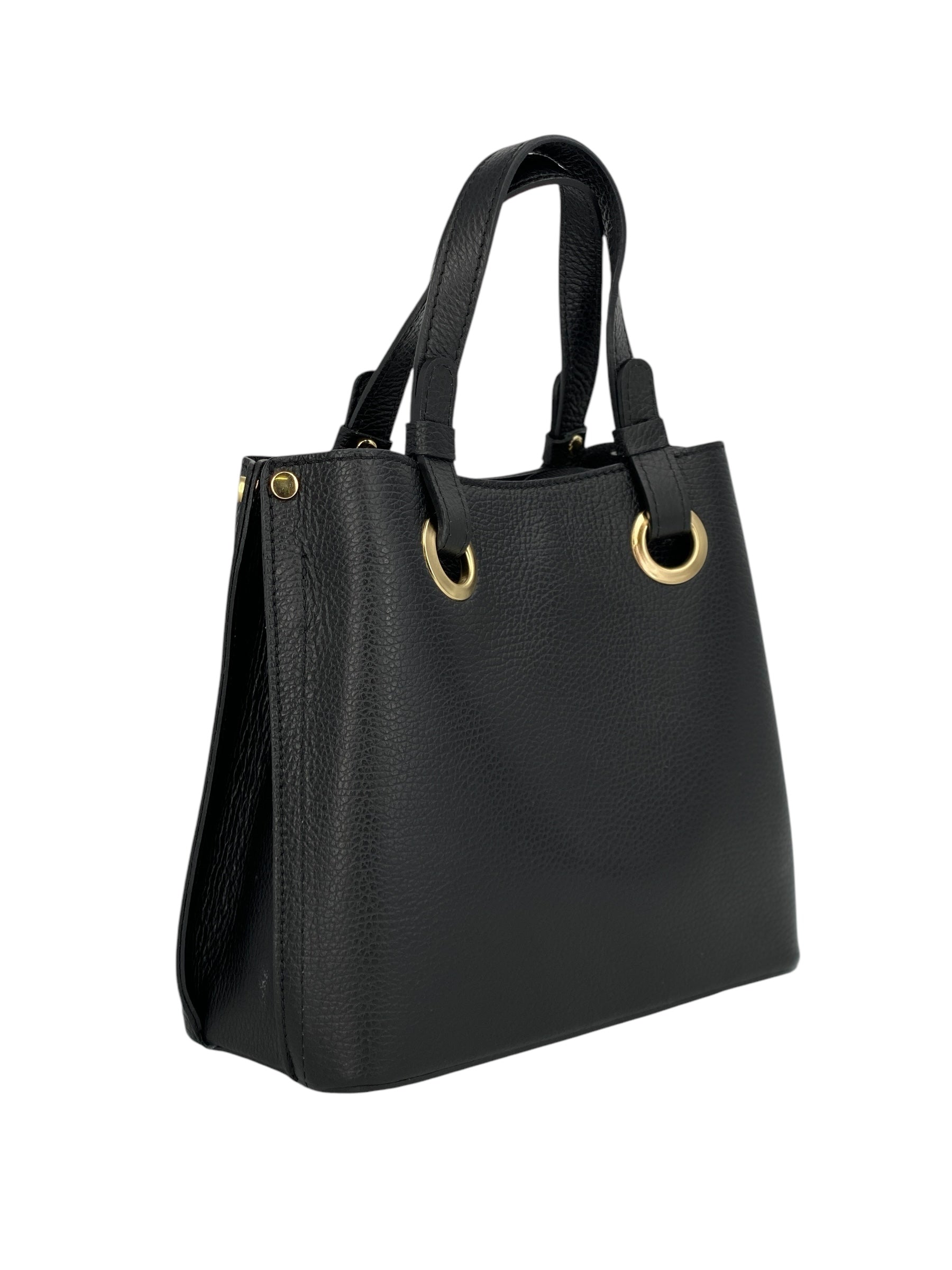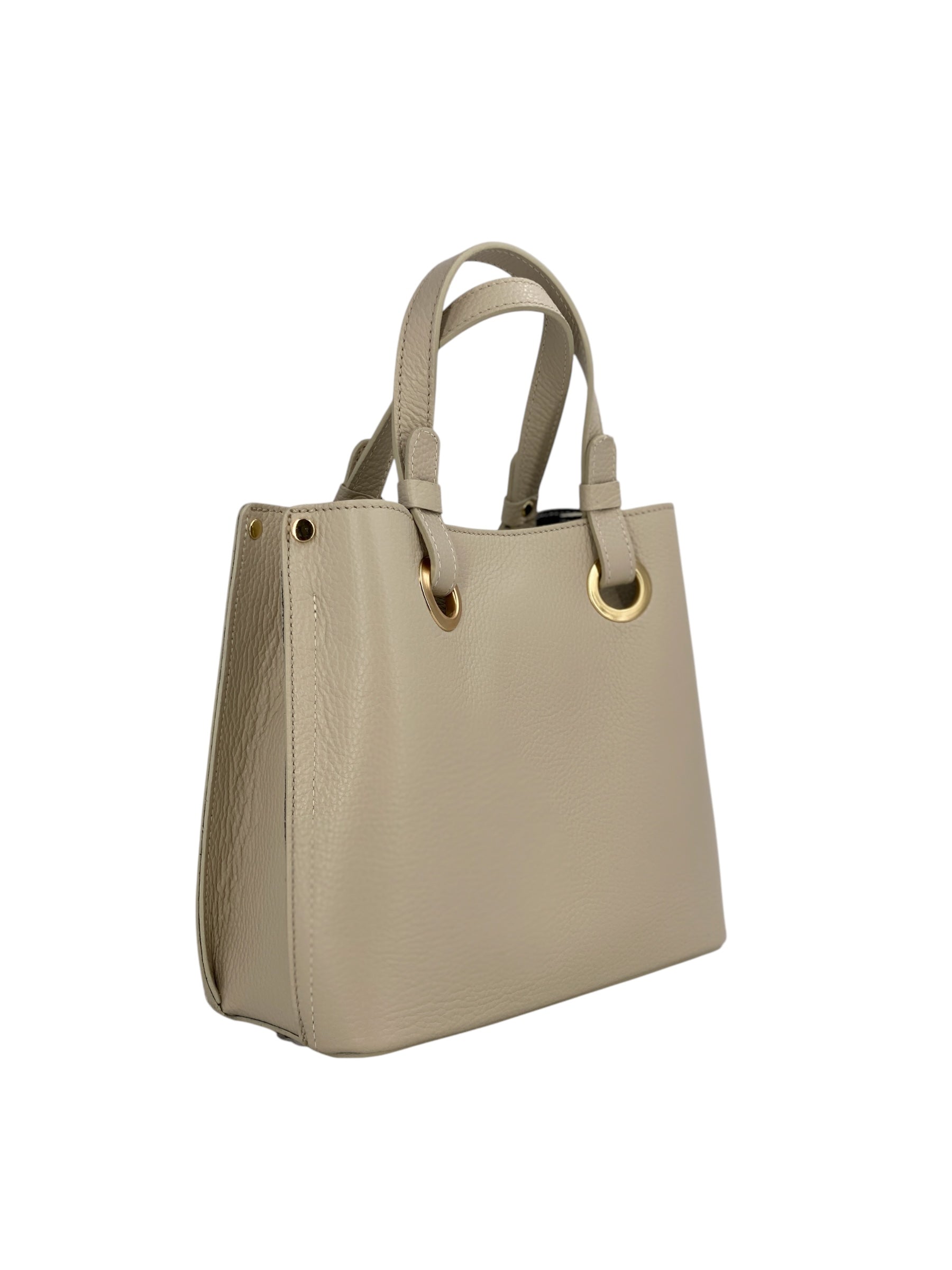 Doppio manico corto in pelle rinforzata, fissato con maxi occhielli dorati che conferiscono un tocco deciso e sofisticato.
