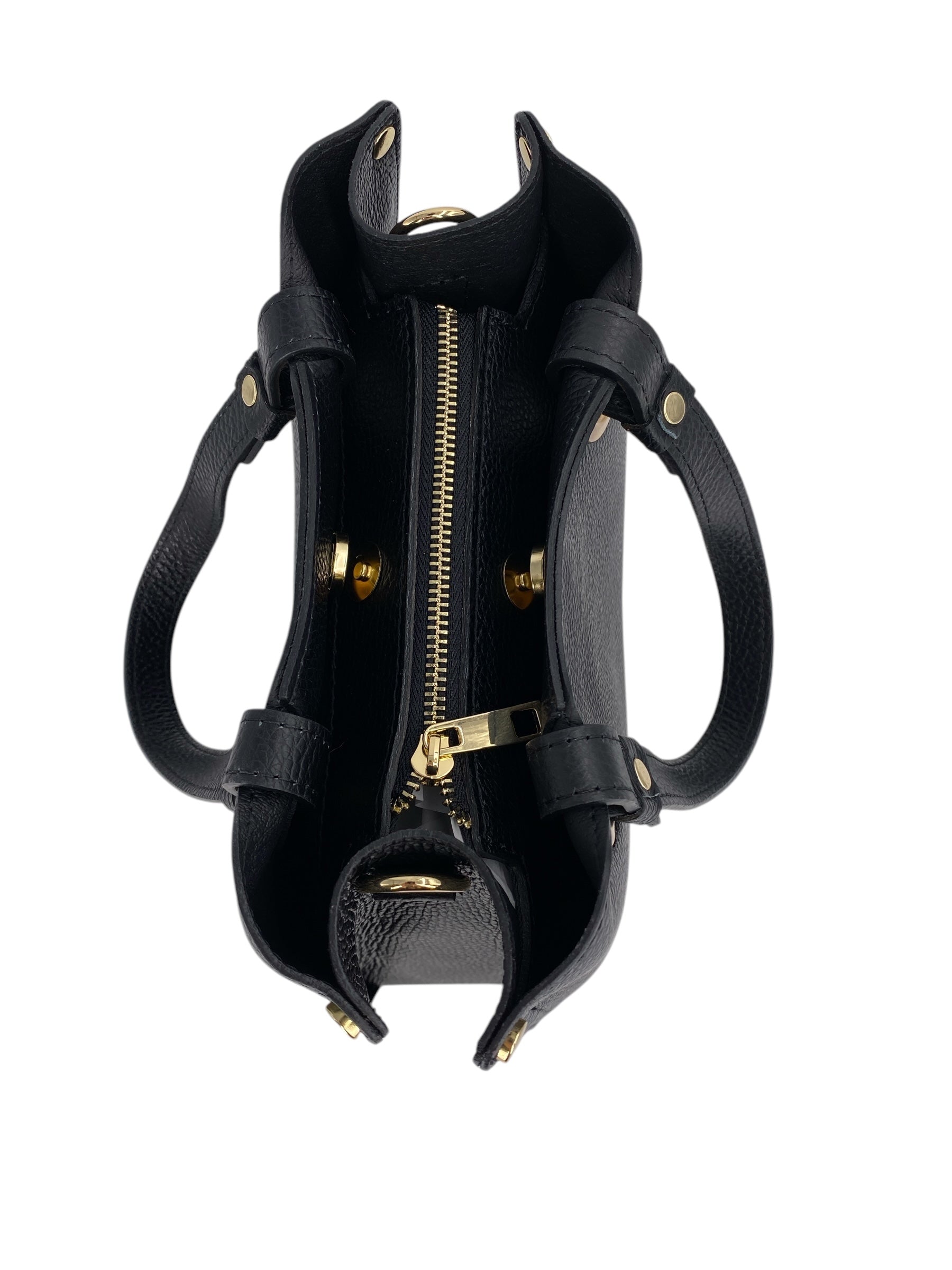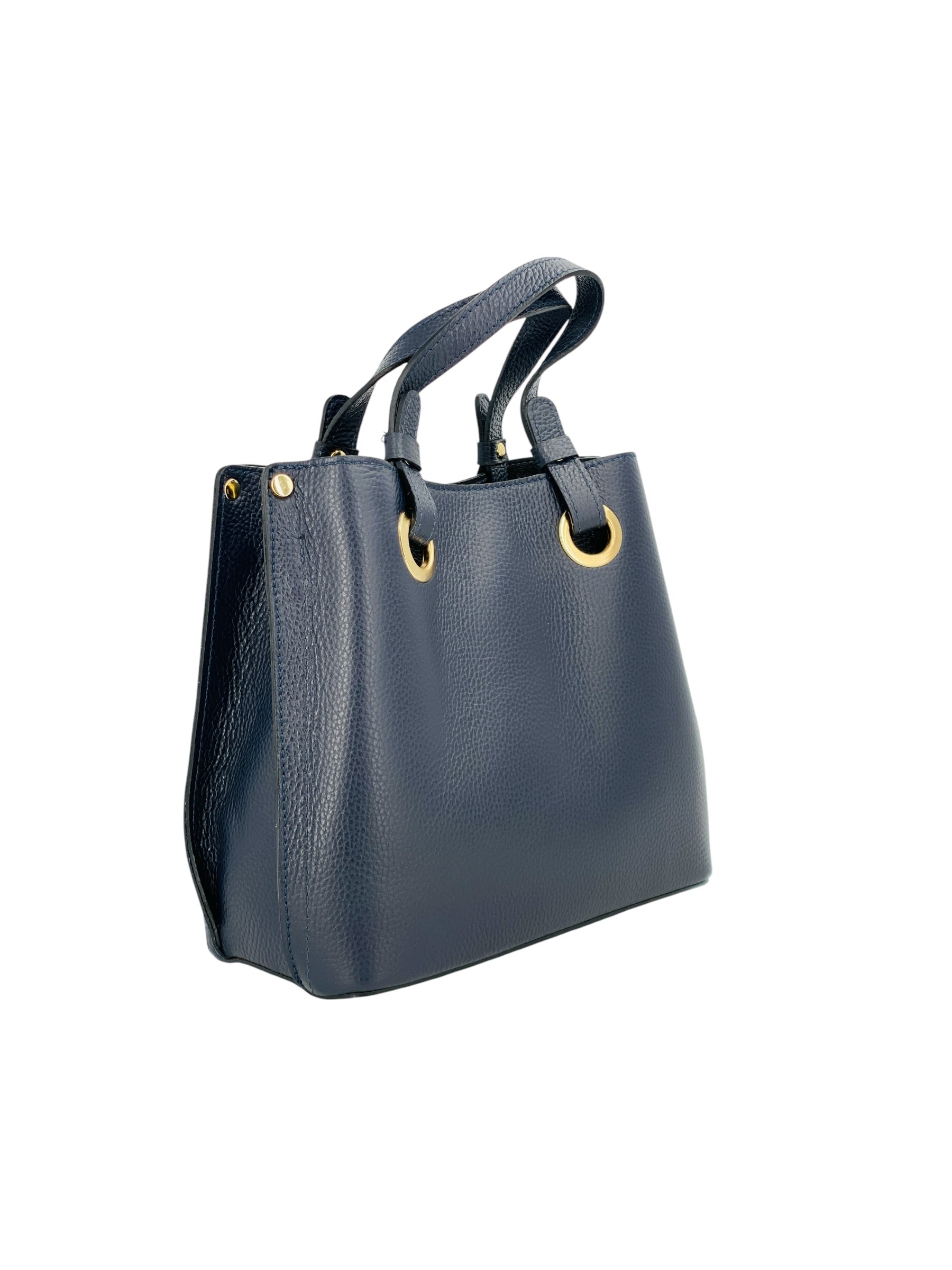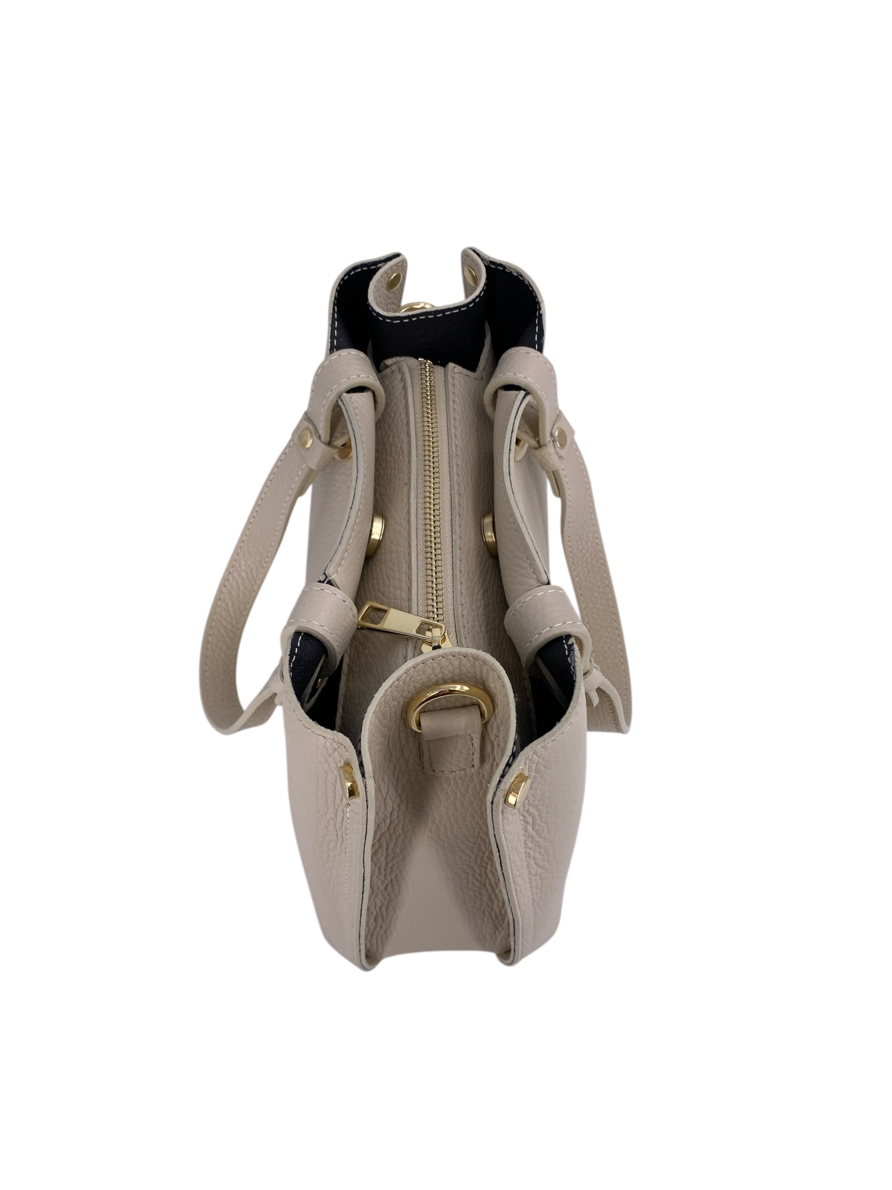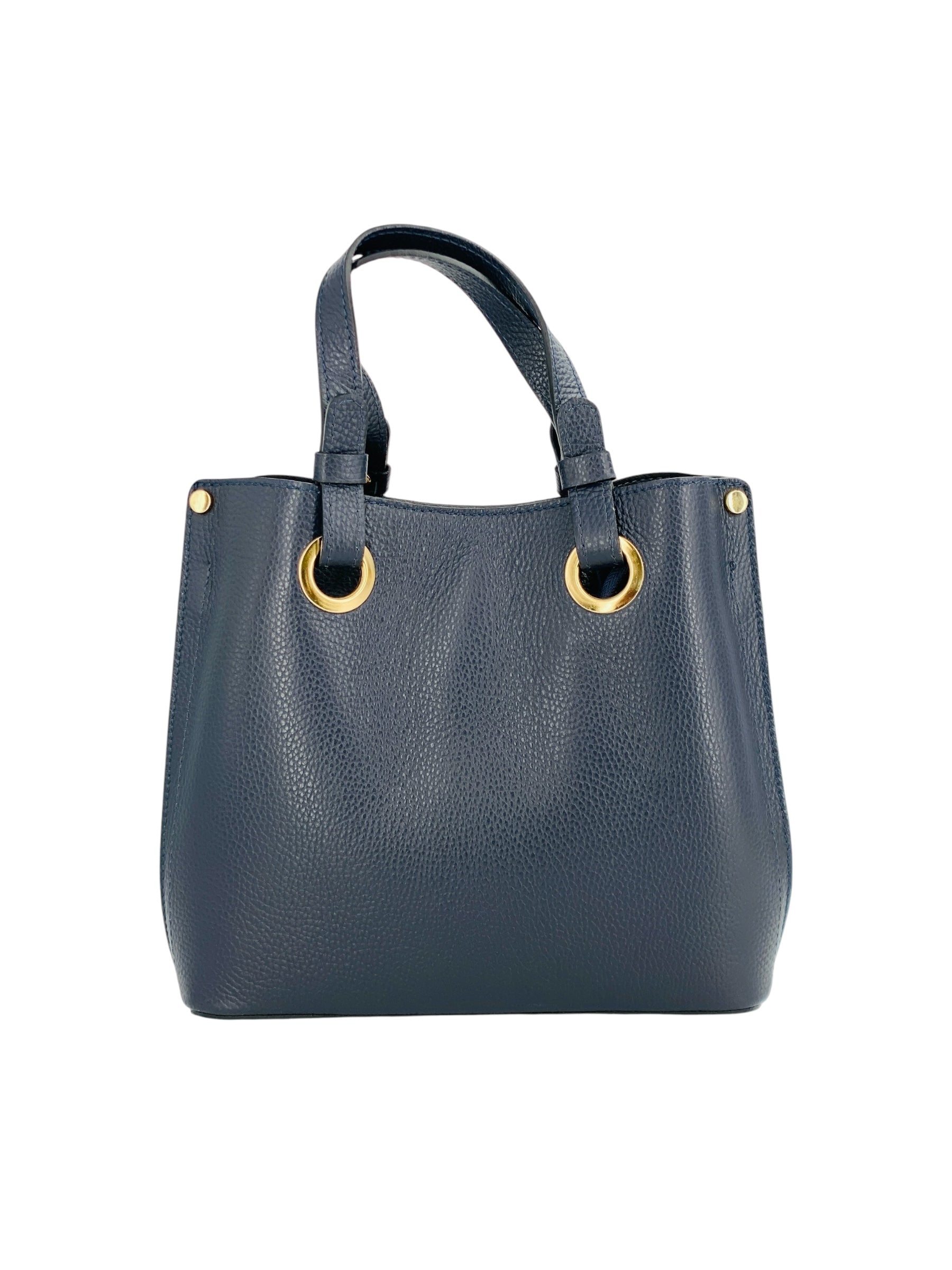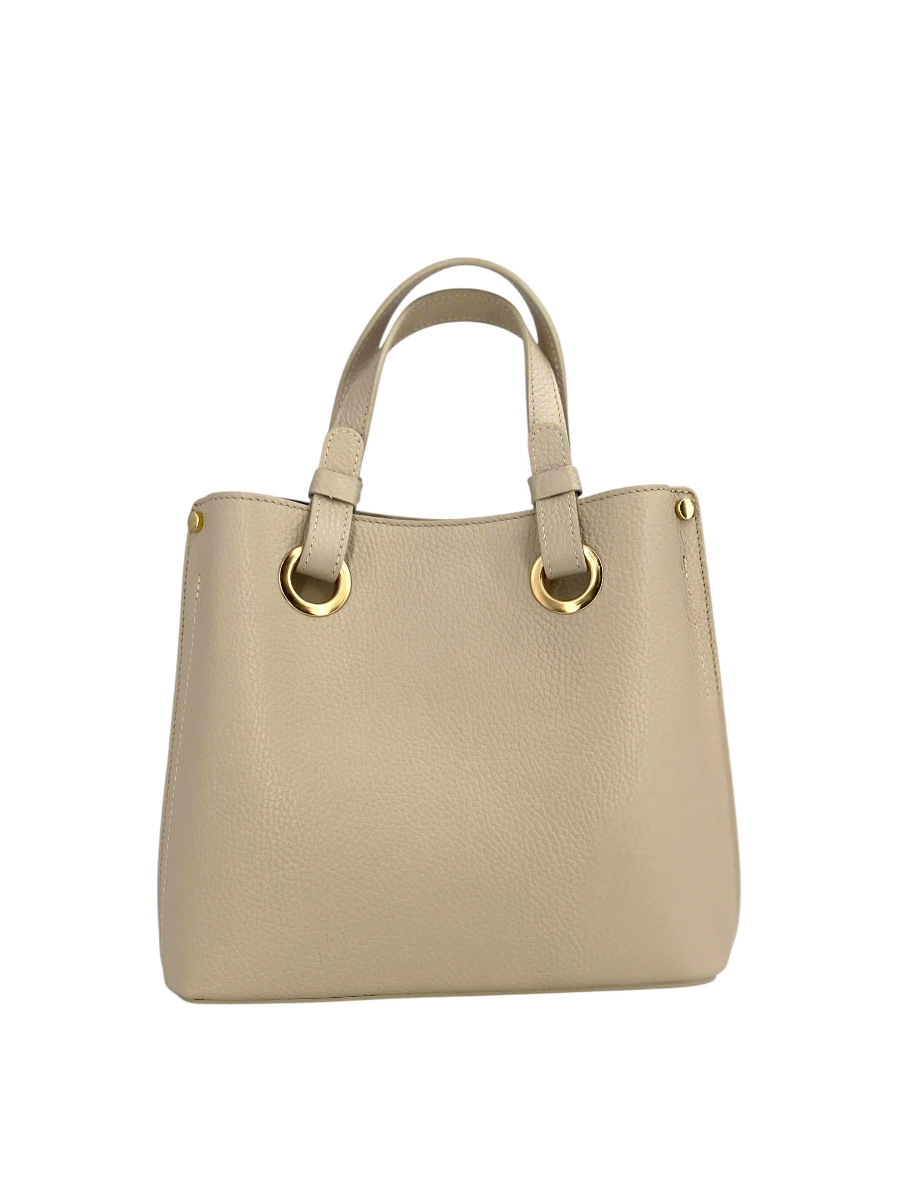 Doppio manico corto in pelle rinforzata, fissato con maxi occhielli dorati che conferiscono un tocco deciso e sofisticato.