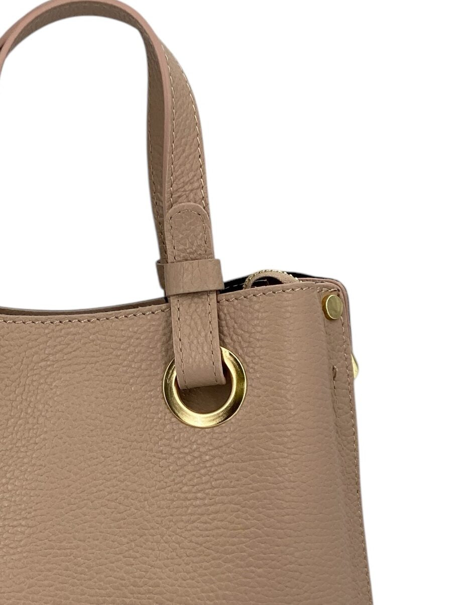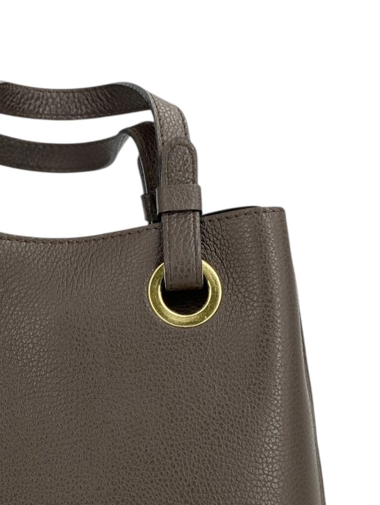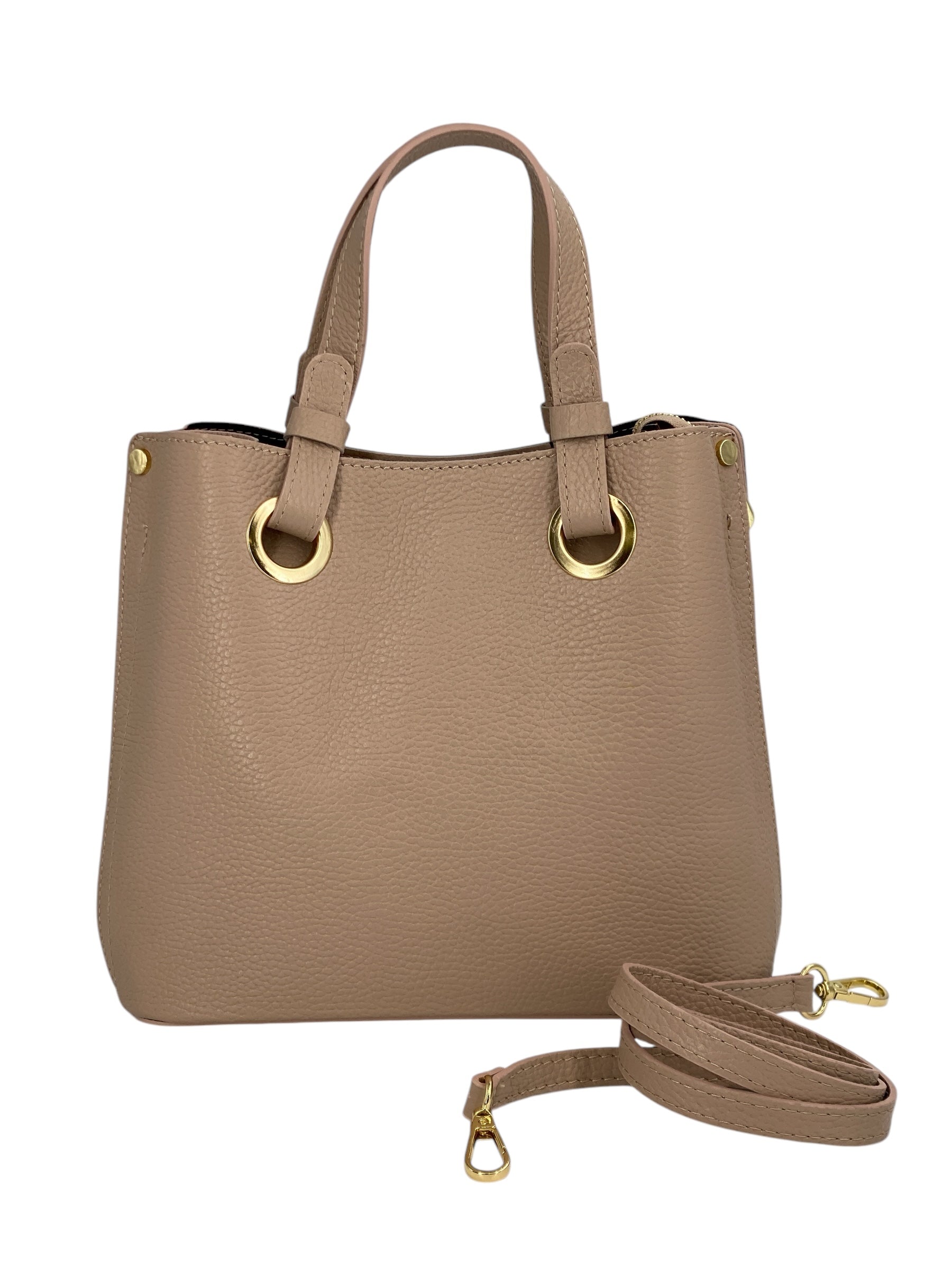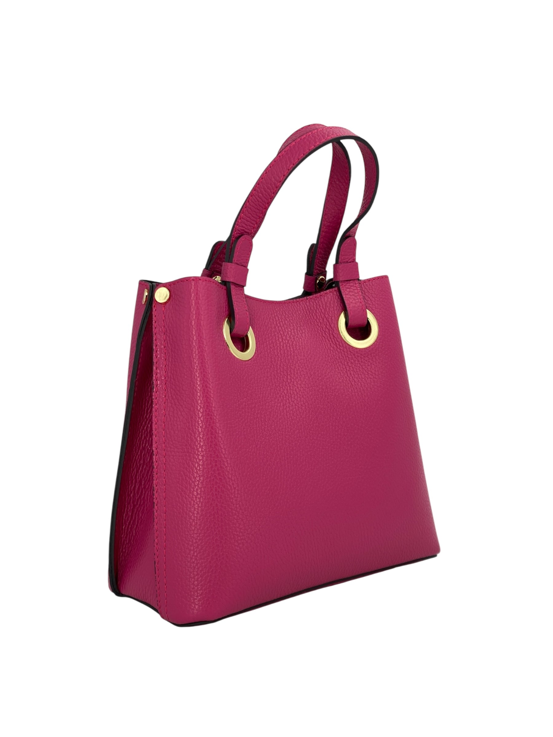 Doppio manico corto in pelle rinforzata, fissato con maxi occhielli dorati che conferiscono un tocco deciso e sofisticato.