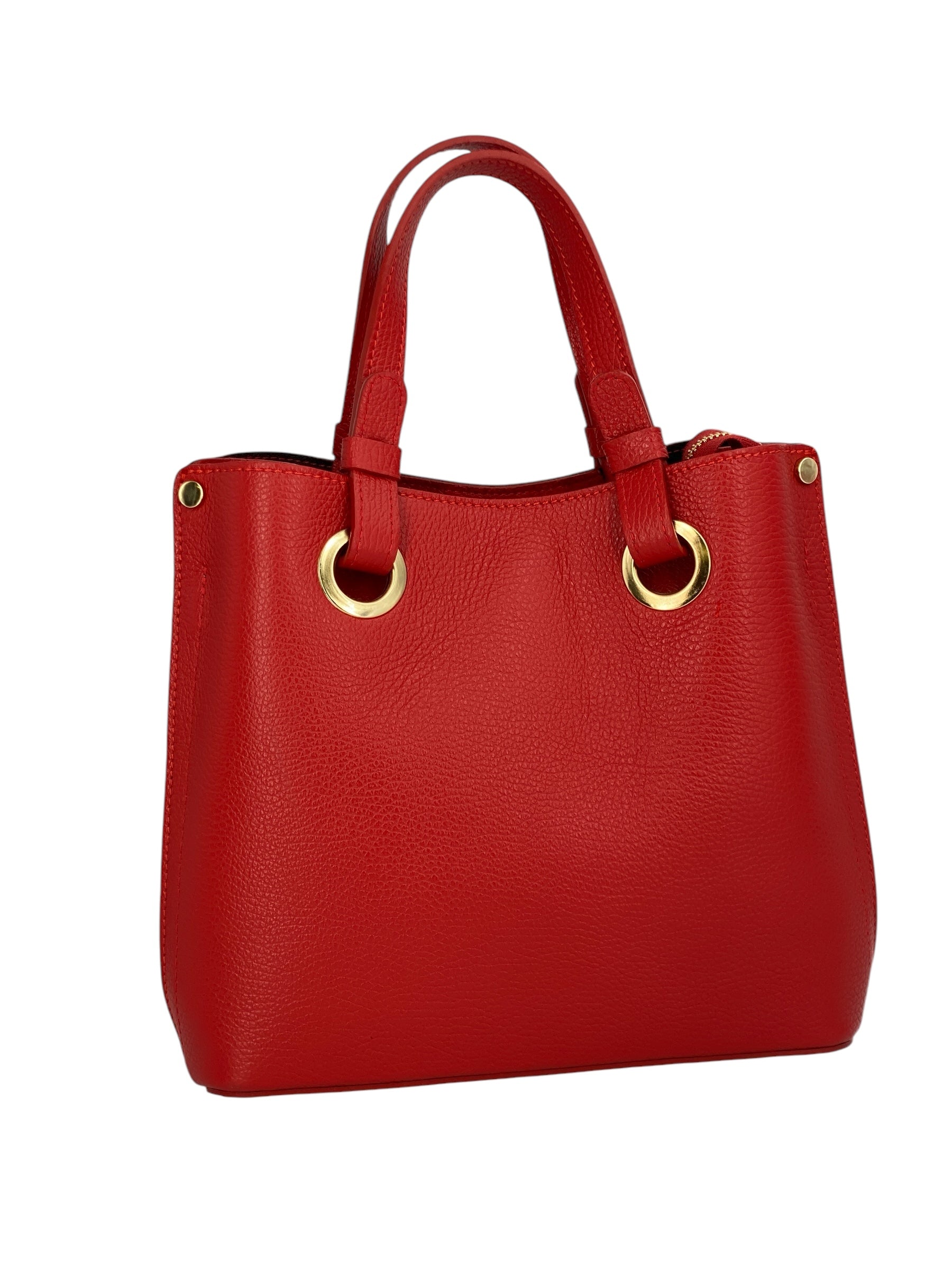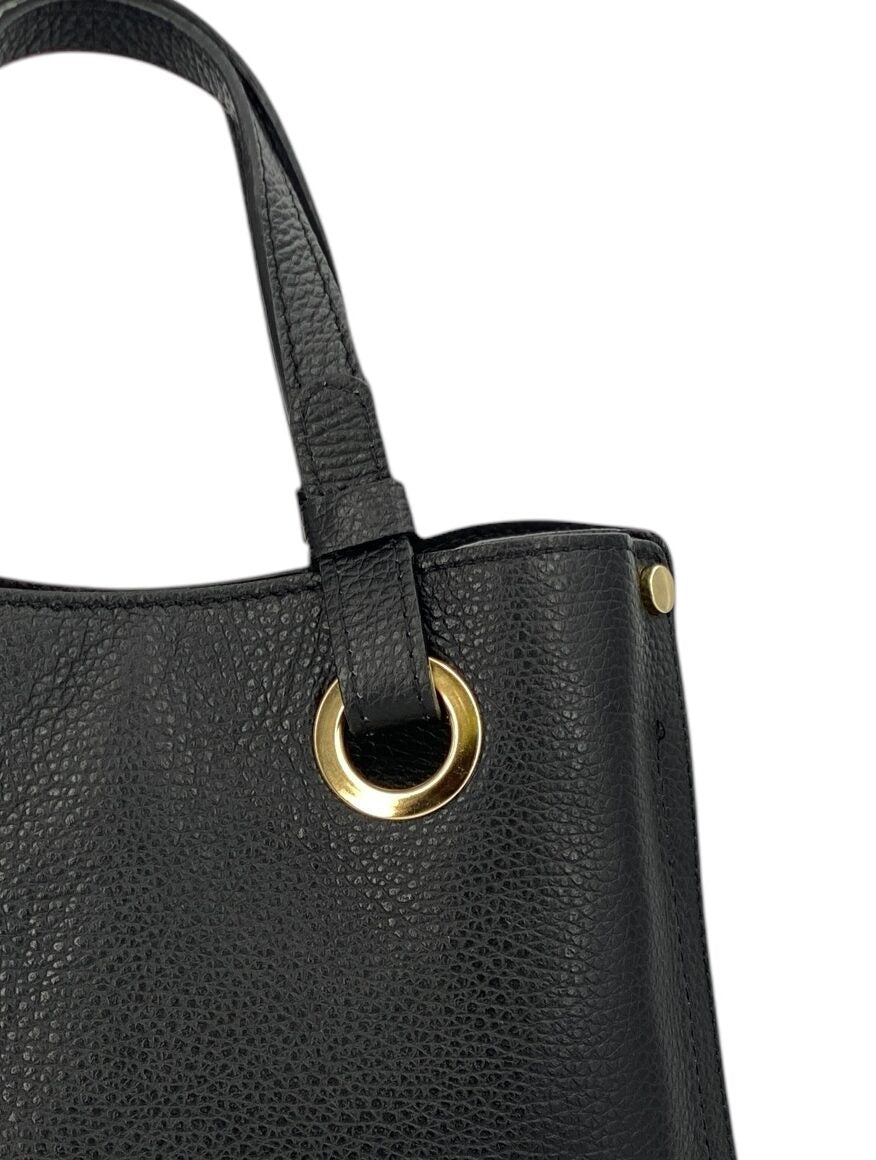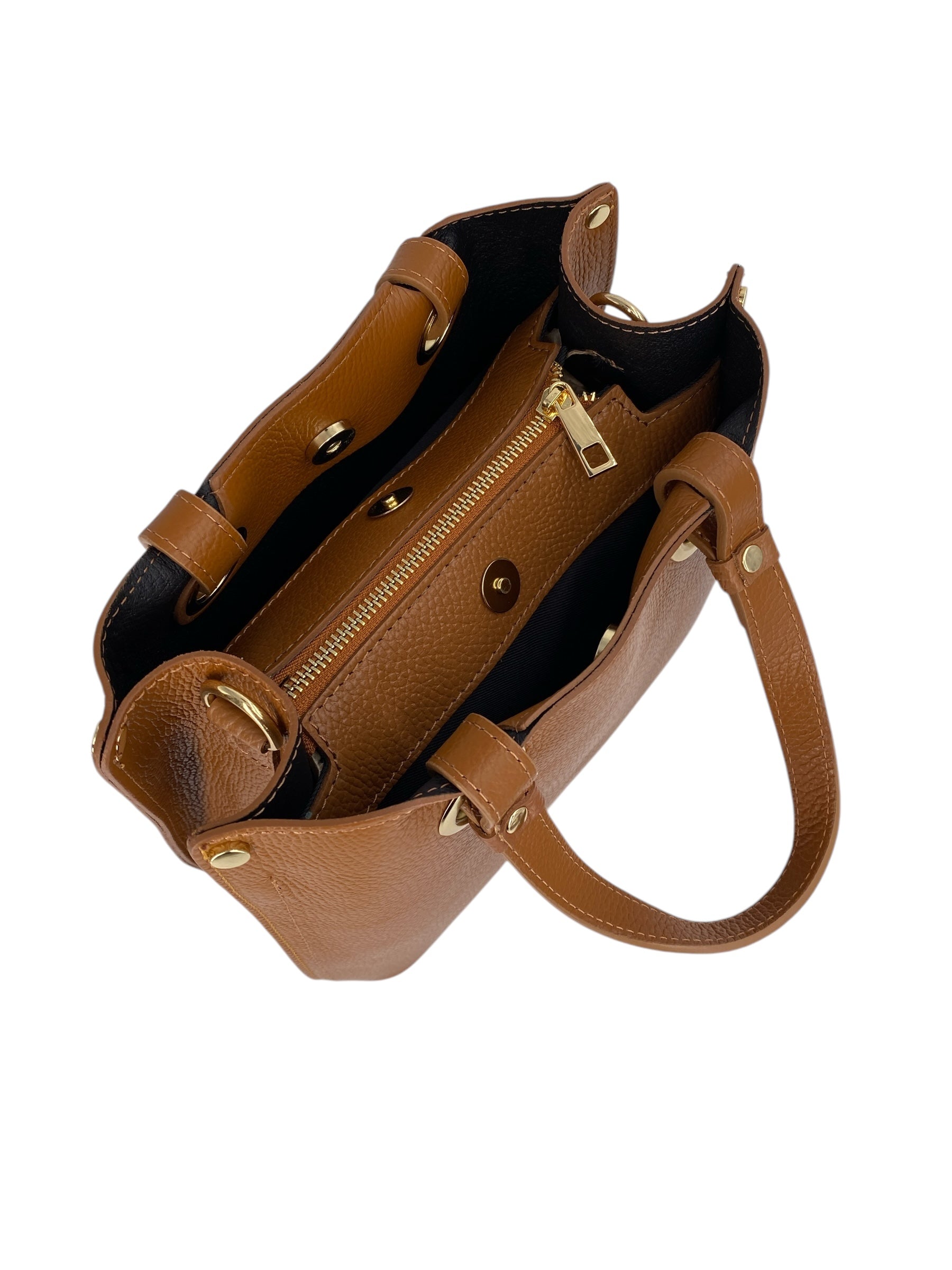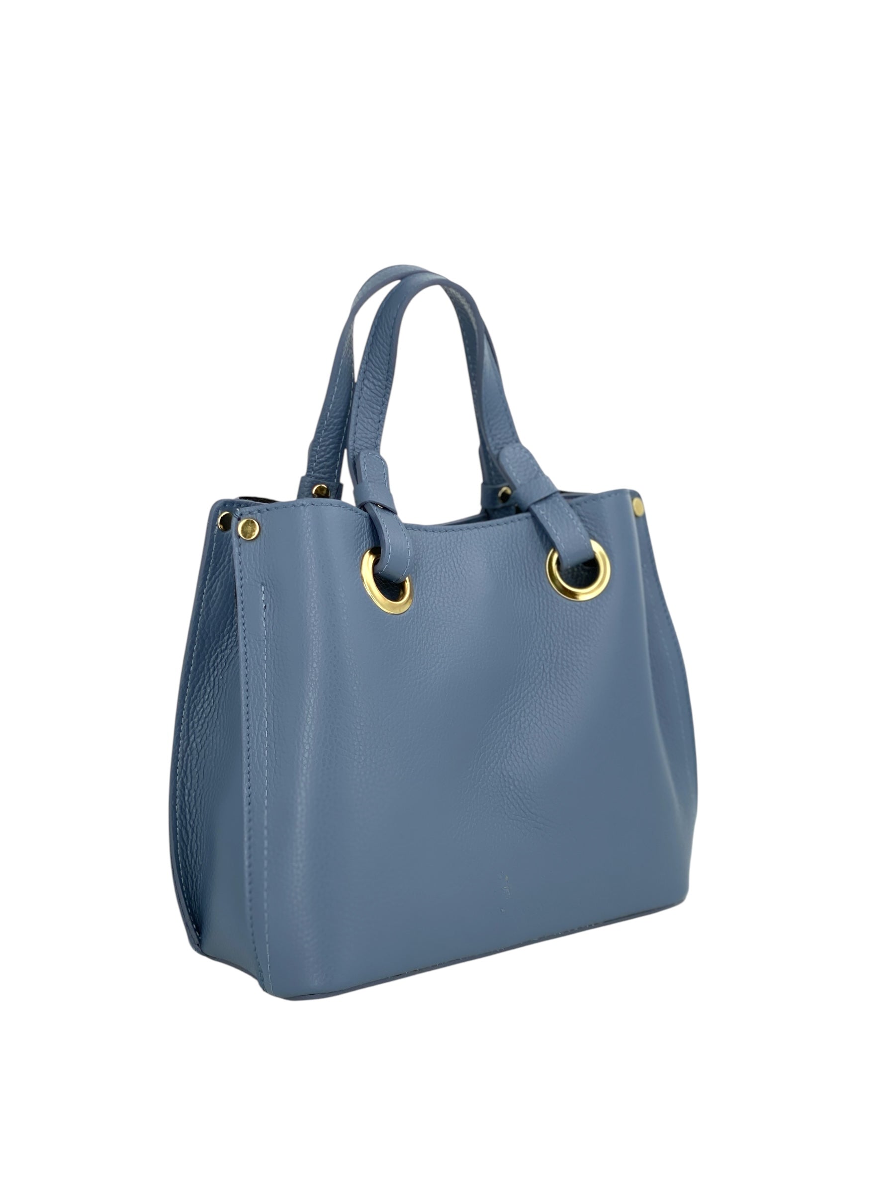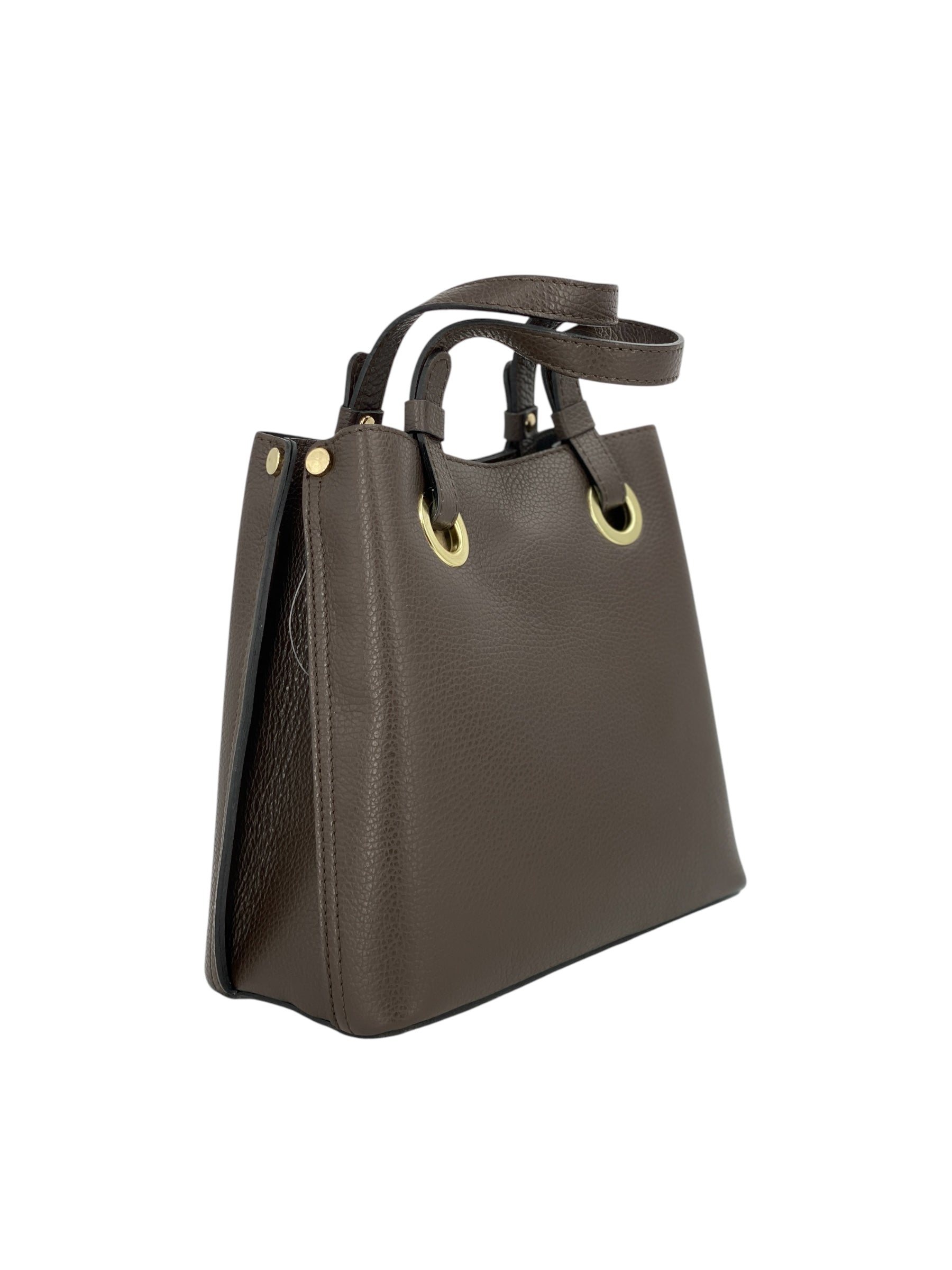 Doppio manico corto in pelle rinforzata, fissato con maxi occhielli dorati che conferiscono un tocco deciso e sofisticato.