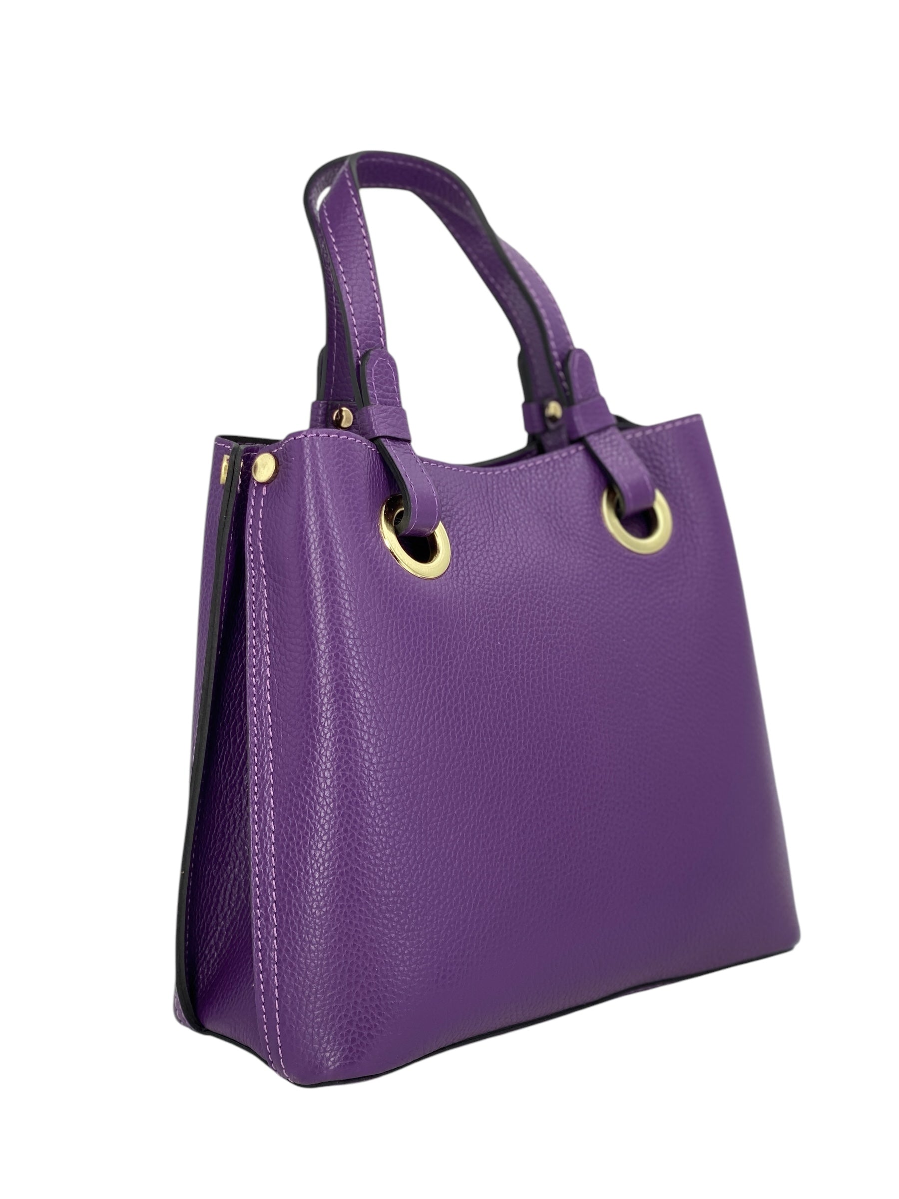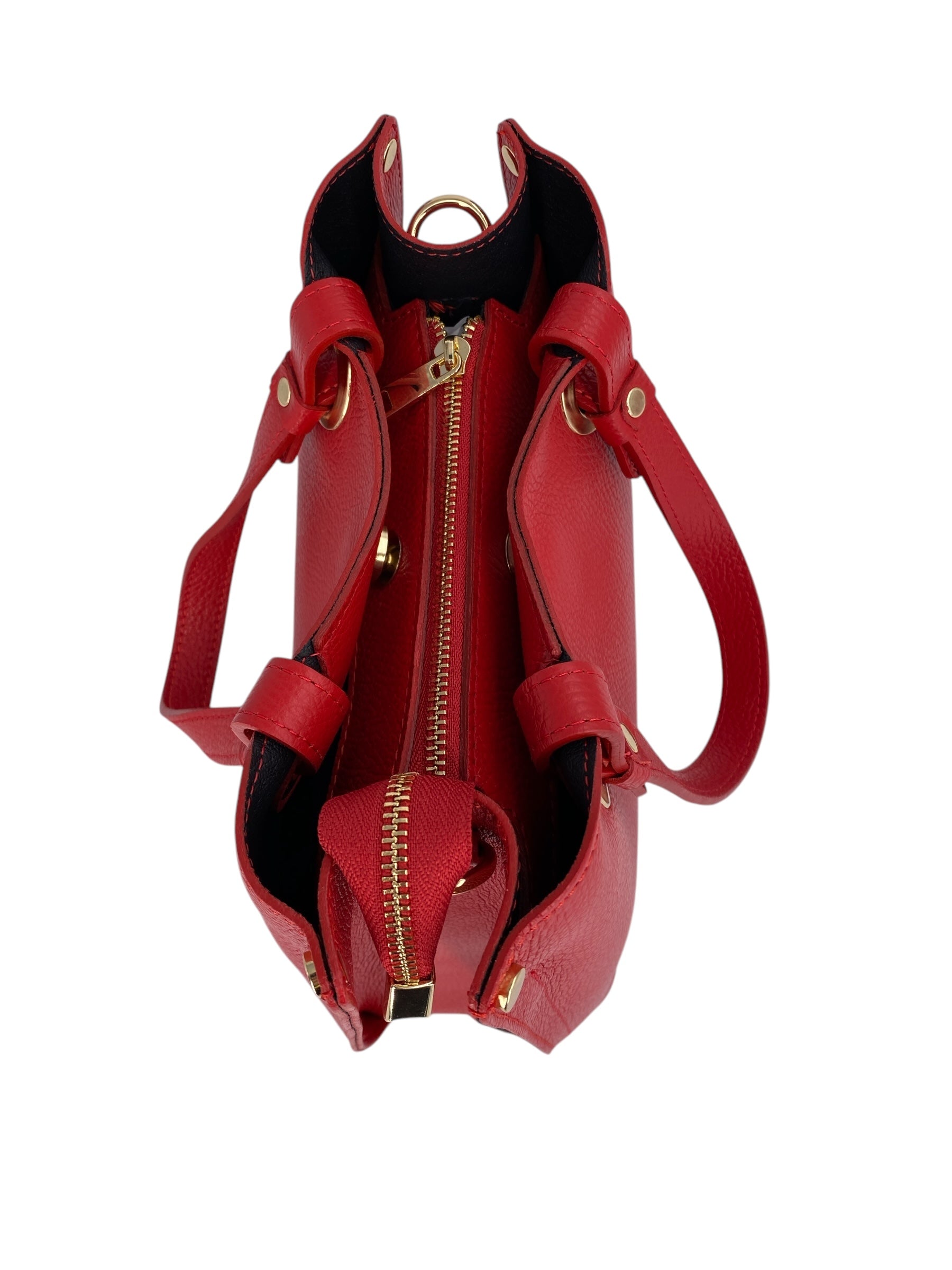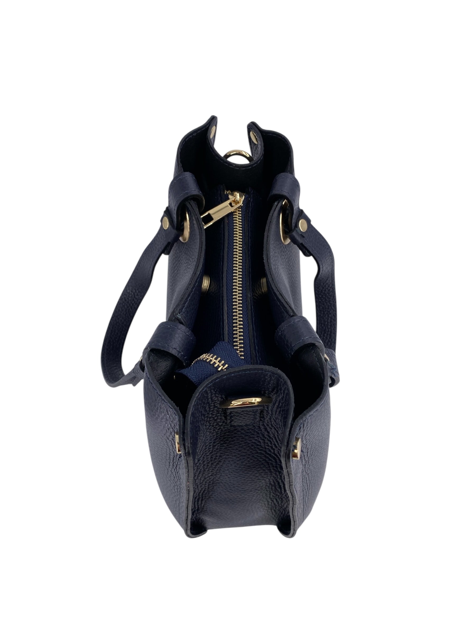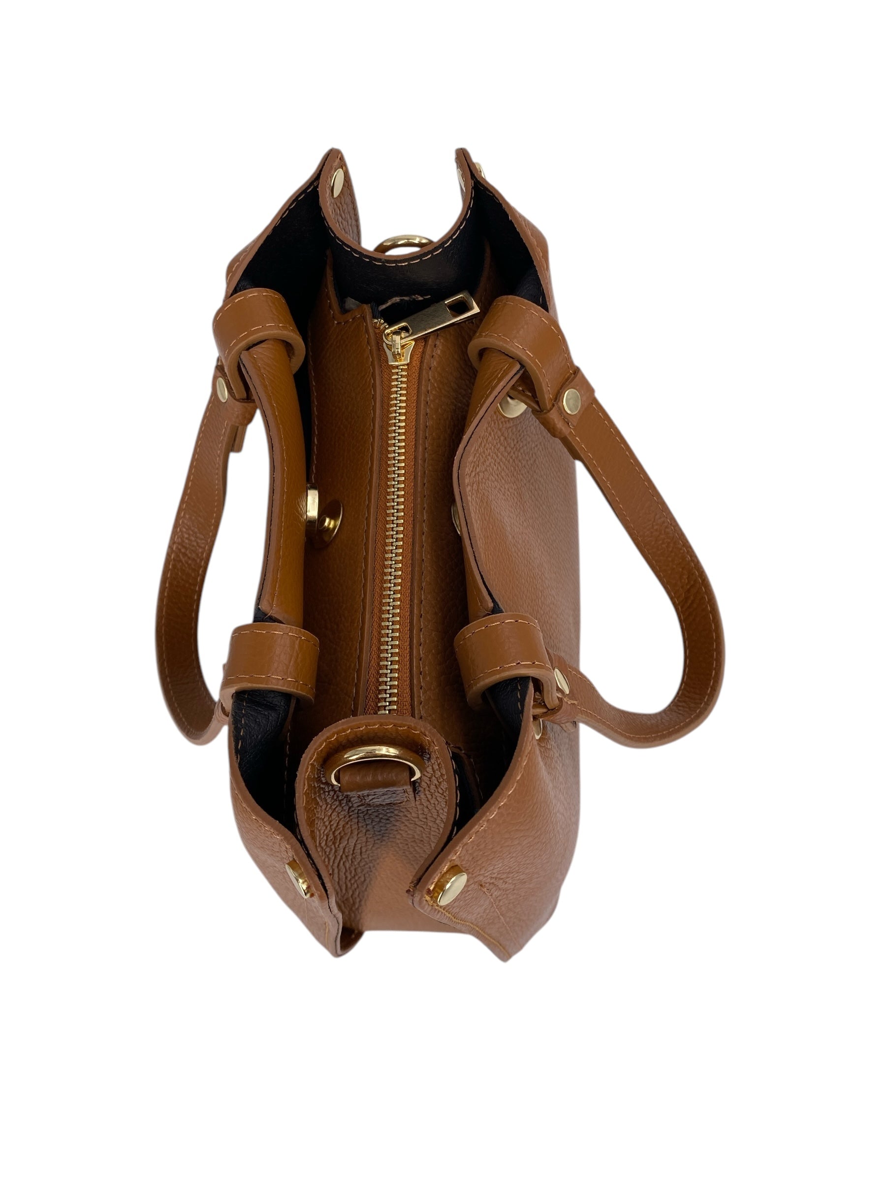 Doppio manico corto in pelle rinforzata, fissato con maxi occhielli dorati che conferiscono un tocco deciso e sofisticato.