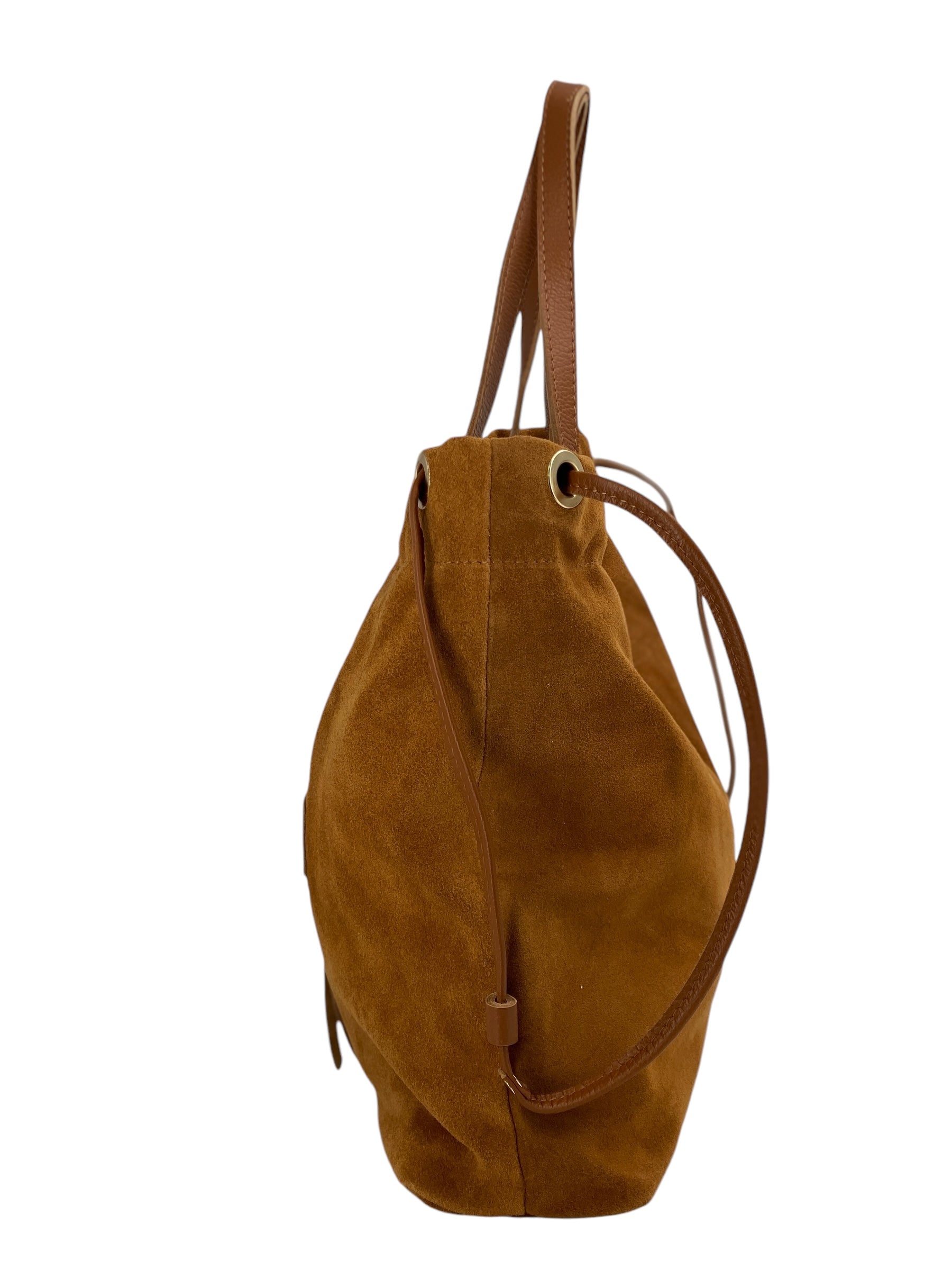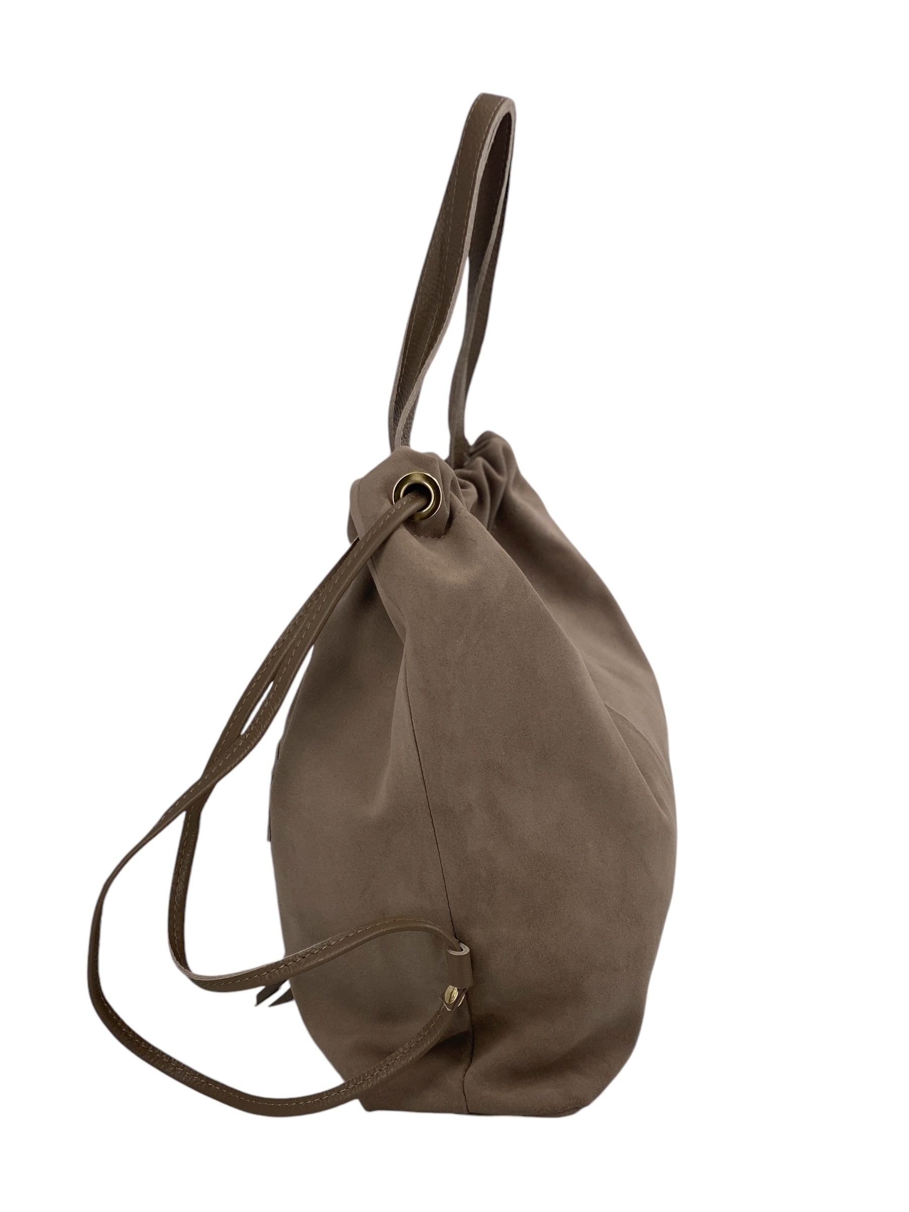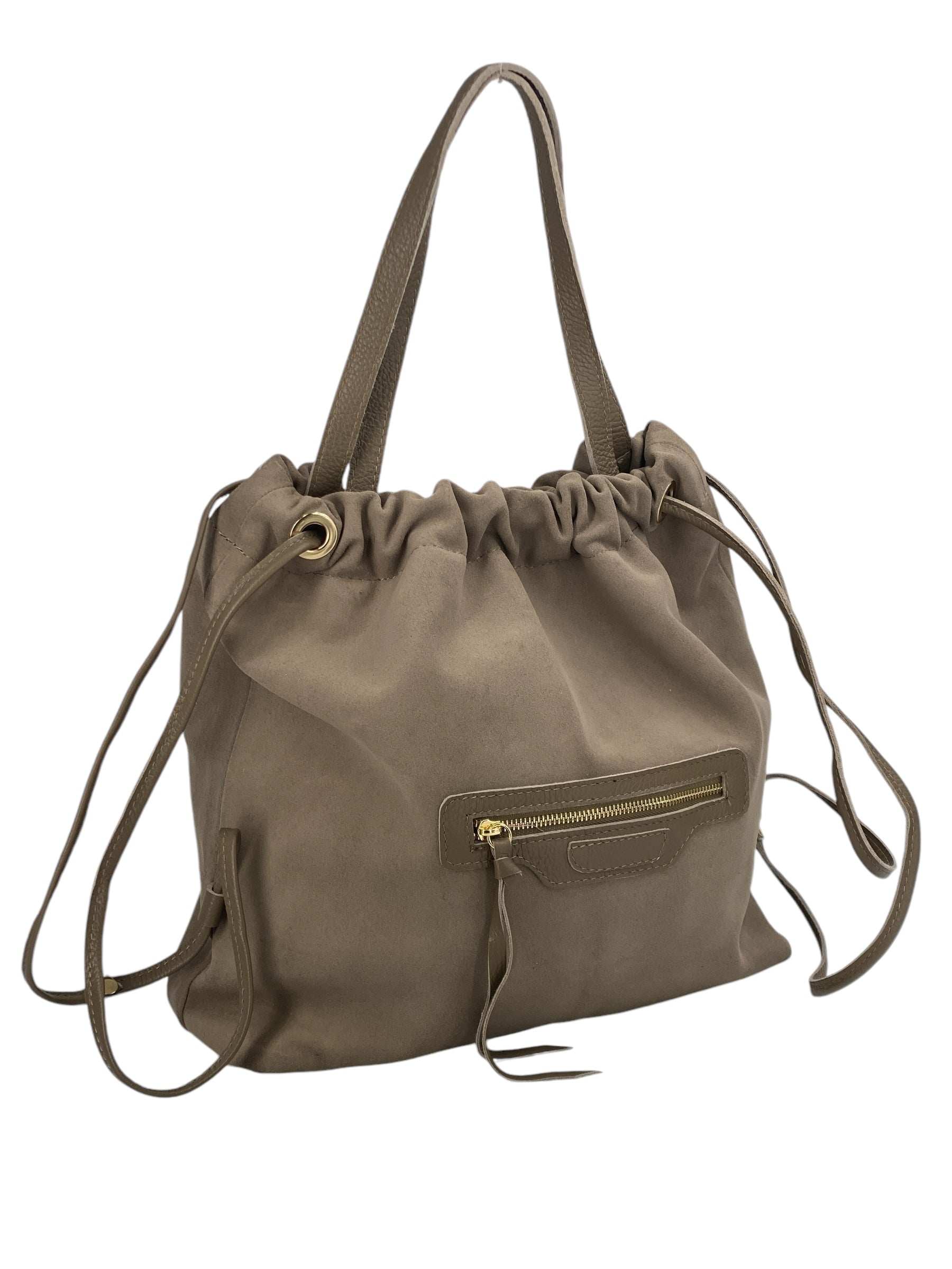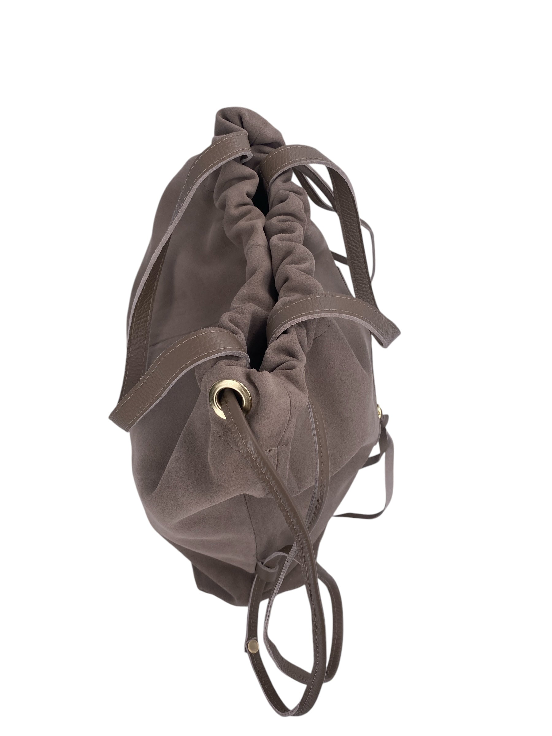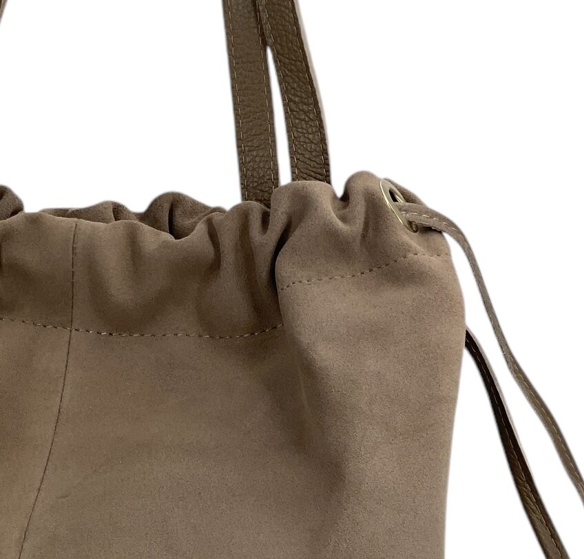Scopri Denise, la borsa in morbida vera pelle di vitello scamosciata 100% italiana che unisce design raffinato e praticità quotidiana. Lavorata con cura artigianale italiana, Denise presenta una silhouette a sacca morbida con chiusura sicura a coulisse, arricchita da dettagli in vera pelle e finiture in metallo dorato che donano un tocco di lusso discreto.