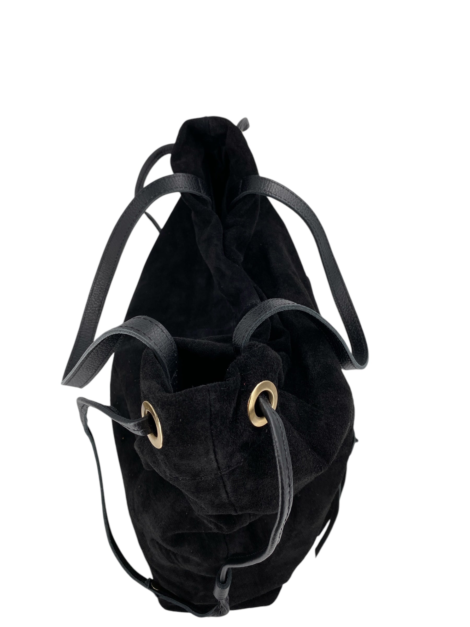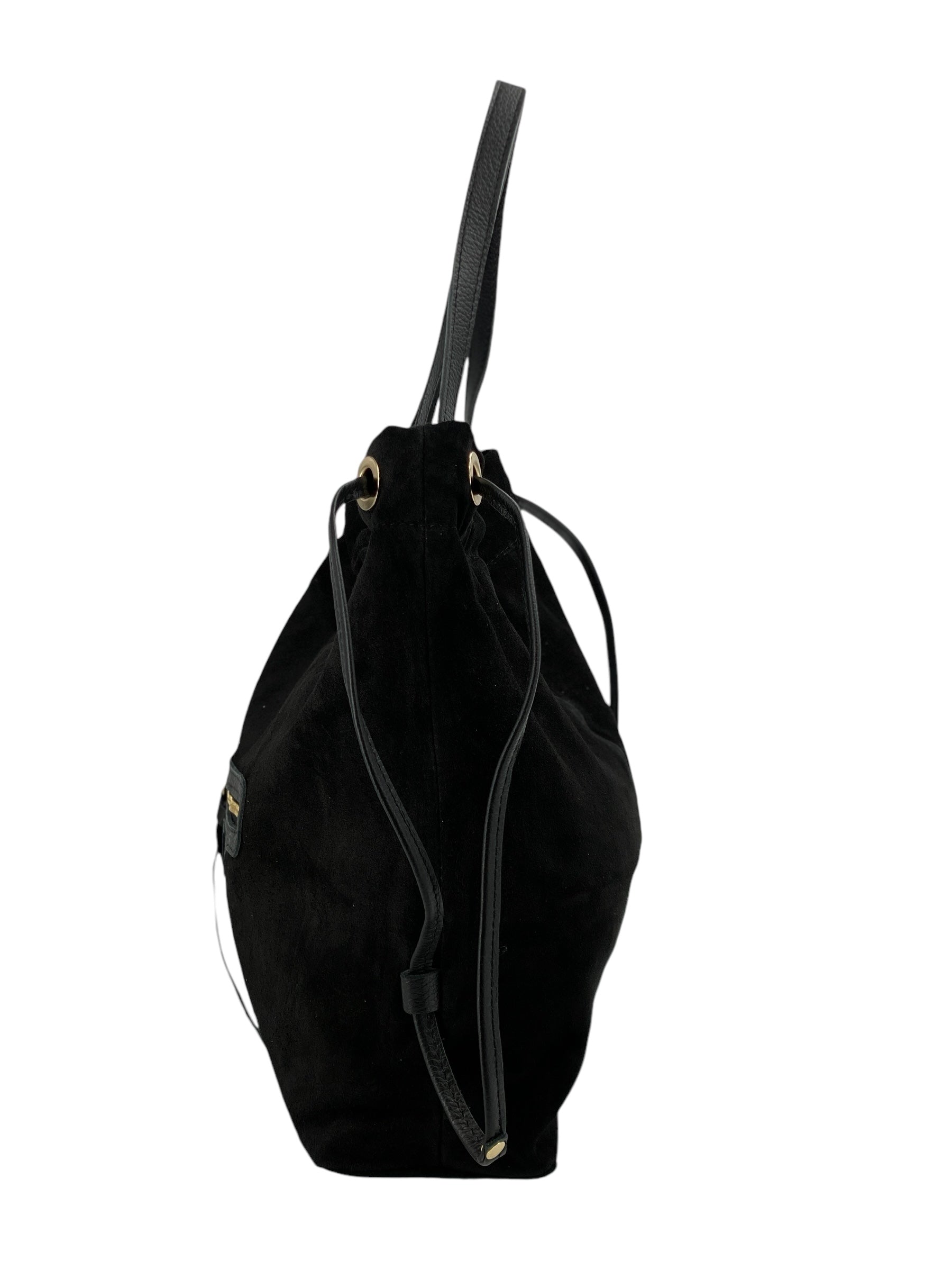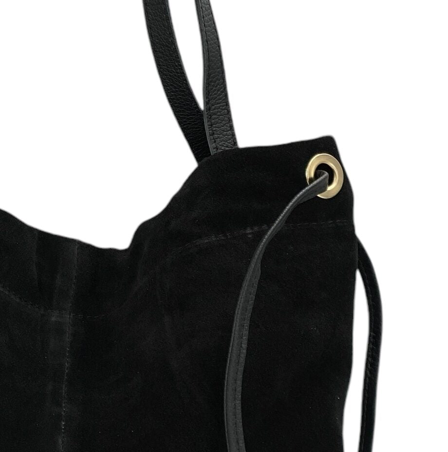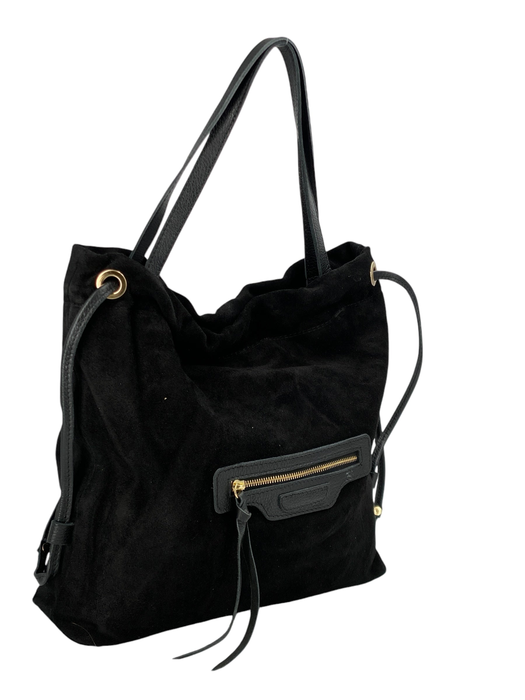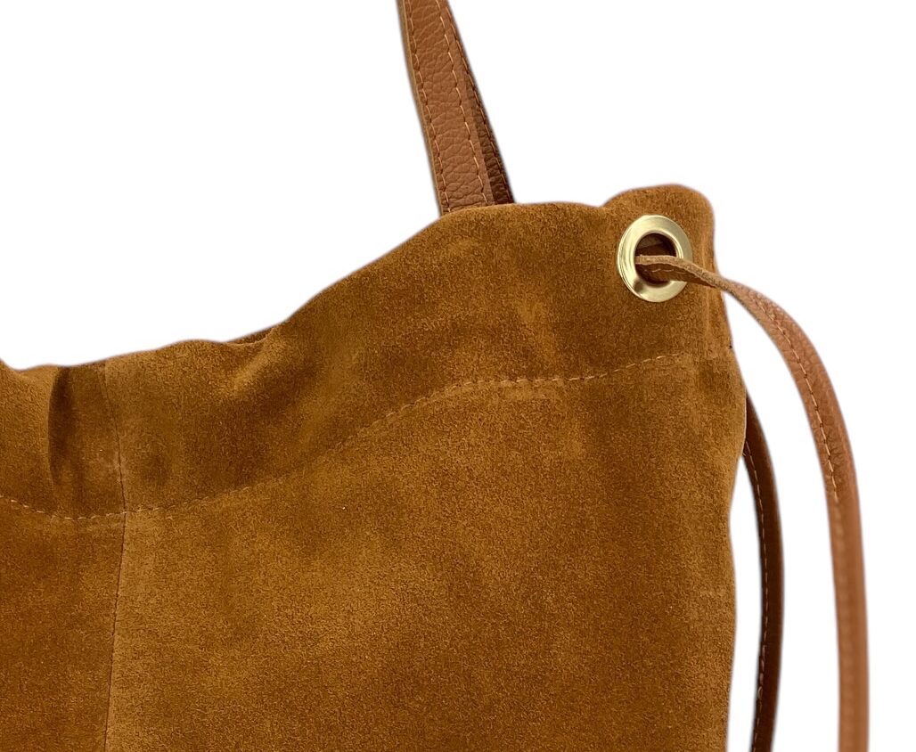 Scopri Denise, la borsa in morbida vera pelle di vitello scamosciata 100% italiana che unisce design raffinato e praticità quotidiana. Lavorata con cura artigianale italiana, Denise presenta una silhouette a sacca morbida con chiusura sicura a coulisse, arricchita da dettagli in vera pelle e finiture in metallo dorato che donano un tocco di lusso discreto.