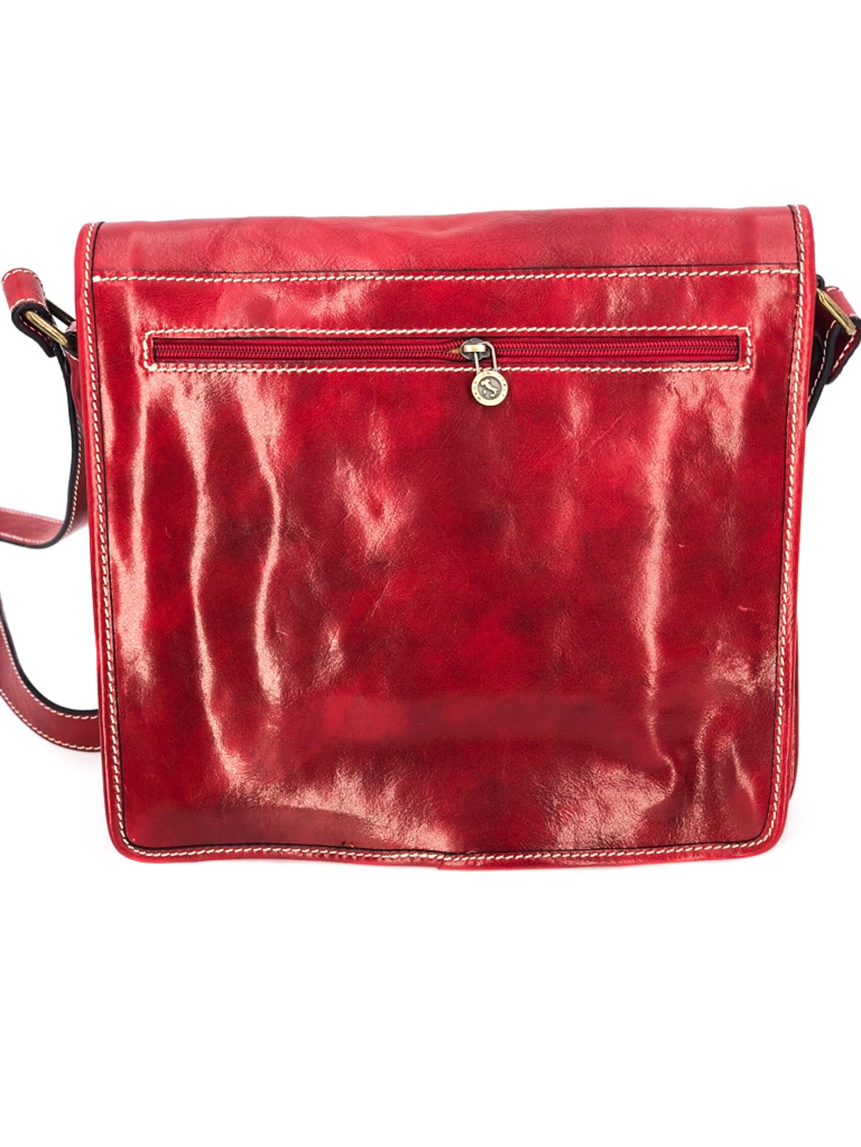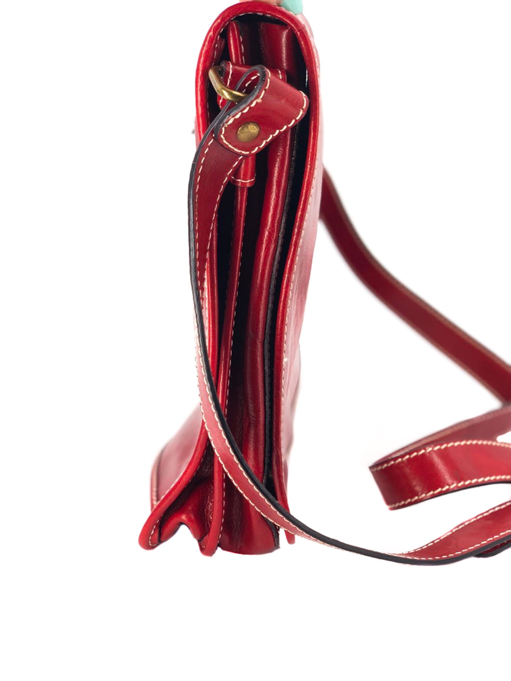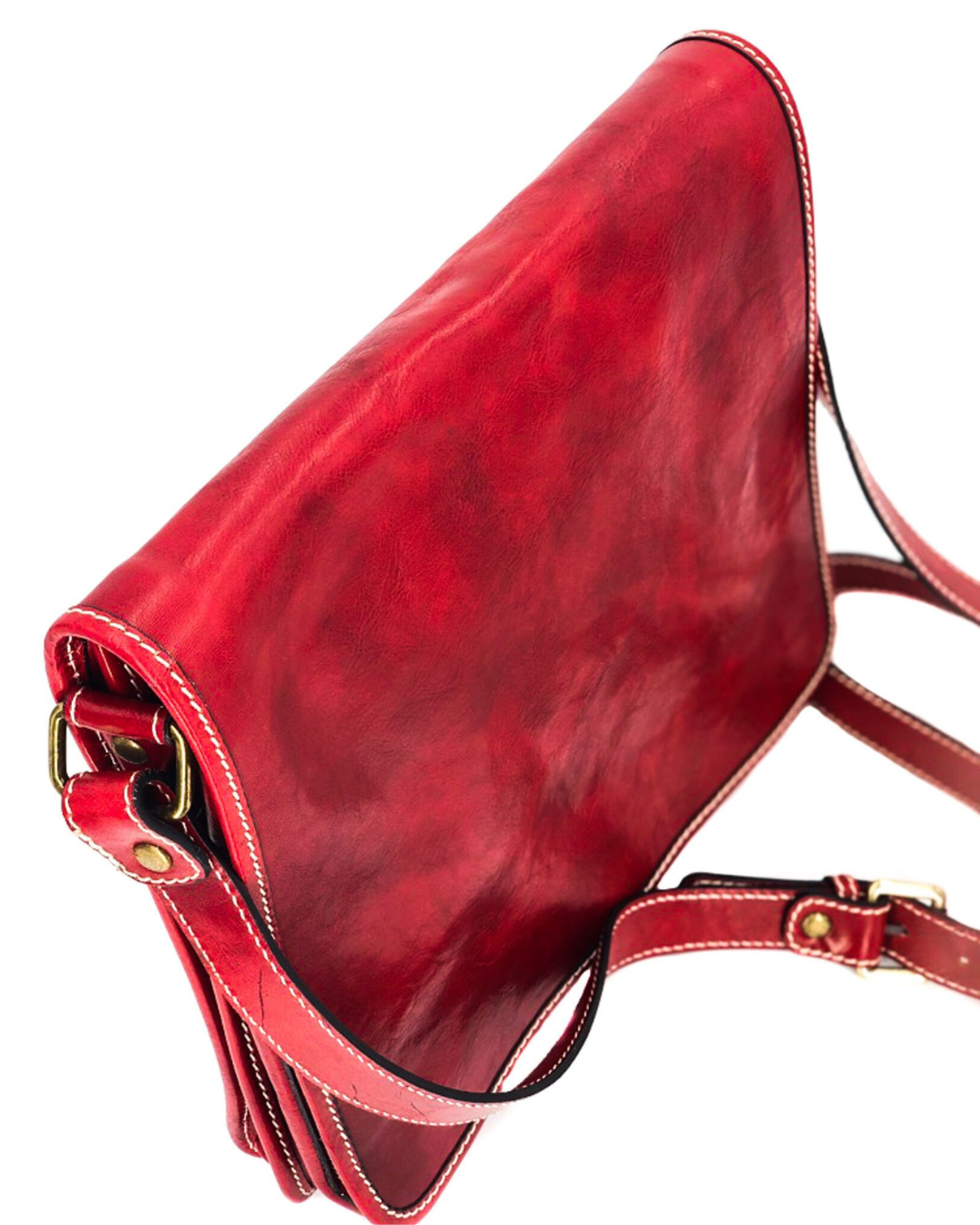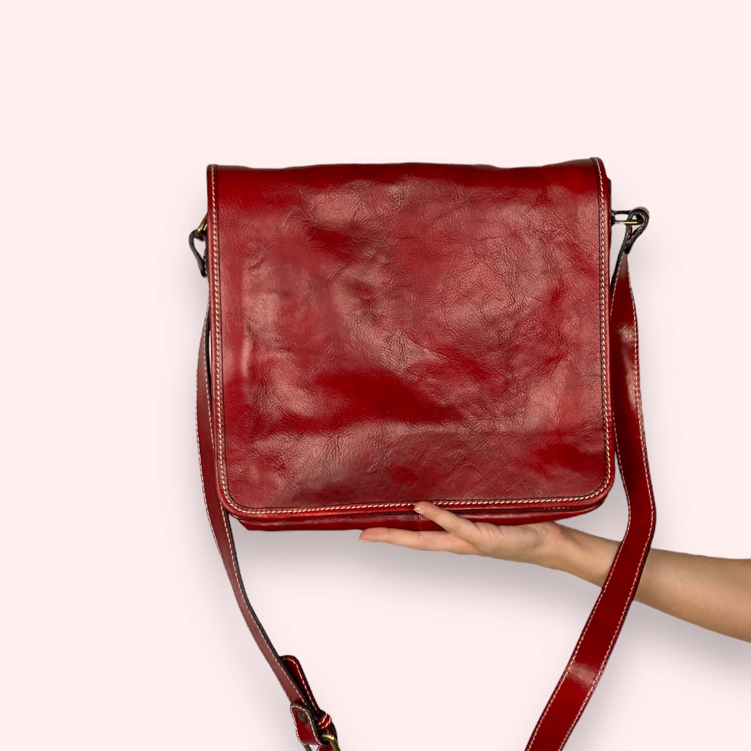 La nostra Mon è una borsa a tracolla di media dimensione, realizzata come tutti i nostri articoli, in vera pelle italiana, che le conferisce sfumature e riflessi unici. Il suo colore rosso intenso è arricchito da una finitura lucida e vibrante, capace di catturare la luce e aggiungere personalità a qualsiasi outfit.