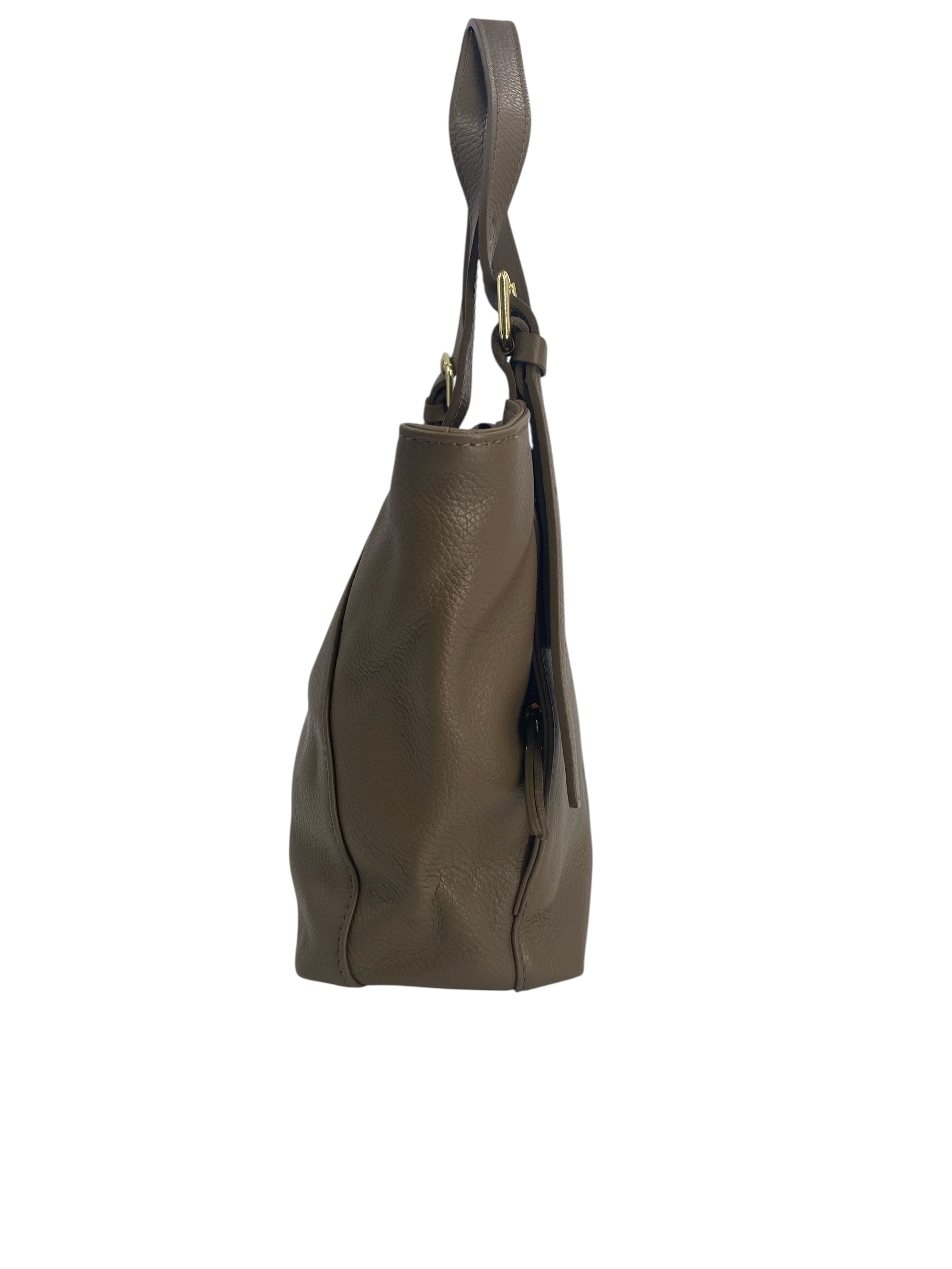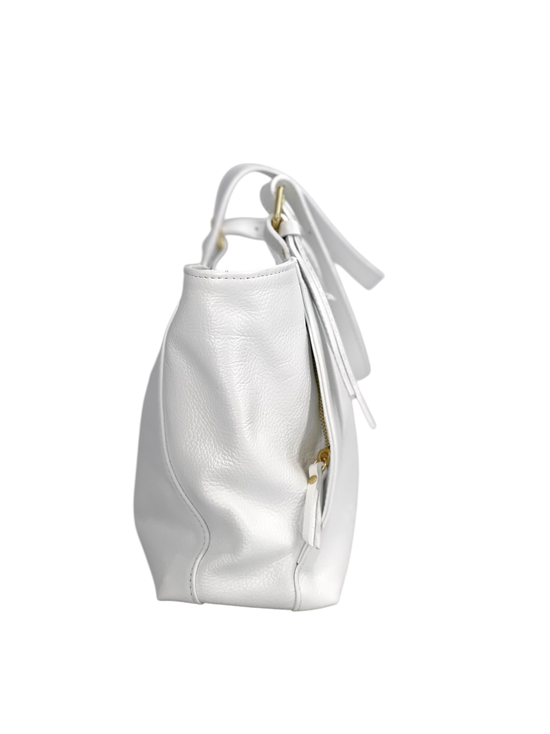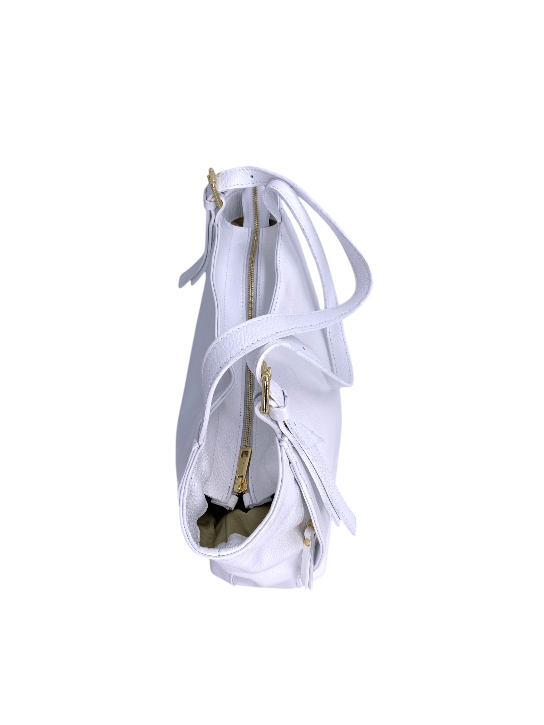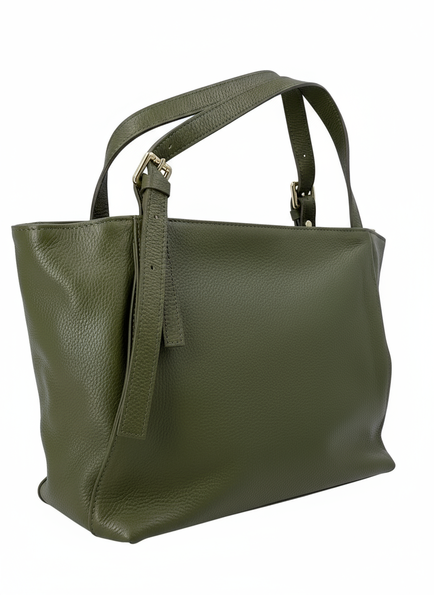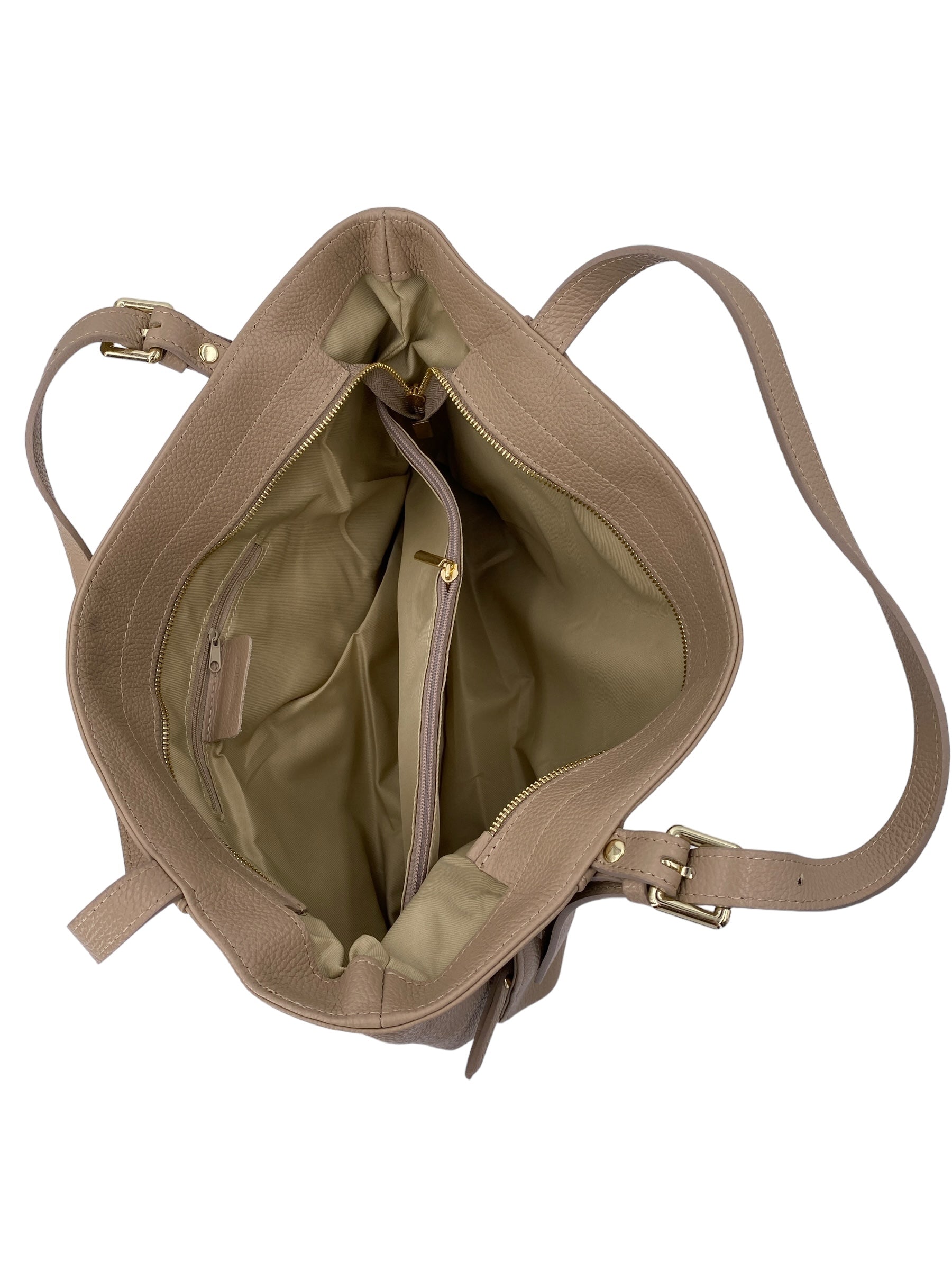 Soffermandoci sulla pelle scamosciata, risulta vellutata al tatto, trasmette una sensazione di qualità autentica, mentre i manici in pelle liscia con fibbie regolabili aggiungono struttura e versatilità. Ogni dettaglio, dalle cuciture precise alle finiture metalliche dorate, è pensato per esaltare la cura artigianale e l’eleganza naturale di un accessorio destinato a durare nel tempo. Camille non è solo una borsa, è un modo di vivere la propria femminilità con stile, equilibrio e carattere.
