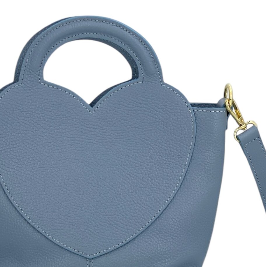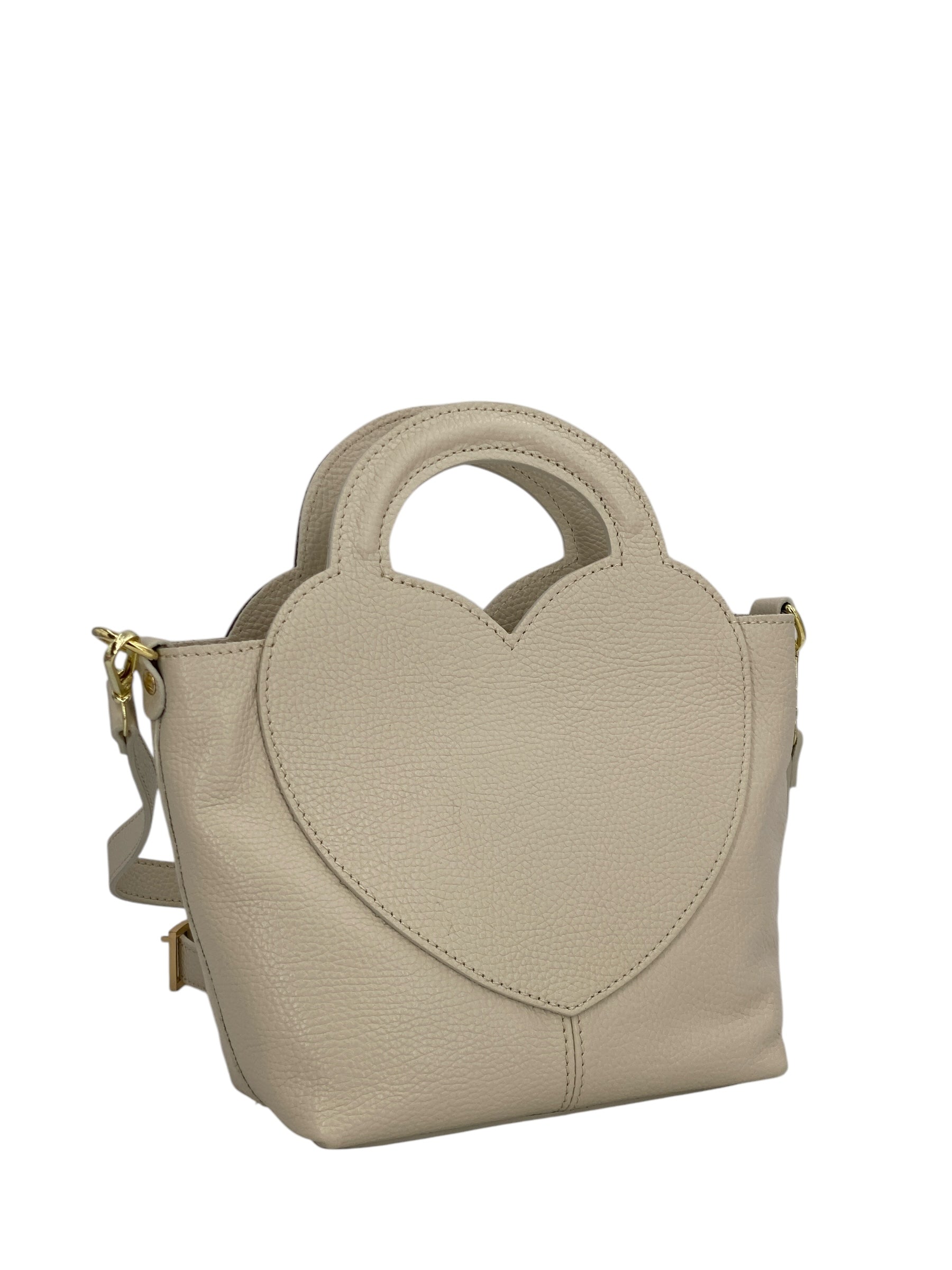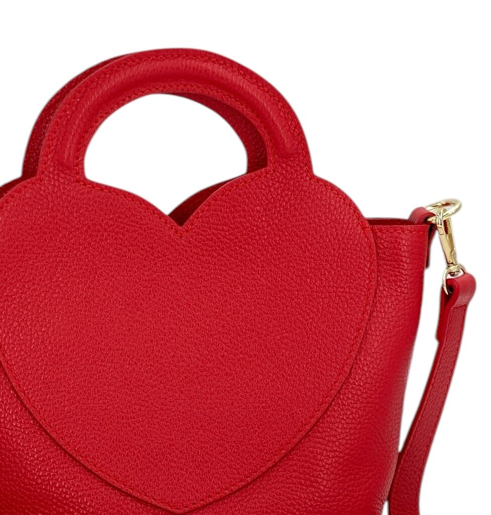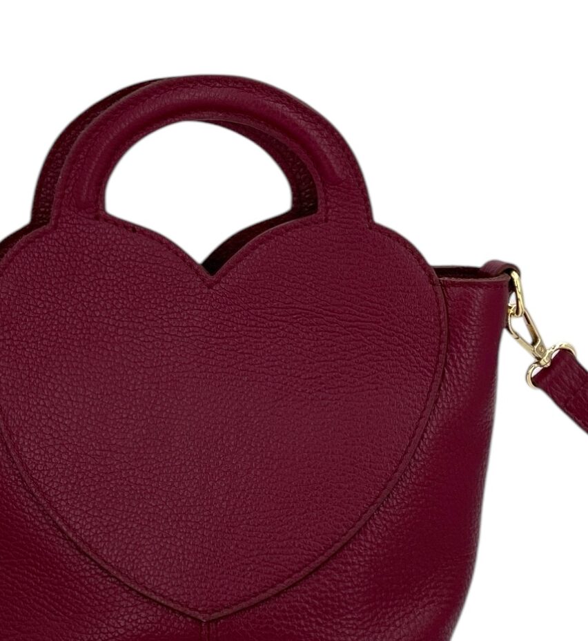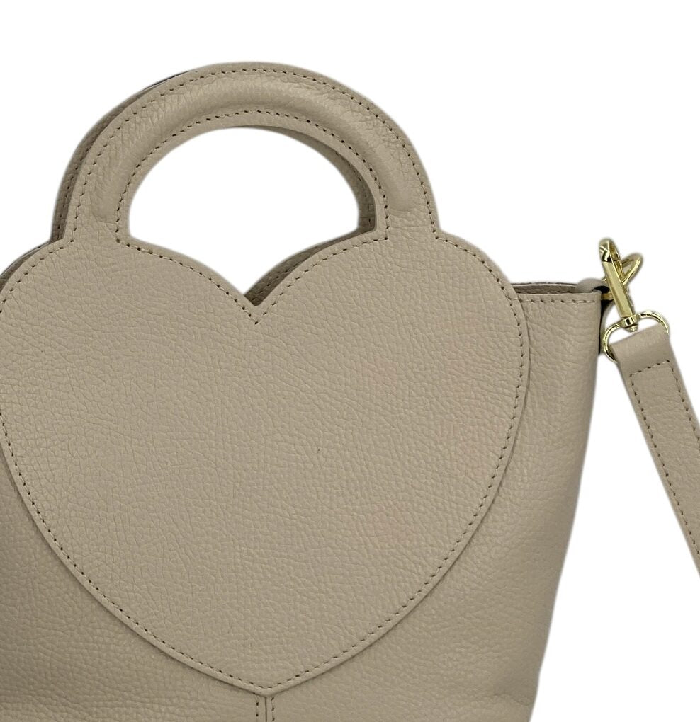 La sua silhouette compatta è resa unica da un dettaglio a forma di cuore, perfettamente integrato nella struttura: un segno di dolcezza e artigianalità che non passa inosservato. Il manico rigido superiore, rivestito in pelle e fuso nel profilo del cuore, dona una portabilità a mano confortevole e distintiva.