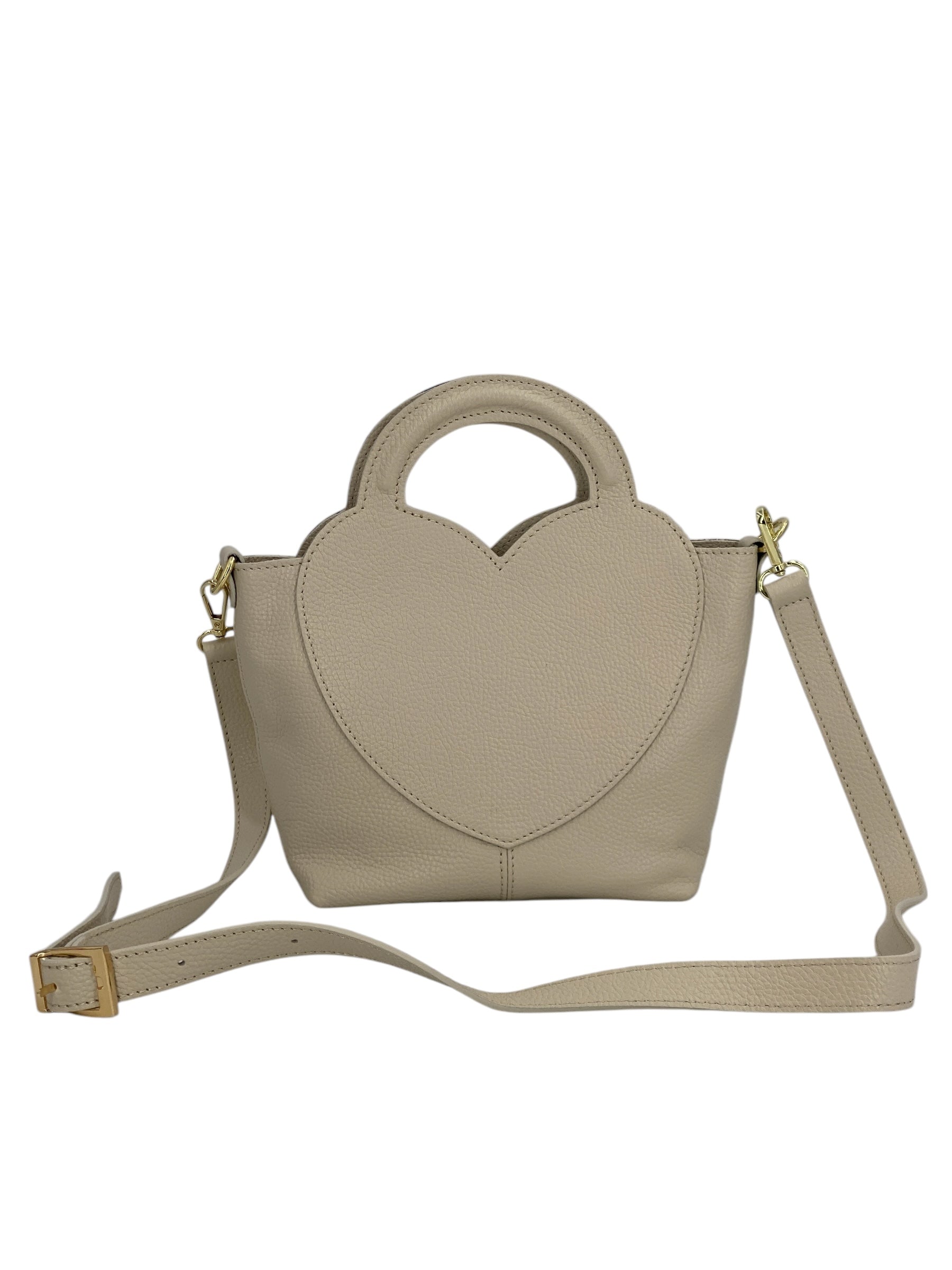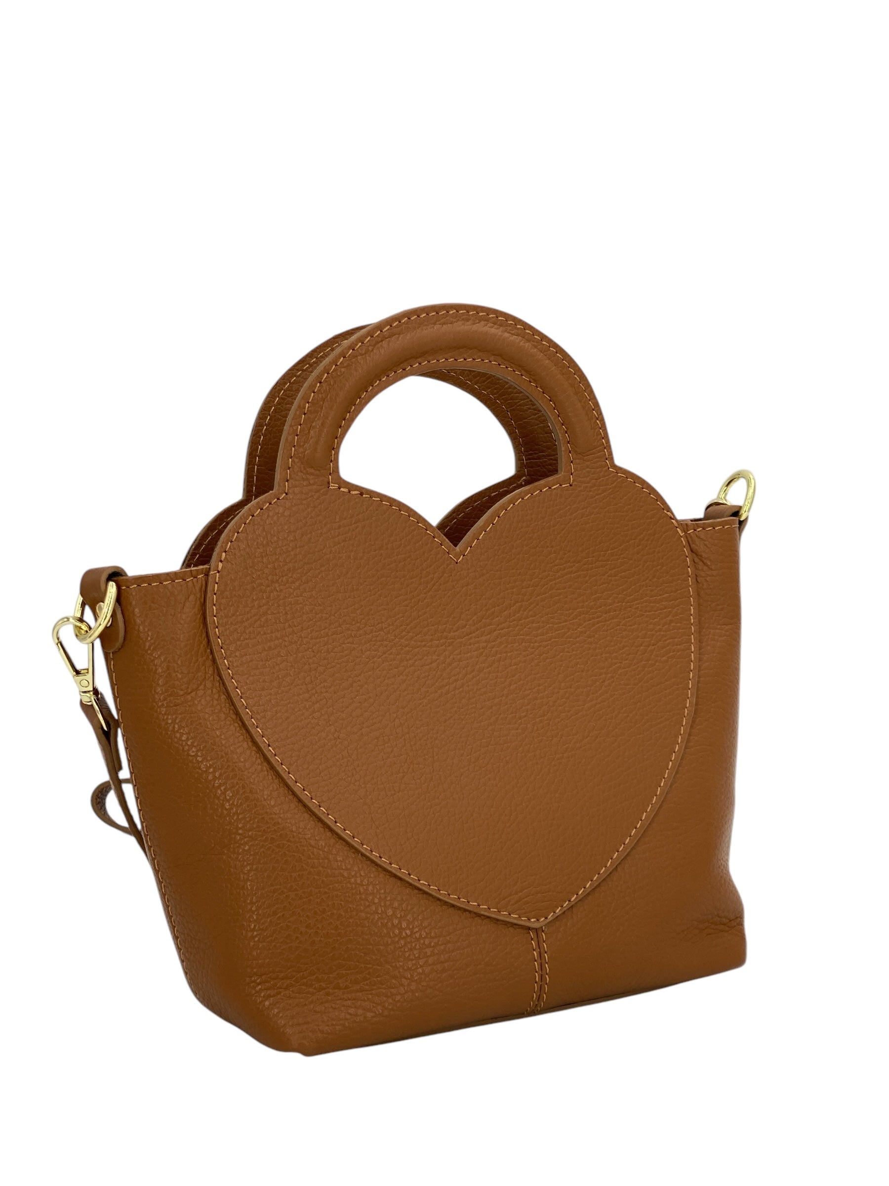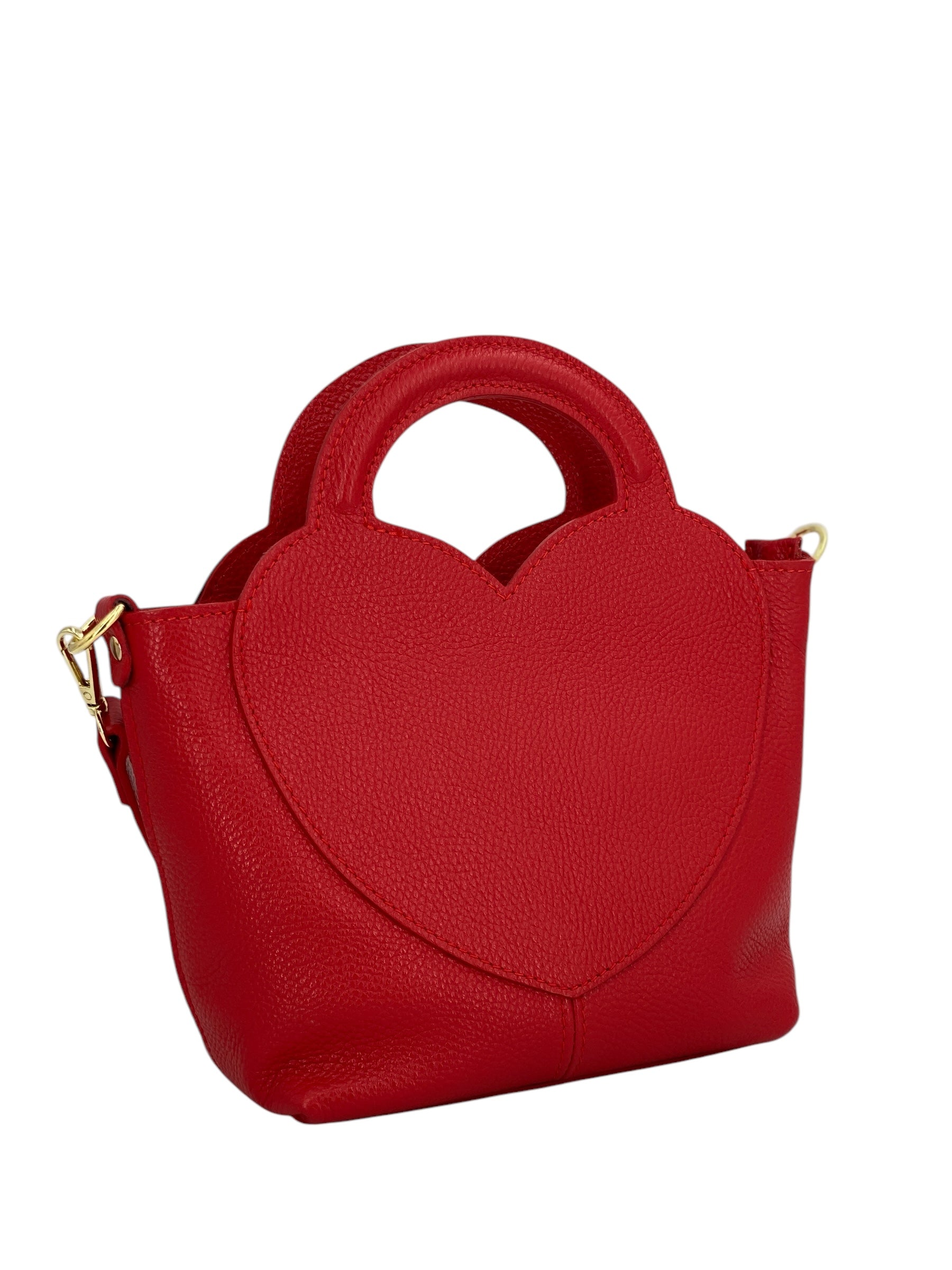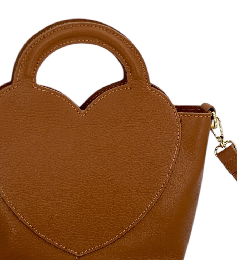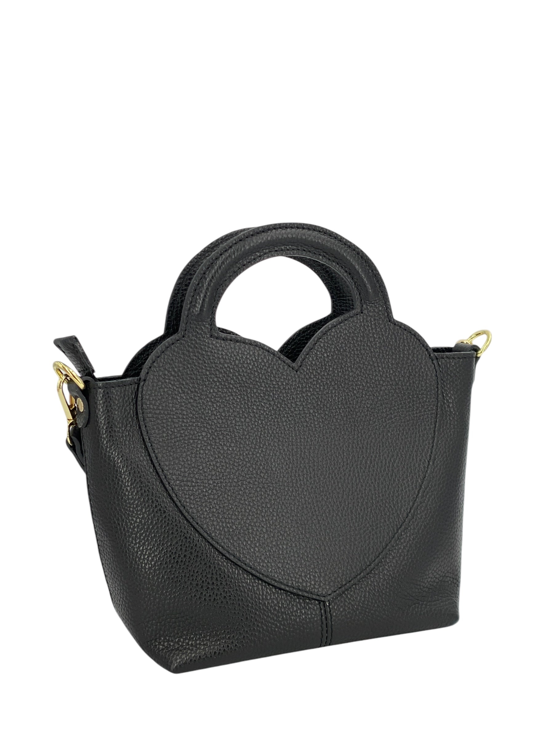 La sua silhouette compatta è resa unica da un dettaglio a forma di cuore, perfettamente integrato nella struttura: un segno di dolcezza e artigianalità che non passa inosservato. Il manico rigido superiore, rivestito in pelle e fuso nel profilo del cuore, dona una portabilità a mano confortevole e distintiva.