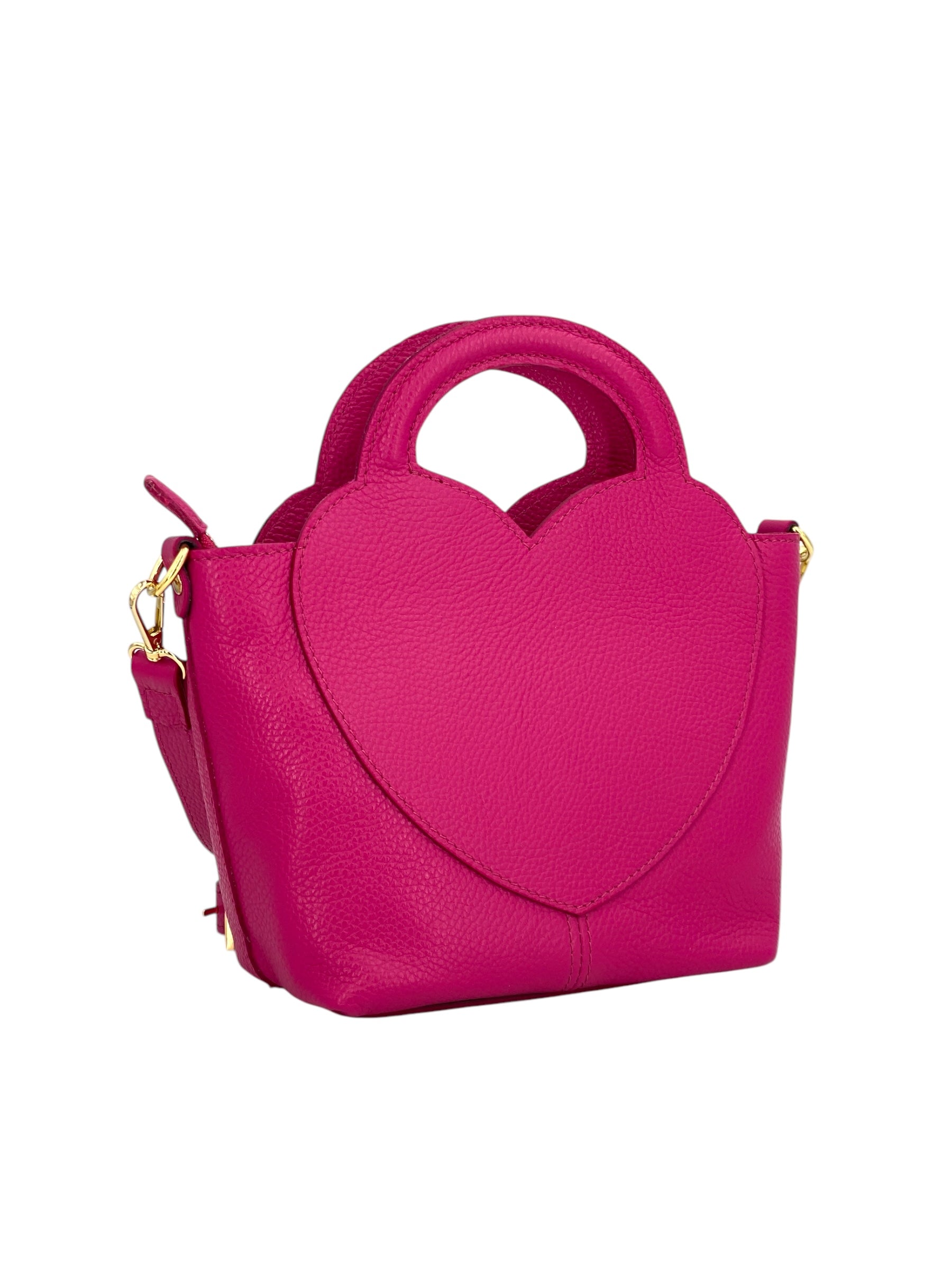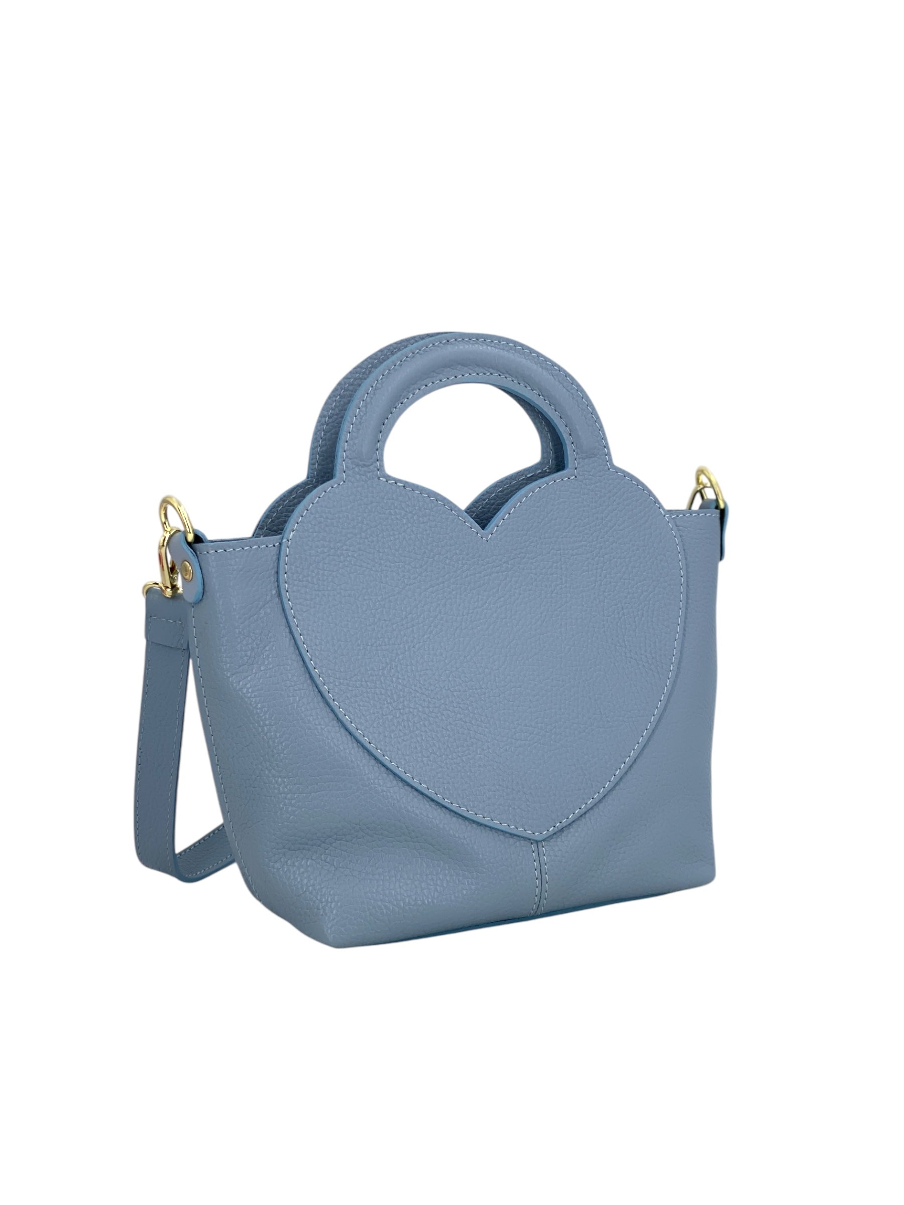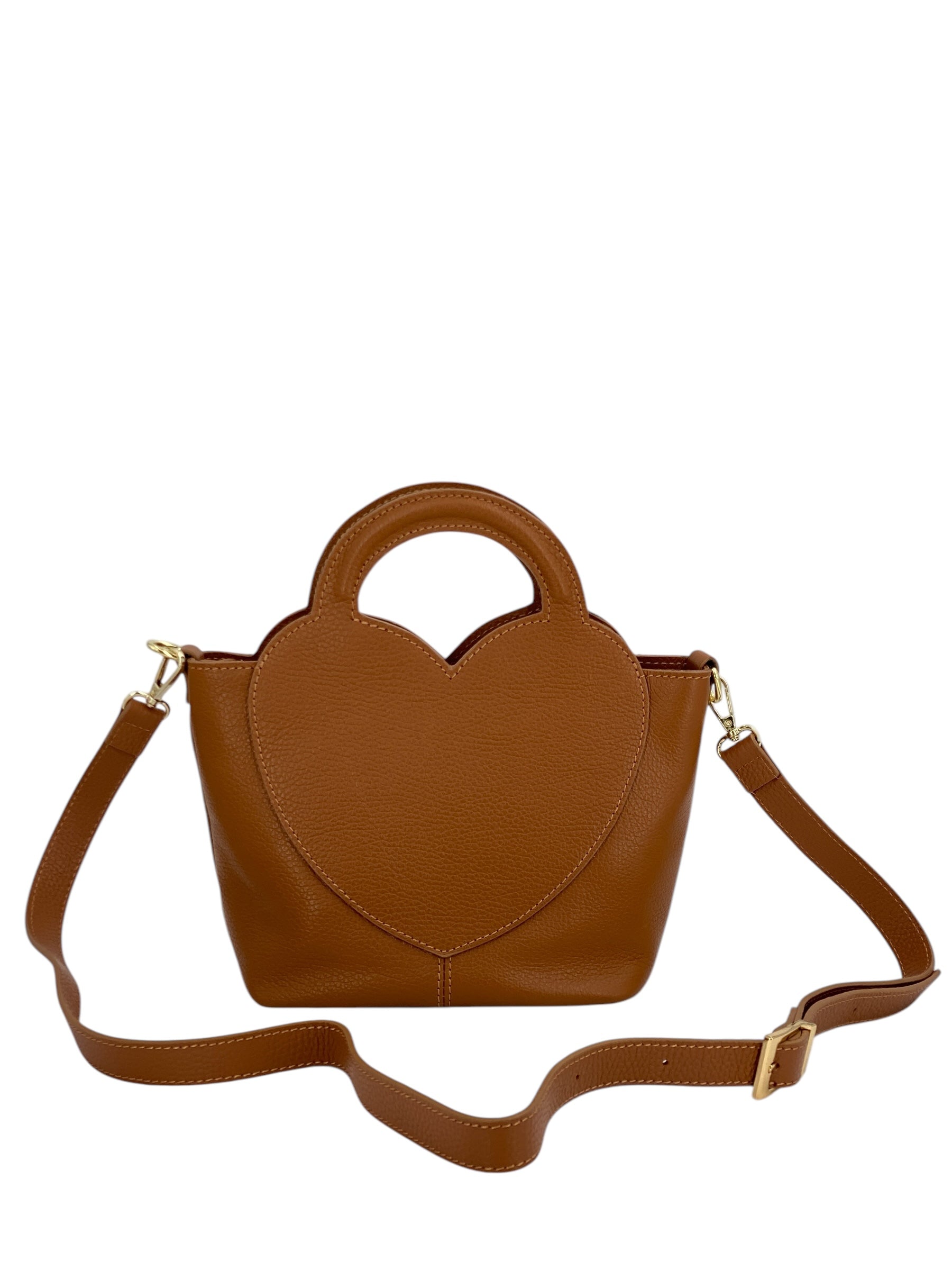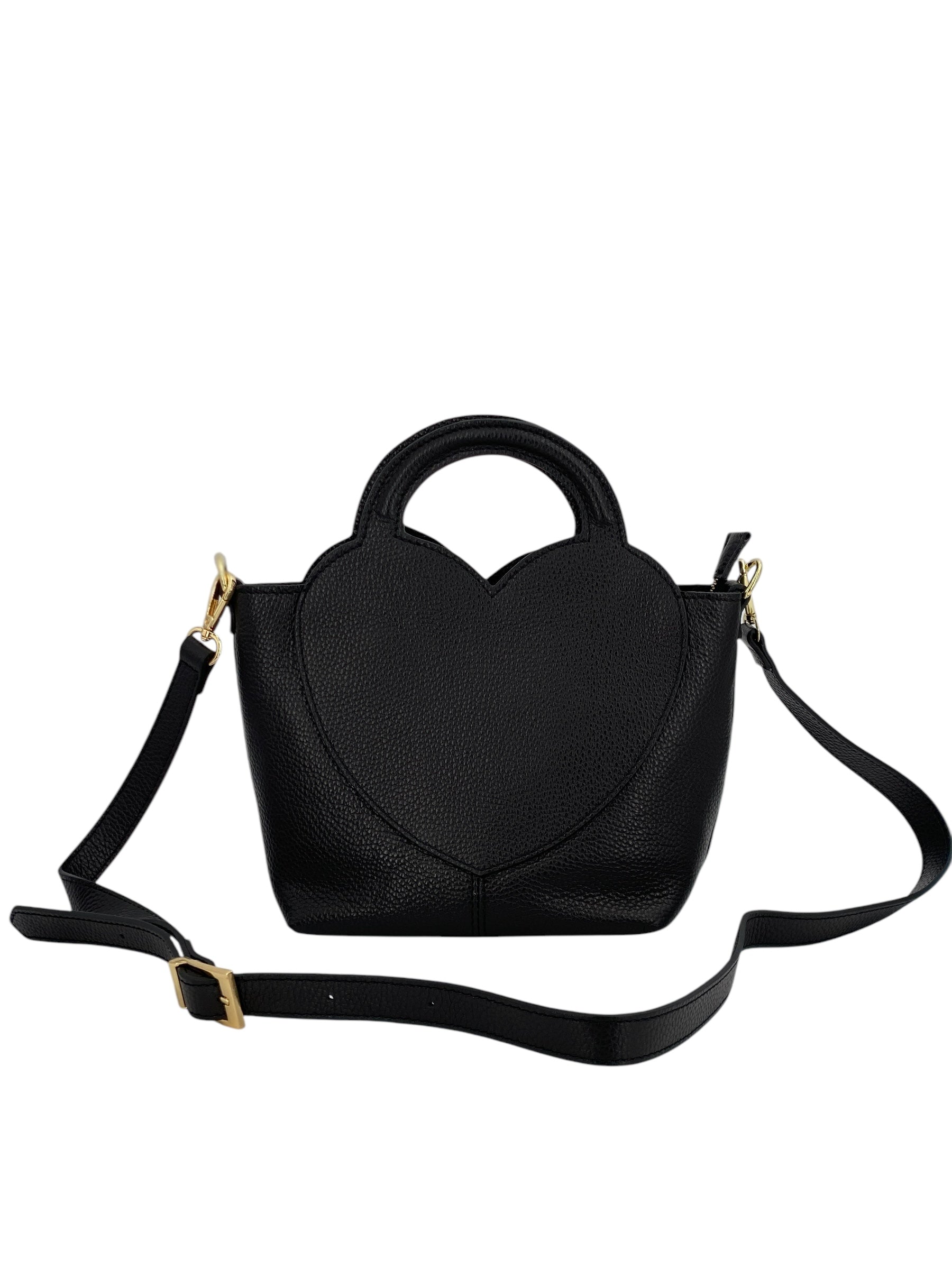 La sua silhouette compatta è resa unica da un dettaglio a forma di cuore, perfettamente integrato nella struttura: un segno di dolcezza e artigianalità che non passa inosservato. Il manico rigido superiore, rivestito in pelle e fuso nel profilo del cuore, dona una portabilità a mano confortevole e distintiva.