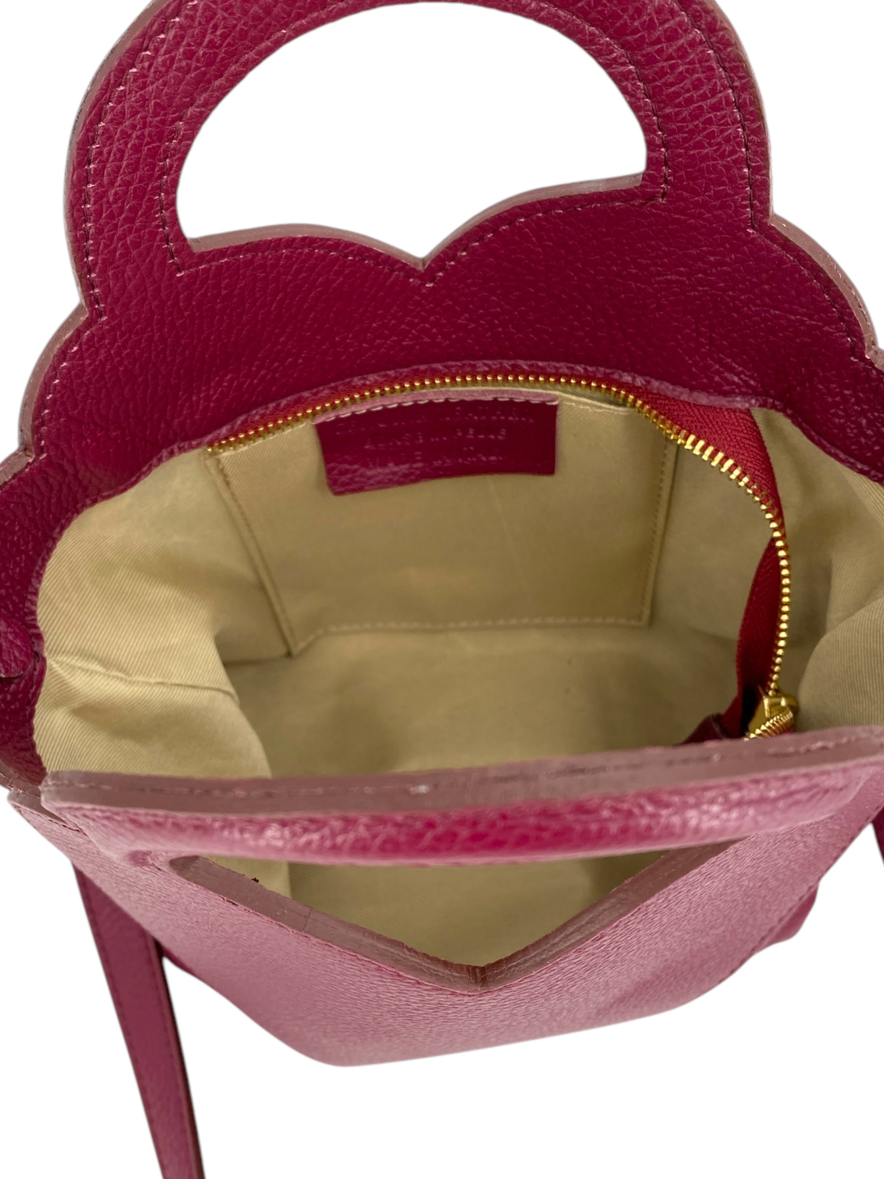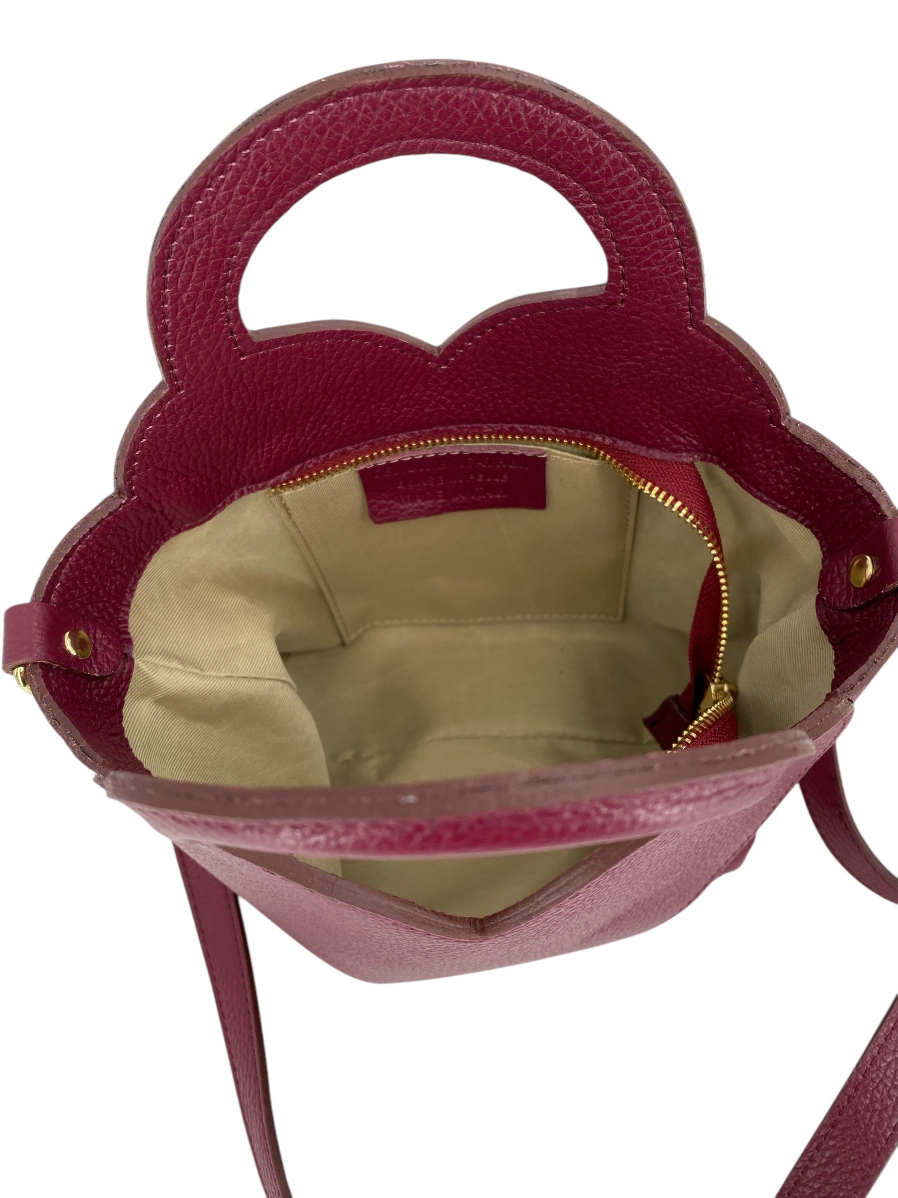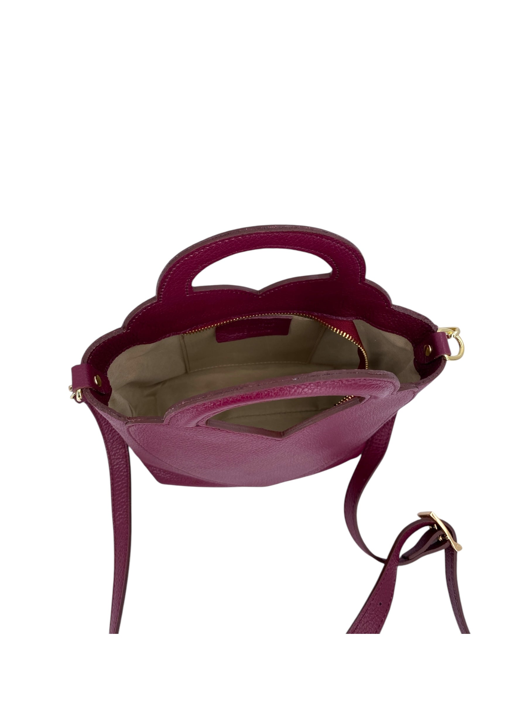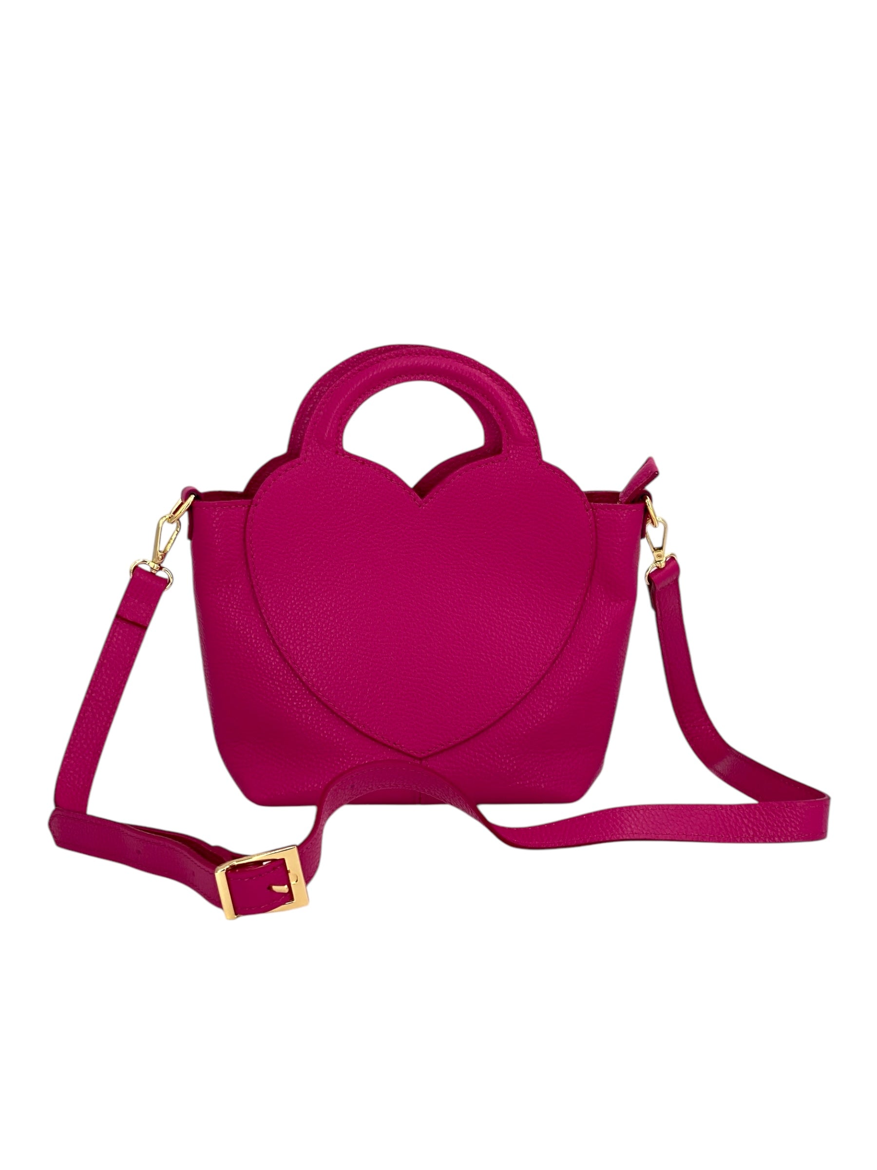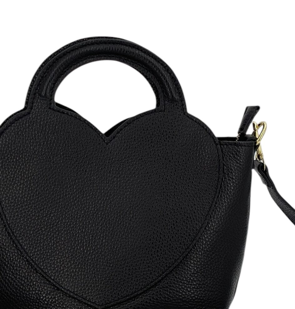 La sua silhouette compatta è resa unica da un dettaglio a forma di cuore, perfettamente integrato nella struttura: un segno di dolcezza e artigianalità che non passa inosservato. Il manico rigido superiore, rivestito in pelle e fuso nel profilo del cuore, dona una portabilità a mano confortevole e distintiva.