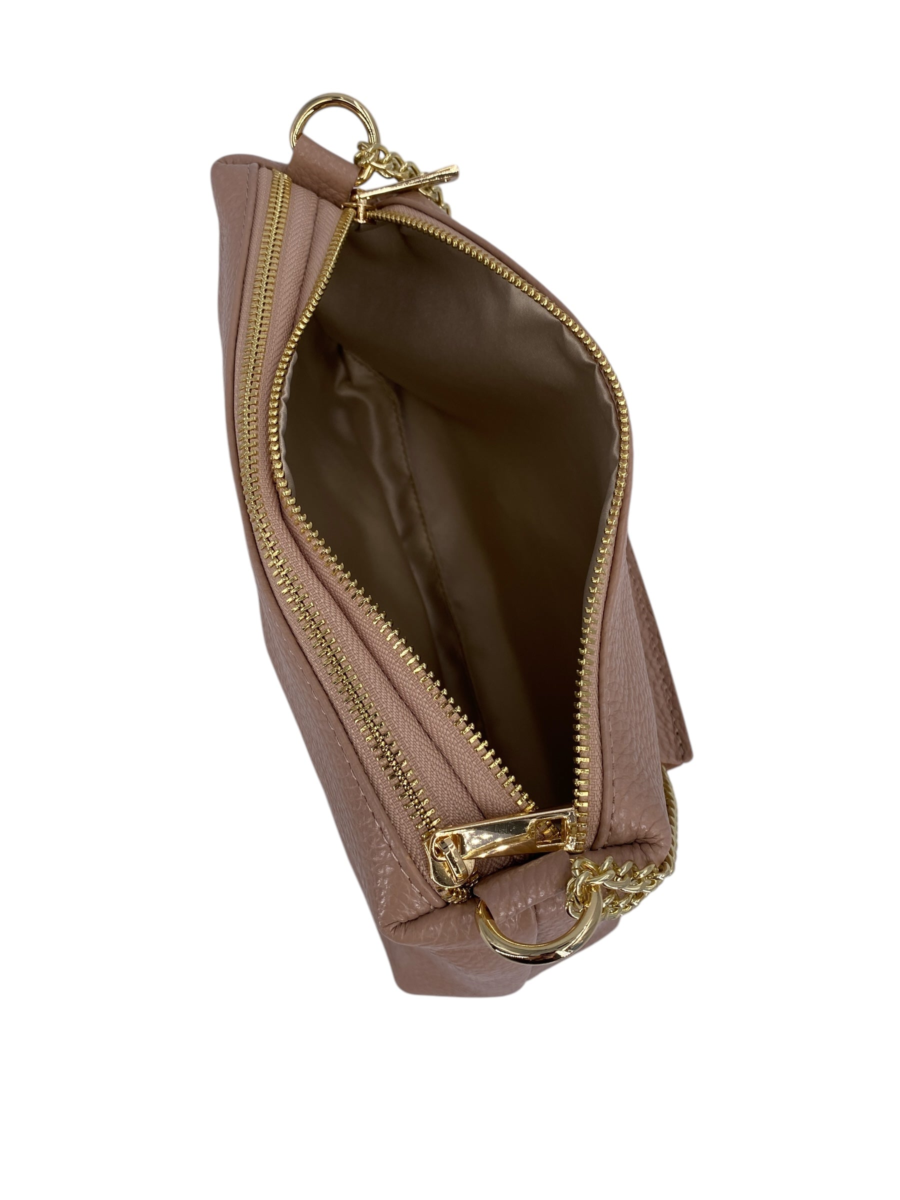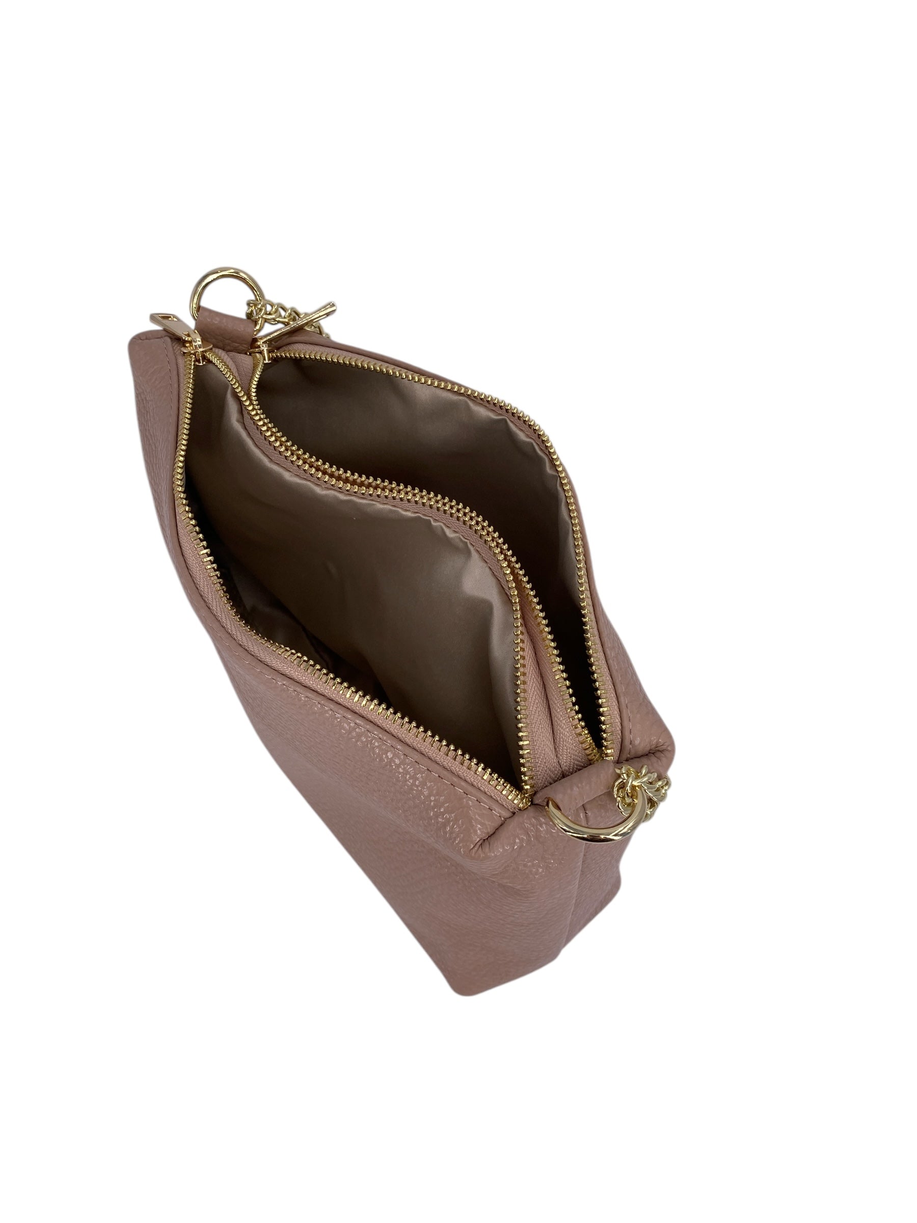 Interno: Doppia zip superiore che apre su due scomparti separati, foderati in tessuto satinato, per una perfetta organizzazione