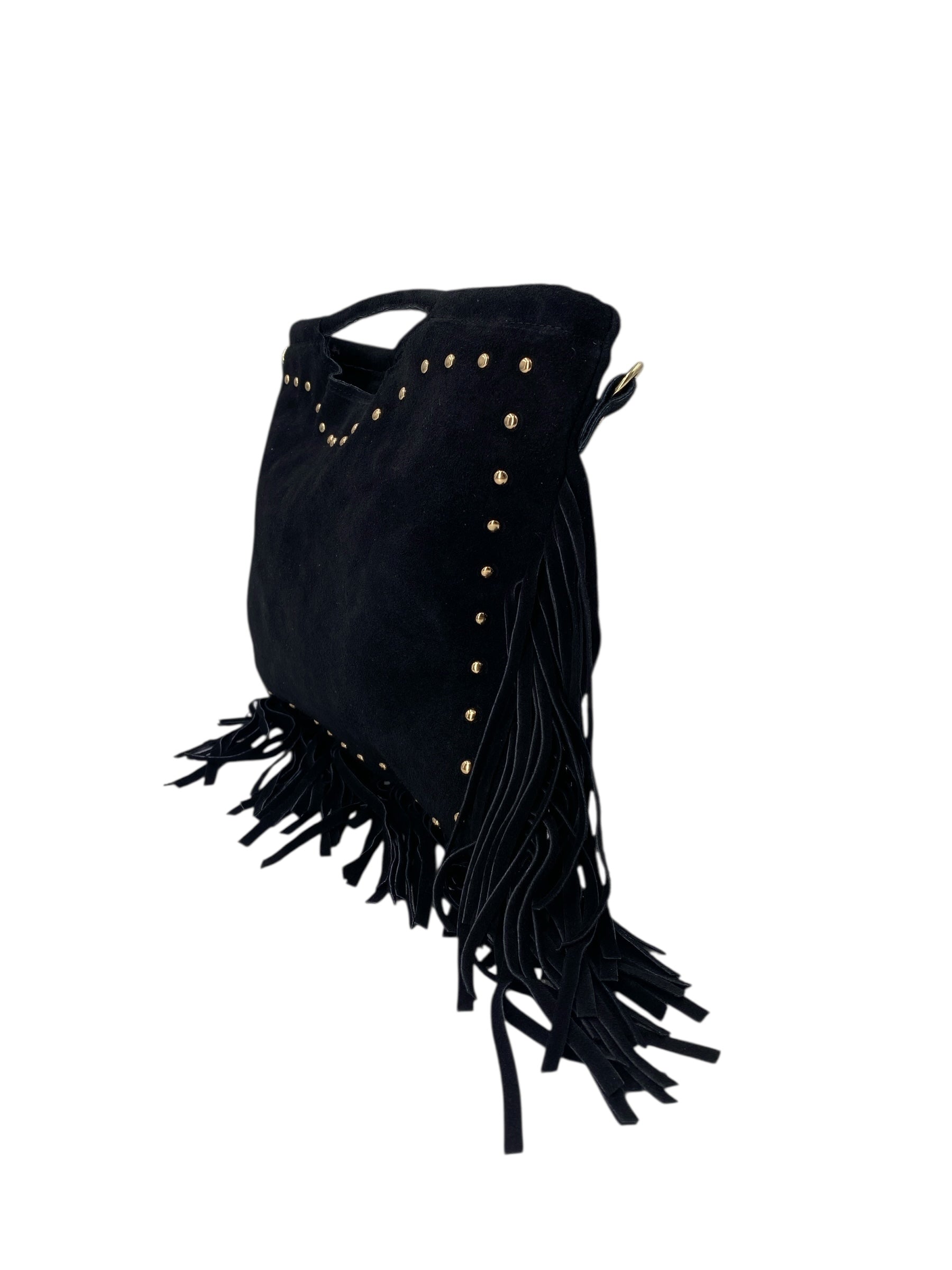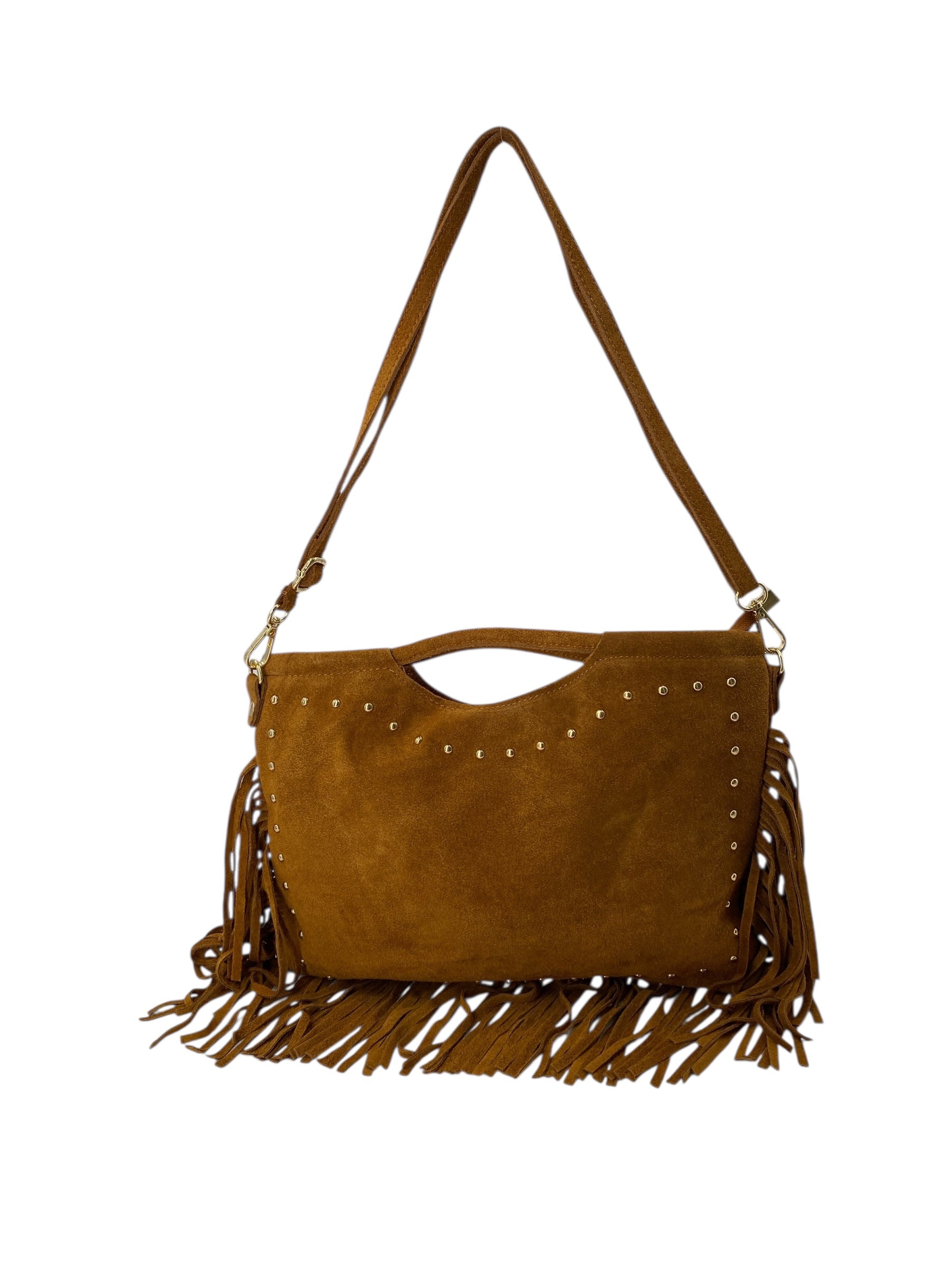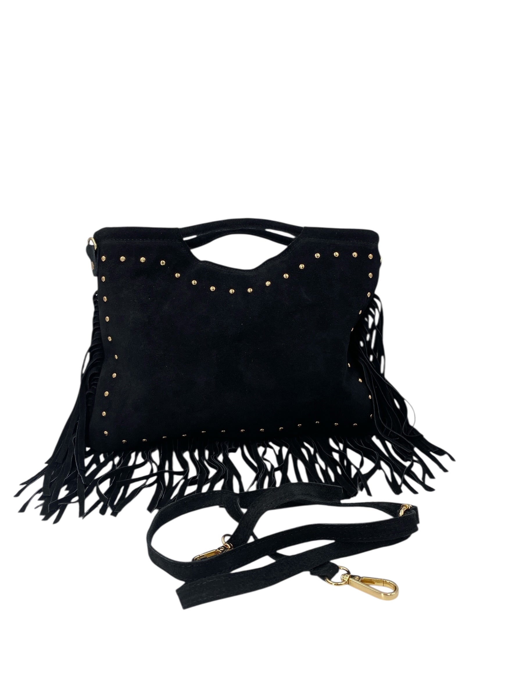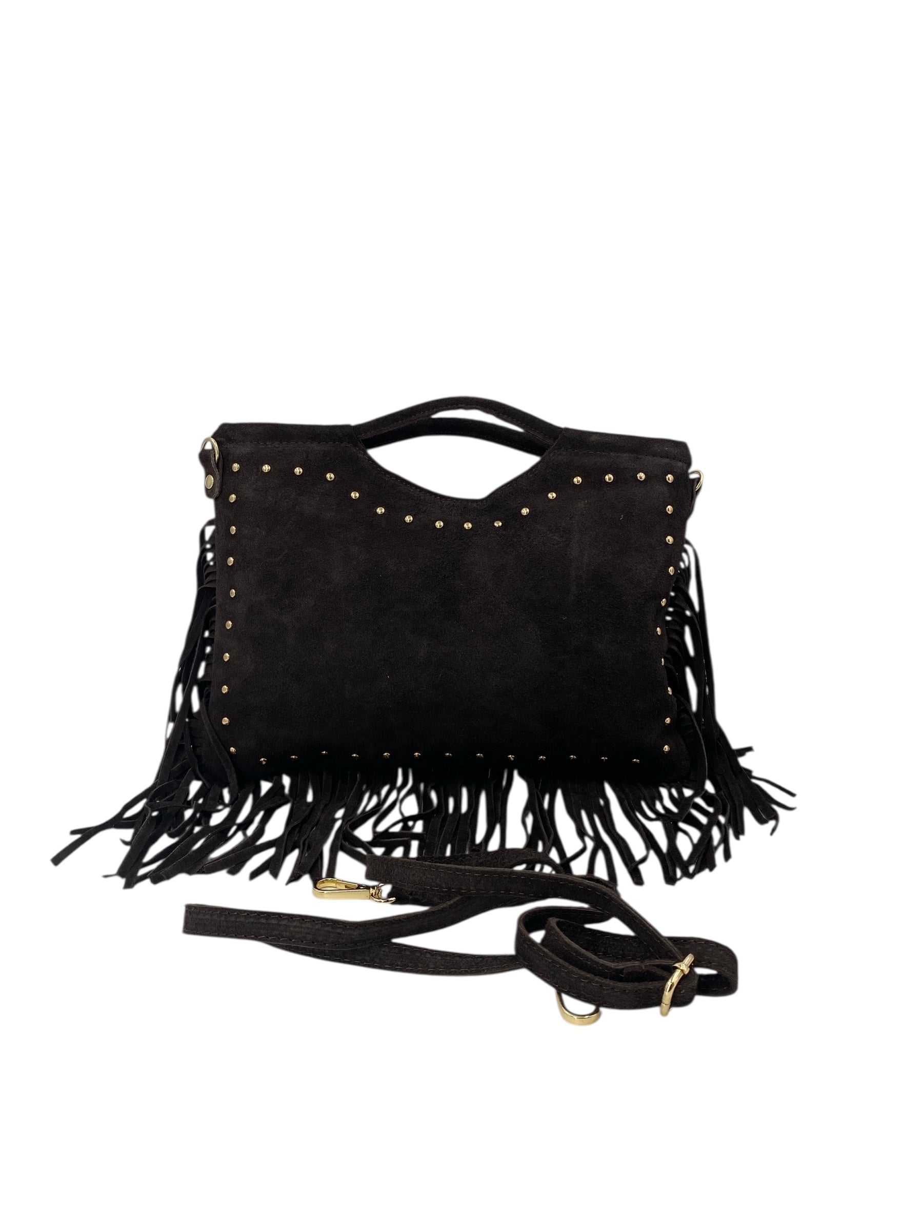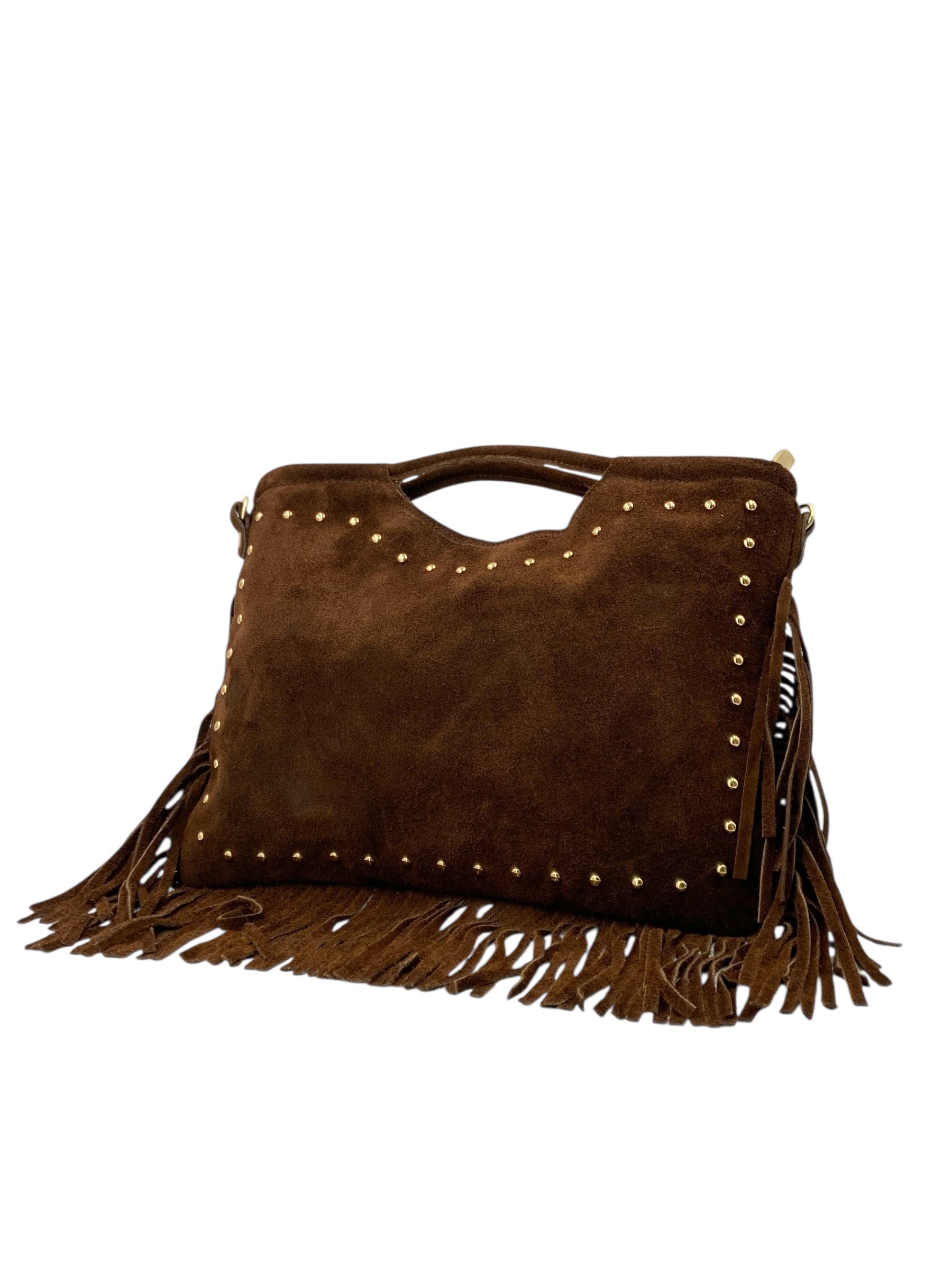 Frange laterali e inferiori in pelle che aggiungono movimento e carattere boho-chic.