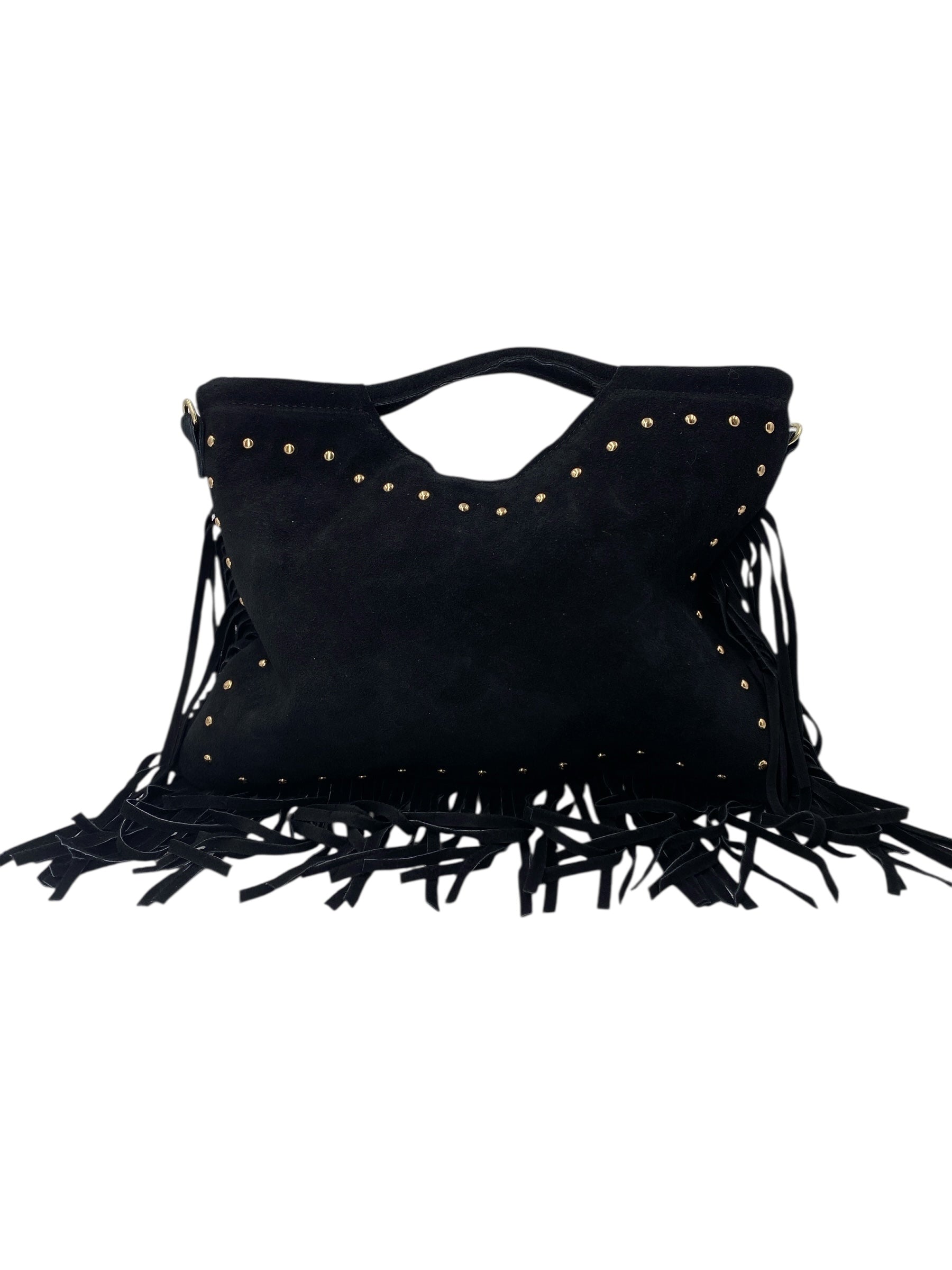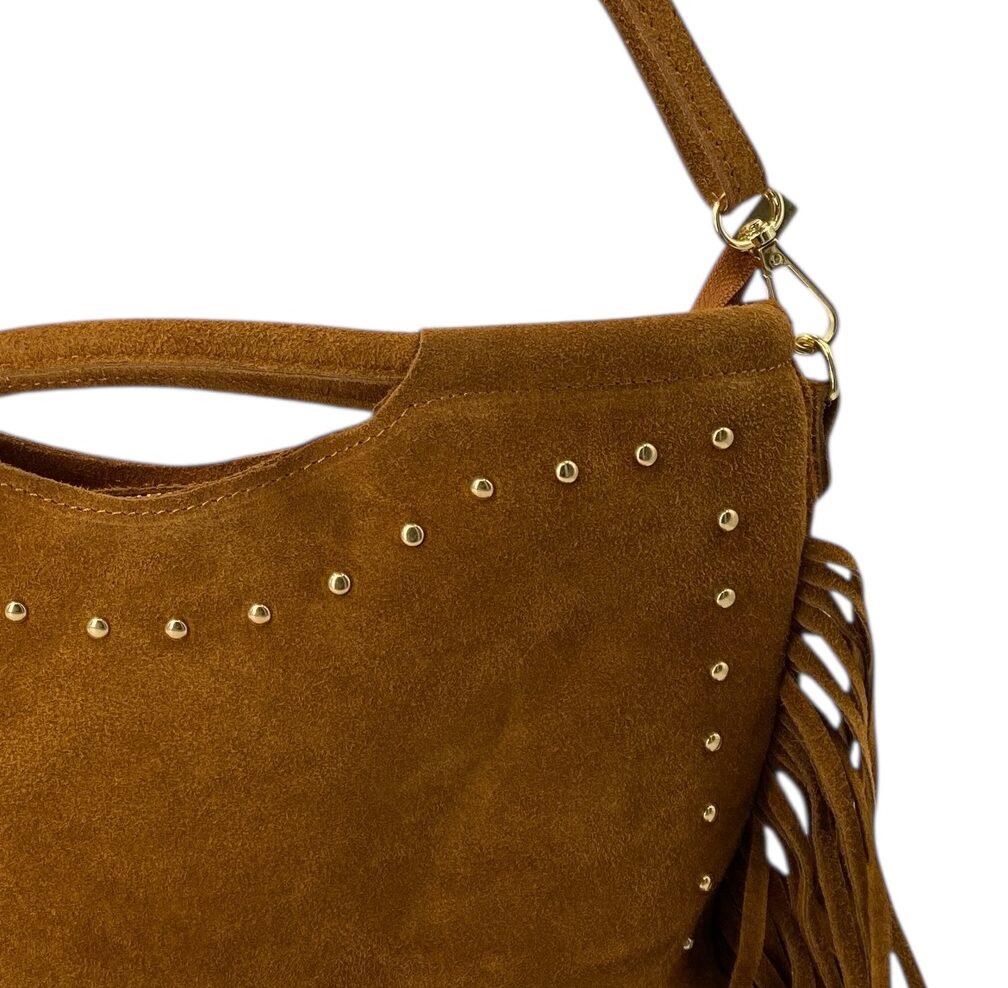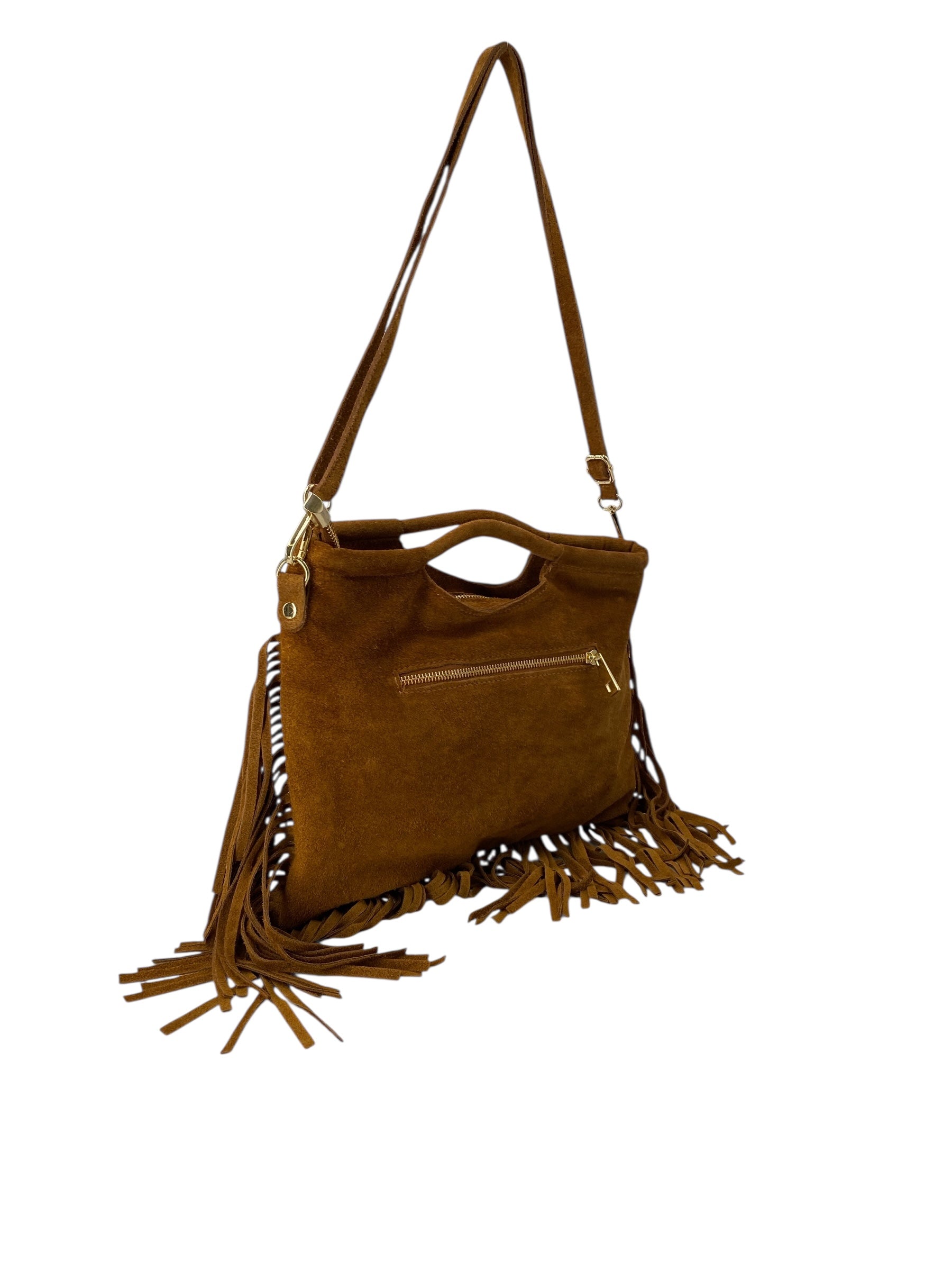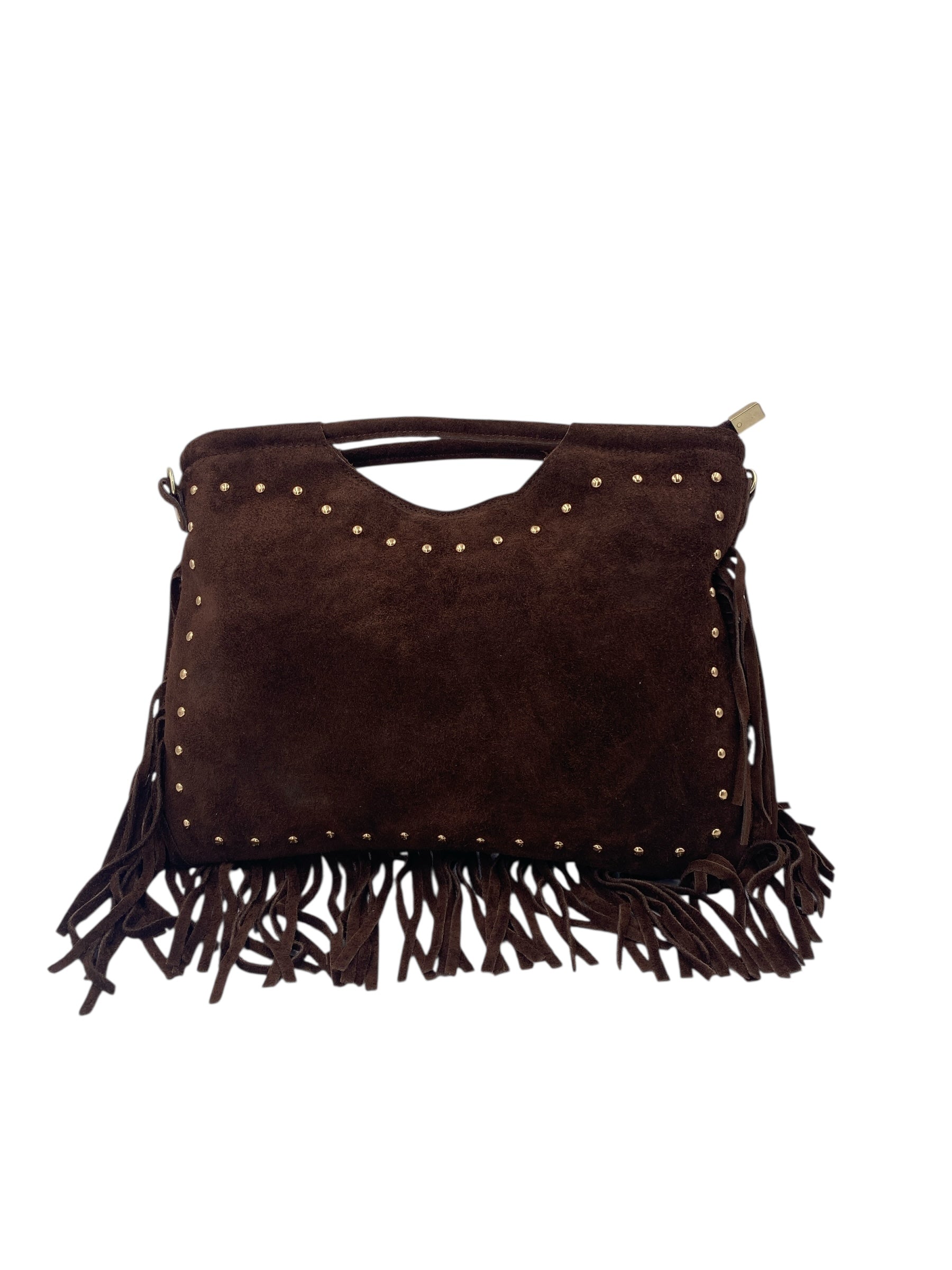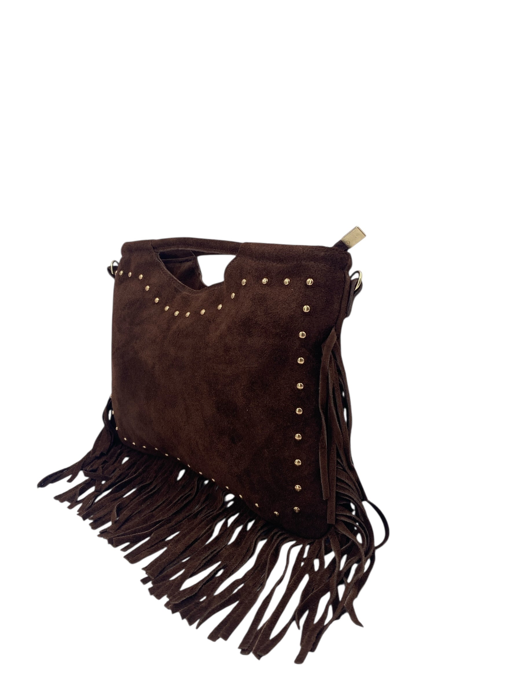 Frange laterali e inferiori in pelle che aggiungono movimento e carattere boho-chic.