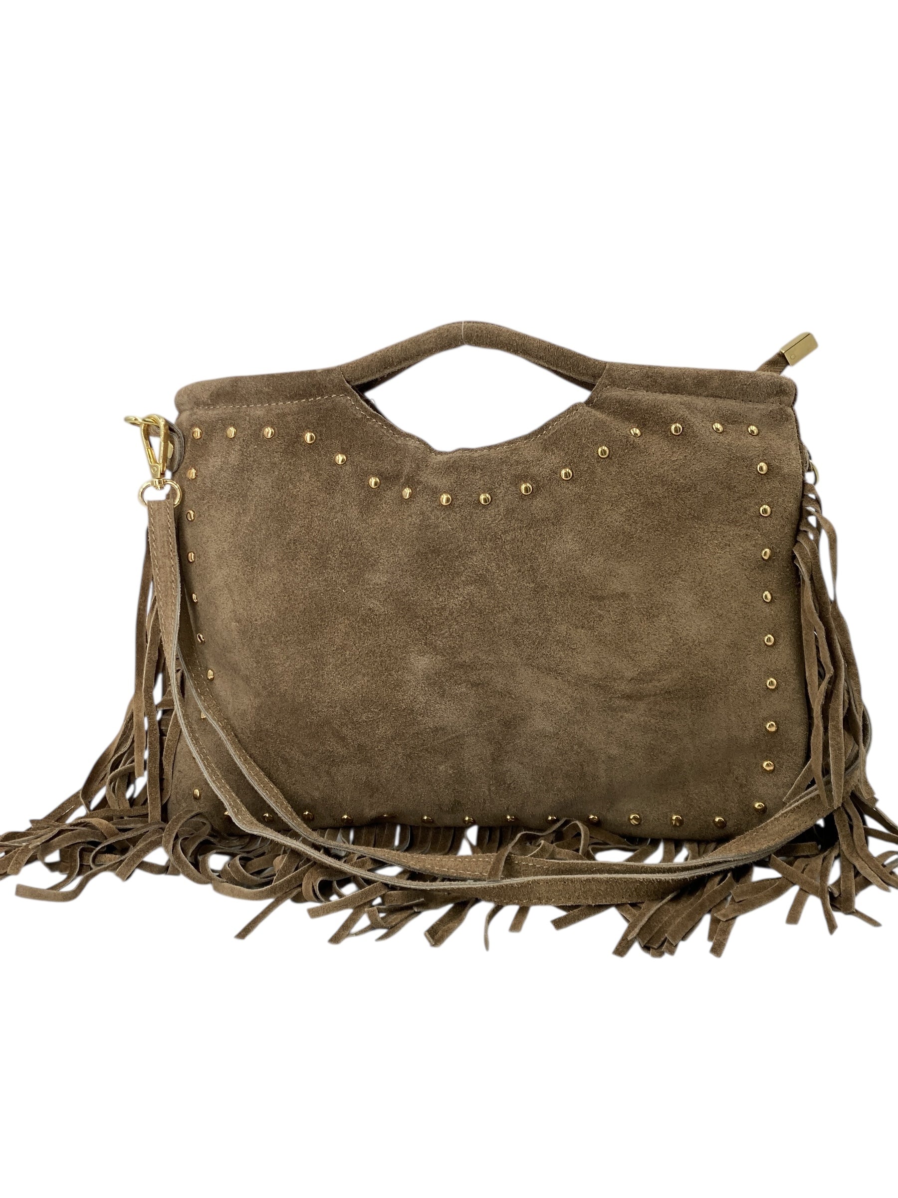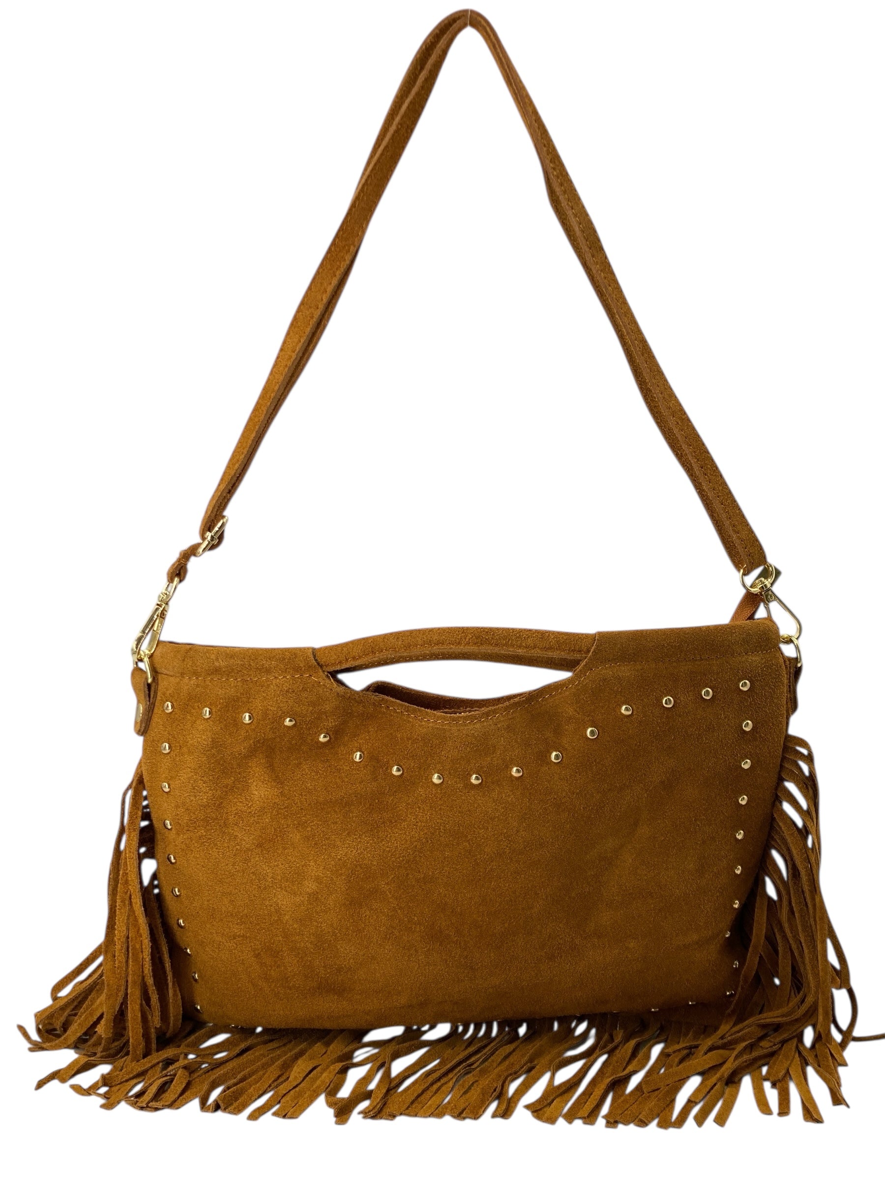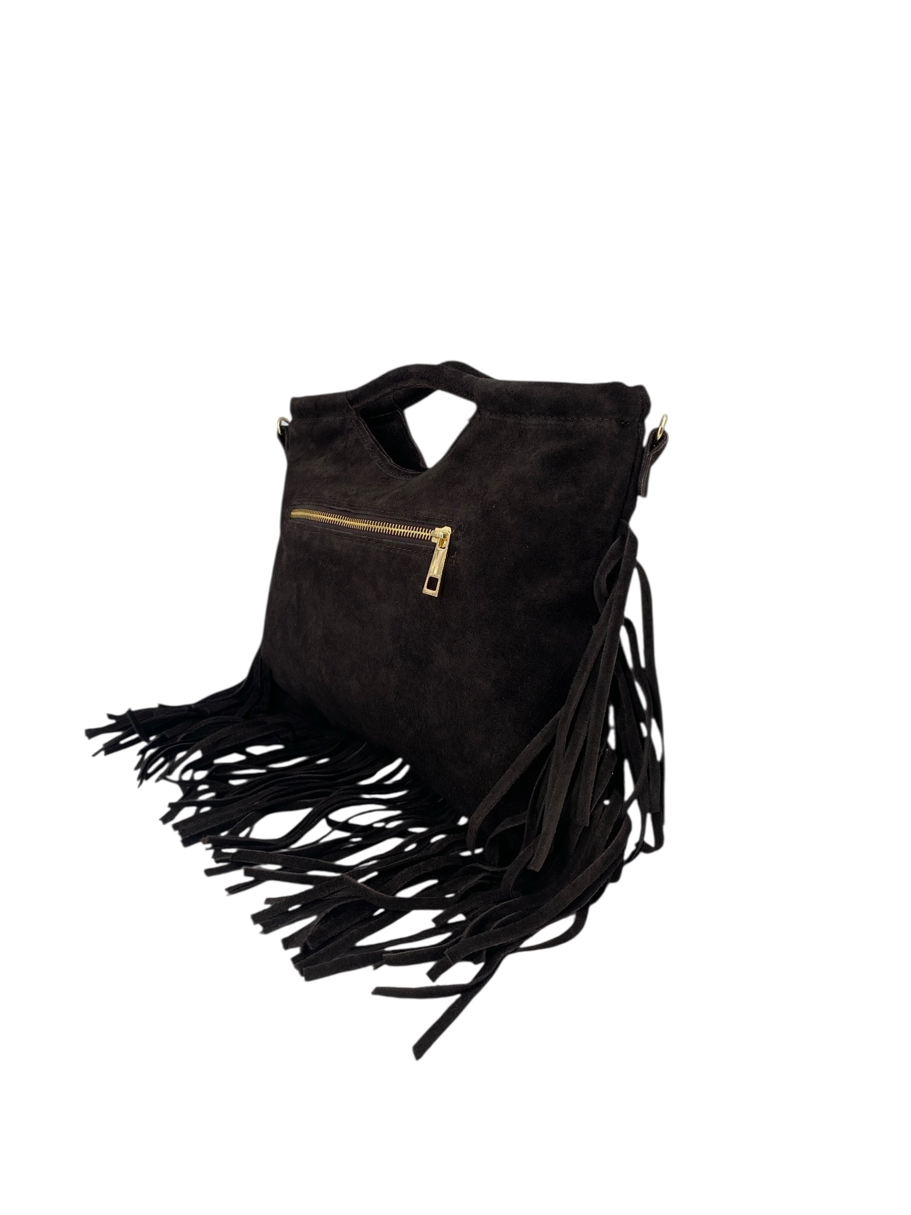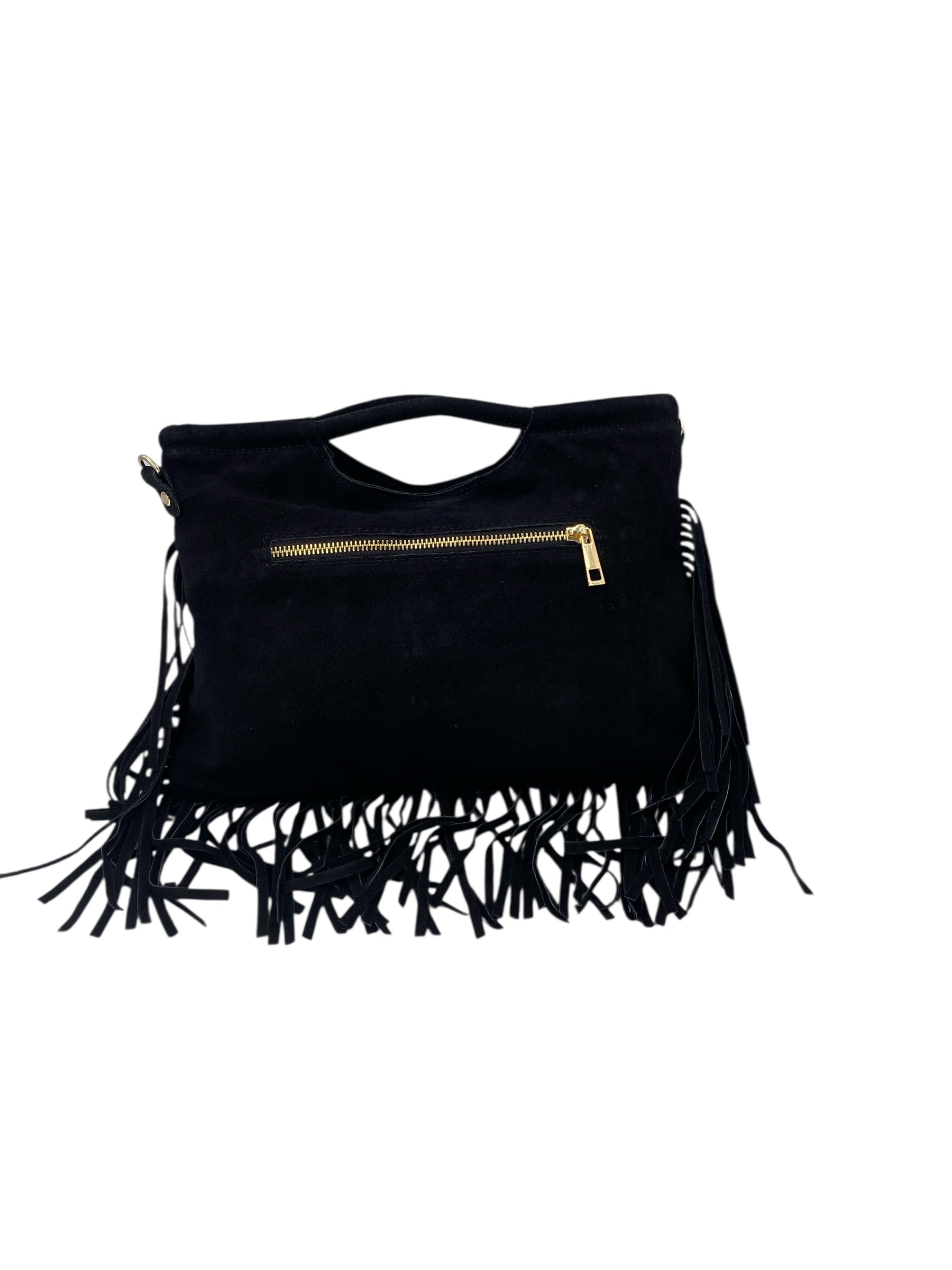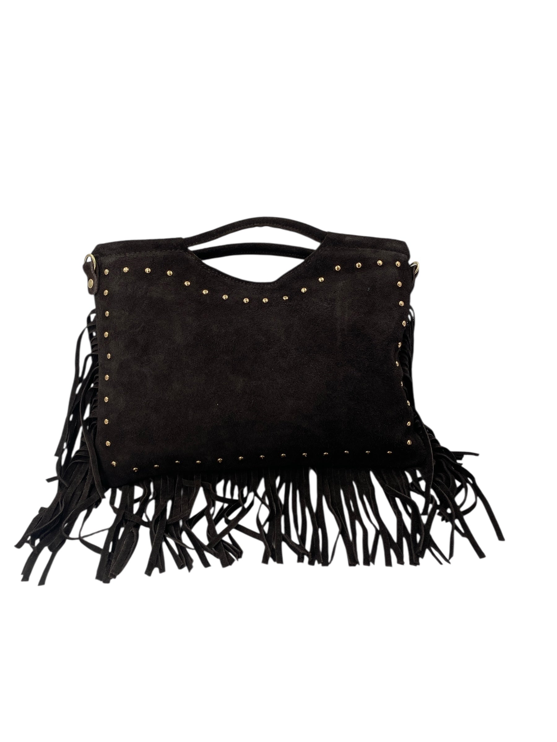 Frange laterali e inferiori in pelle che aggiungono movimento e carattere boho-chic.