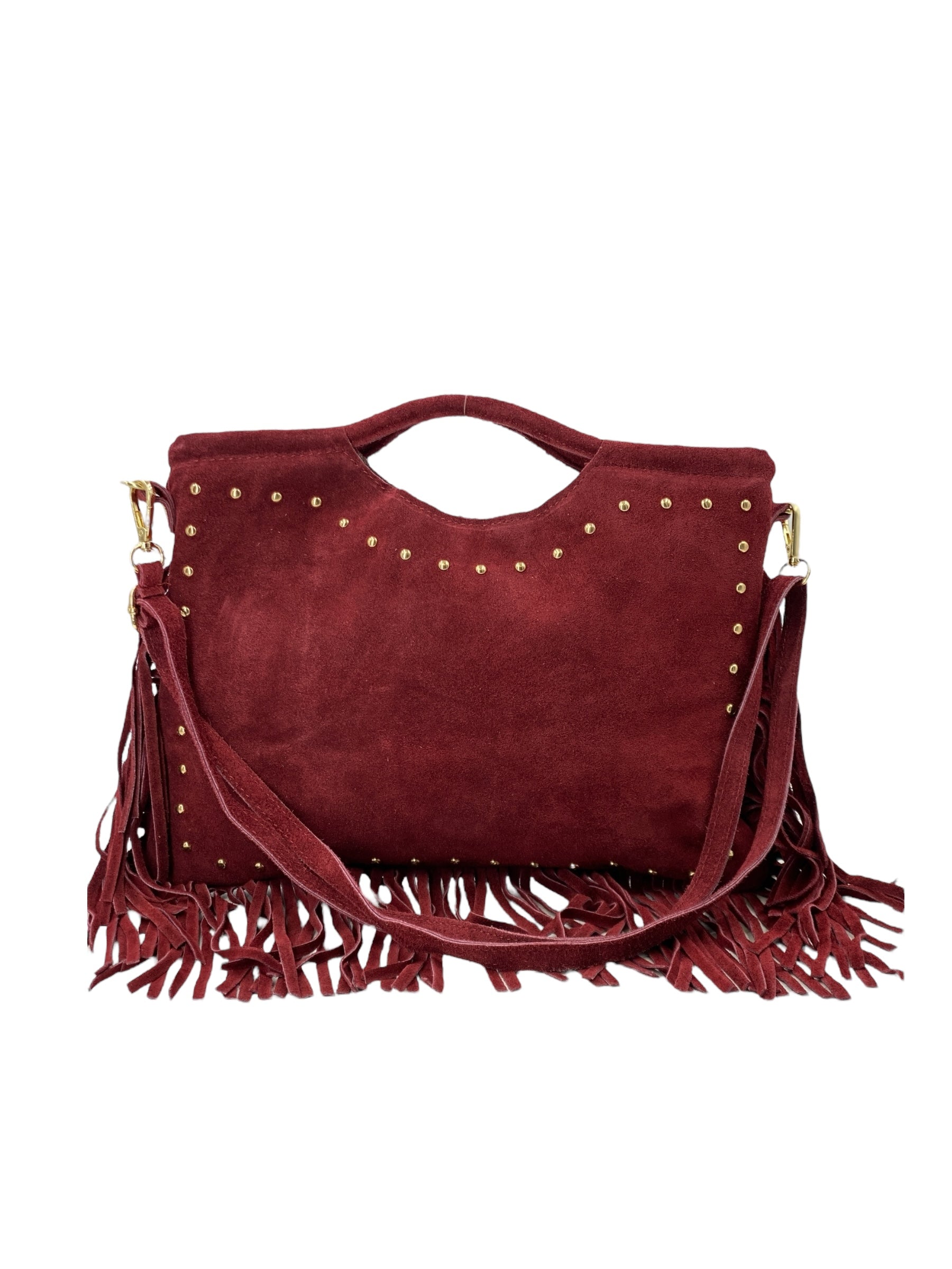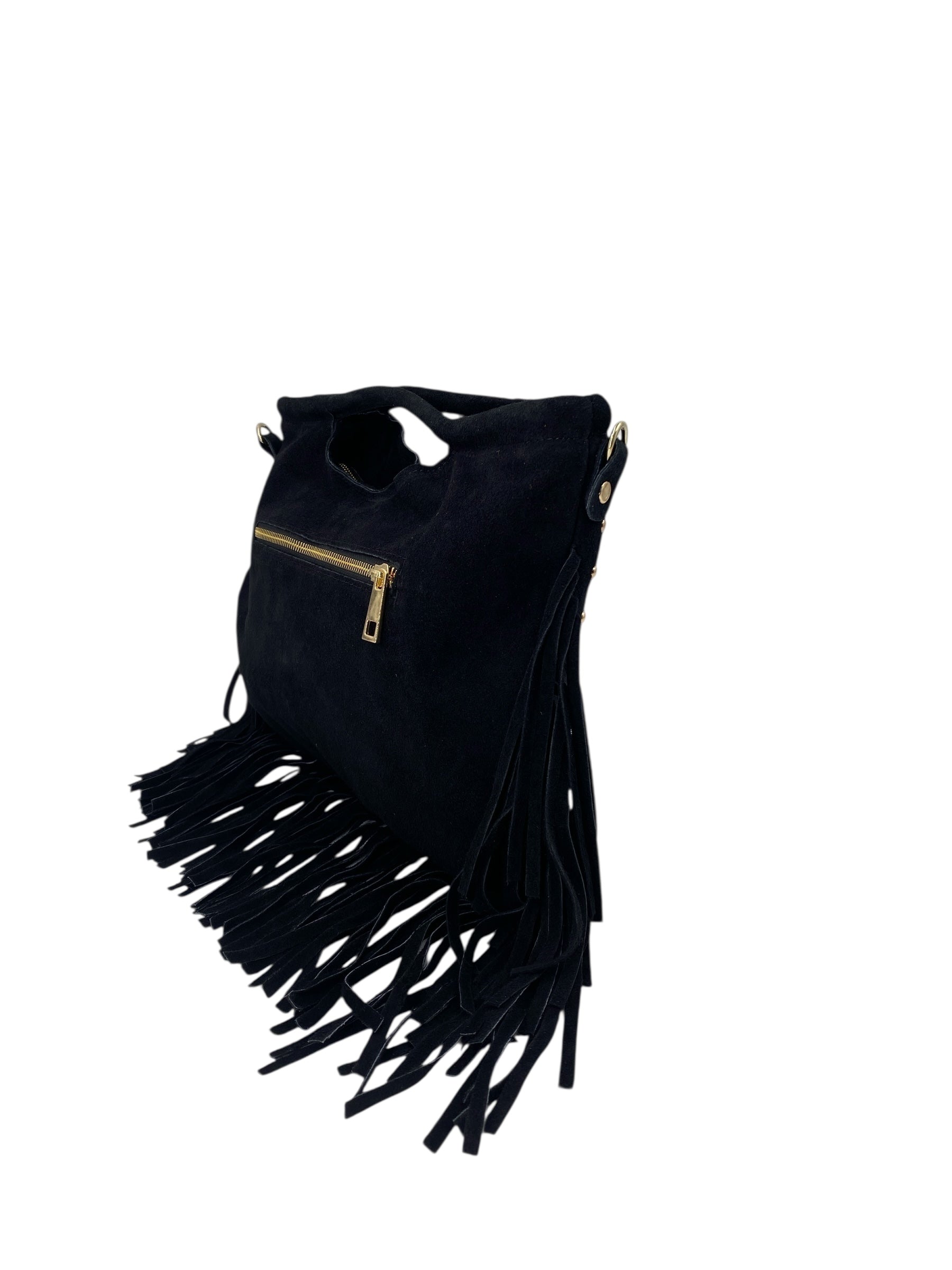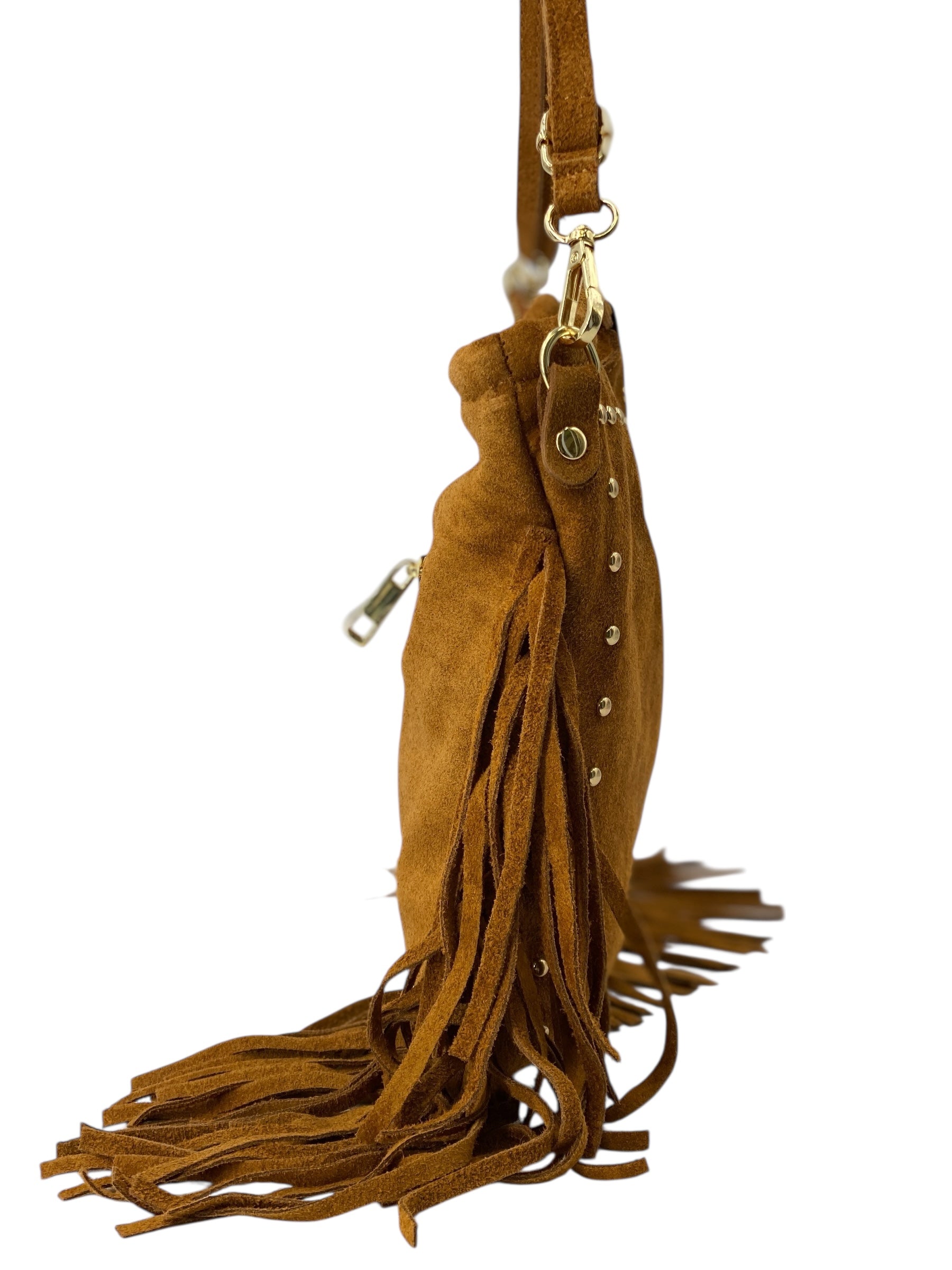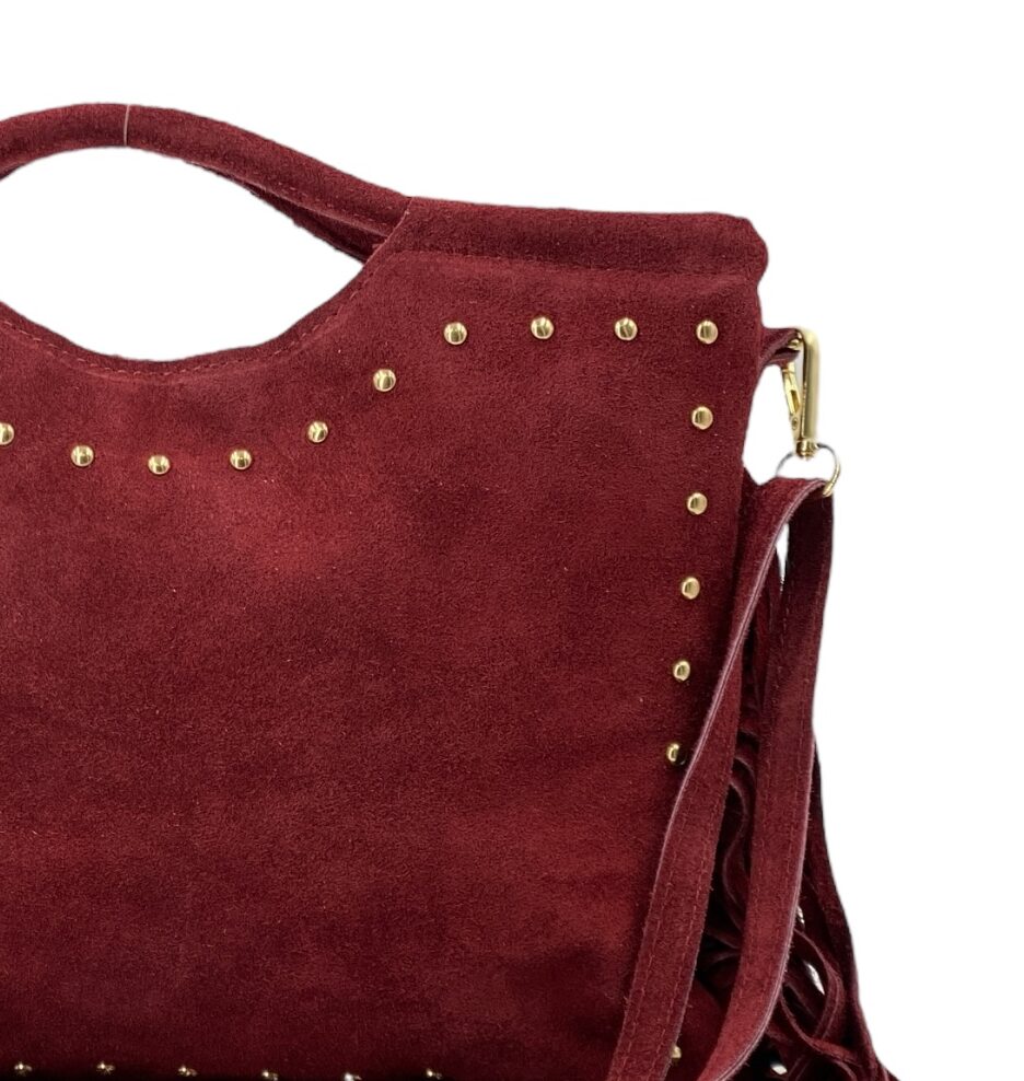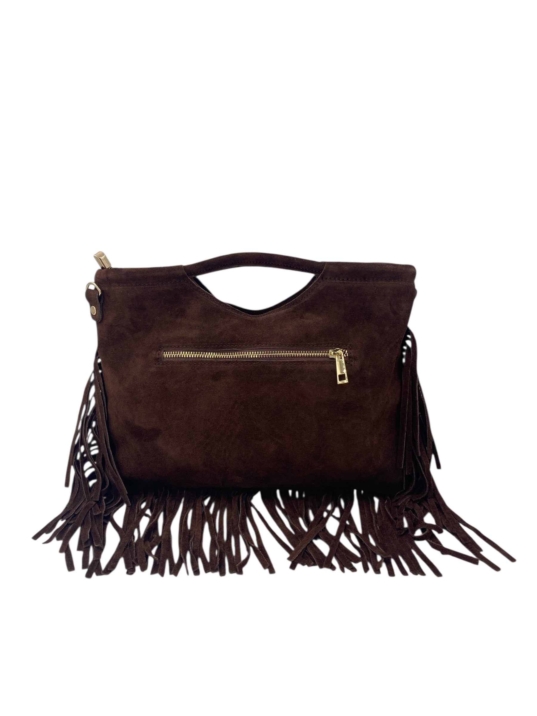 Frange laterali e inferiori in pelle che aggiungono movimento e carattere boho-chic.