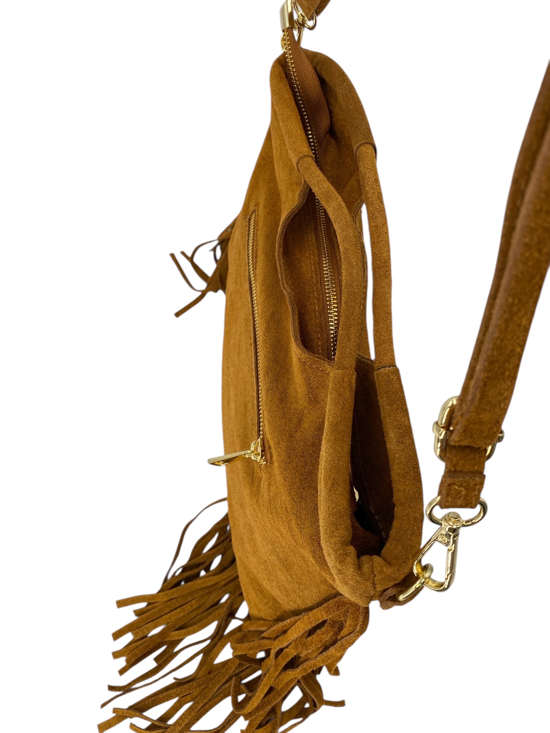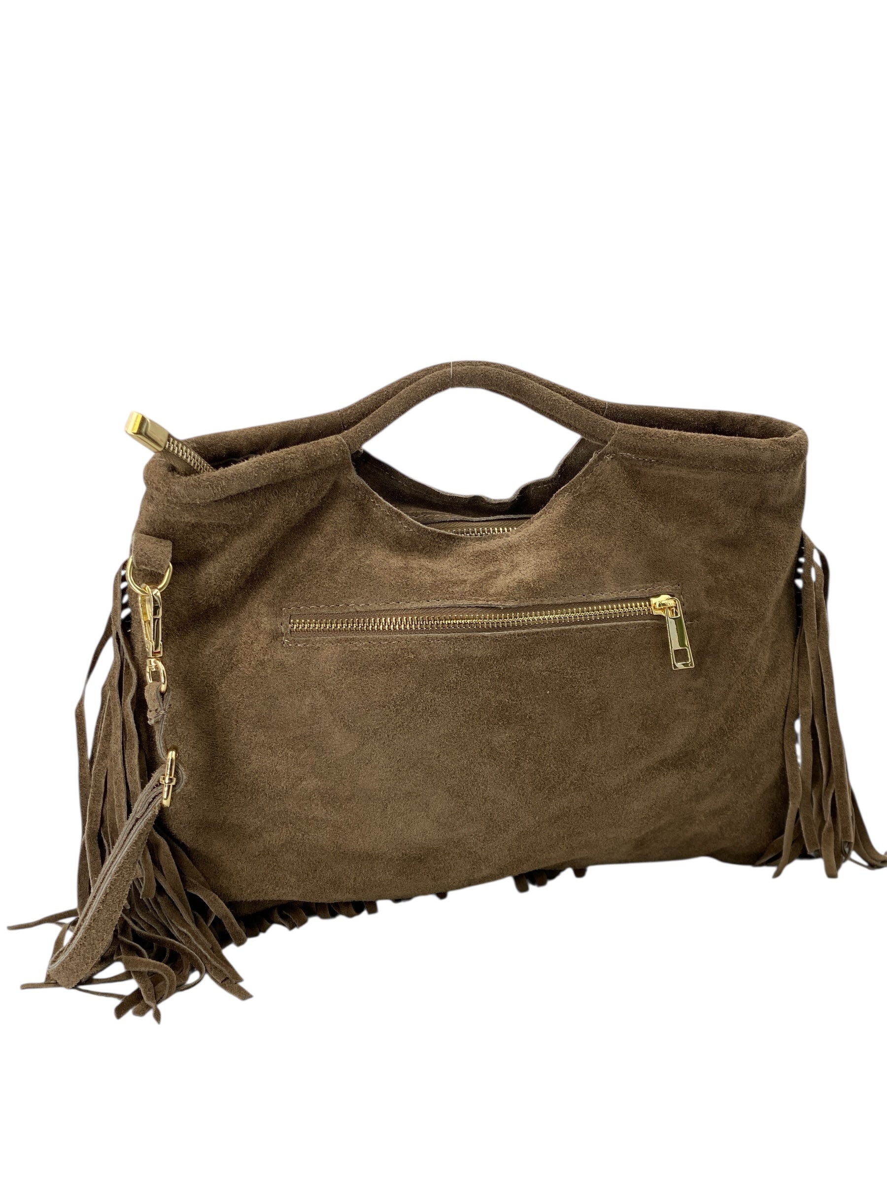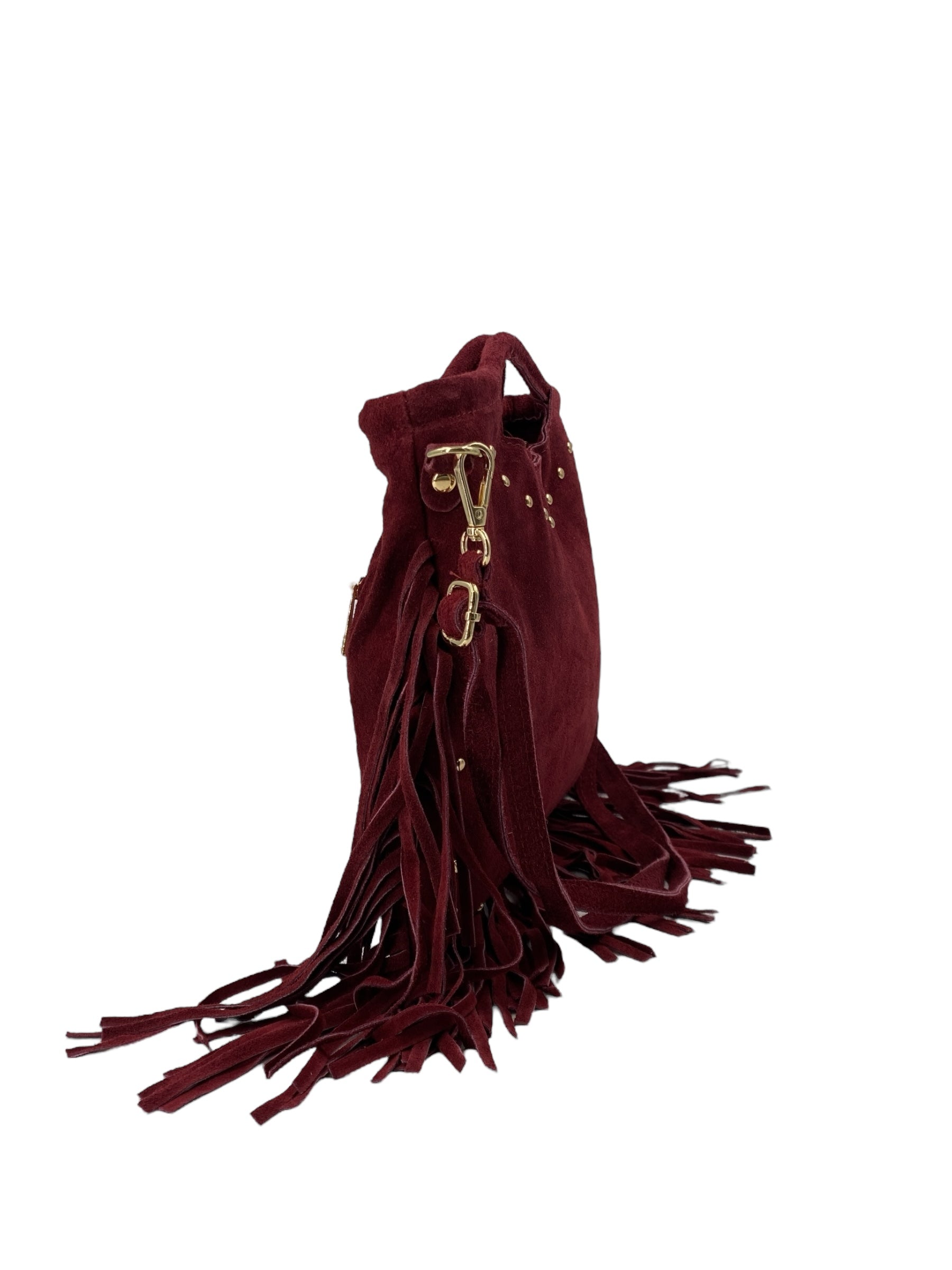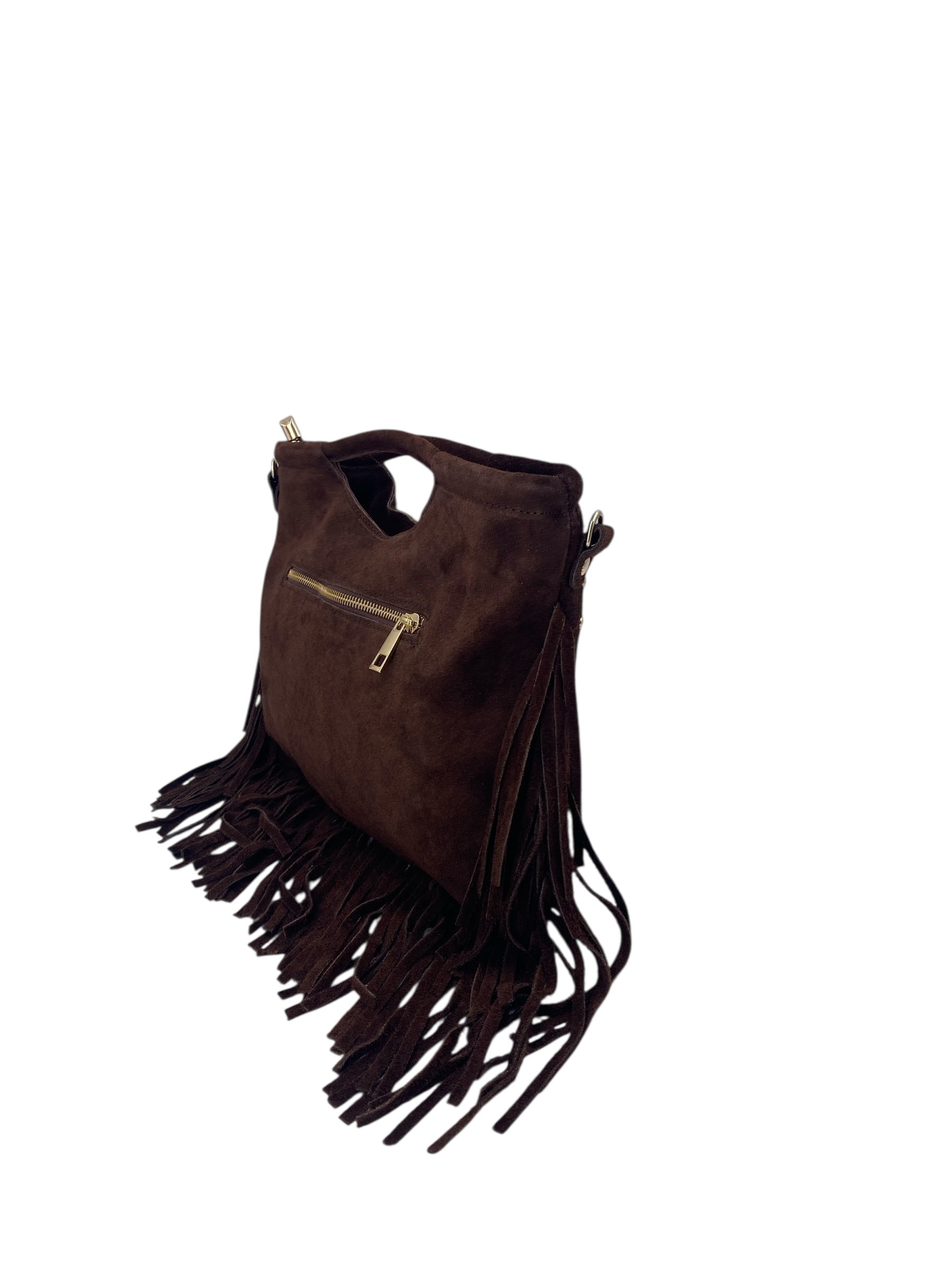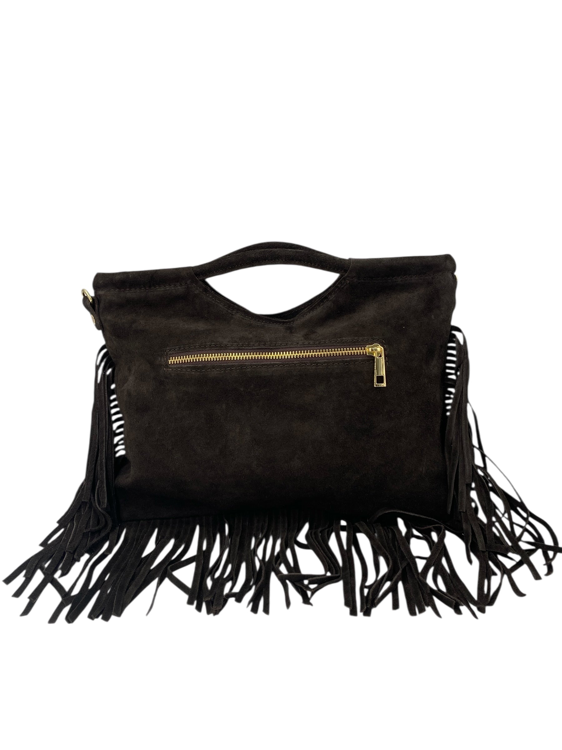 Frange laterali e inferiori in pelle che aggiungono movimento e carattere boho-chic.