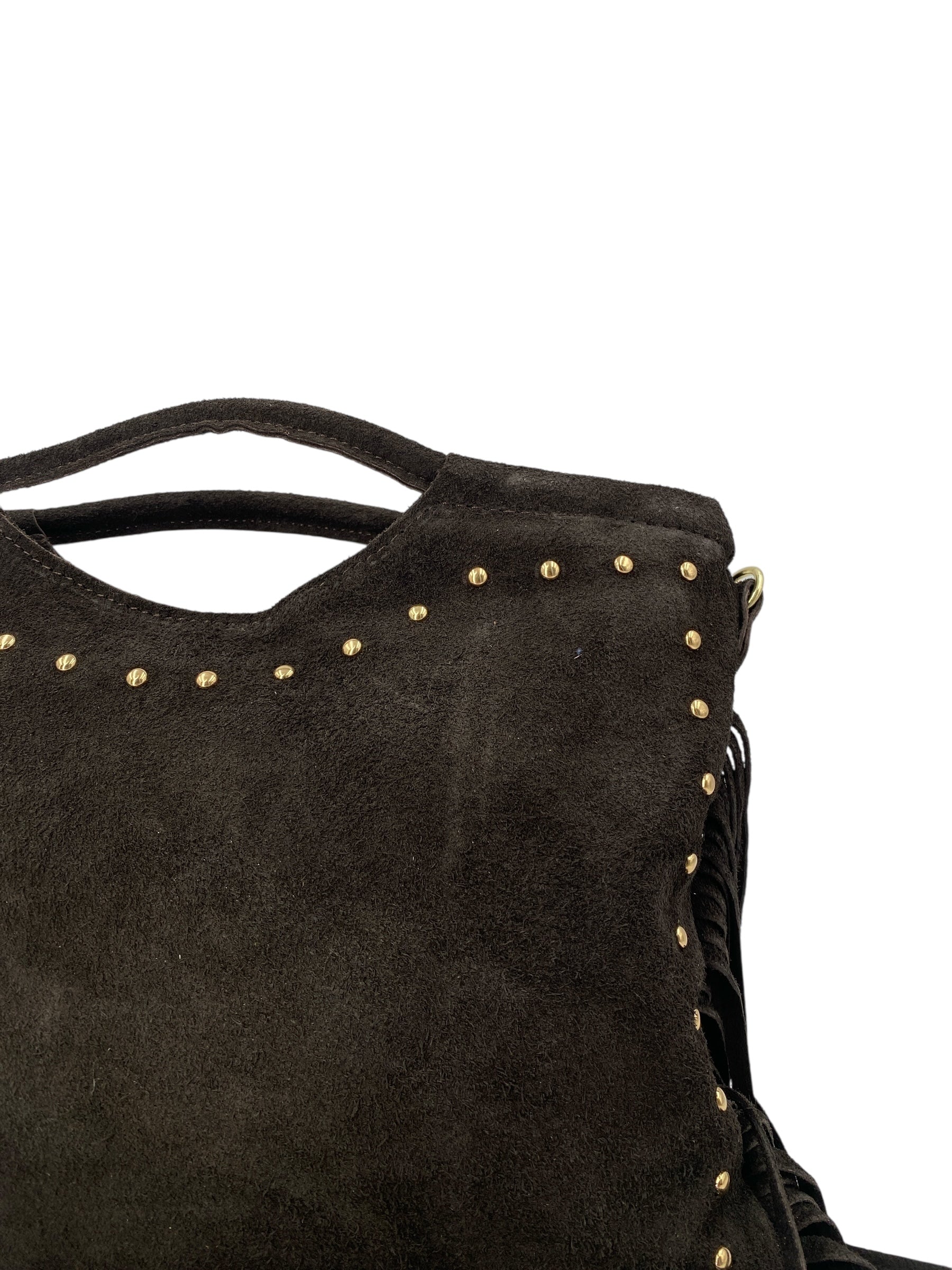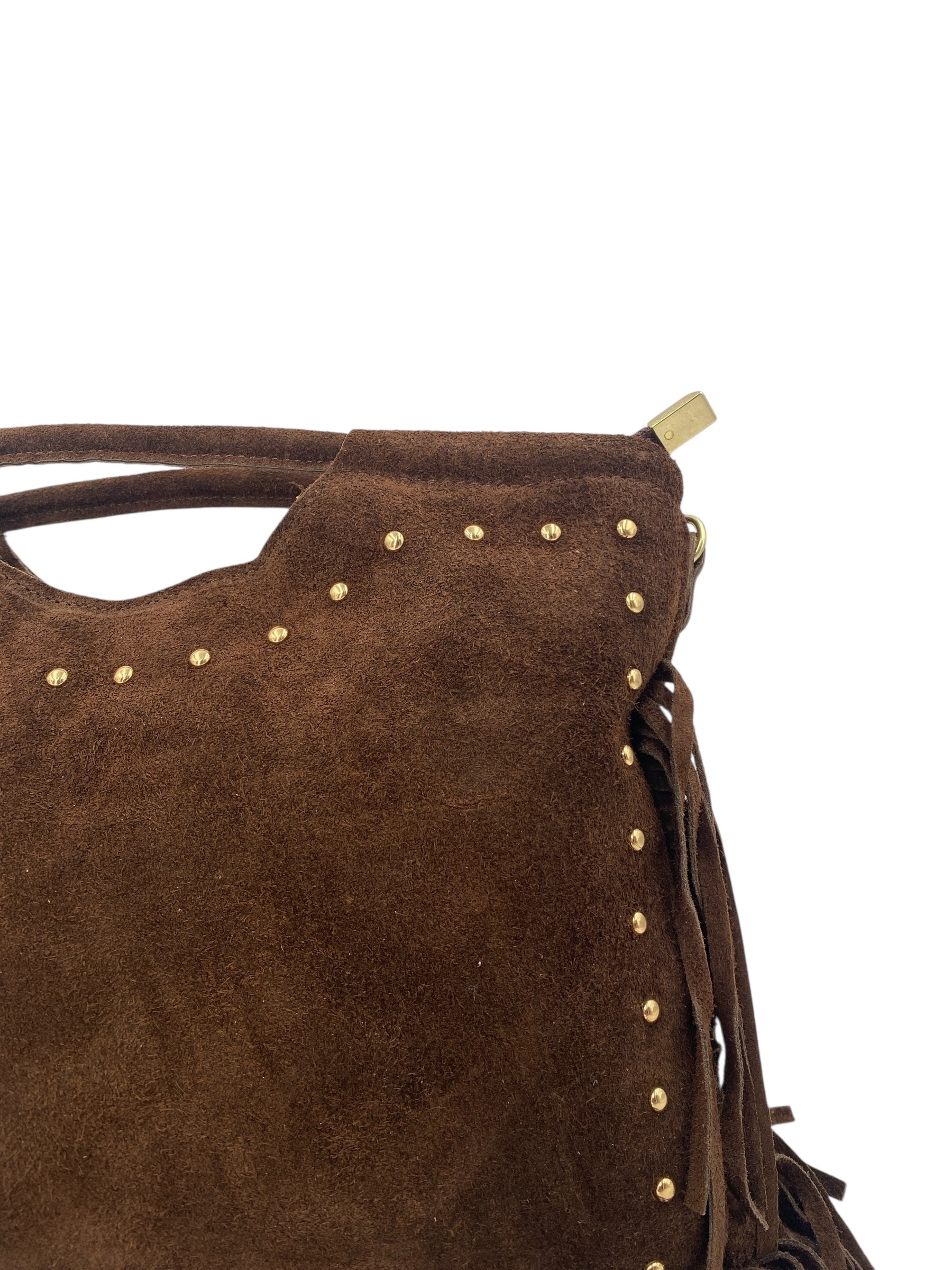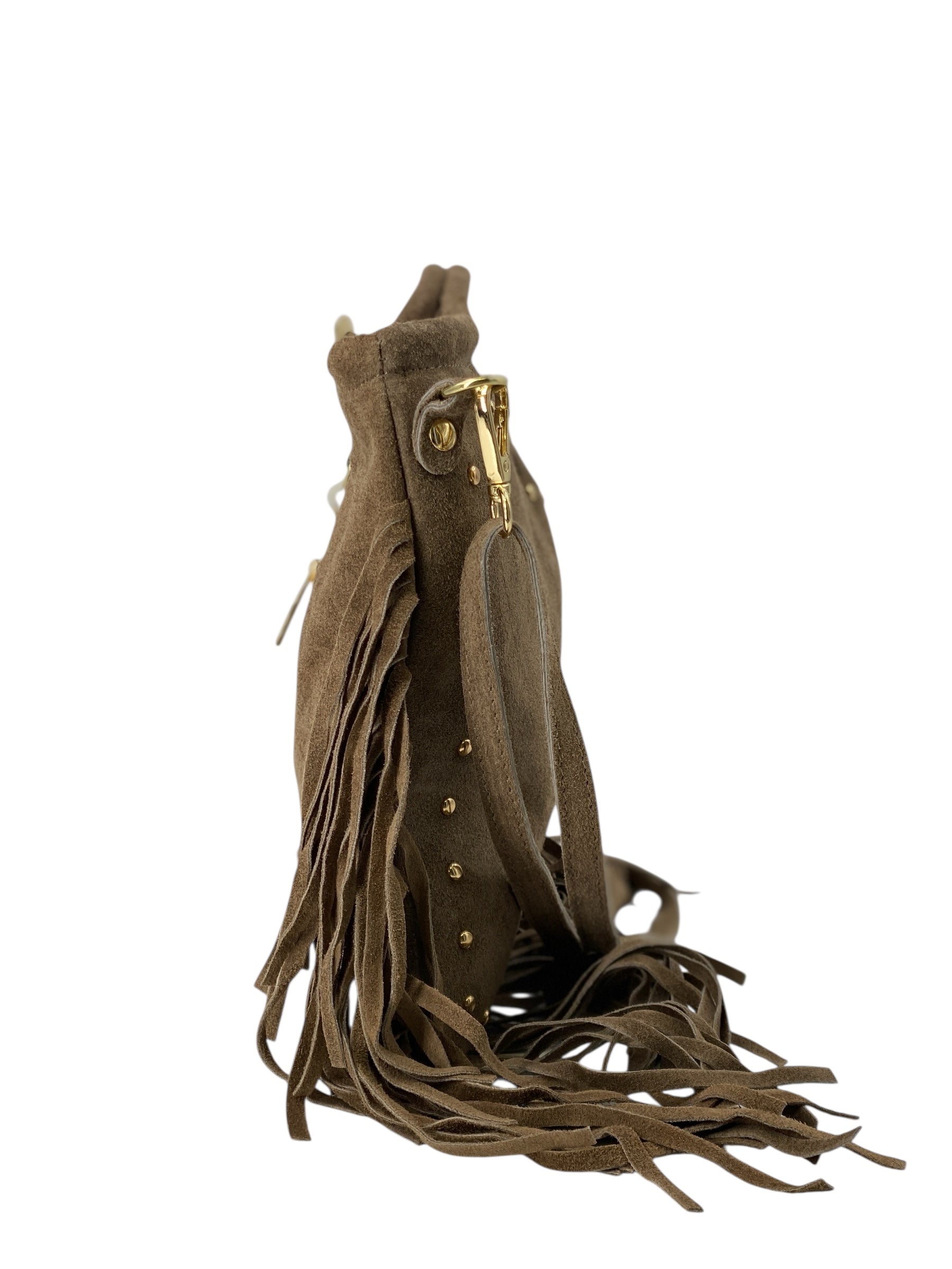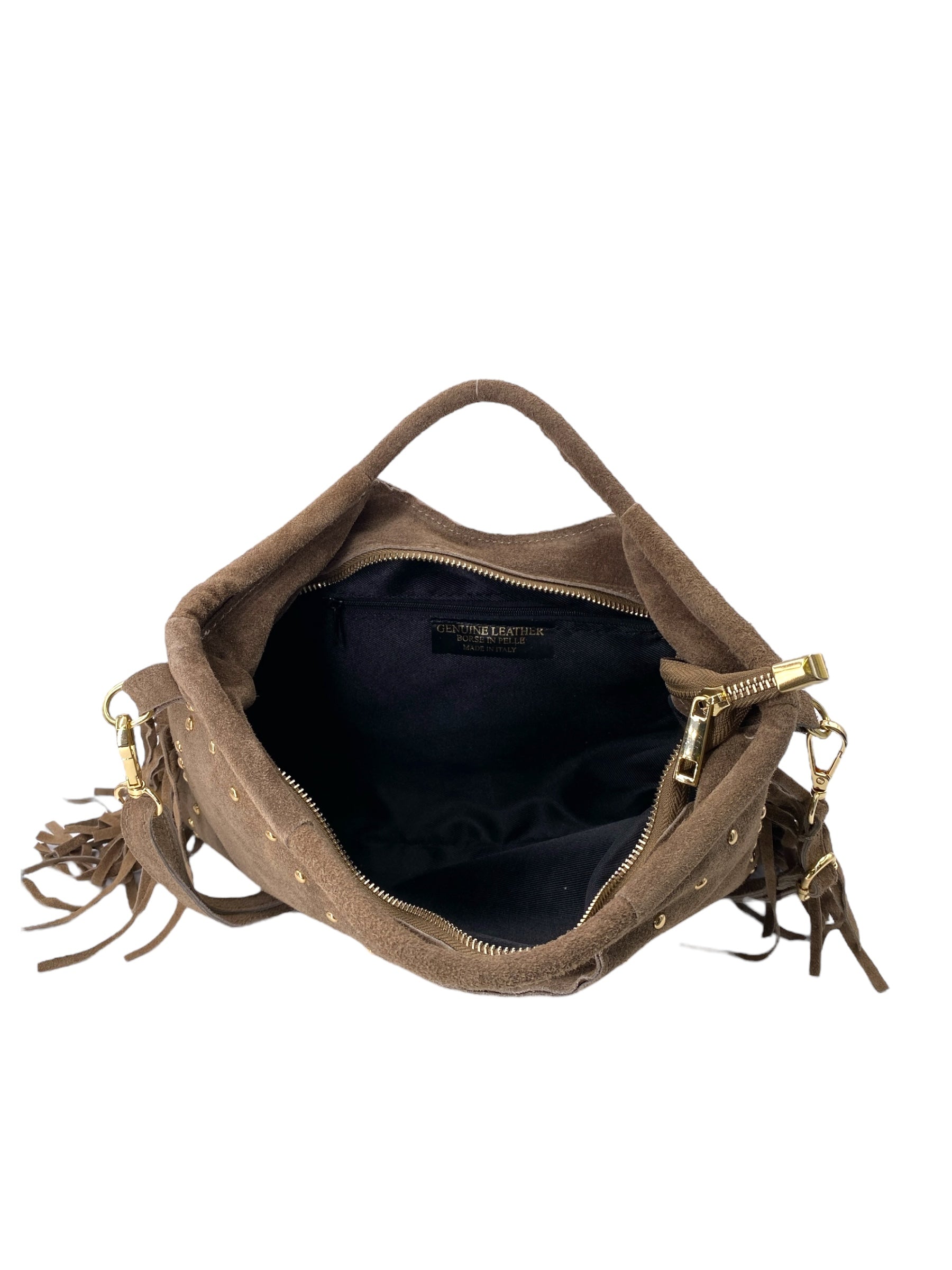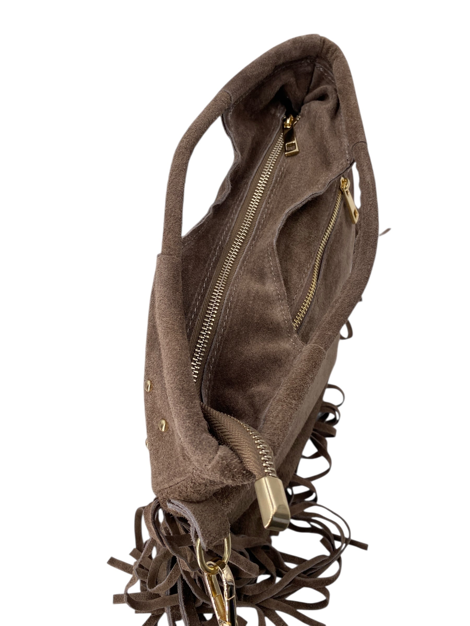 Frange laterali e inferiori in pelle che aggiungono movimento e carattere boho-chic.