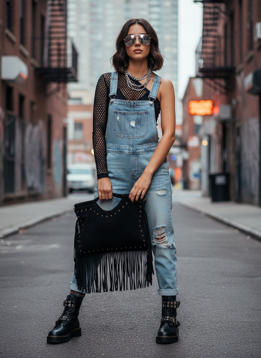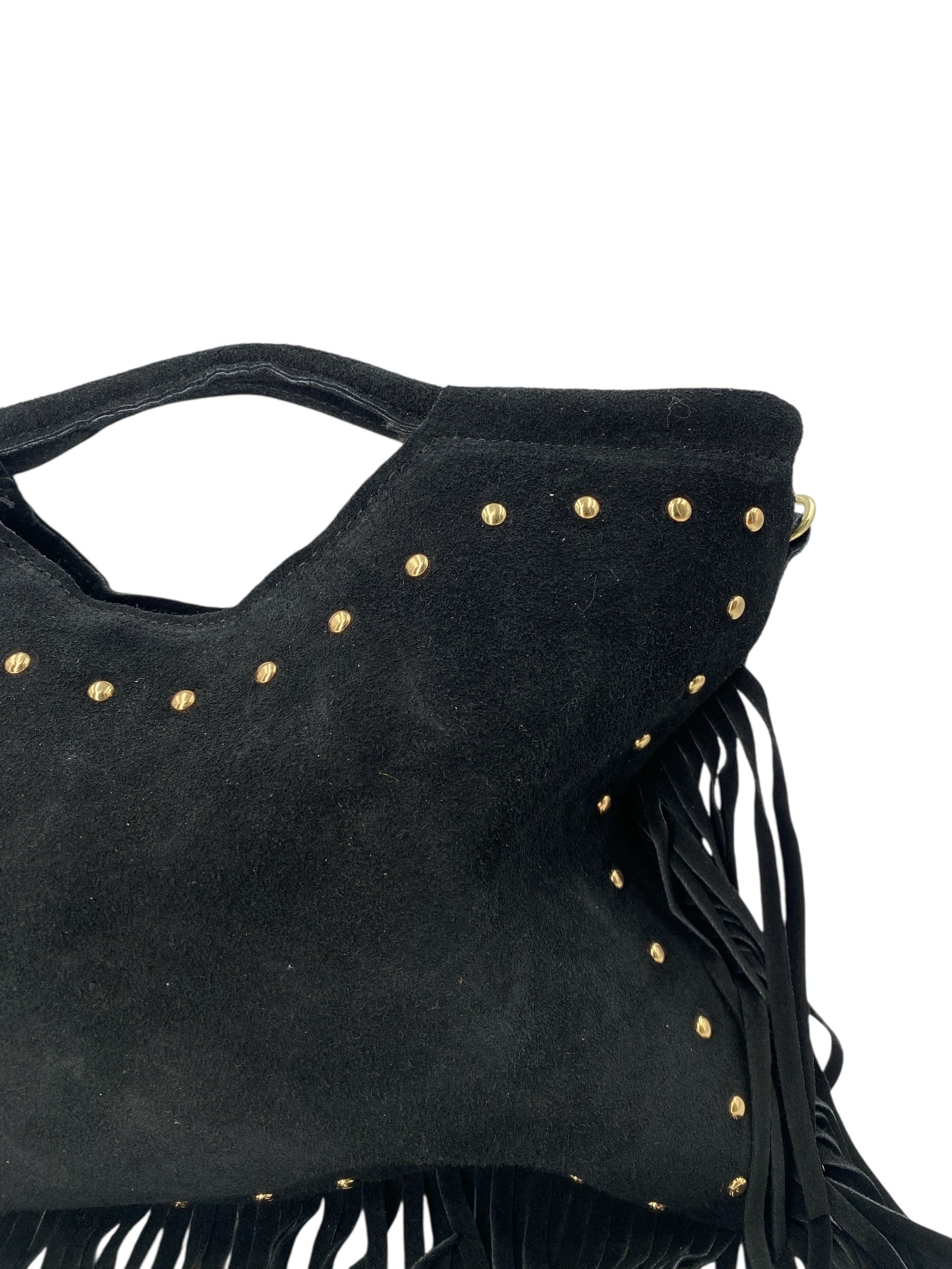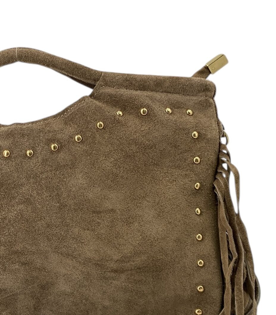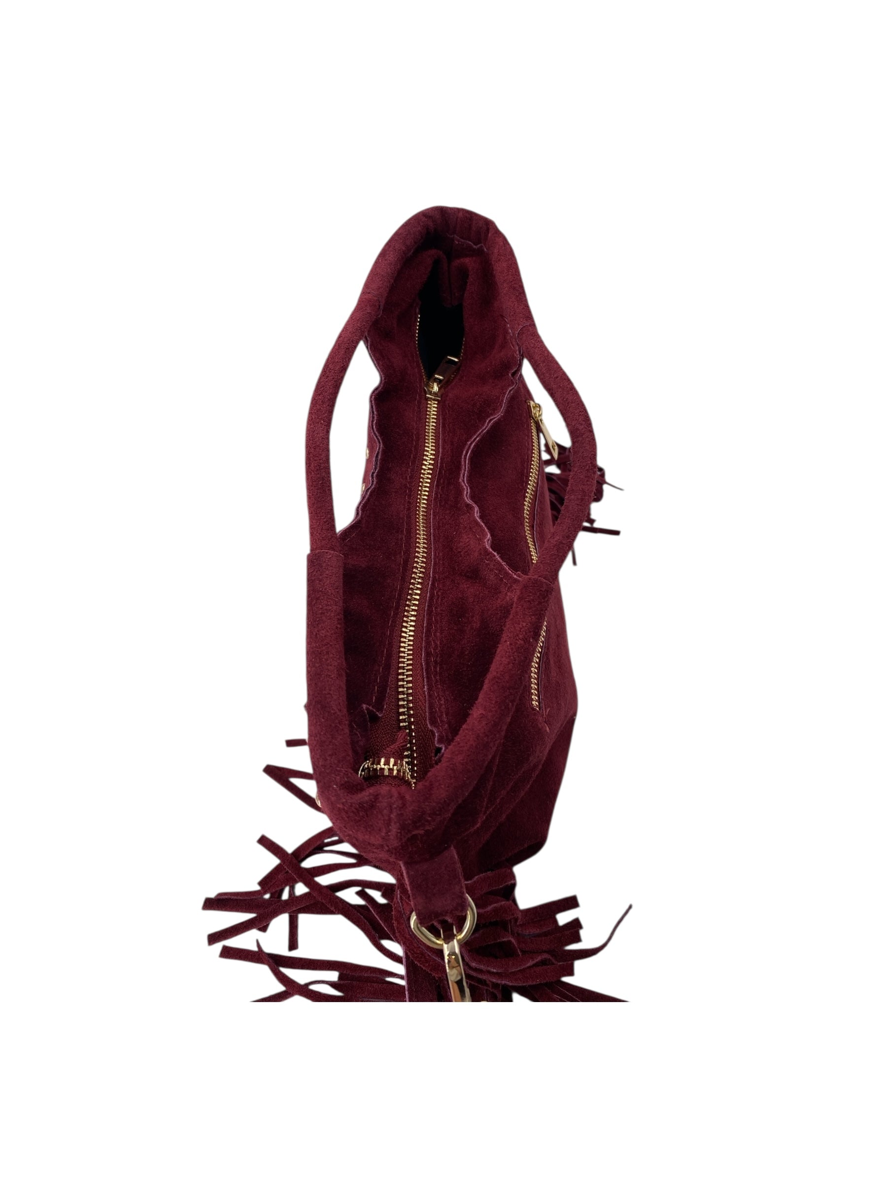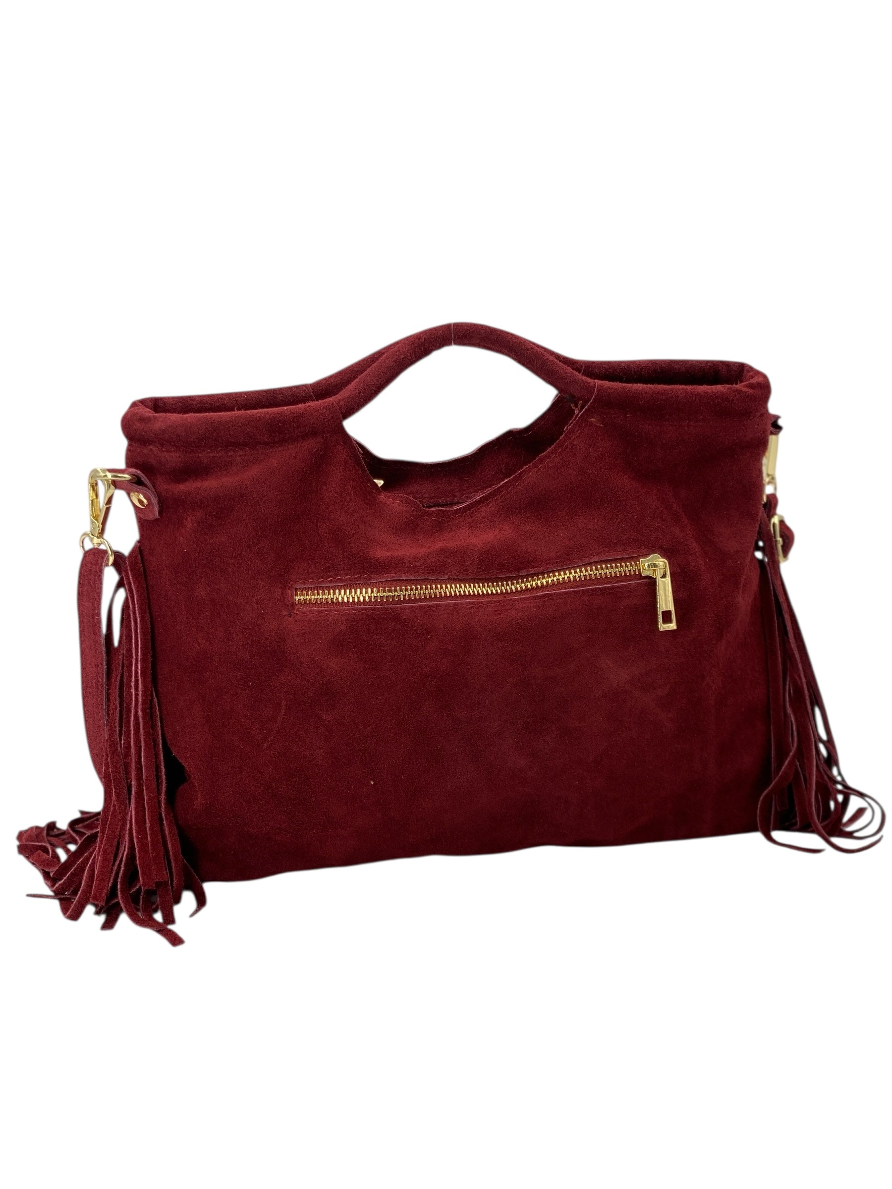 Frange laterali e inferiori in pelle che aggiungono movimento e carattere boho-chic.