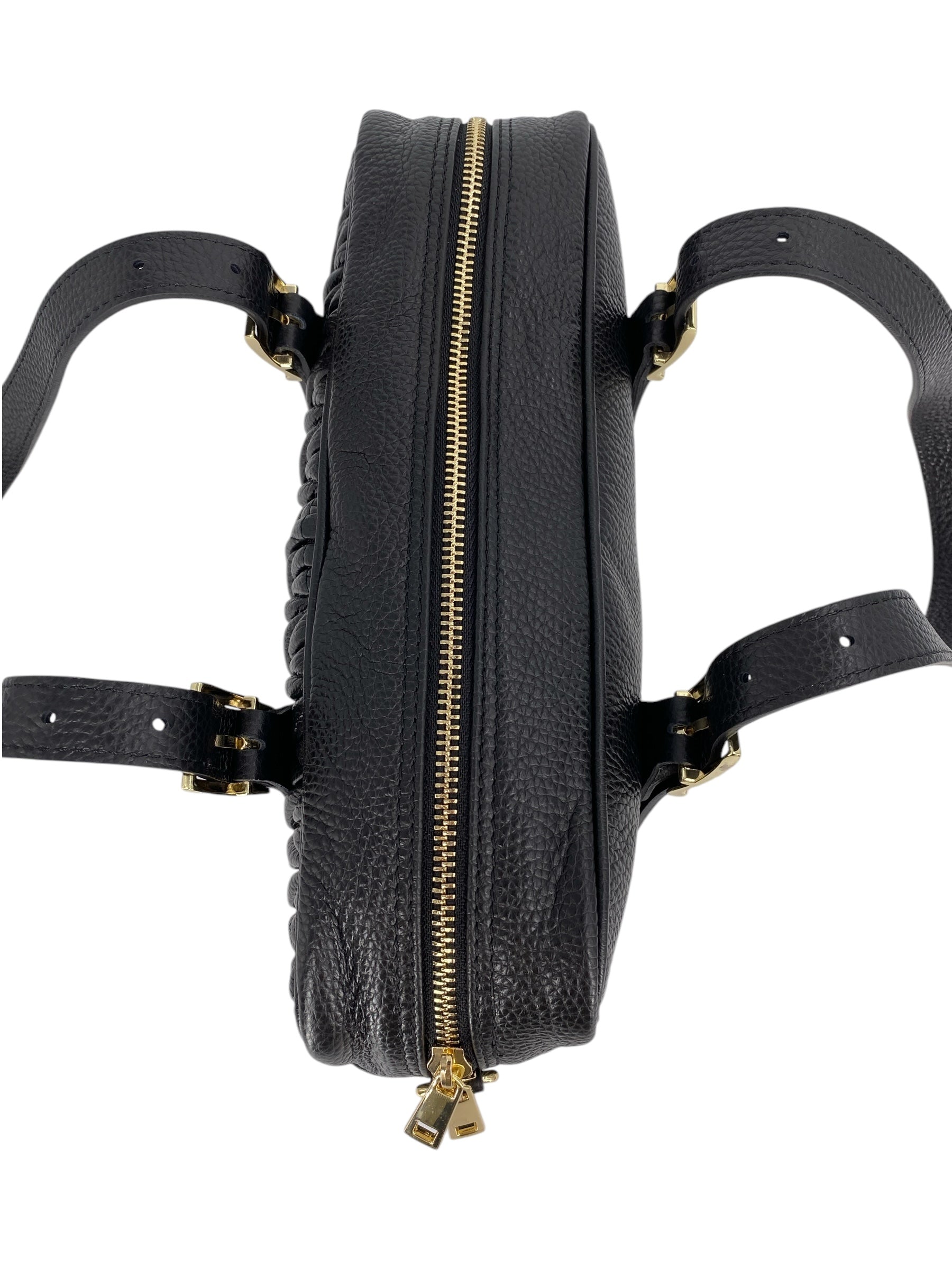 L’interno, foderato in tessuto nero, è organizzato con tasca con zip interna per custodire in sicurezza piccoli oggetti e mantenere sempre l’ordine. La chiusura superiore a zip dorata a doppio cursore aggiunge eleganza e praticità quotidiana.