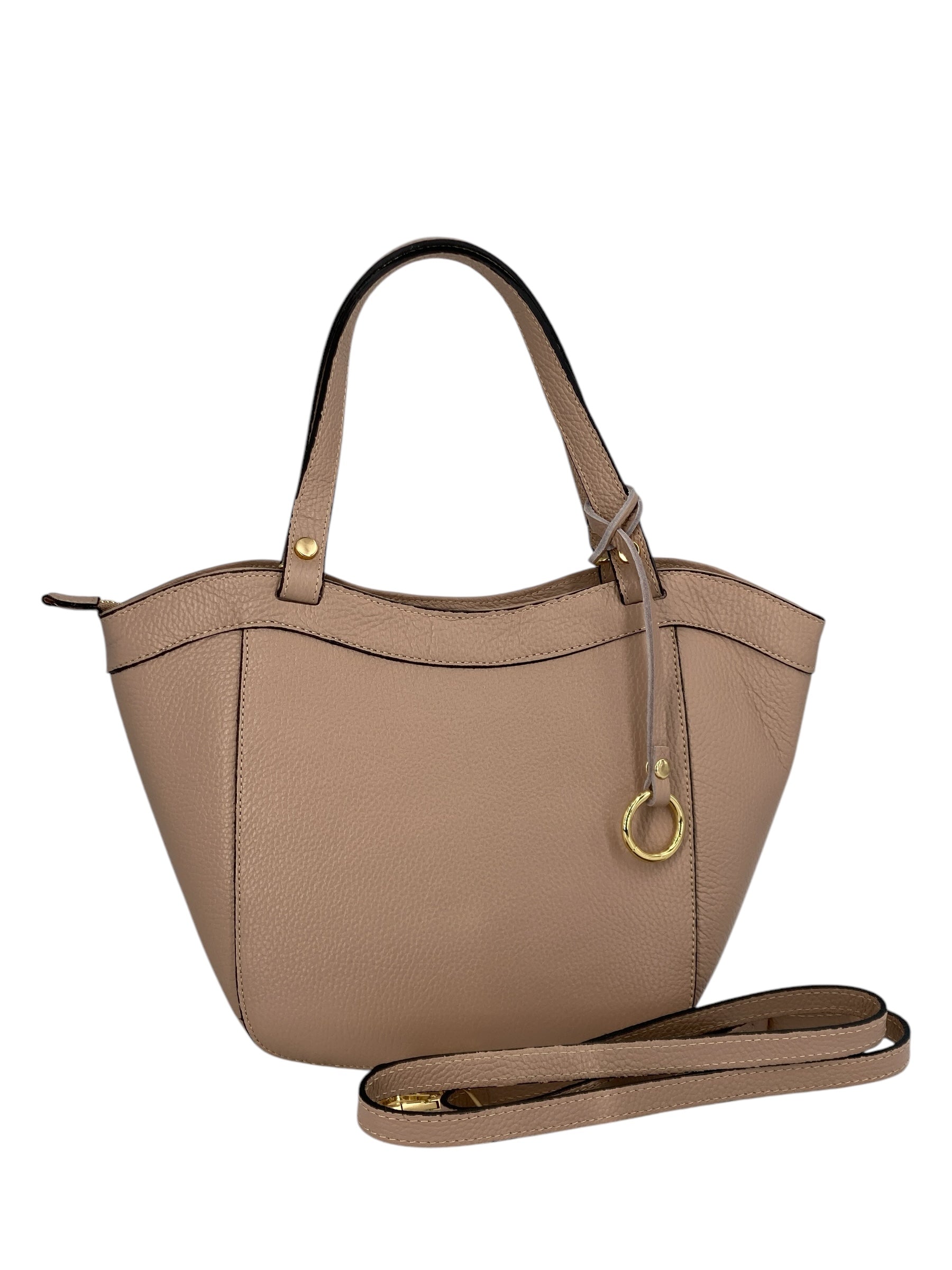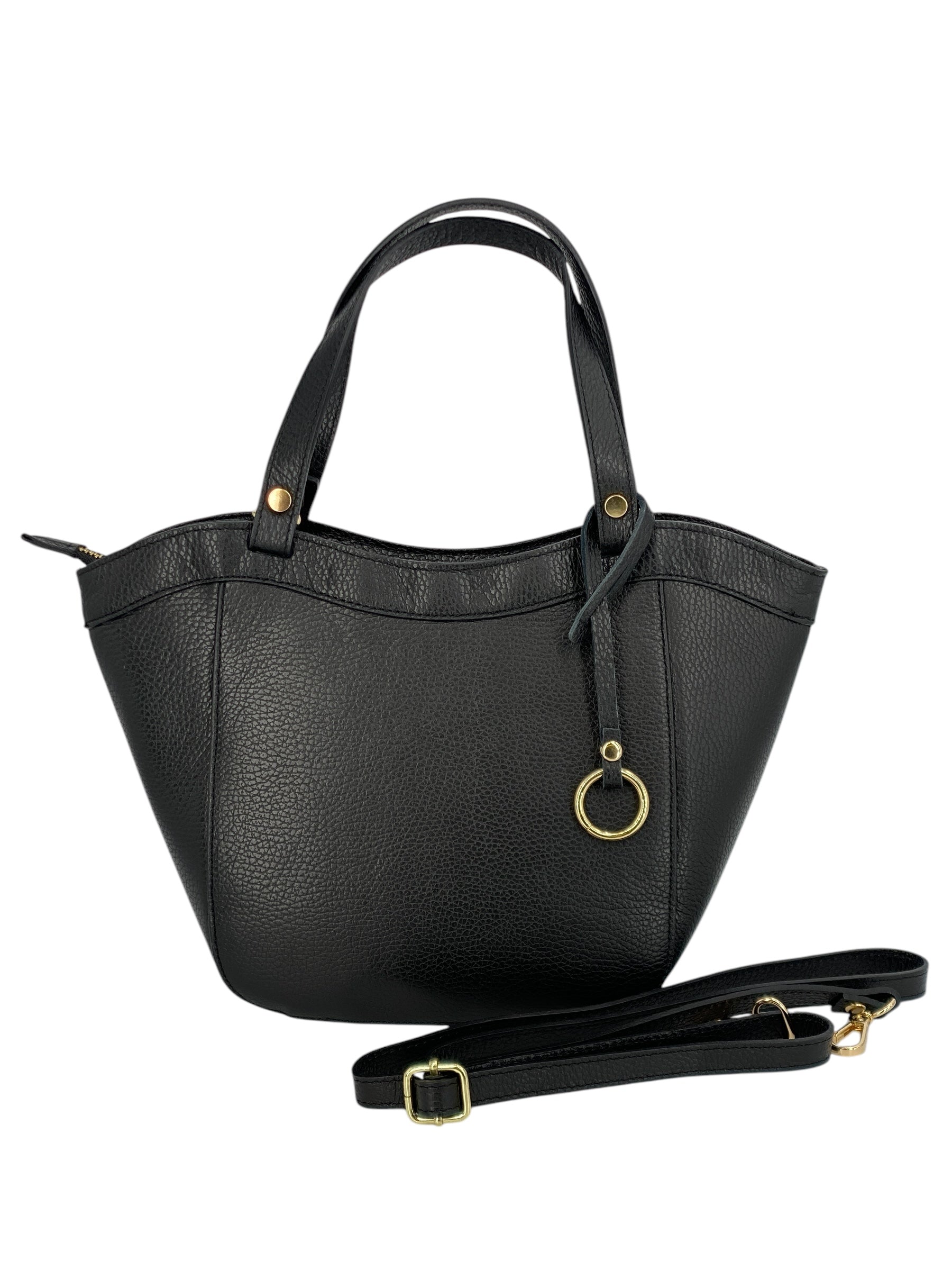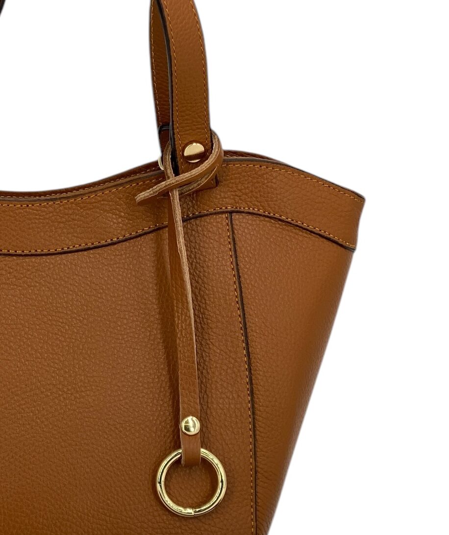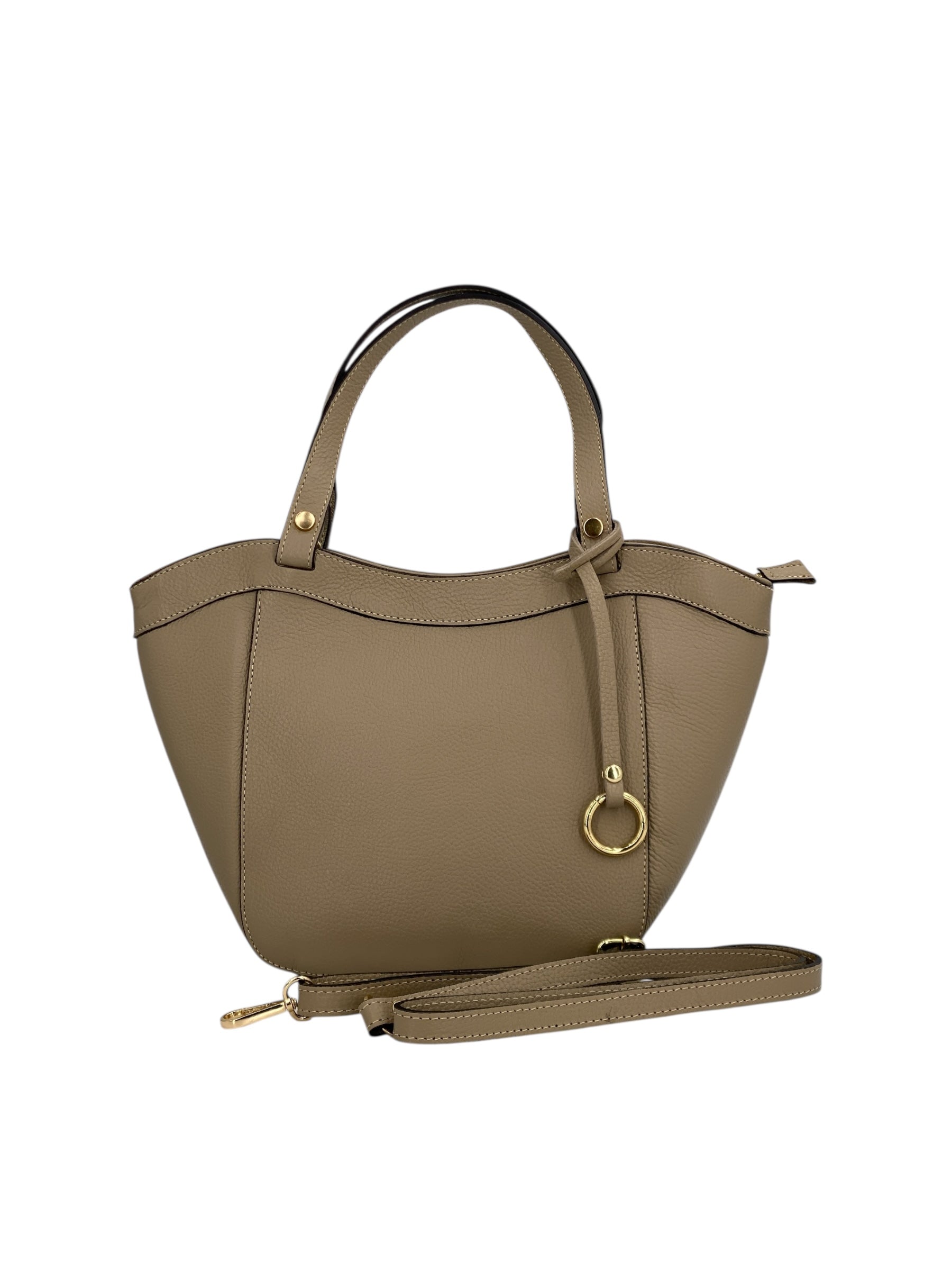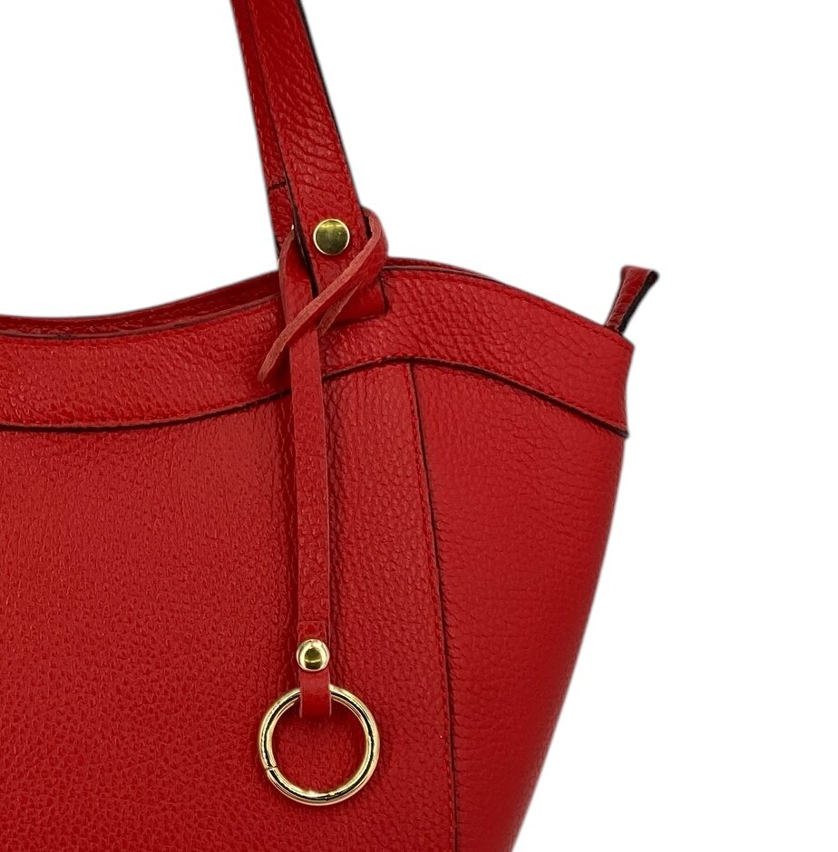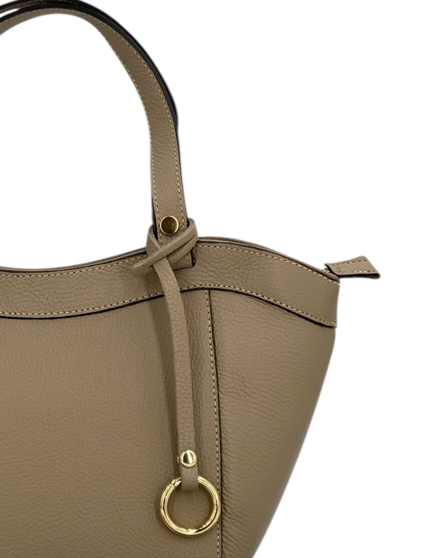 Dettagli di classe: l’anello in metallo dorato rende ogni borsa unica e riconoscibile.