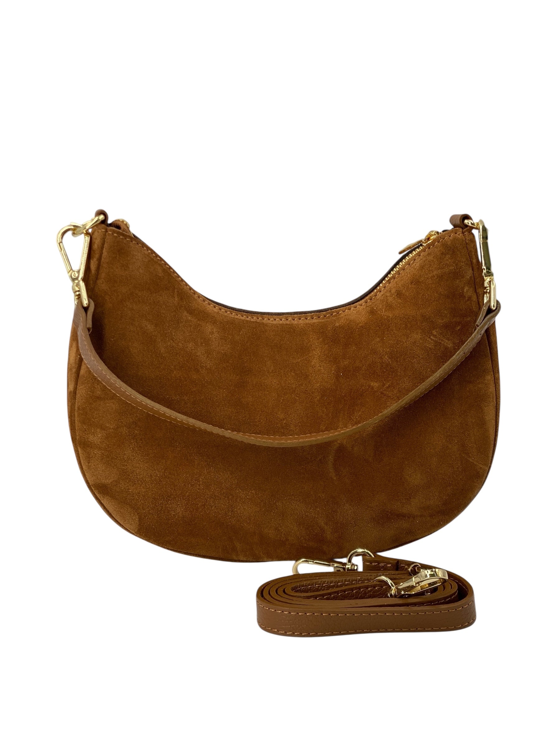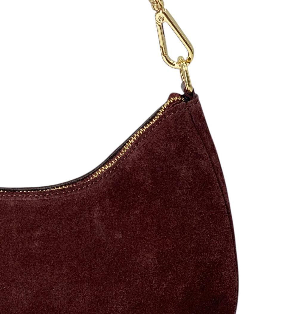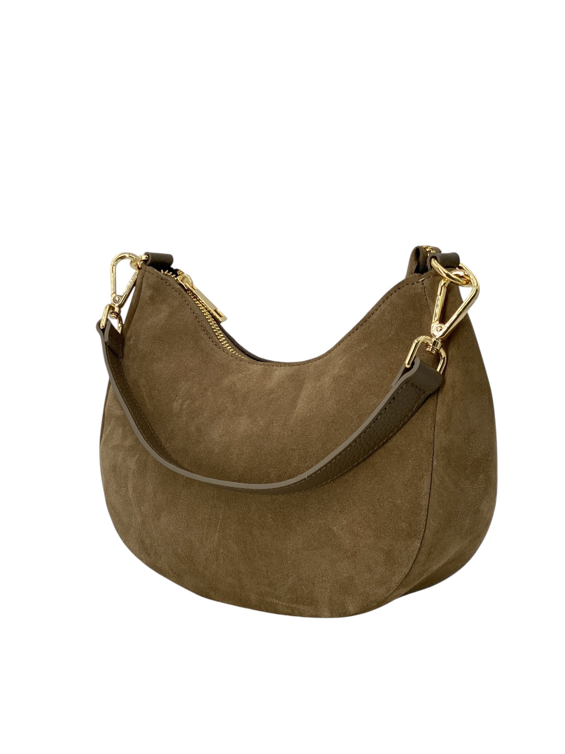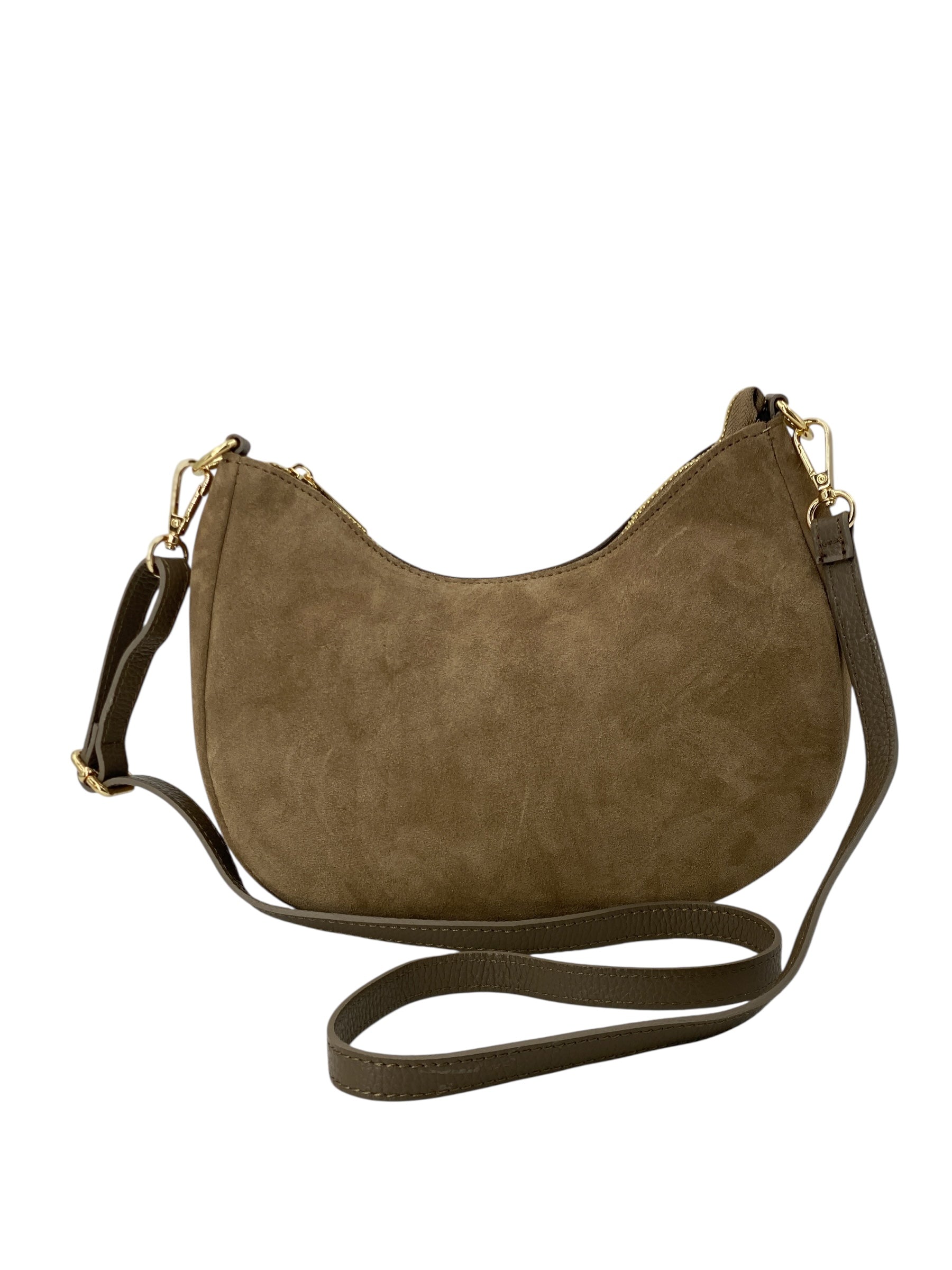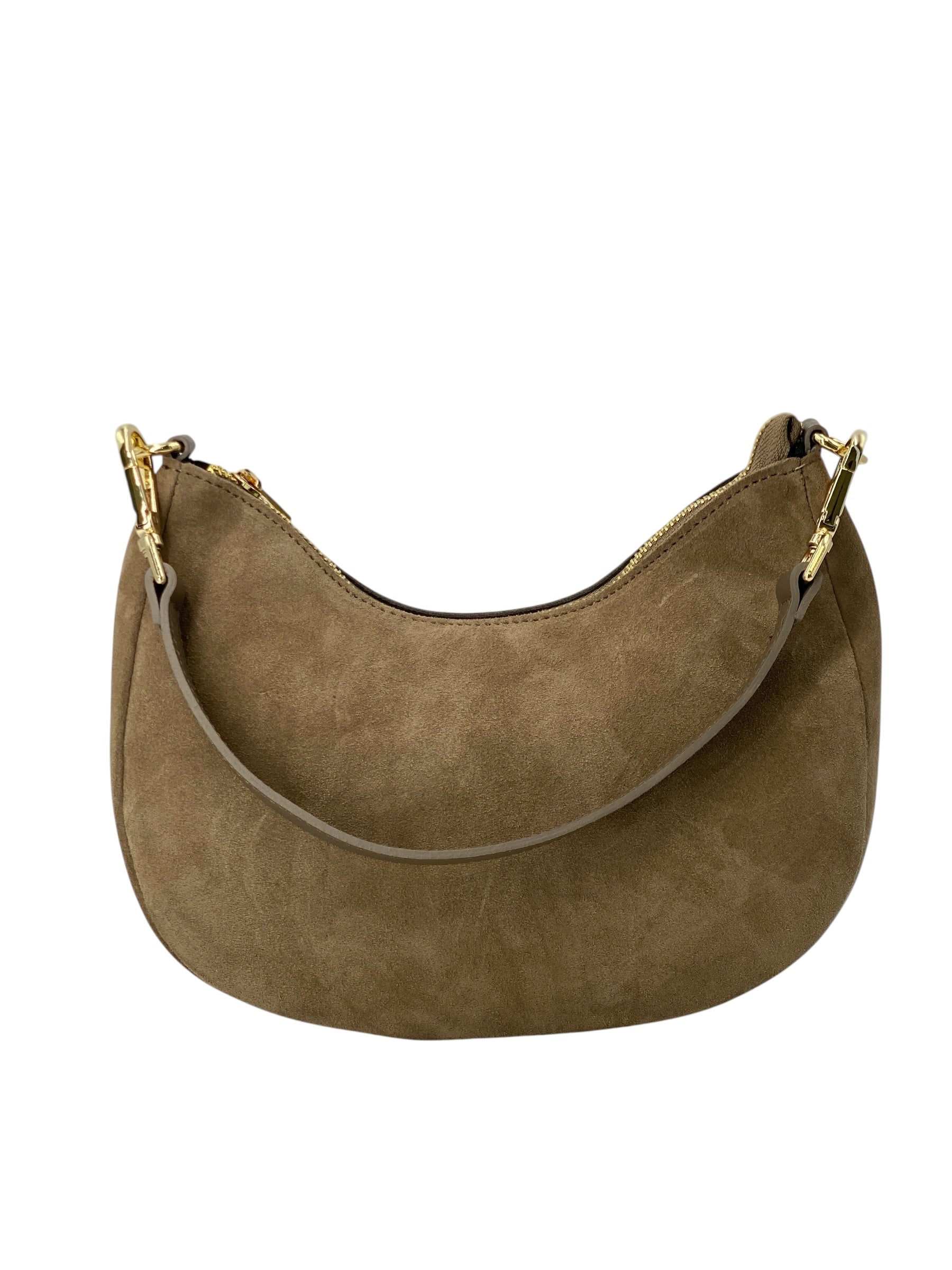 Lydie è una borsa a spalla dalla silhouette a mezzaluna, realizzata in morbido camoscio italiano e rifinita con dettagli in pelle liscia tono su tono.