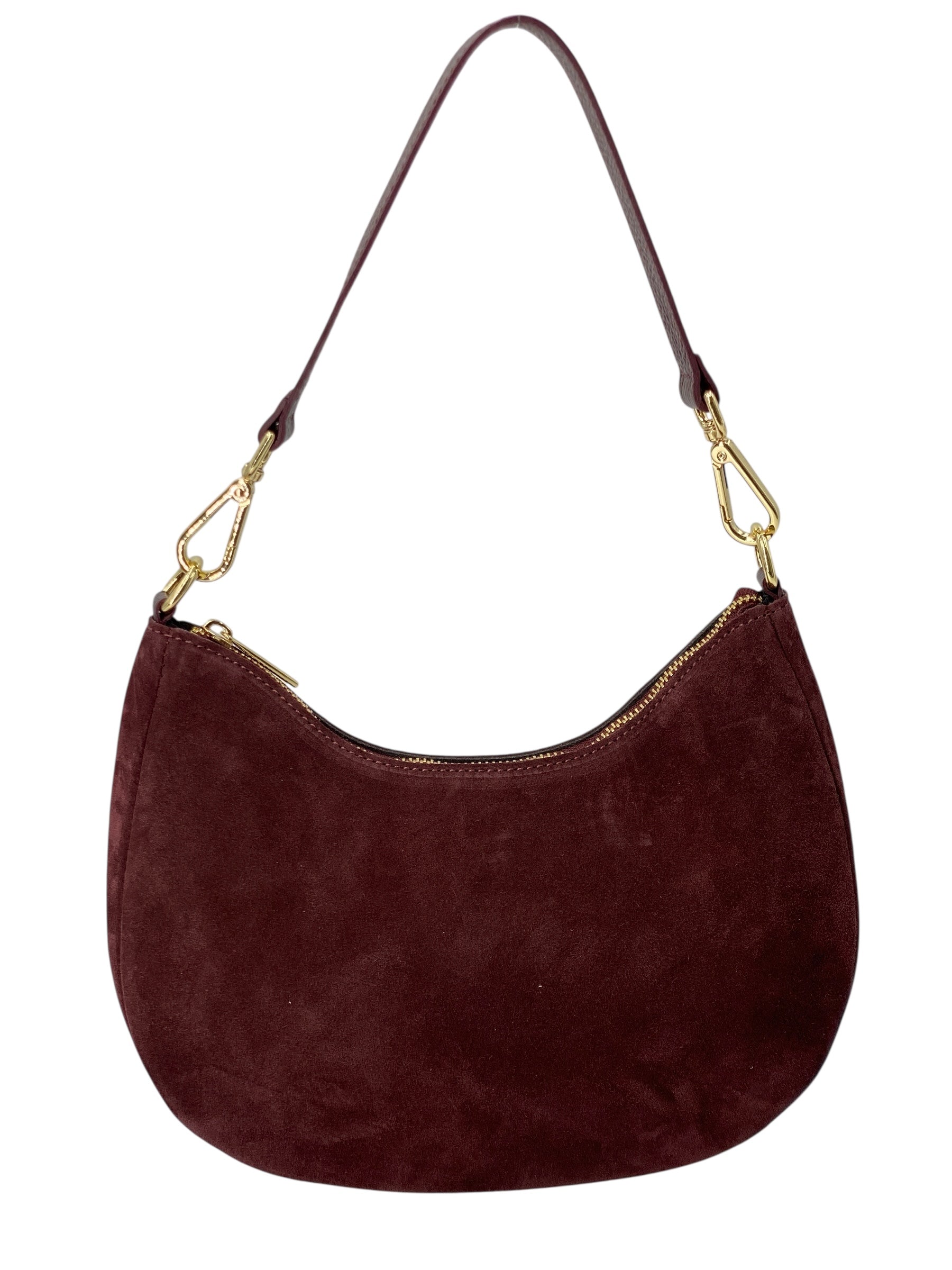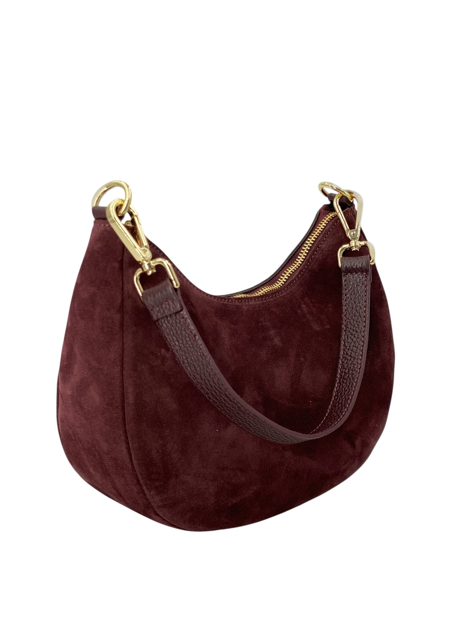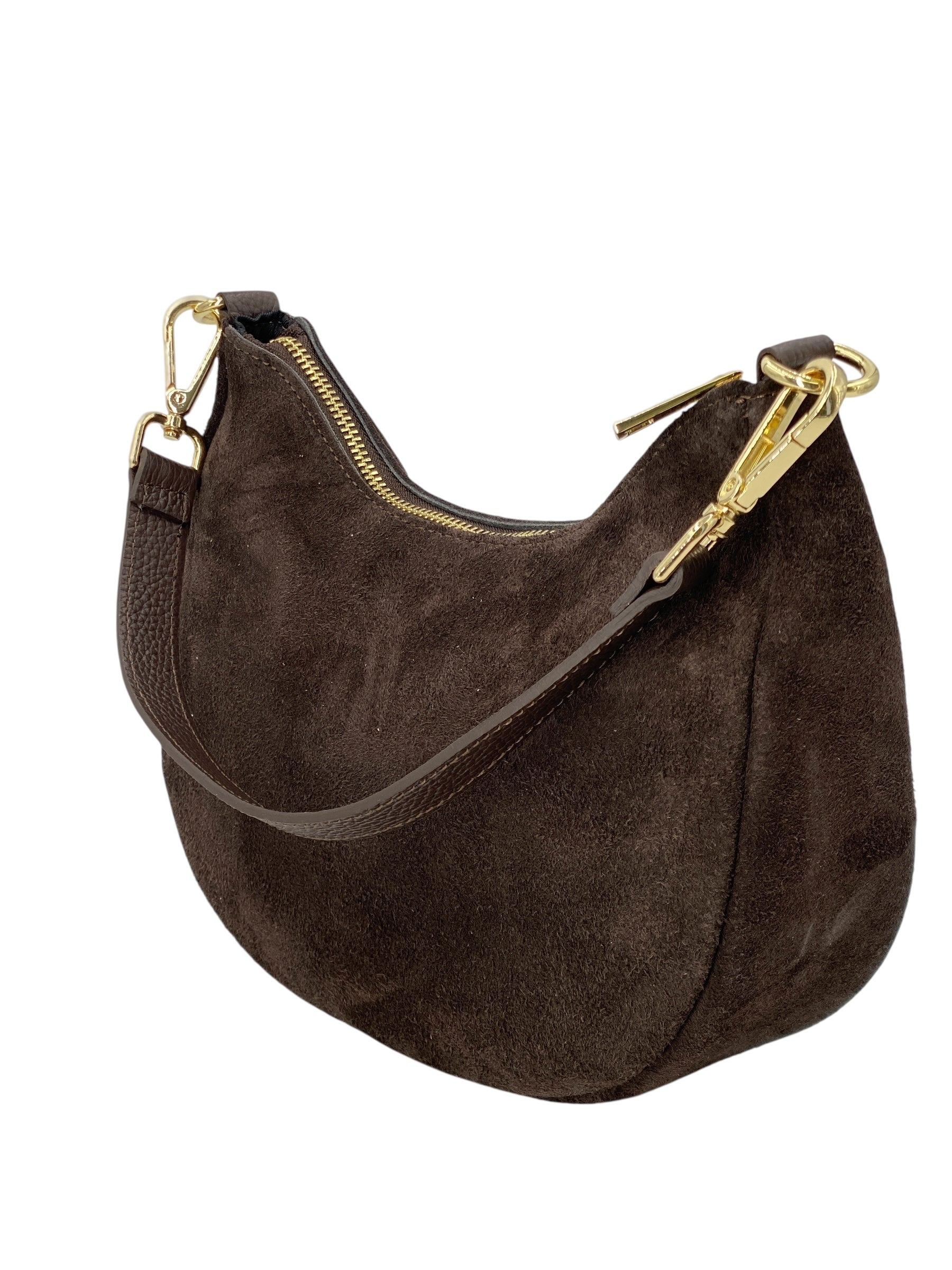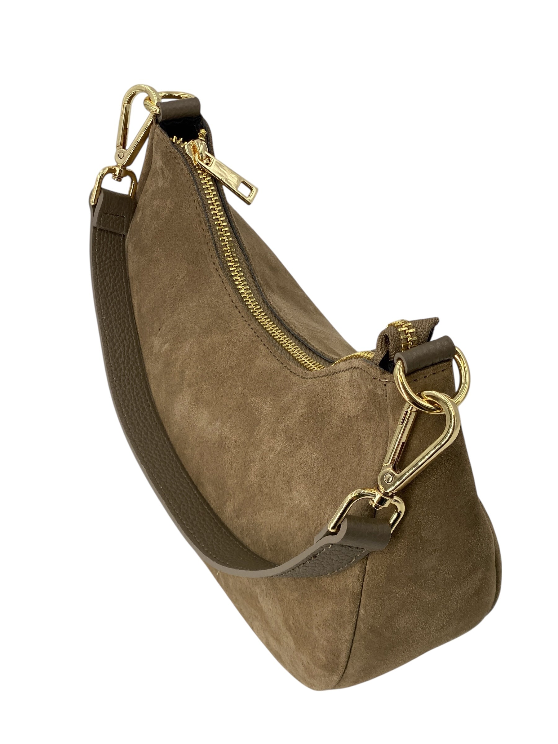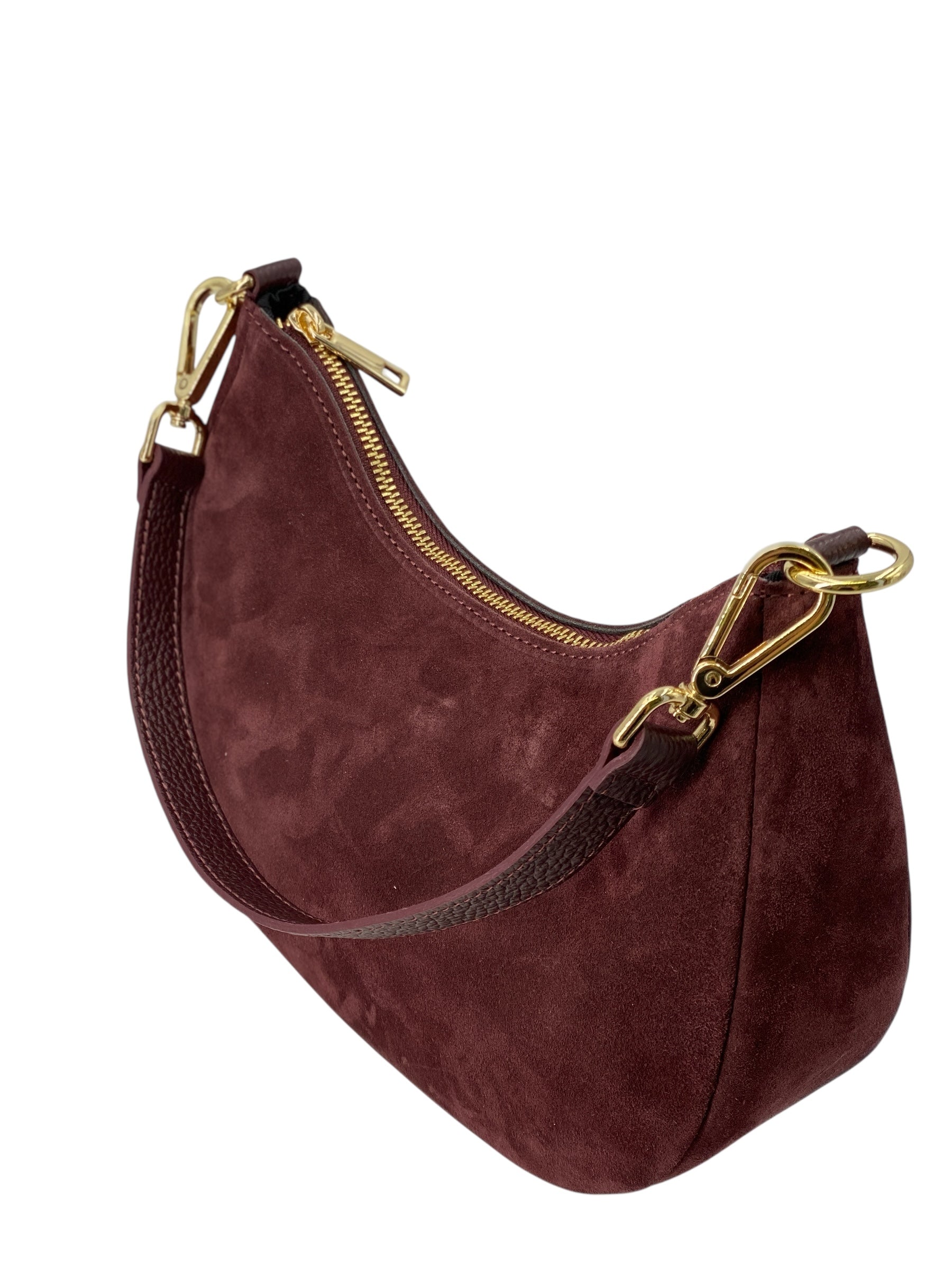 Lydie è una borsa a spalla dalla silhouette a mezzaluna, realizzata in morbido camoscio italiano e rifinita con dettagli in pelle liscia tono su tono.