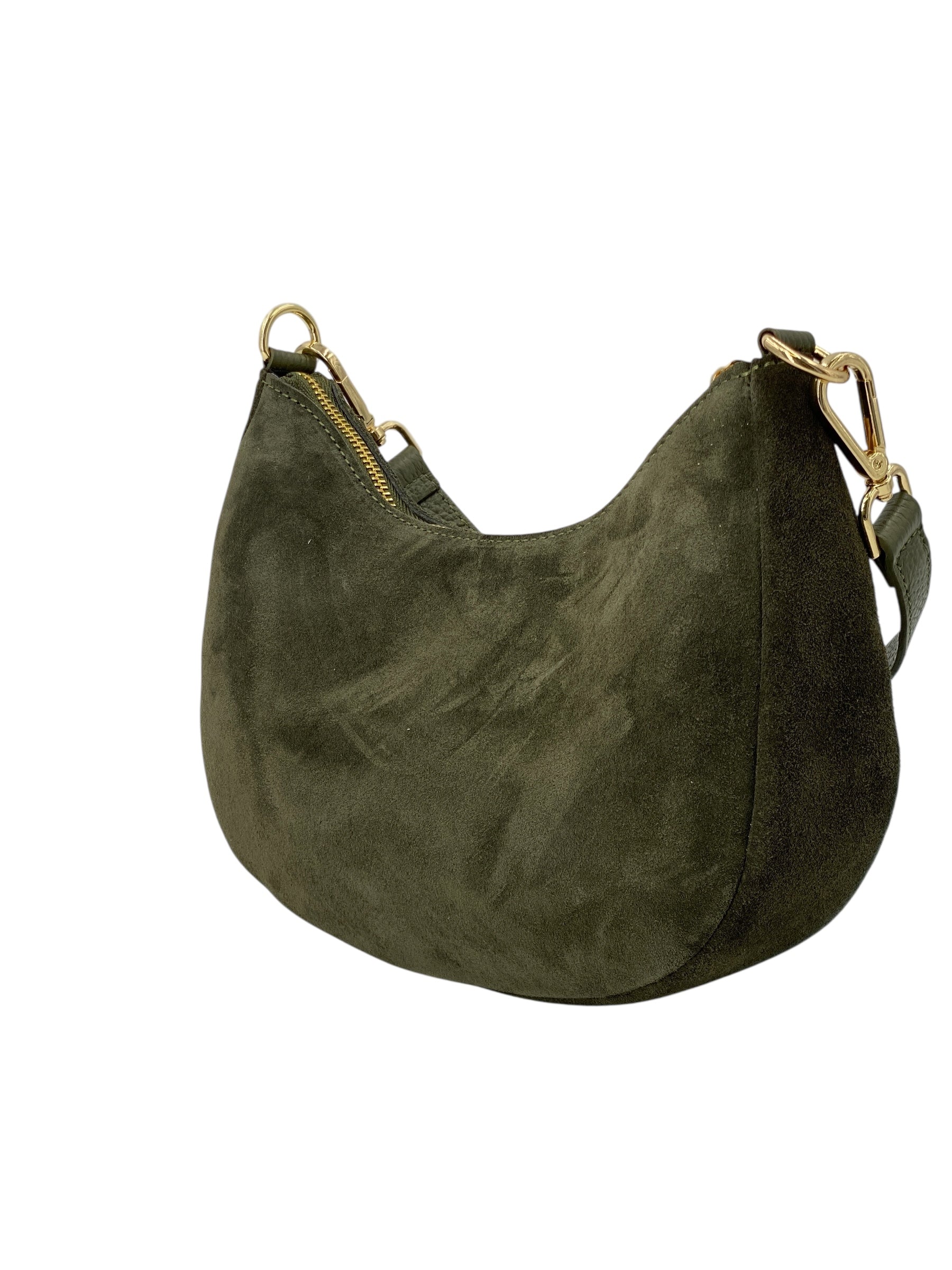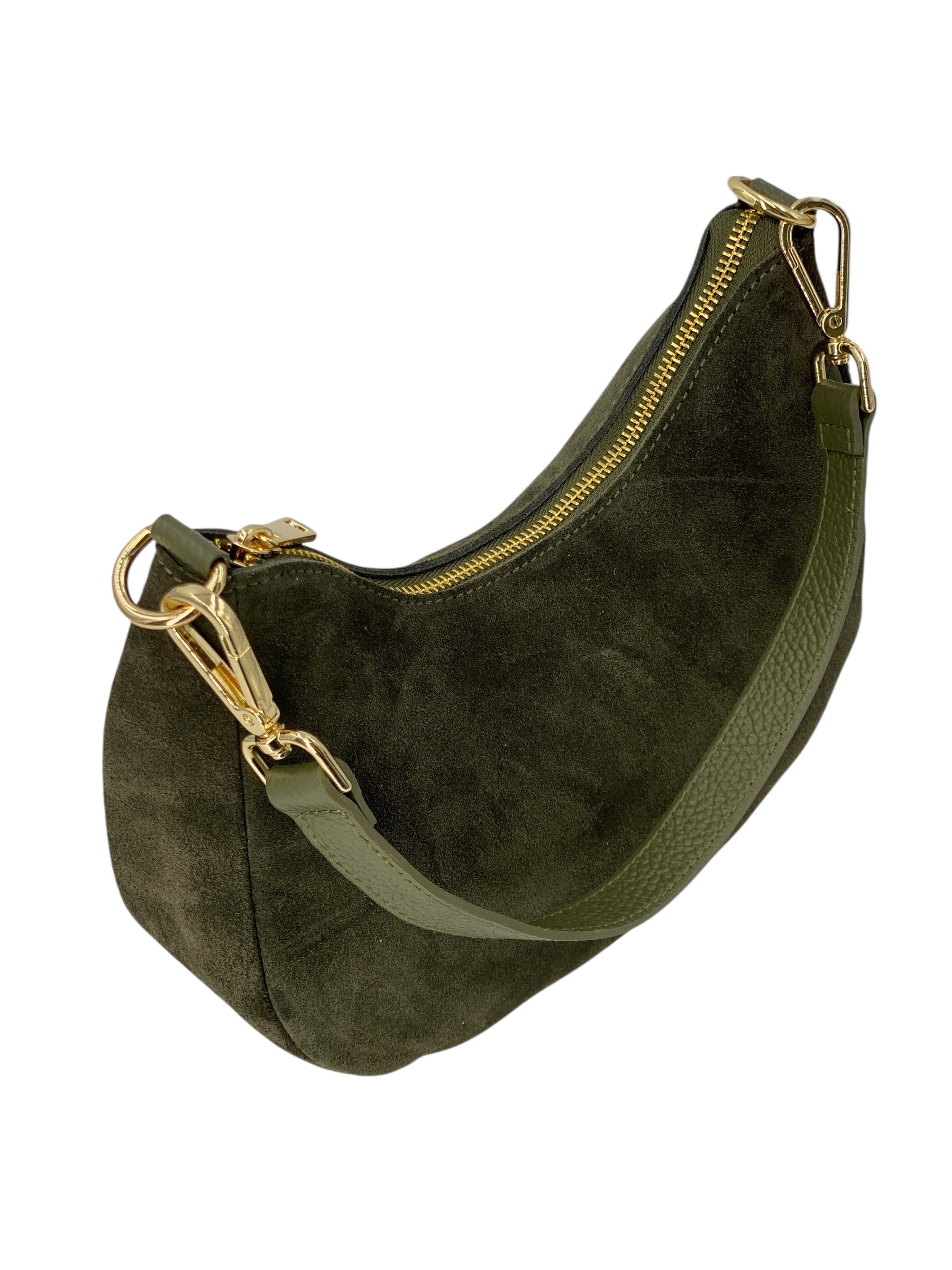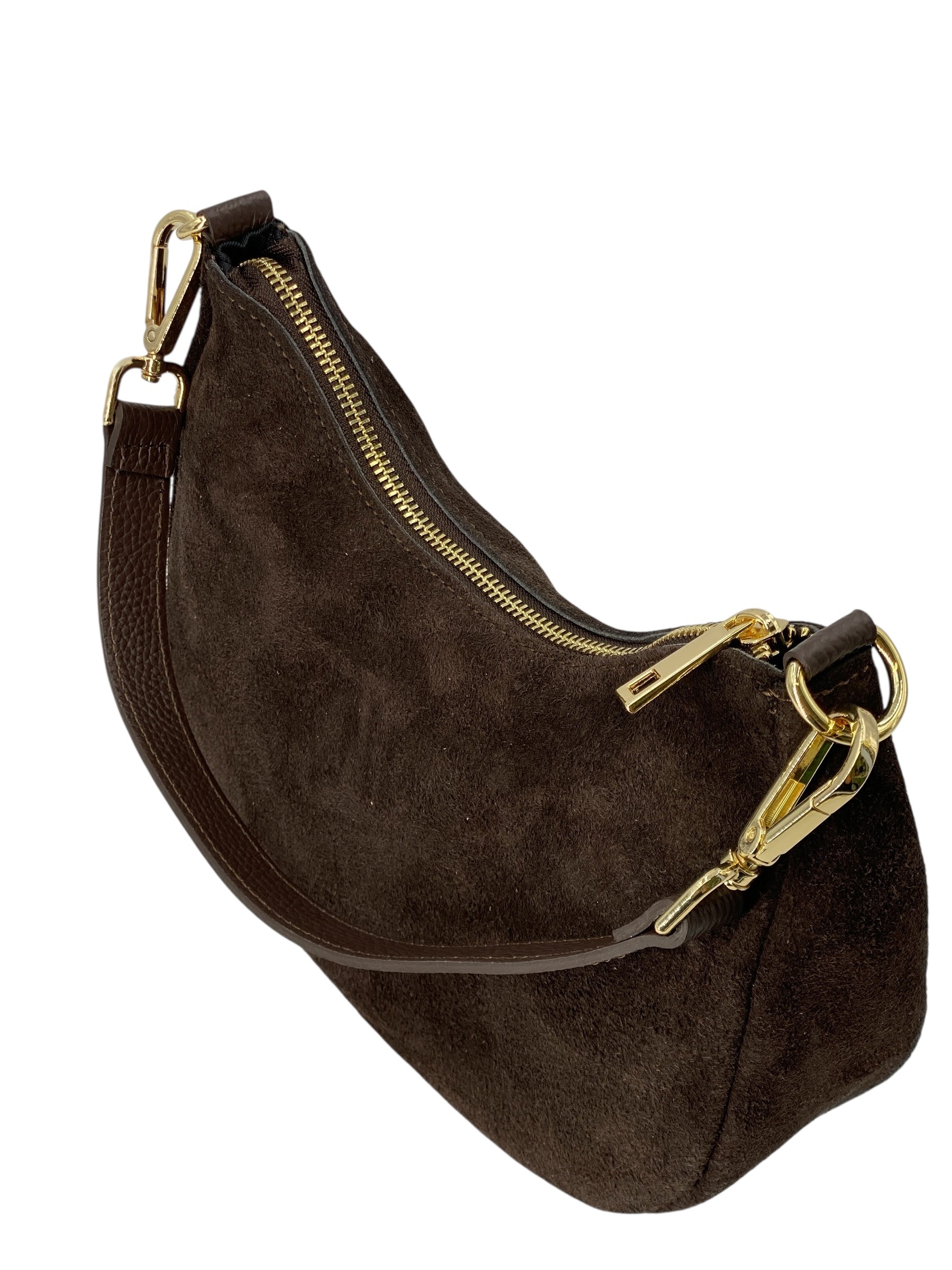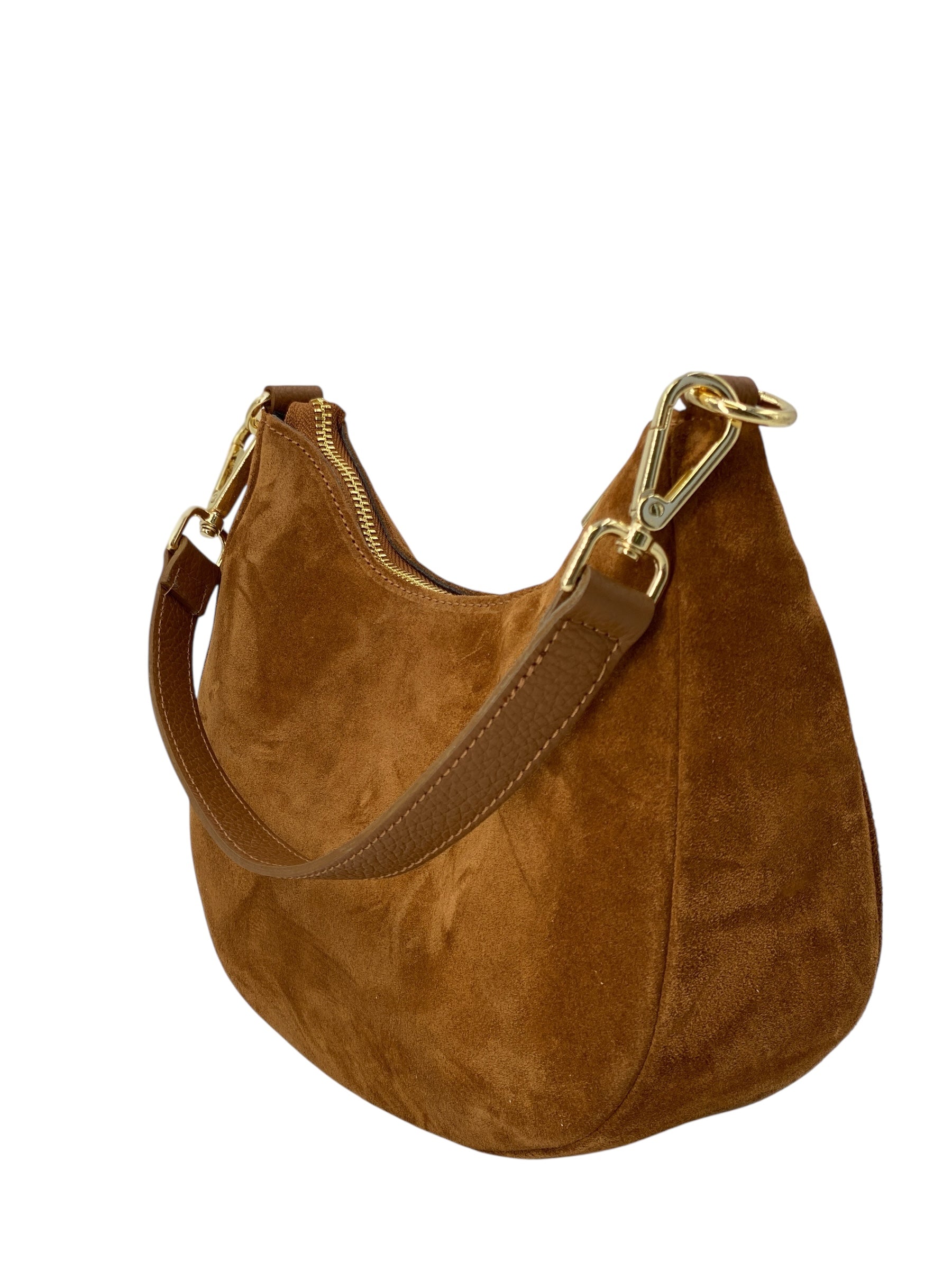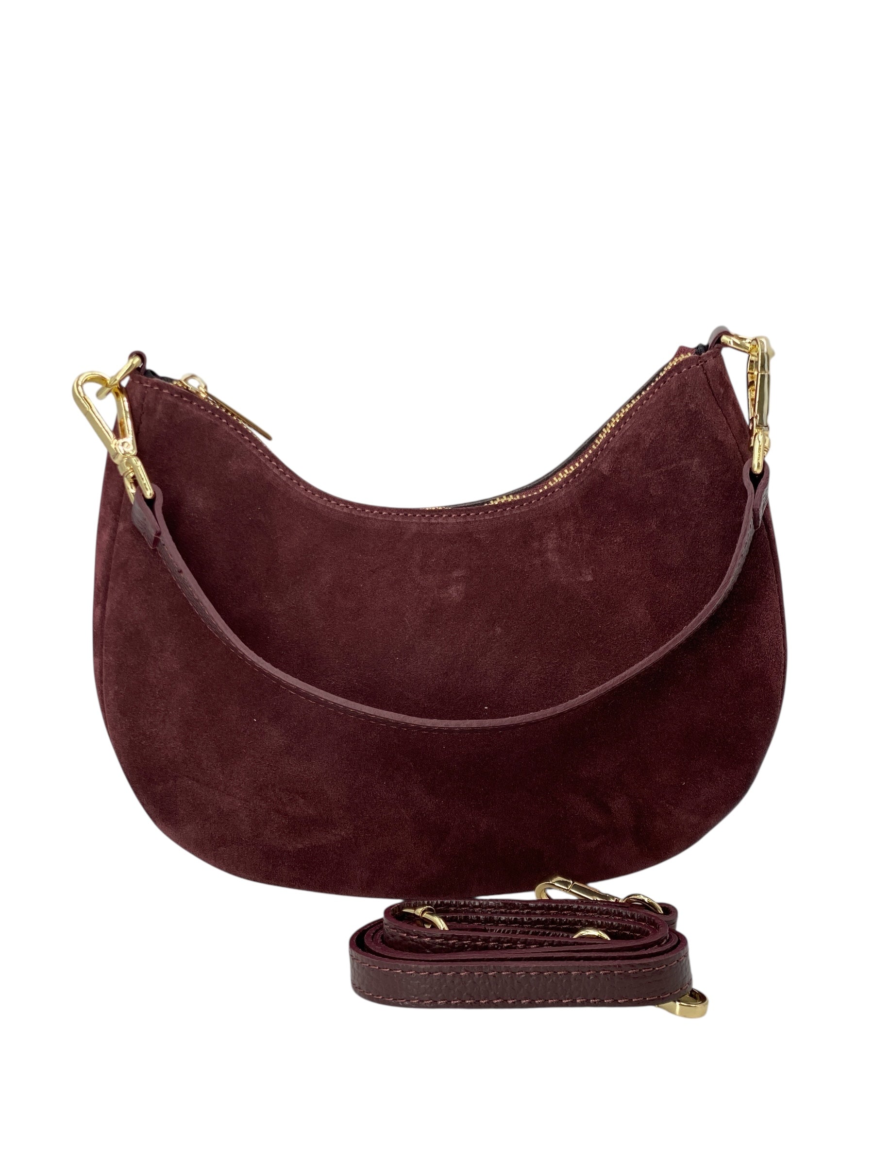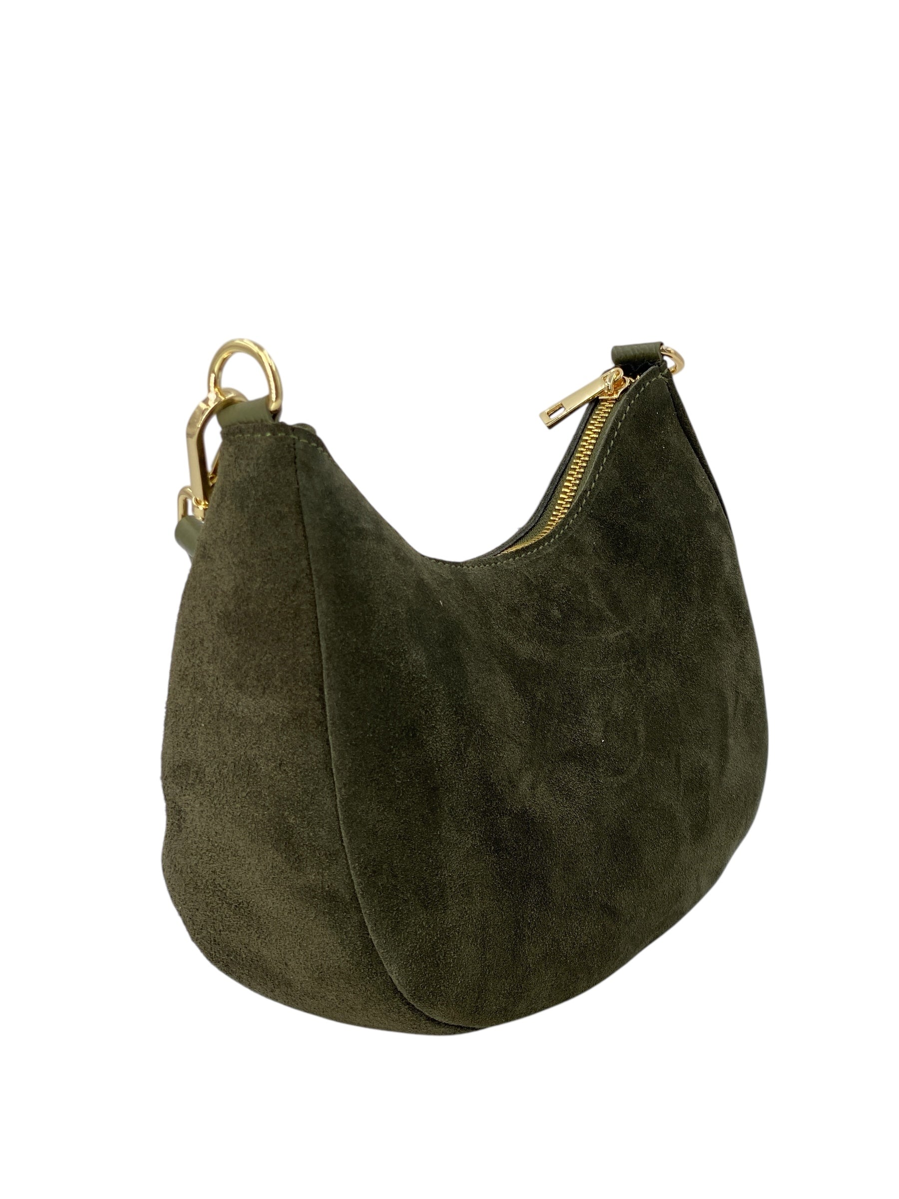 Lydie è una borsa a spalla dalla silhouette a mezzaluna, realizzata in morbido camoscio italiano e rifinita con dettagli in pelle liscia tono su tono.