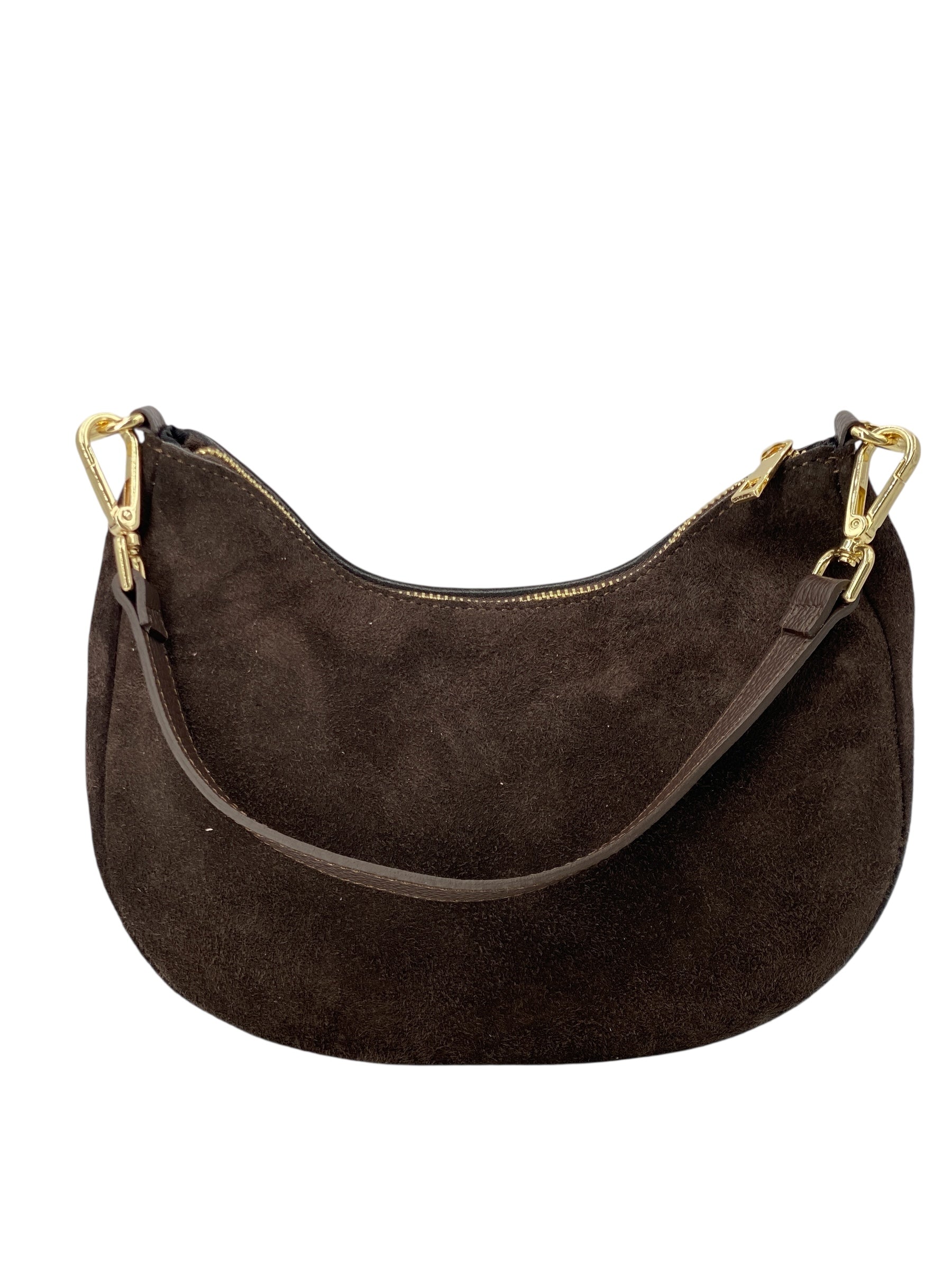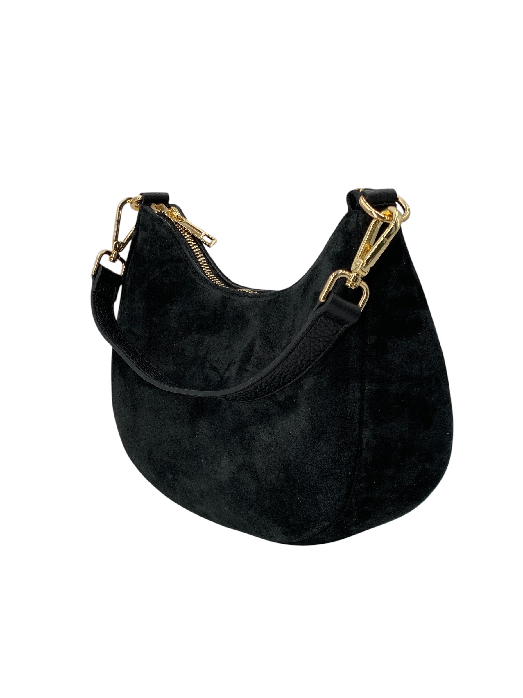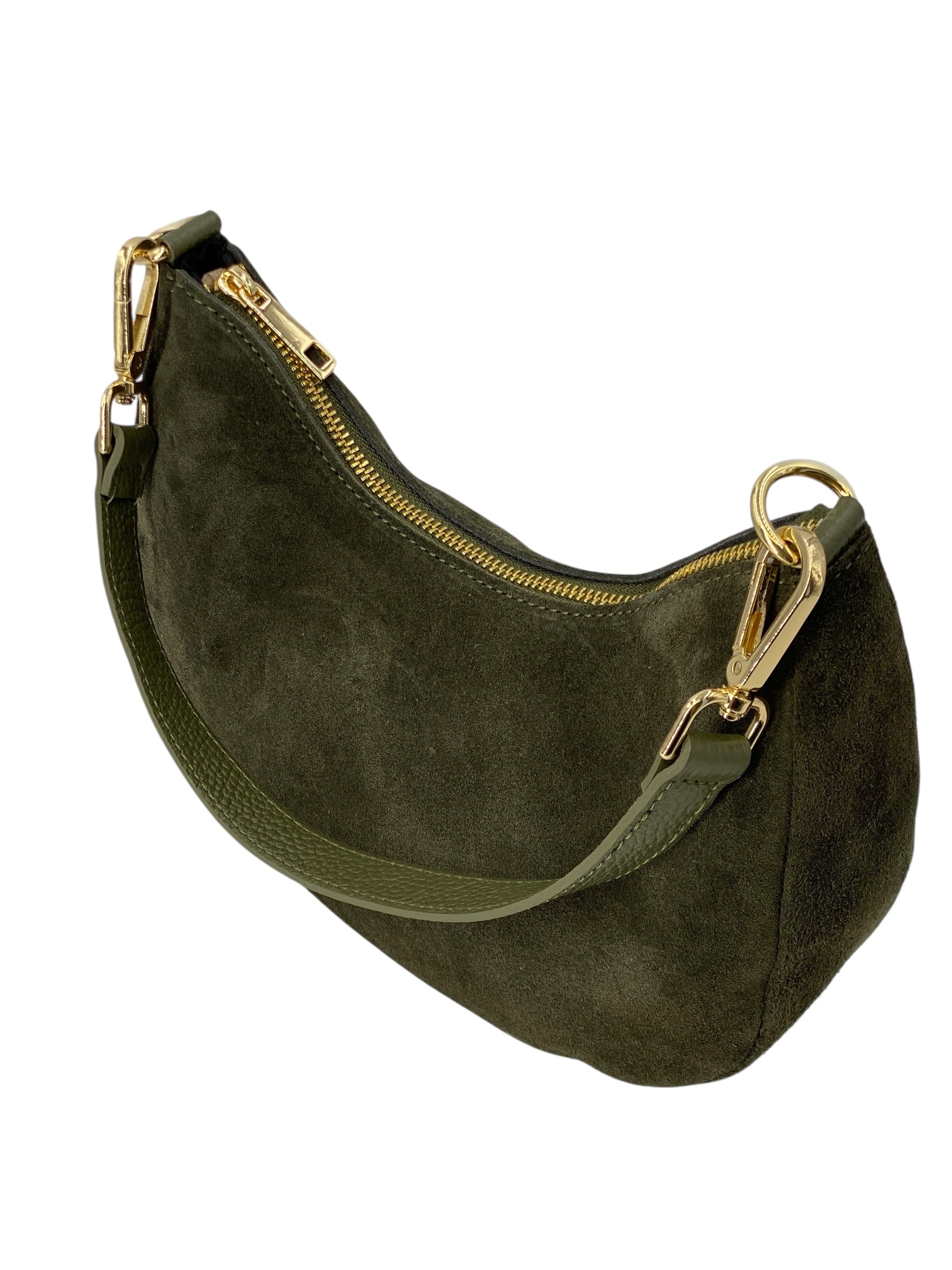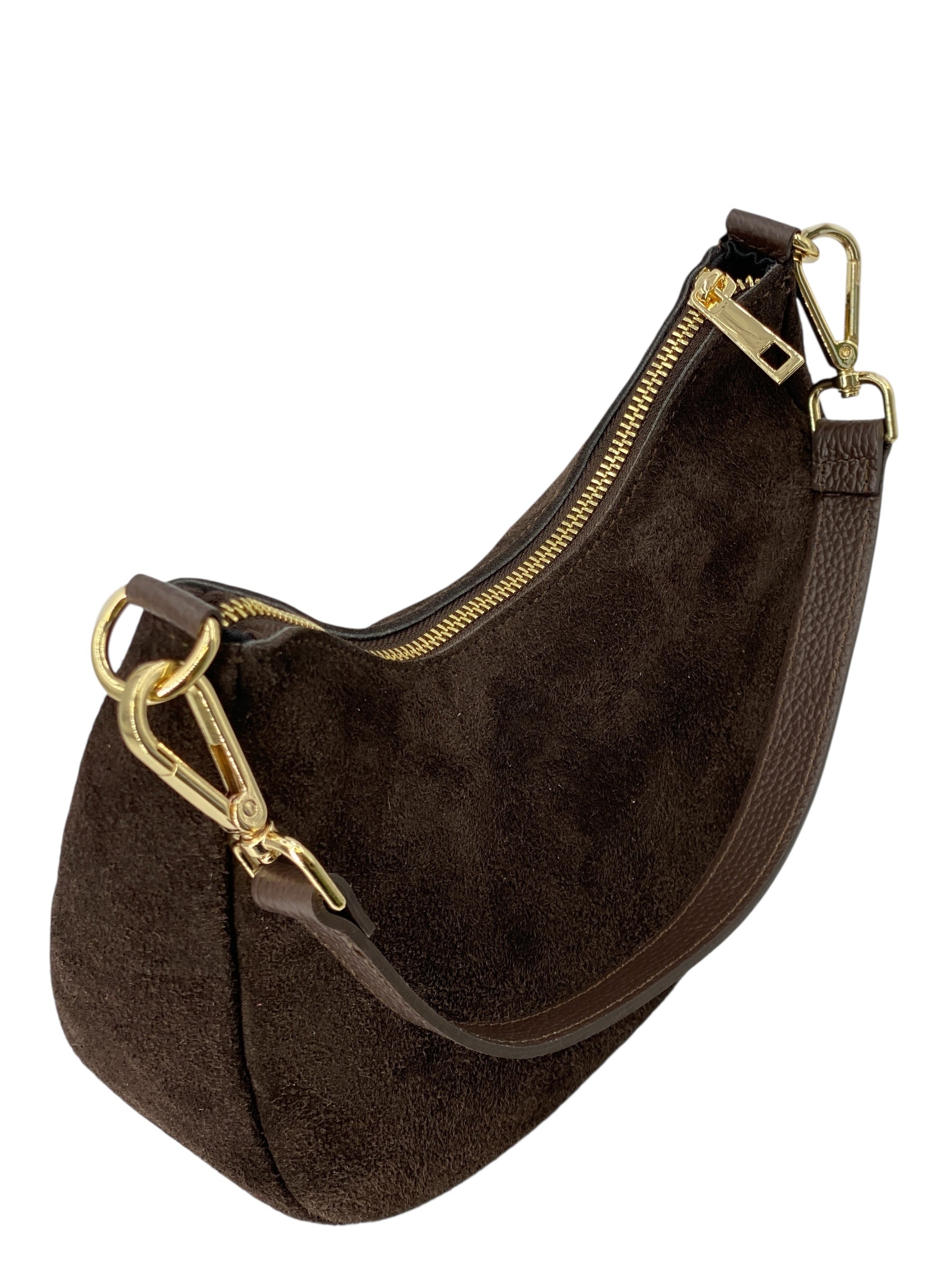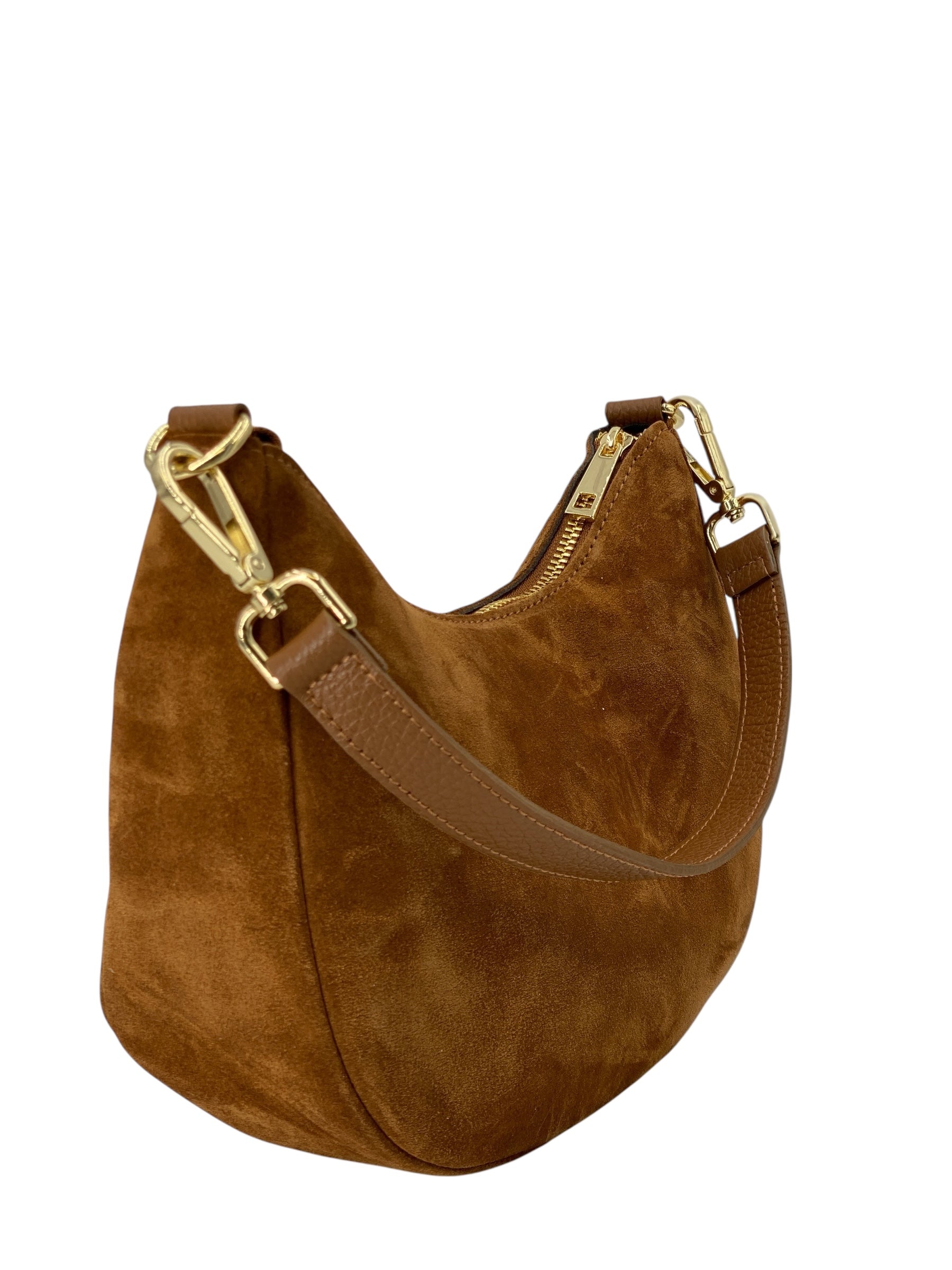Lydie è una borsa a spalla dalla silhouette a mezzaluna, realizzata in morbido camoscio italiano e rifinita con dettagli in pelle liscia tono su tono.