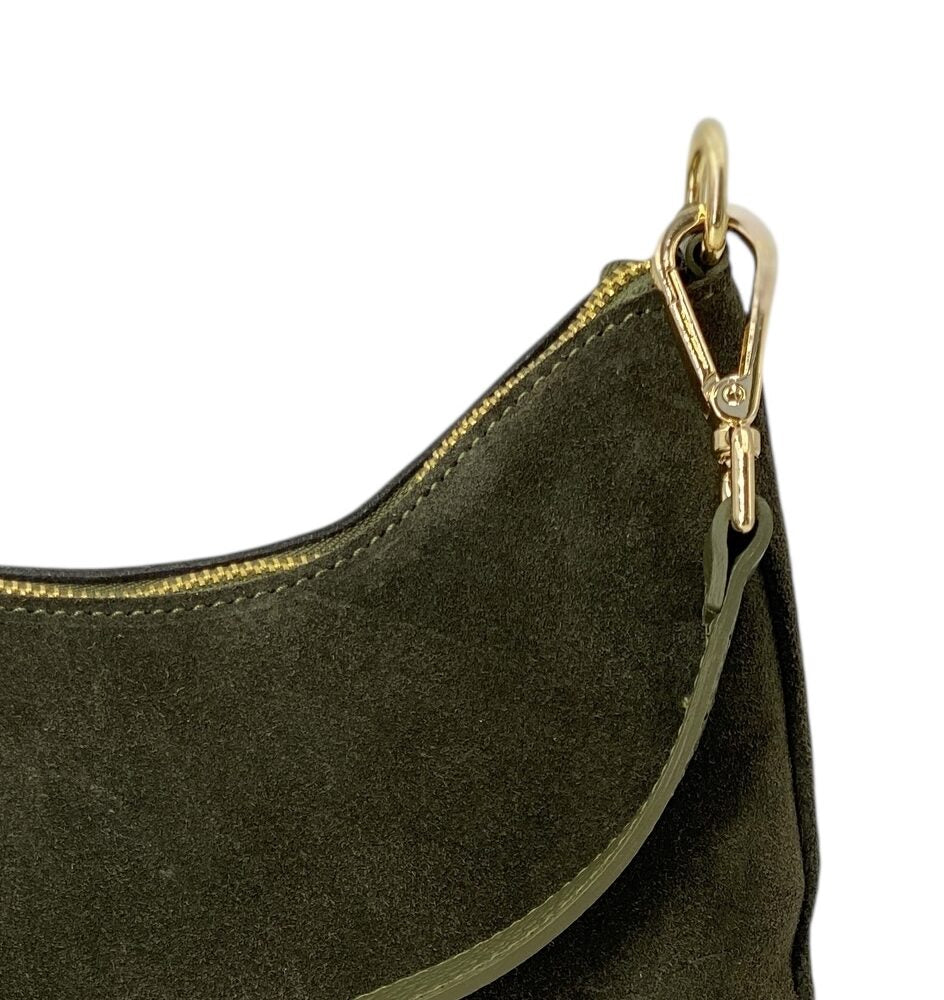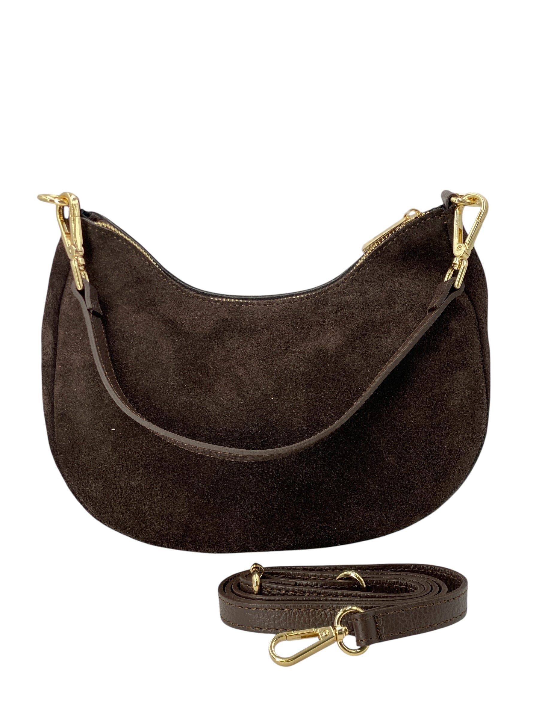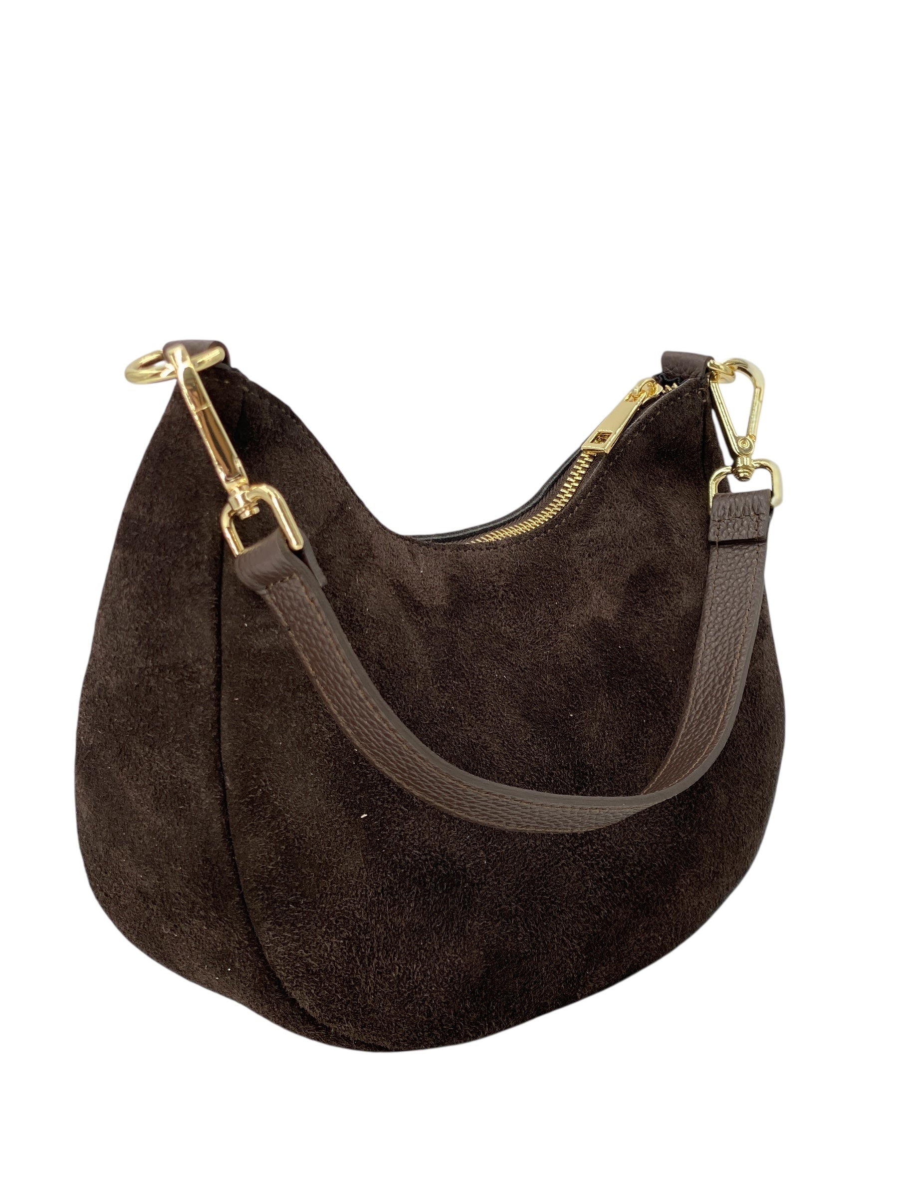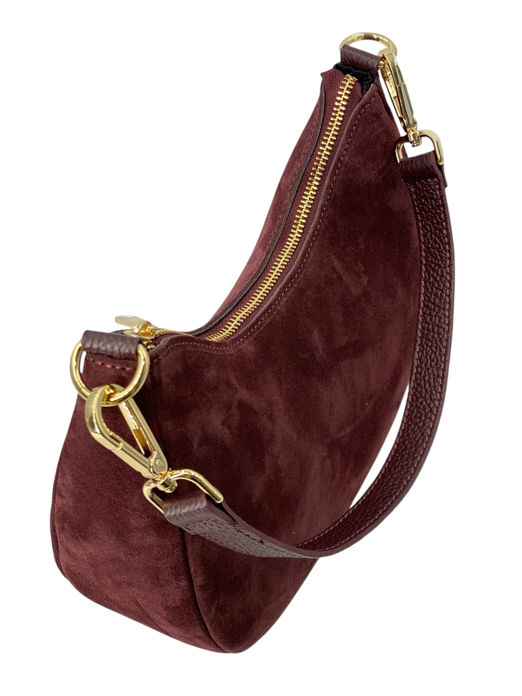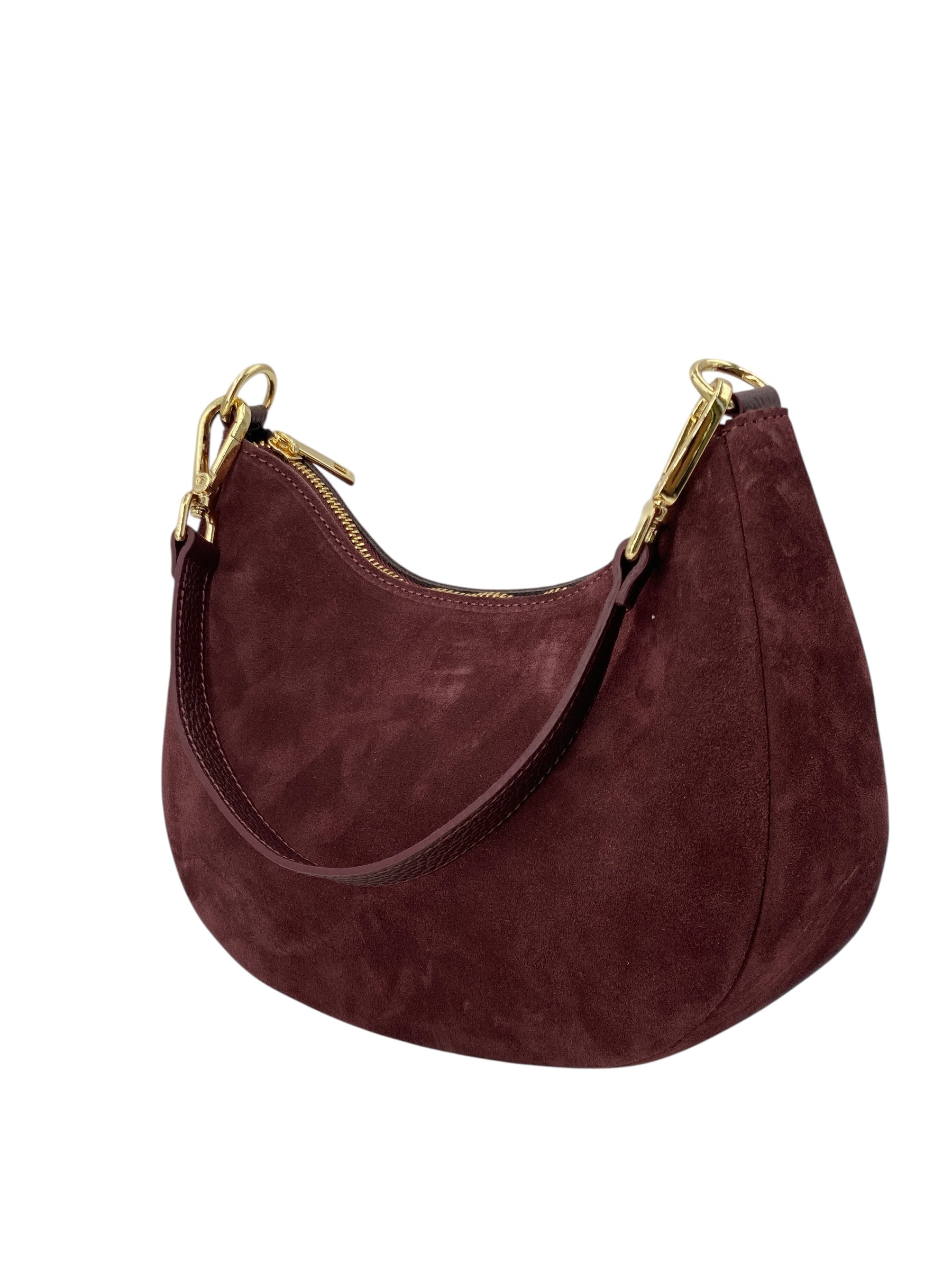 Lydie è una borsa a spalla dalla silhouette a mezzaluna, realizzata in morbido camoscio italiano e rifinita con dettagli in pelle liscia tono su tono.
