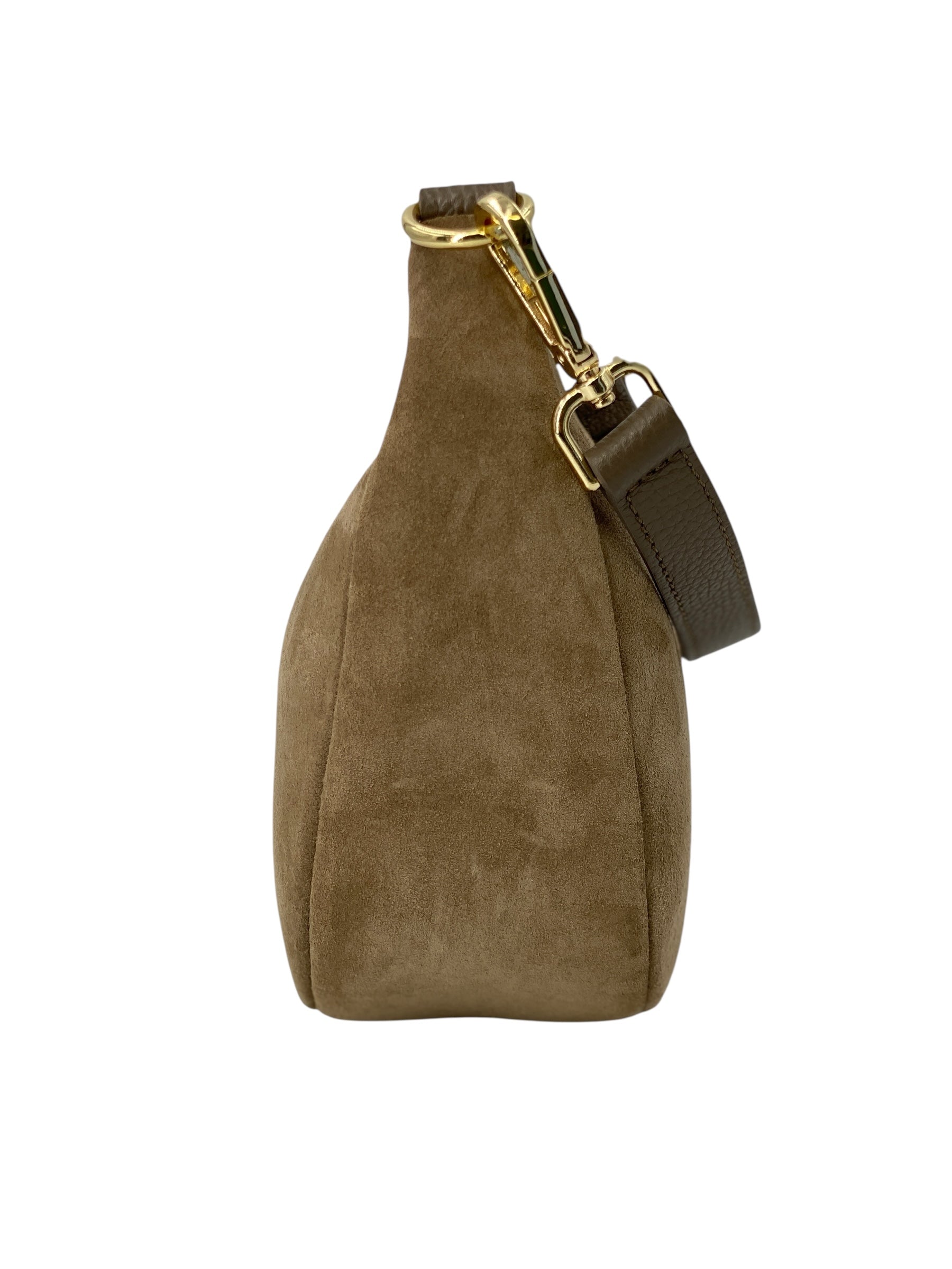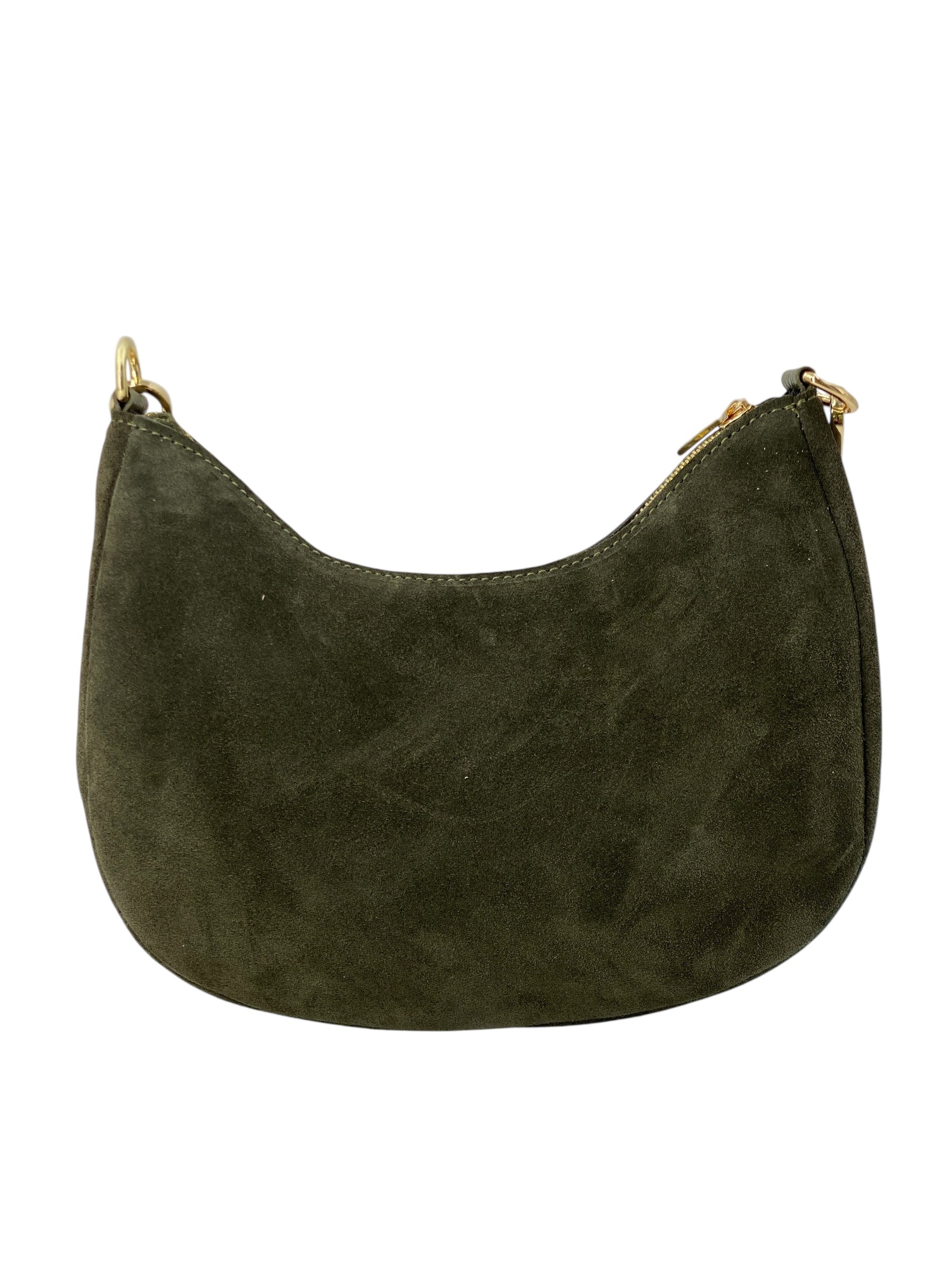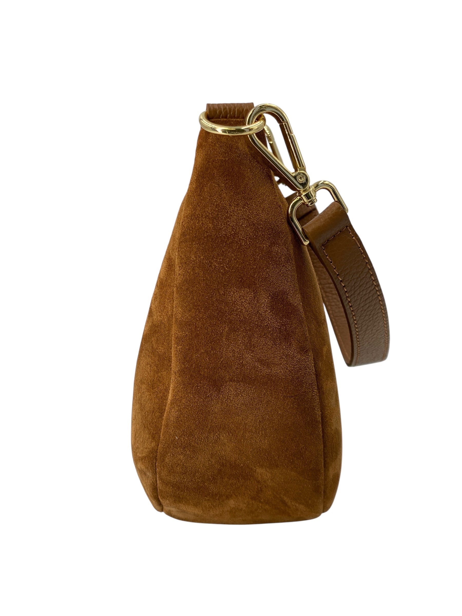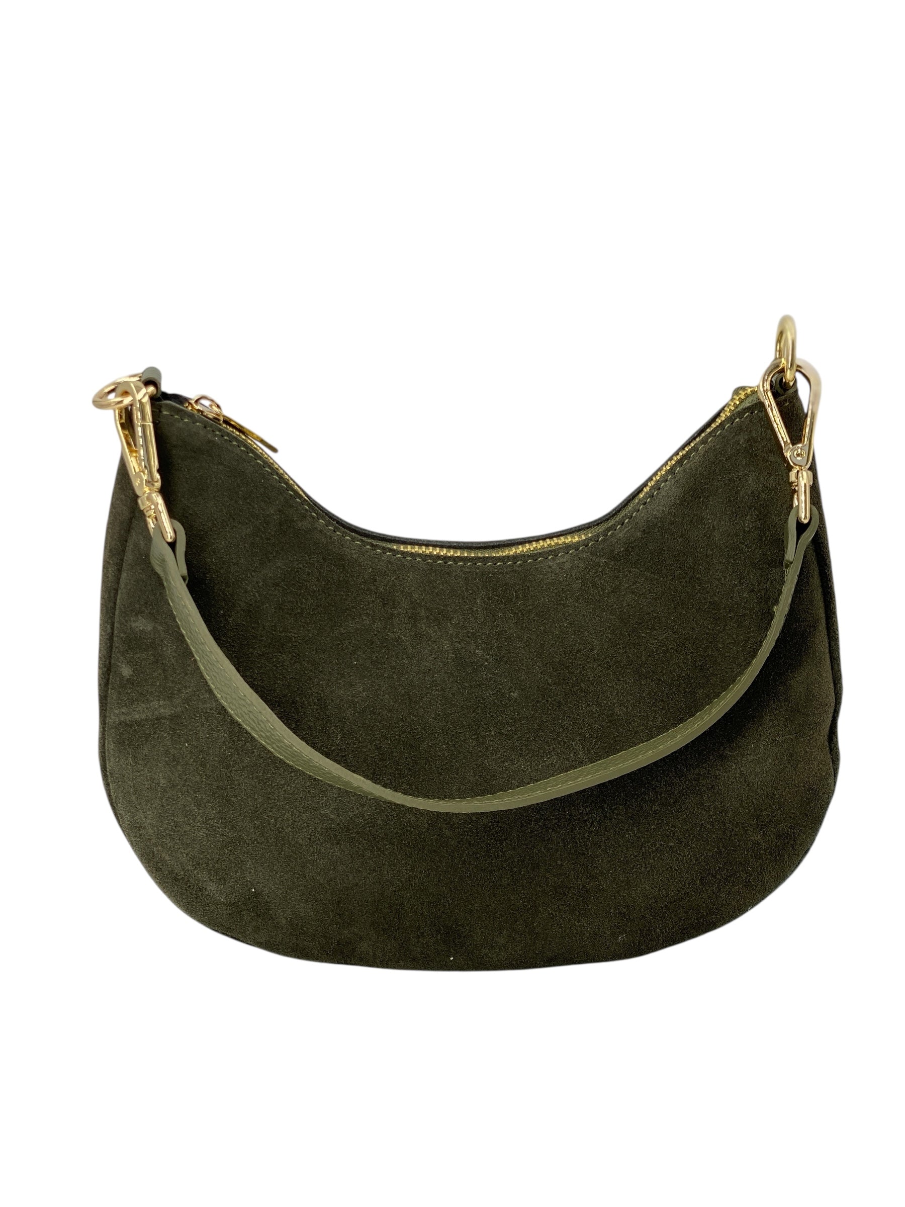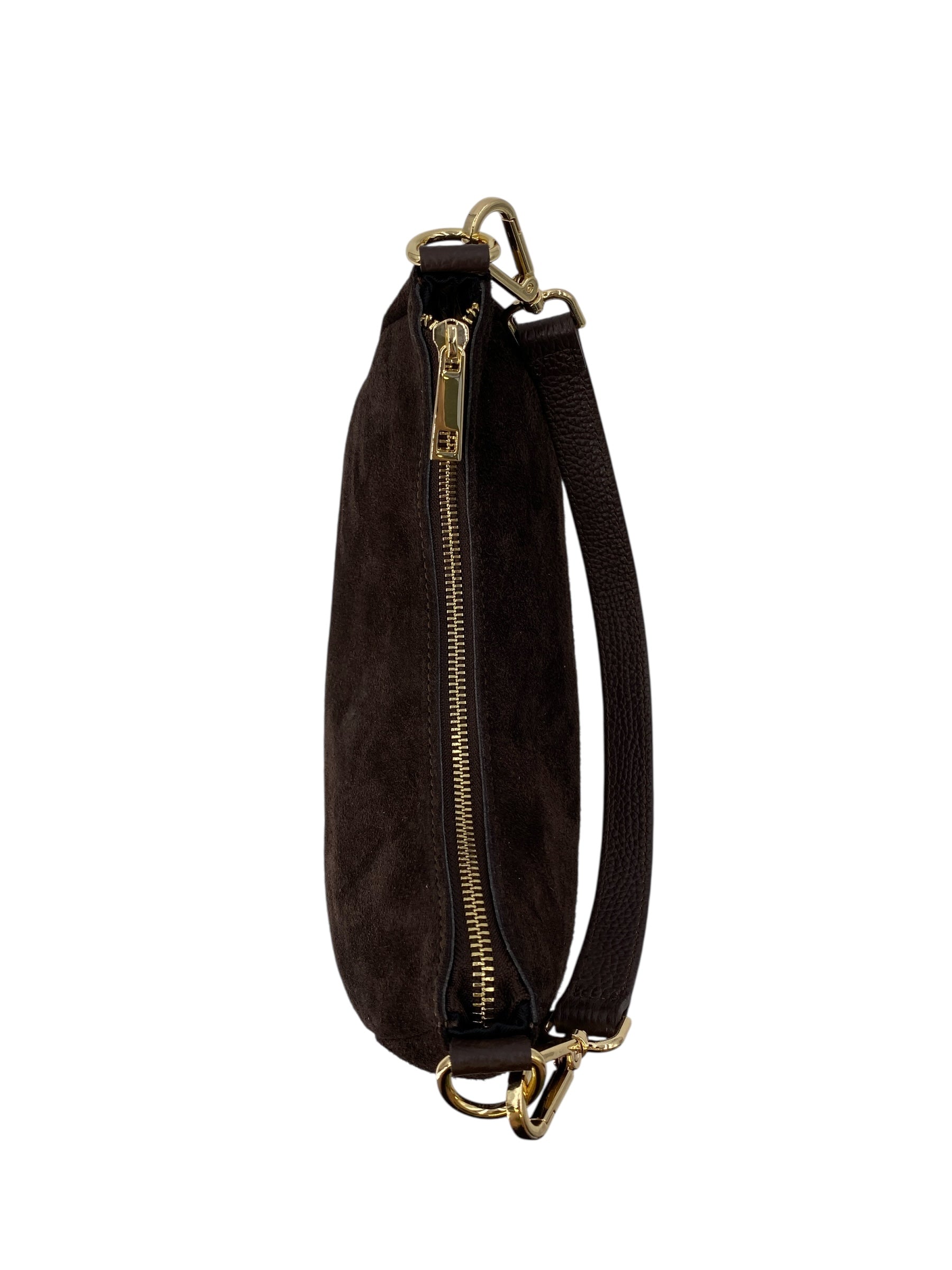 Lydie è una borsa a spalla dalla silhouette a mezzaluna, realizzata in morbido camoscio italiano e rifinita con dettagli in pelle liscia tono su tono.