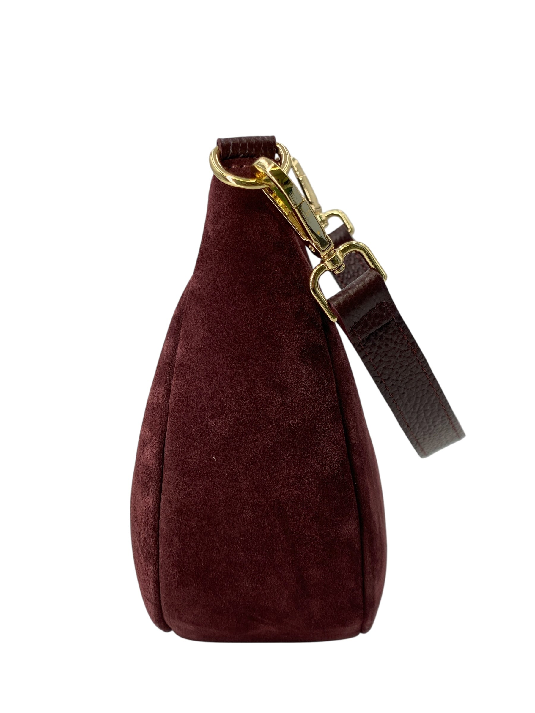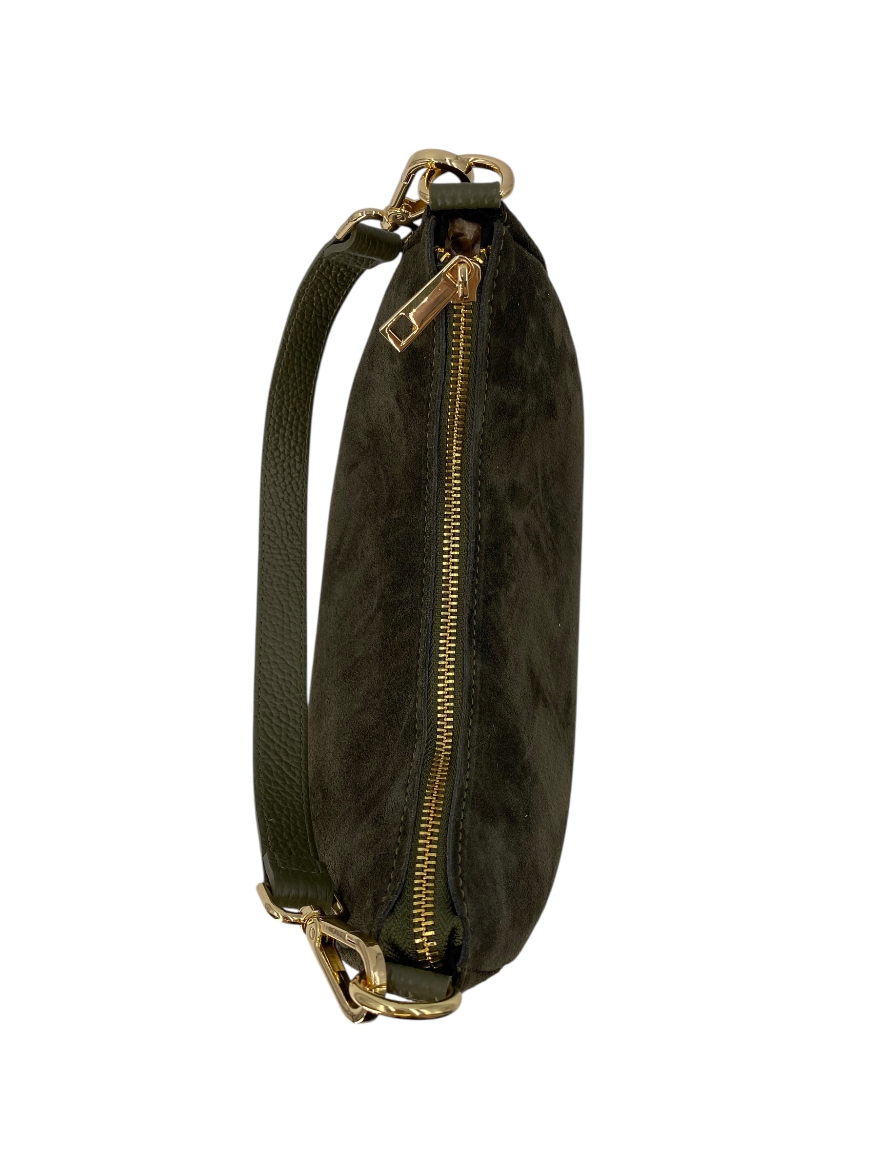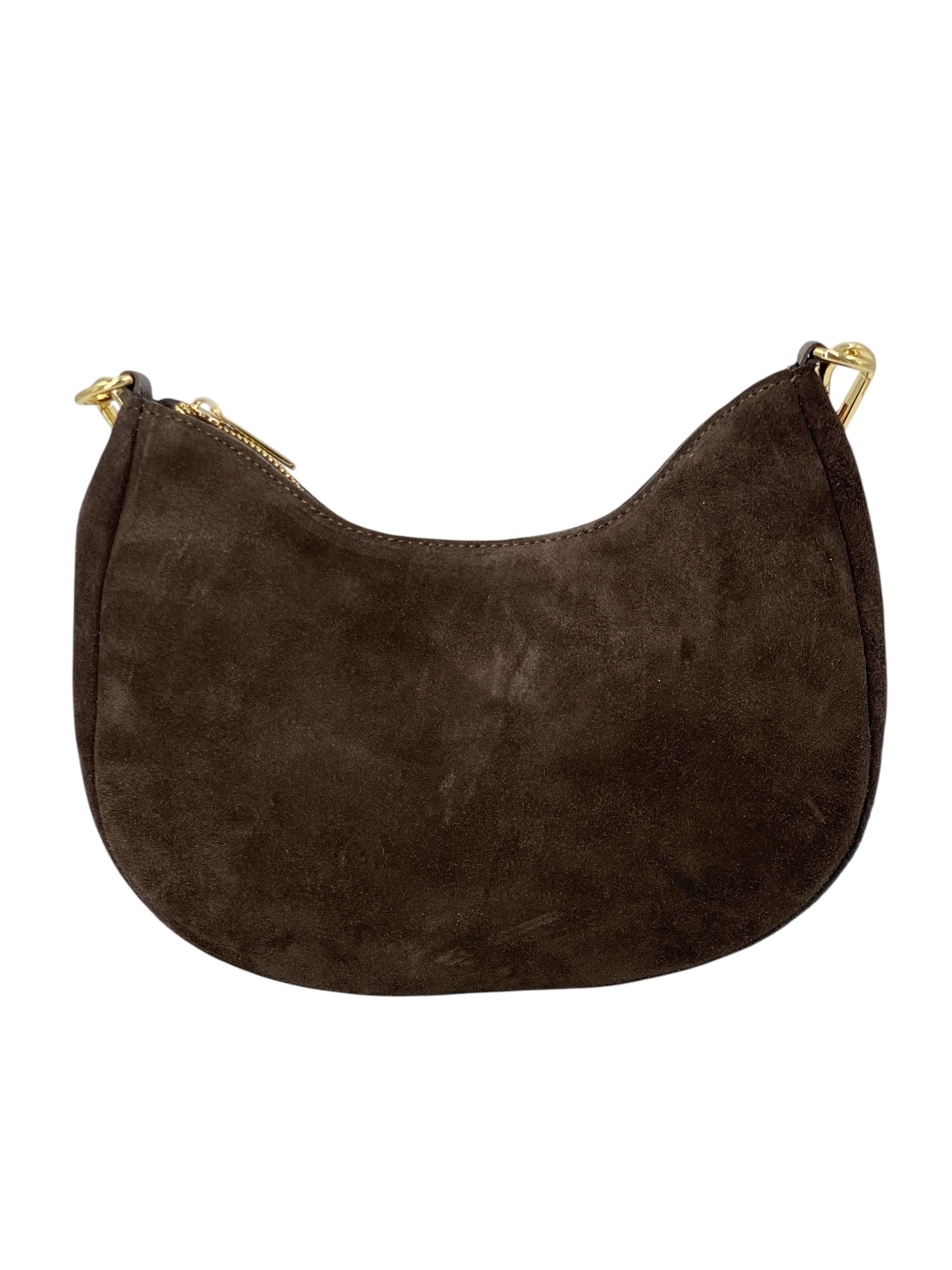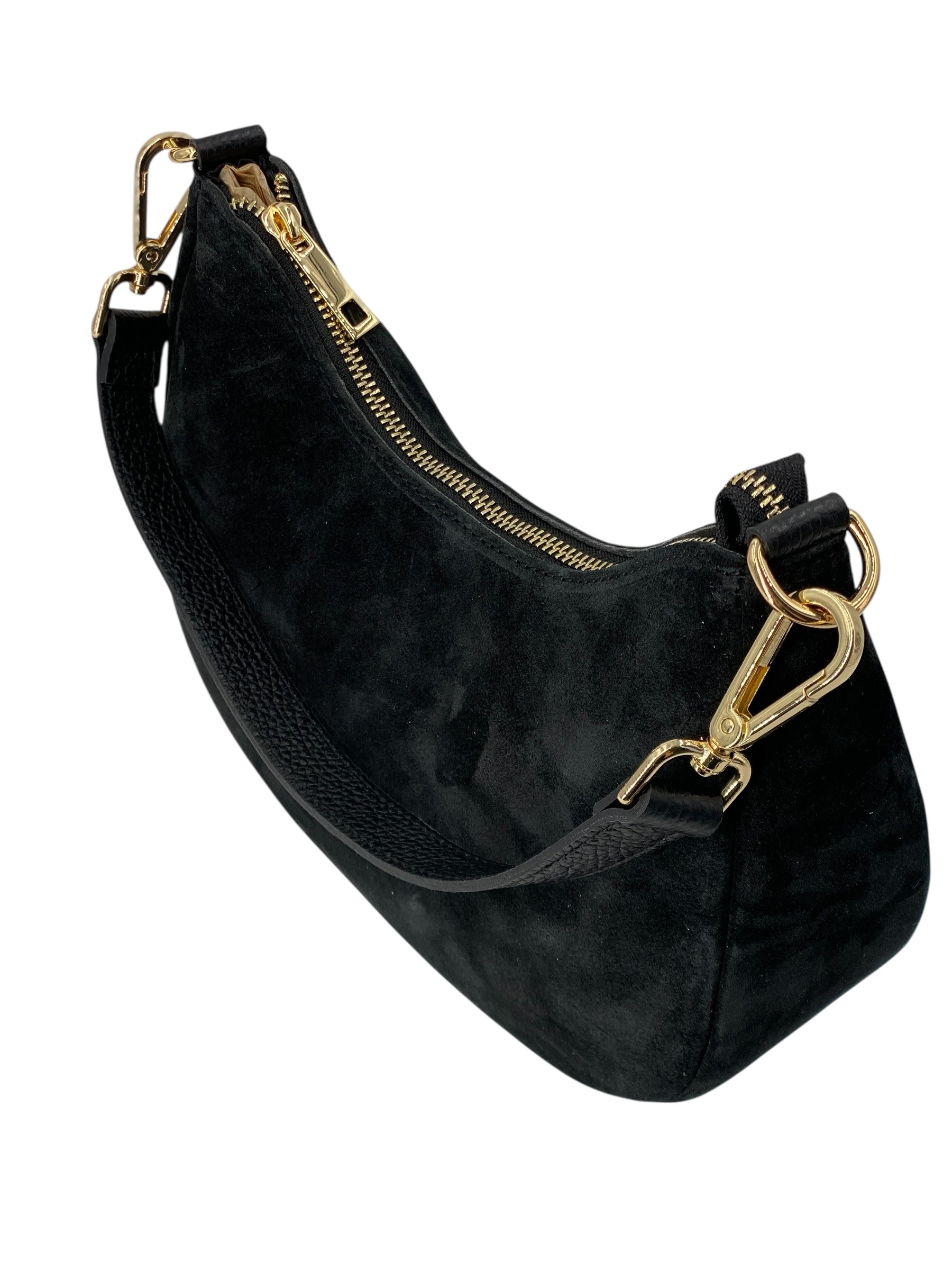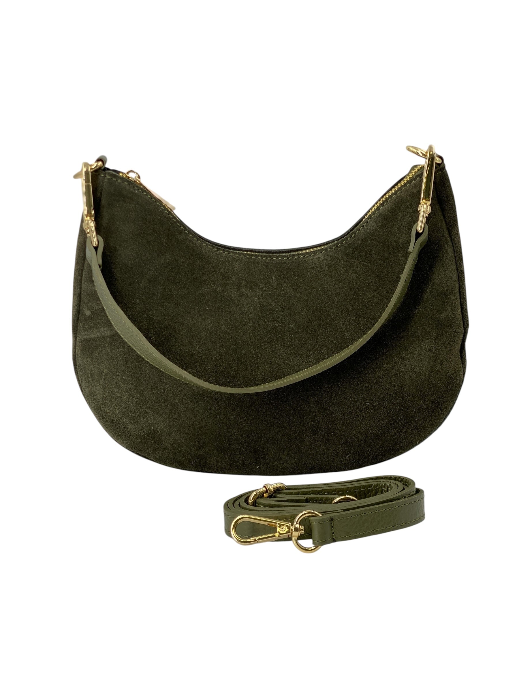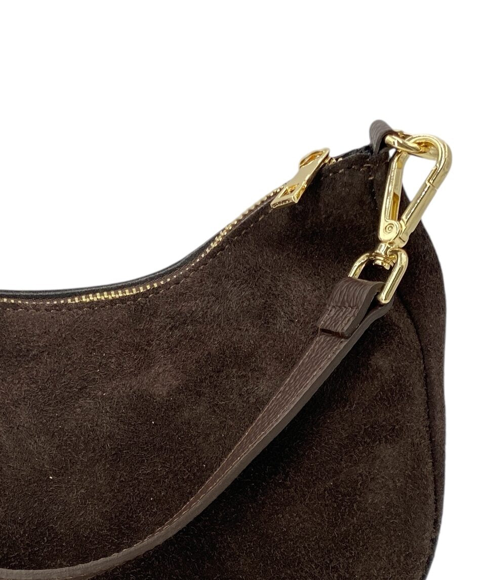 Lydie è una borsa a spalla dalla silhouette a mezzaluna, realizzata in morbido camoscio italiano e rifinita con dettagli in pelle liscia tono su tono.