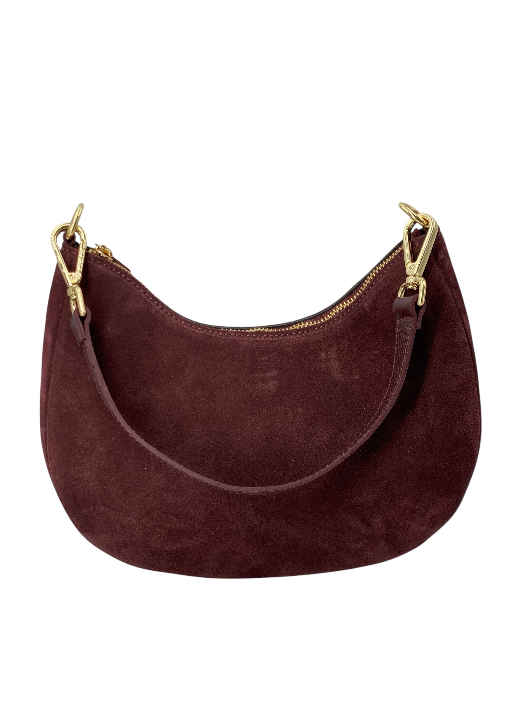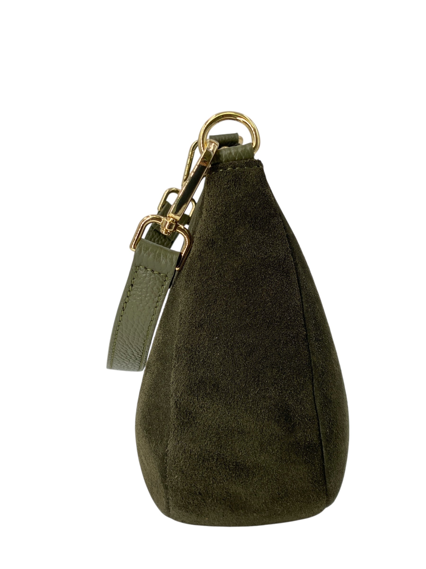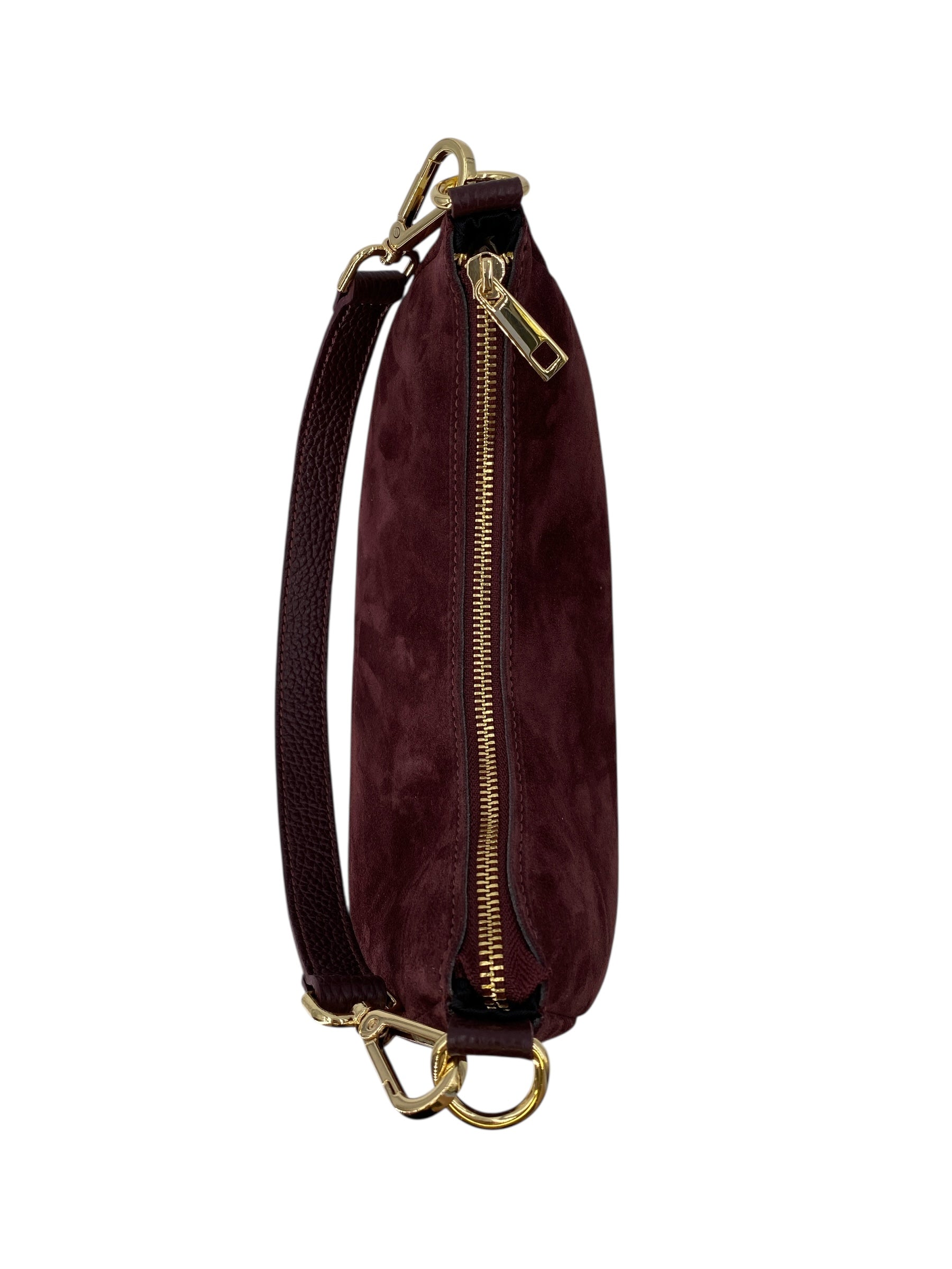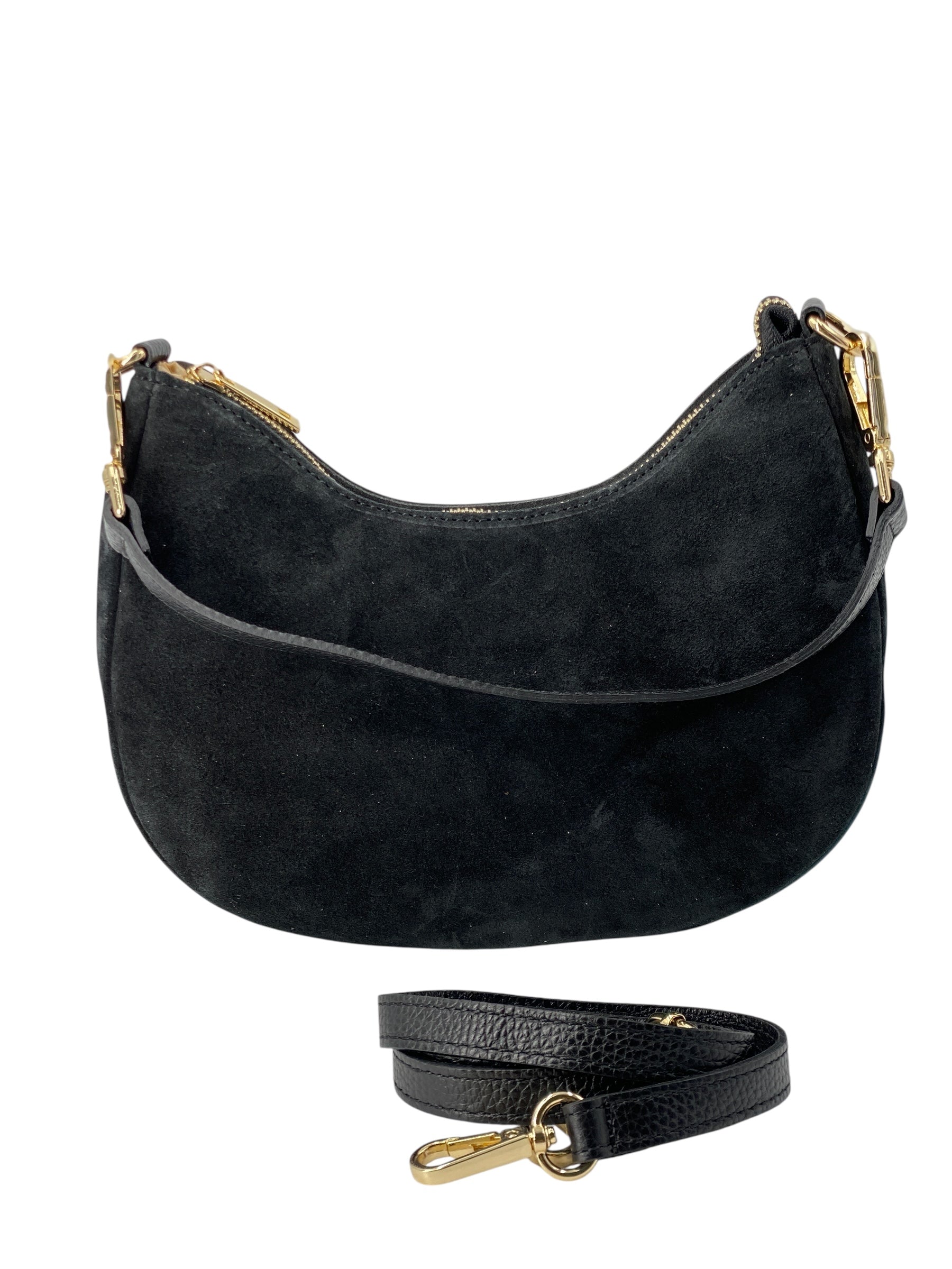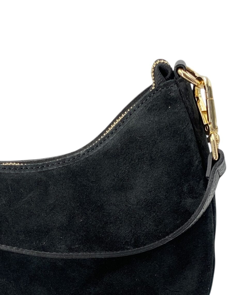 Lydie è una borsa a spalla dalla silhouette a mezzaluna, realizzata in morbido camoscio italiano e rifinita con dettagli in pelle liscia tono su tono.