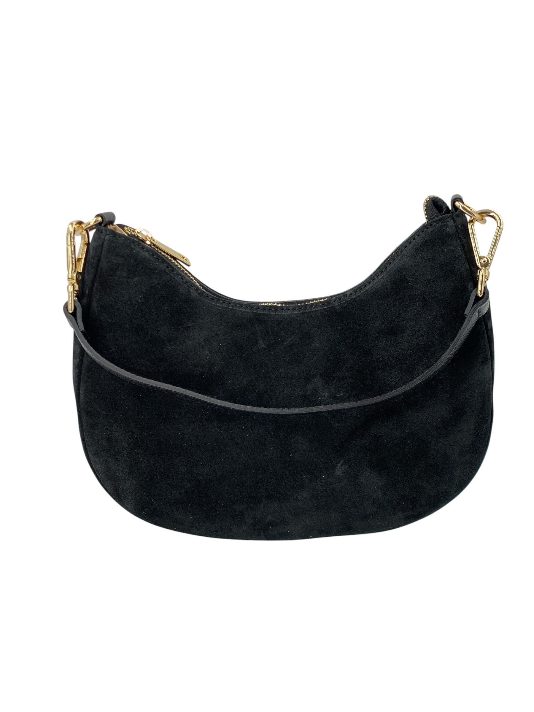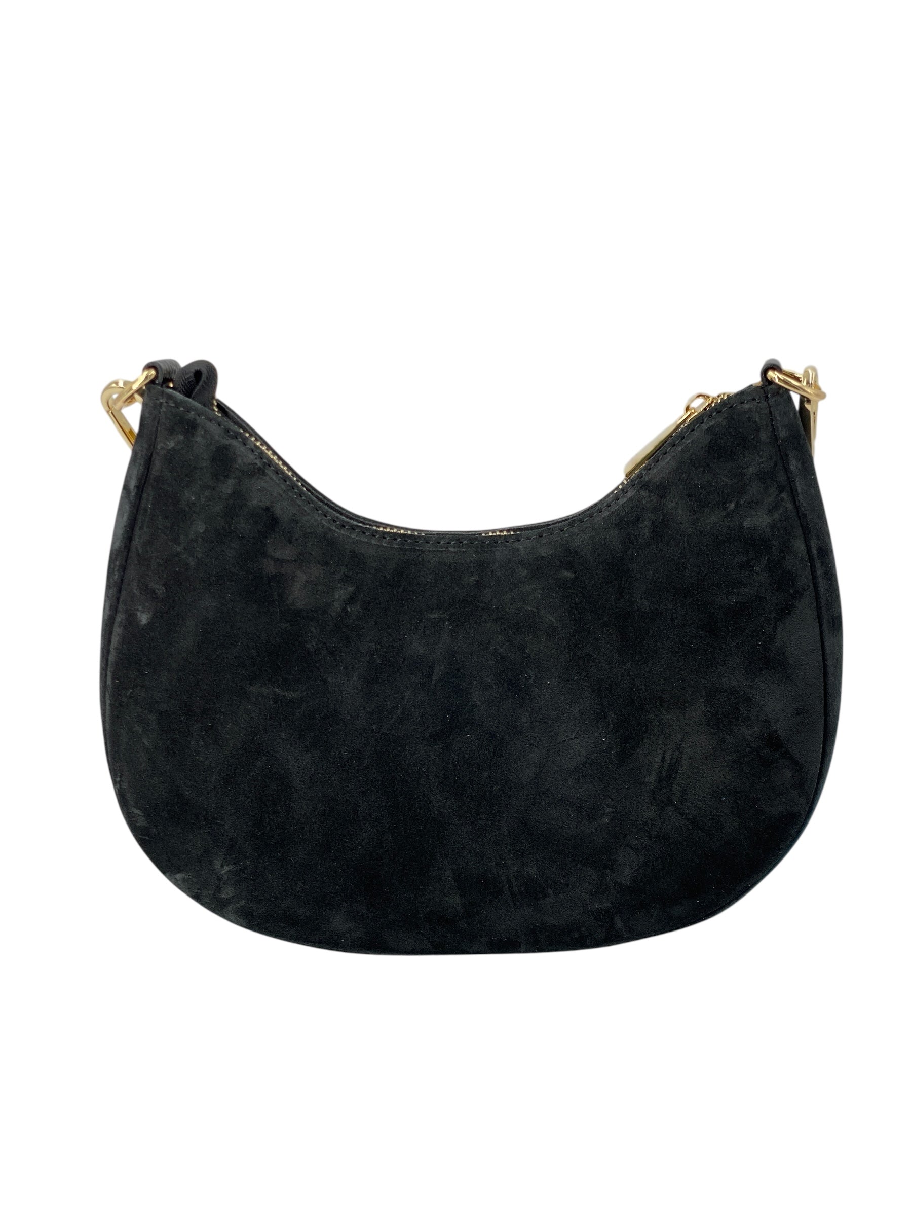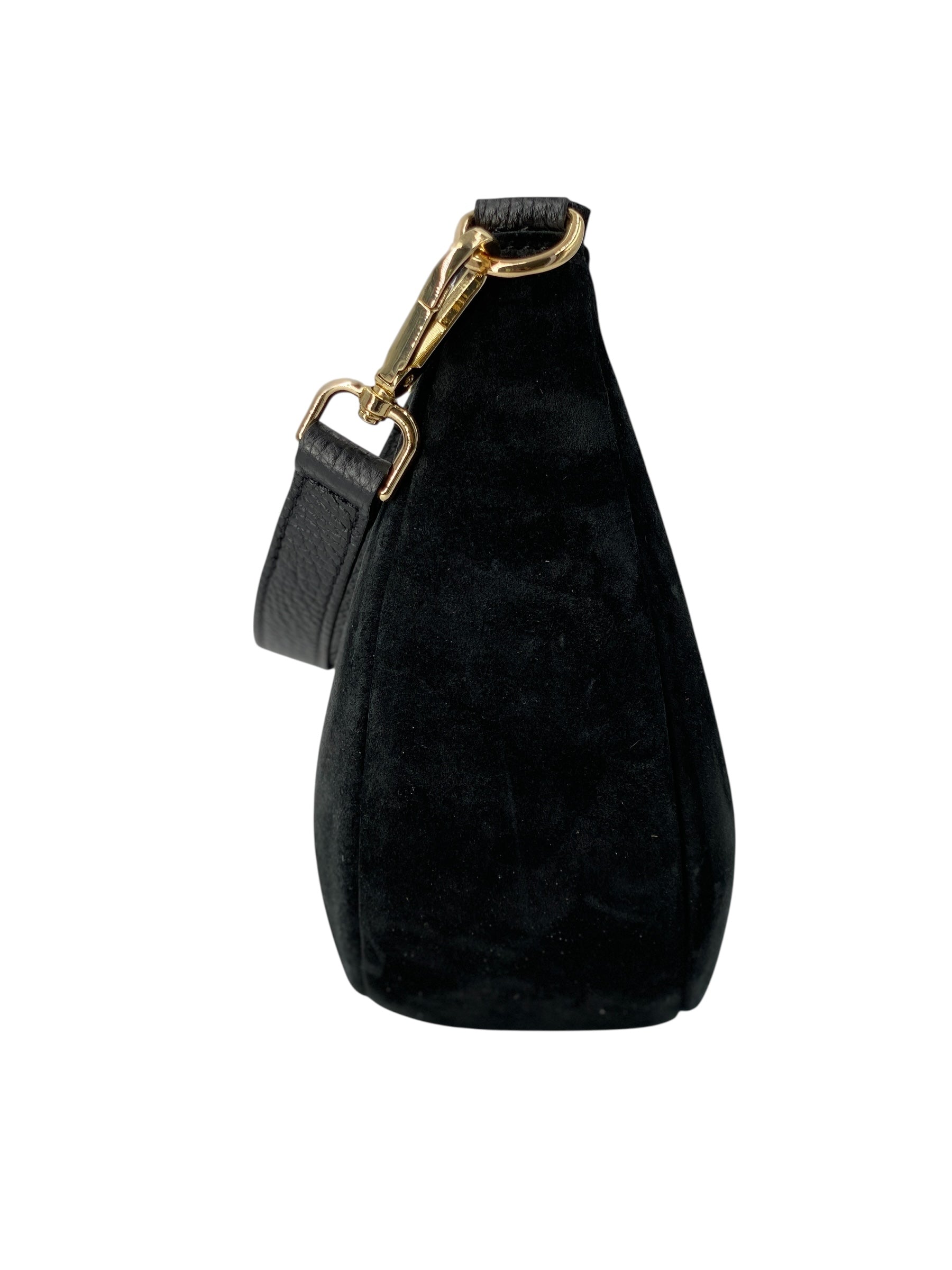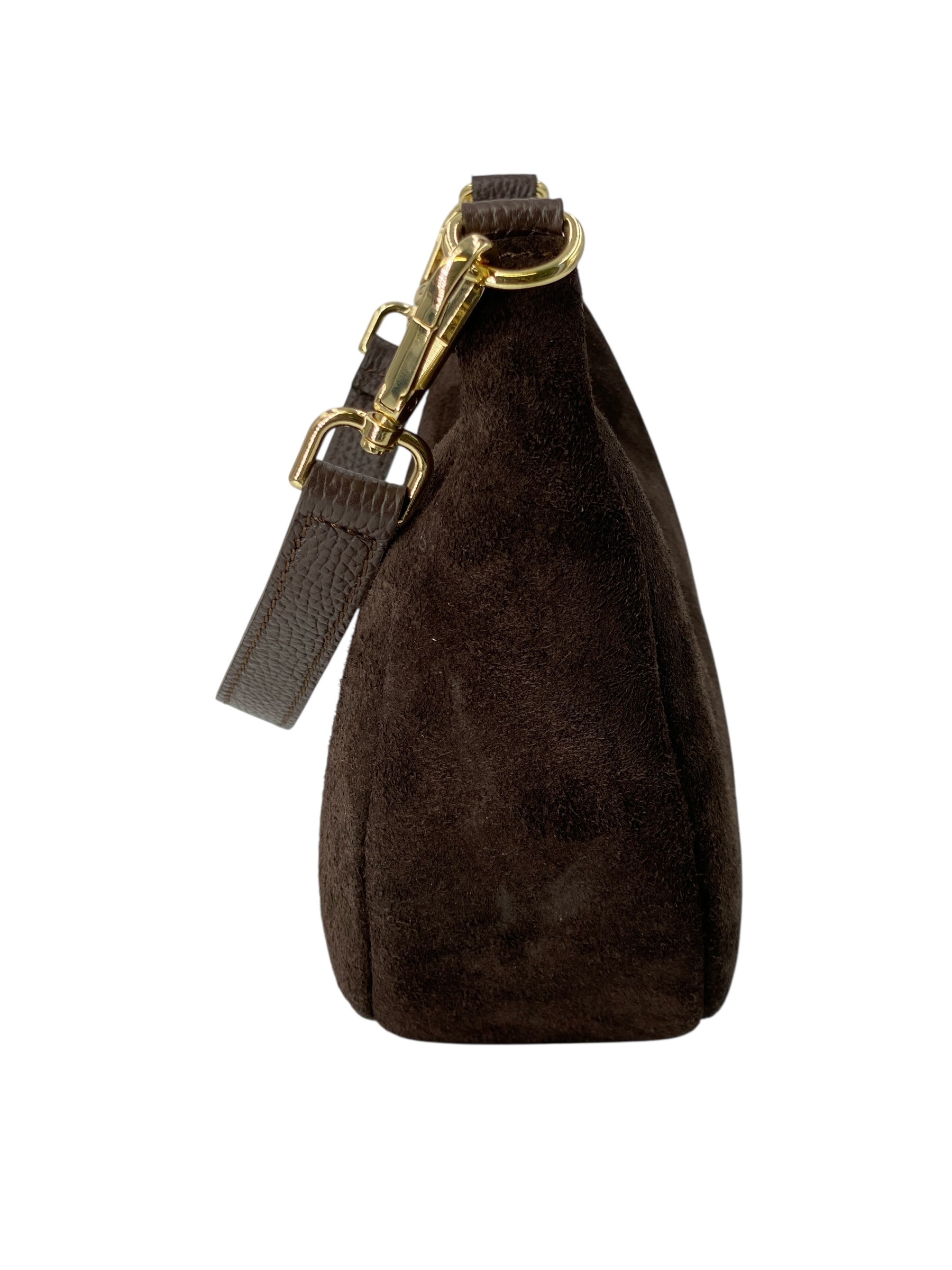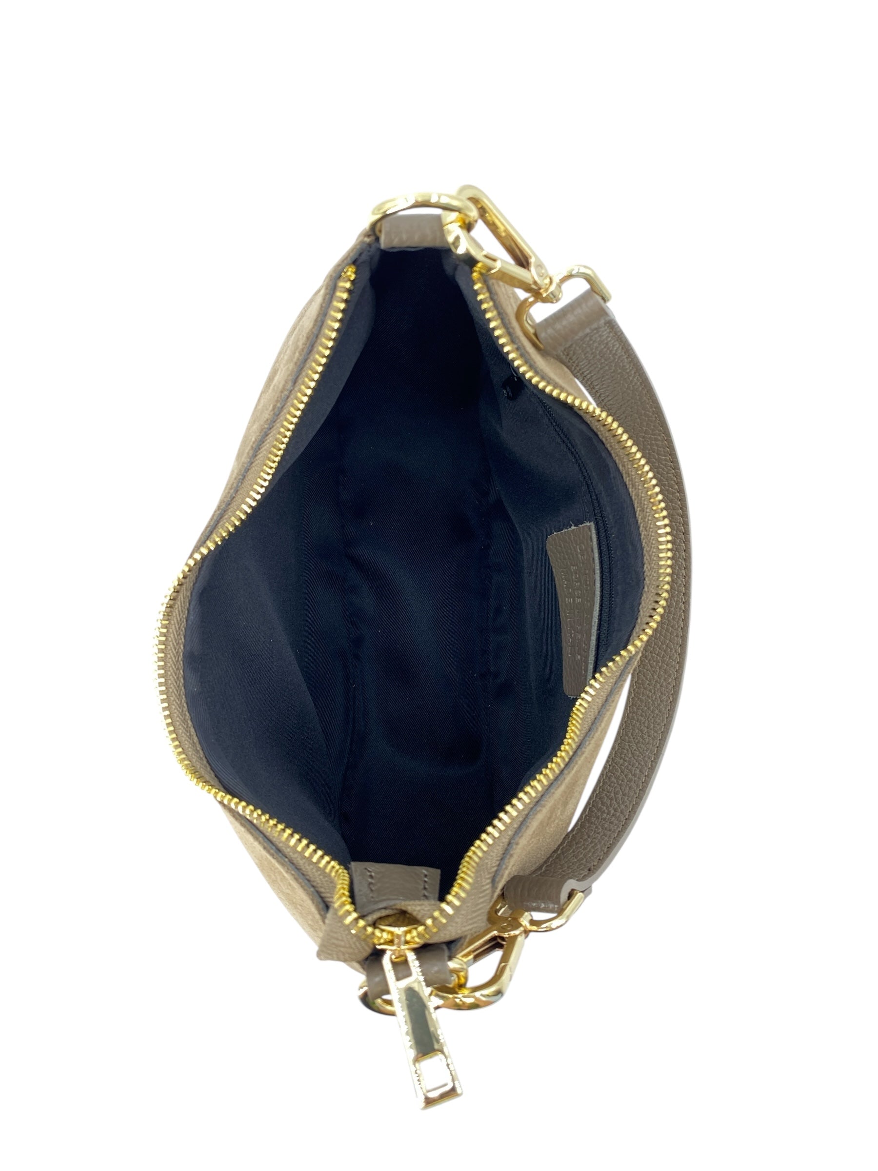 Lydie è una borsa a spalla dalla silhouette a mezzaluna, realizzata in morbido camoscio italiano e rifinita con dettagli in pelle liscia tono su tono.