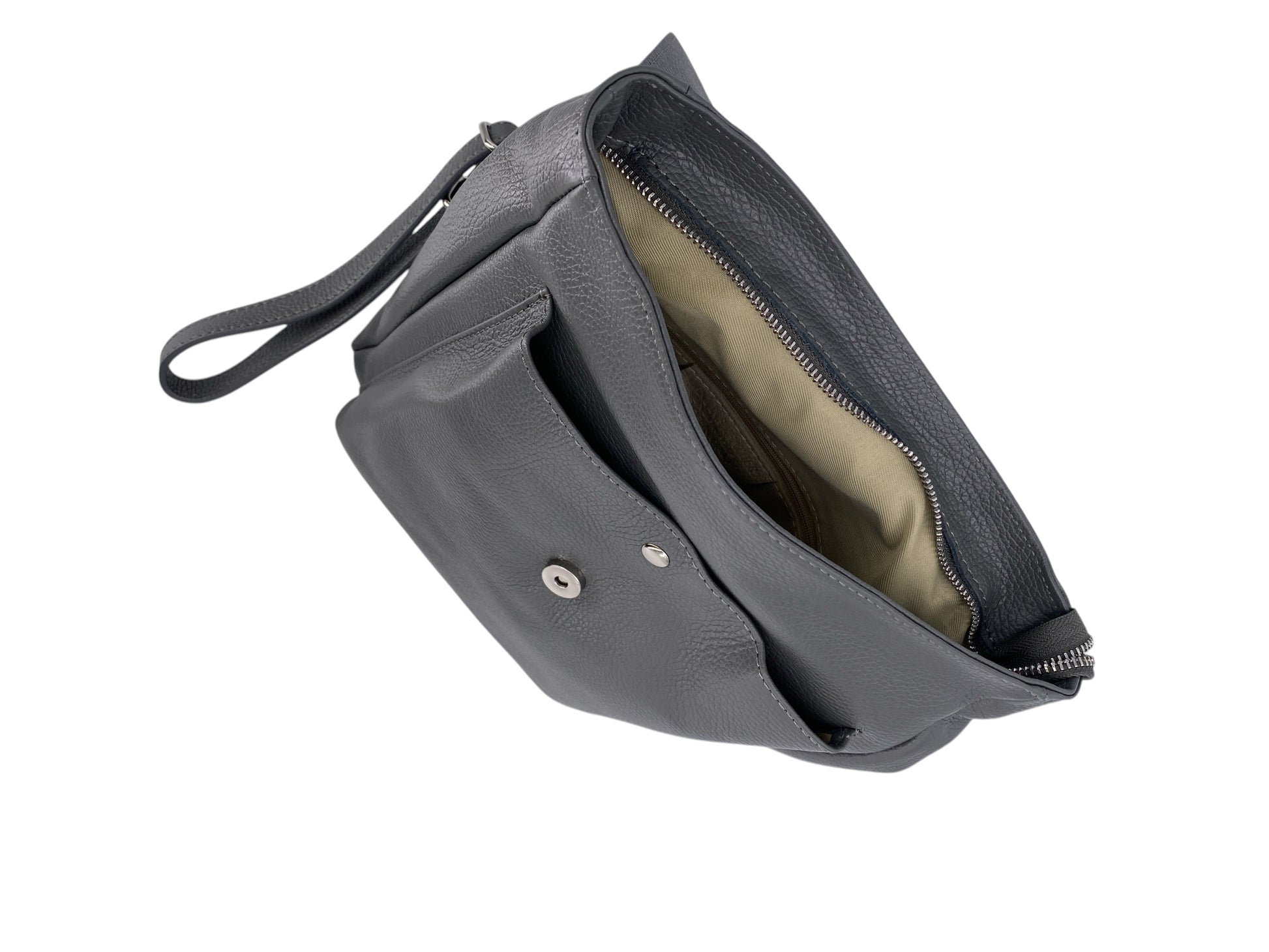Manon mostra anche la tasca frontale esterna chiusa con bottone magnetico, molto comoda per un accesso rapido a ciò che serve durante gli spostamenti, come biglietti, cuffiette o un piccolo taccuino.