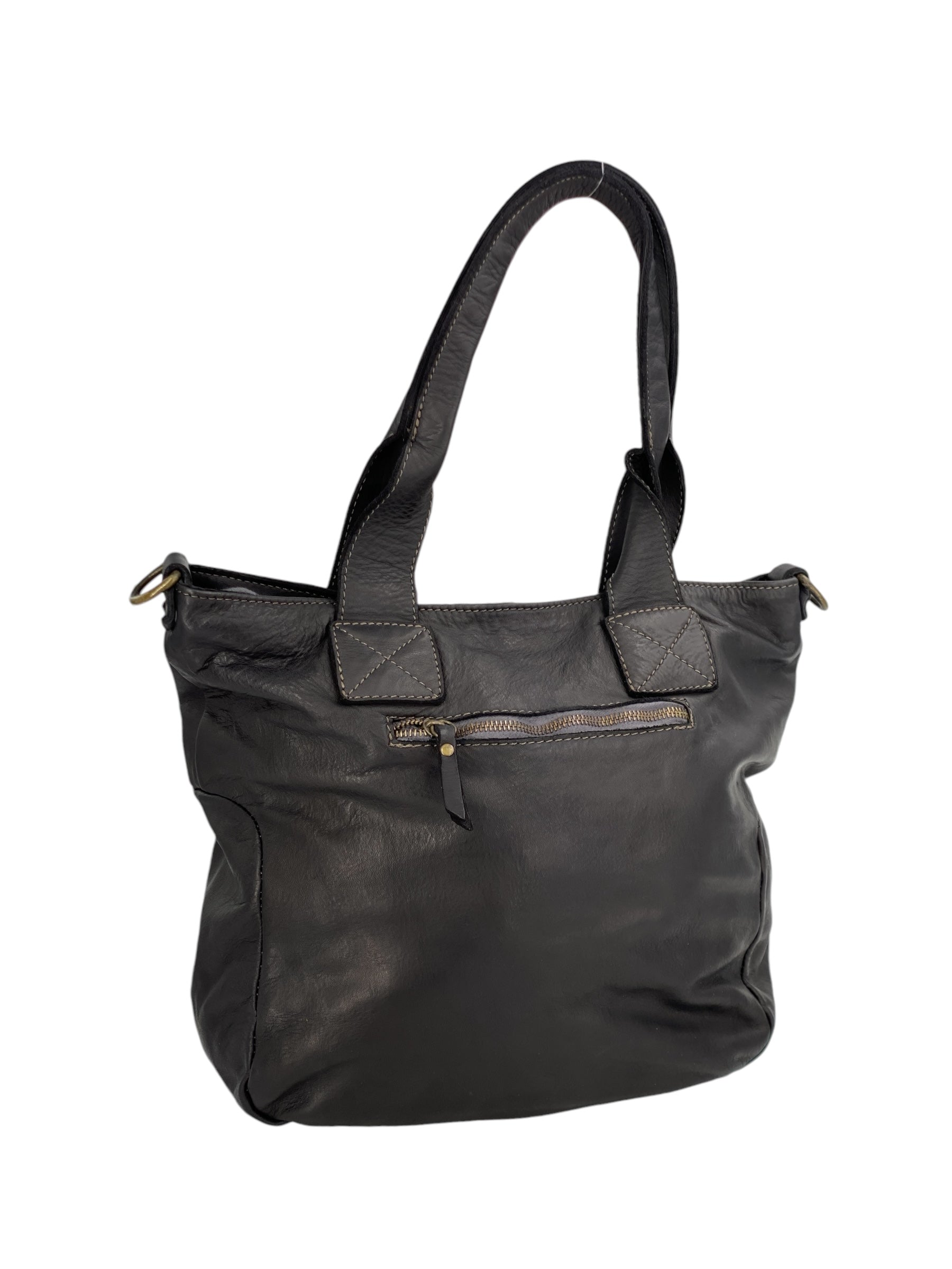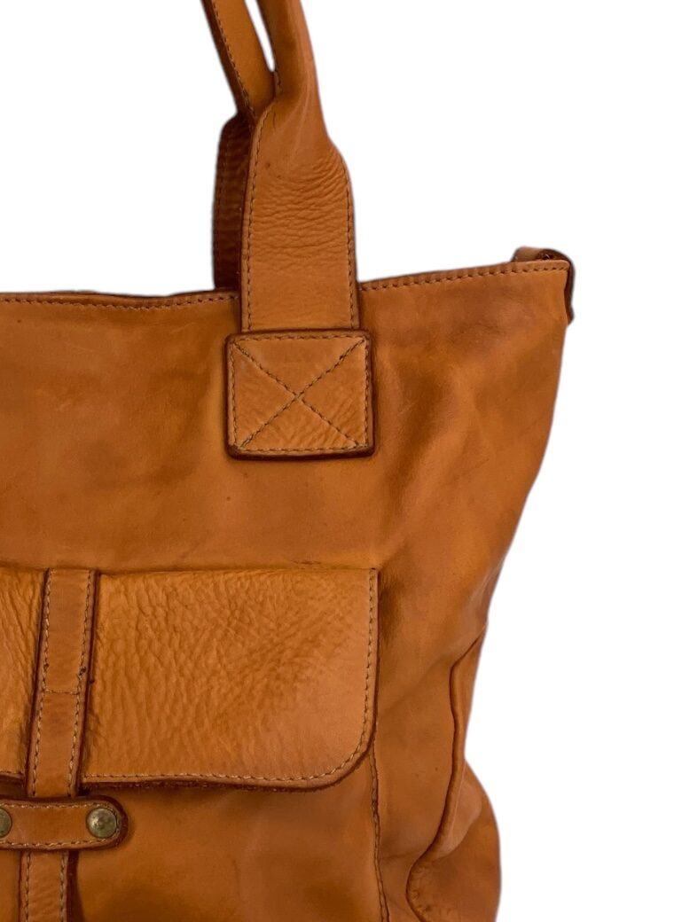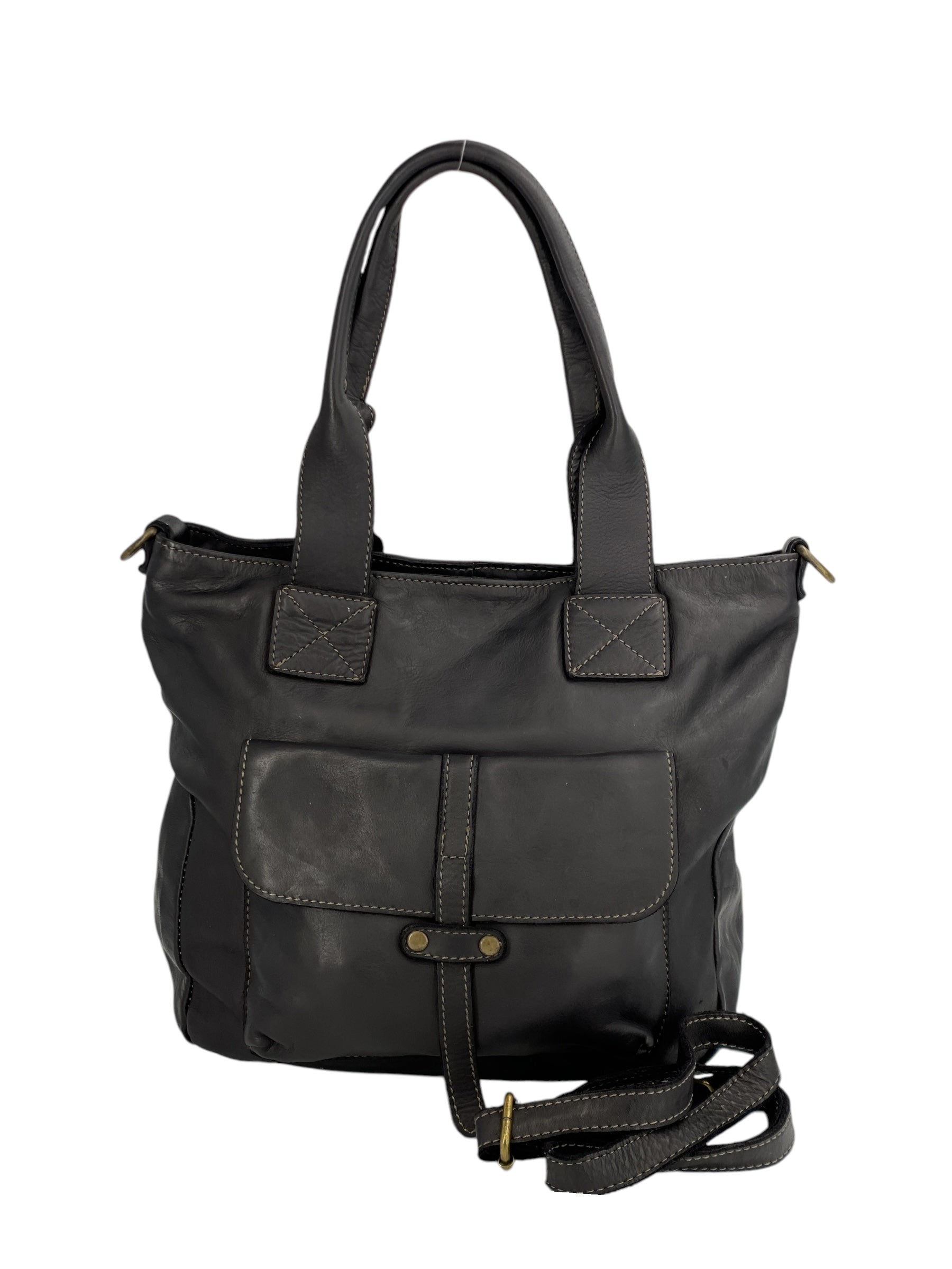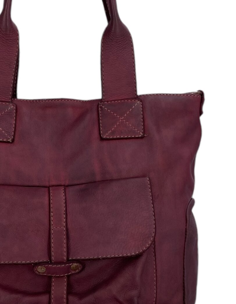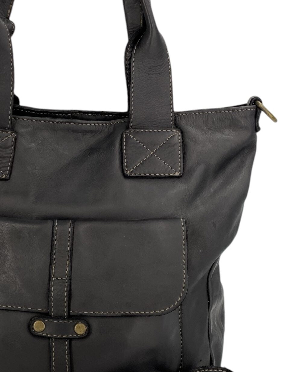 Il design è pratico e funzionale: i doppi manici rinforzati permettono di portarla comodamente a mano, mentre la tracolla regolabile e removibile offre la libertà di indossarla a spalla o crossbody. La tasca frontale con patta e chiusura a bottone aggiunge un dettaglio distintivo e allo stesso tempo utile per riporre piccoli oggetti a portata di mano. I dettagli cuciti e le finiture artigianali testimoniano la cura e la passione dei nostri maestri pellettieri.