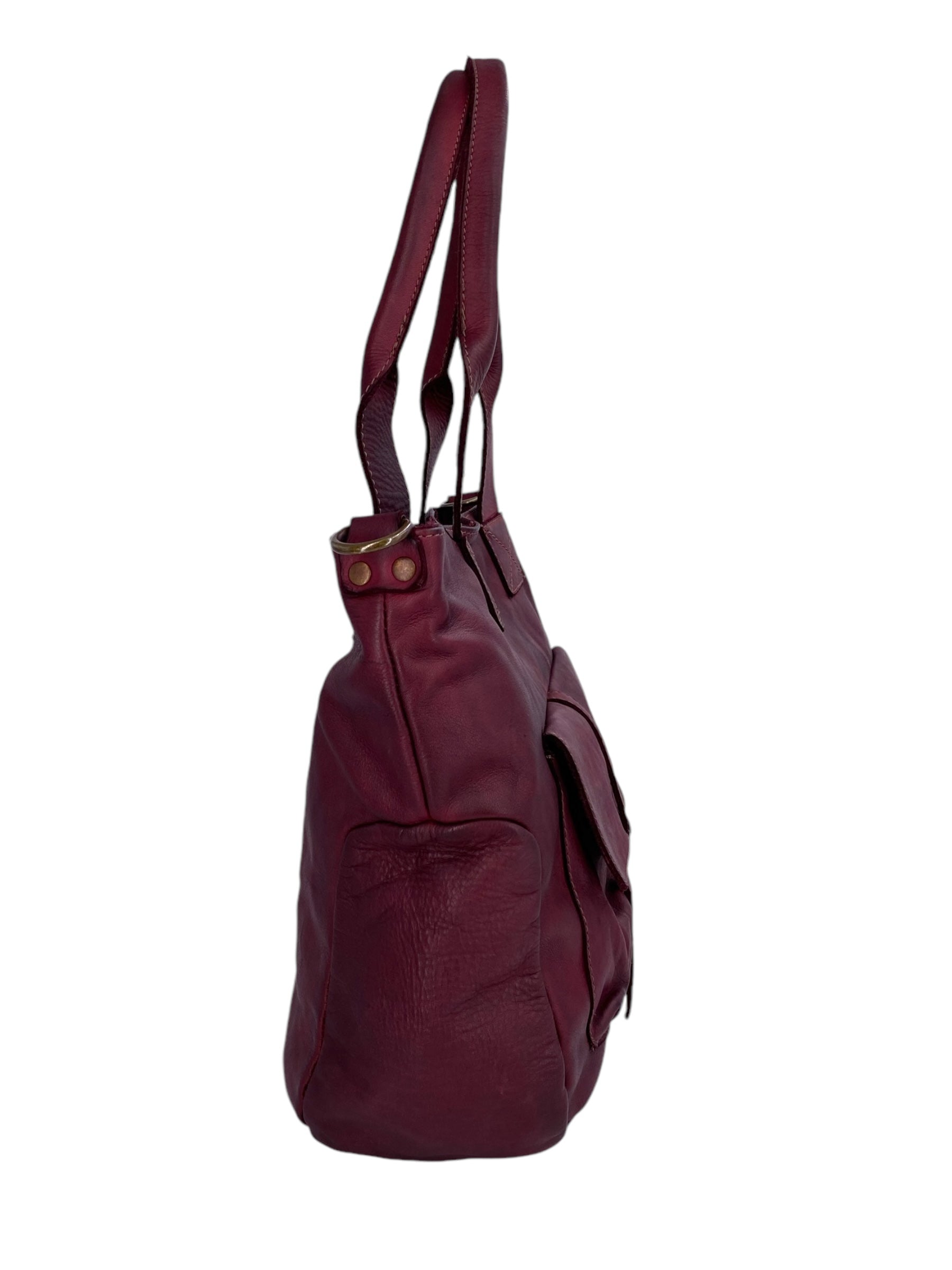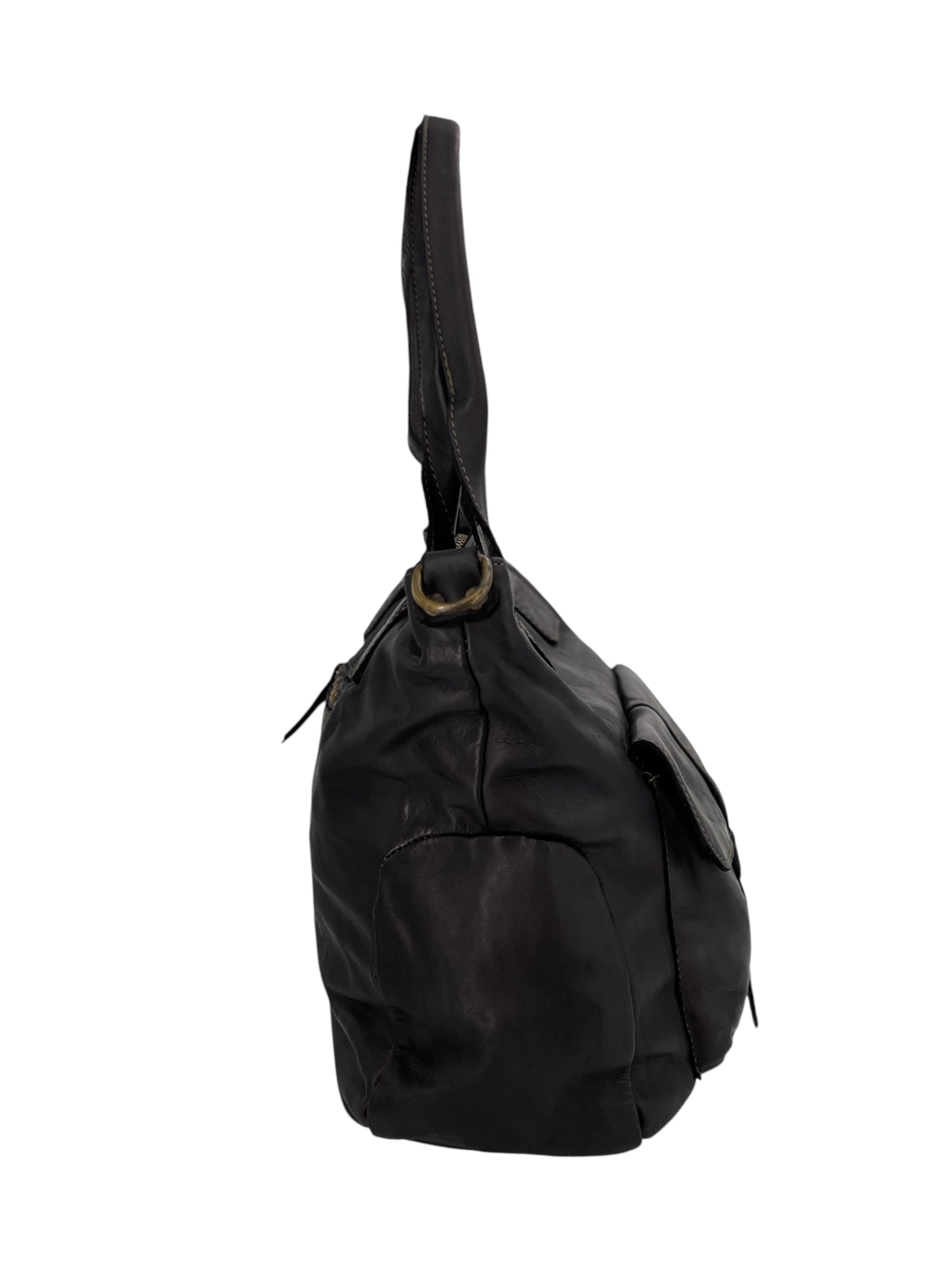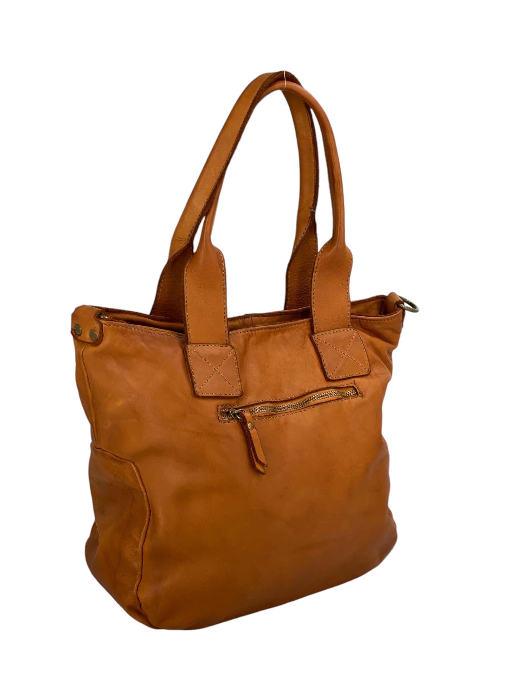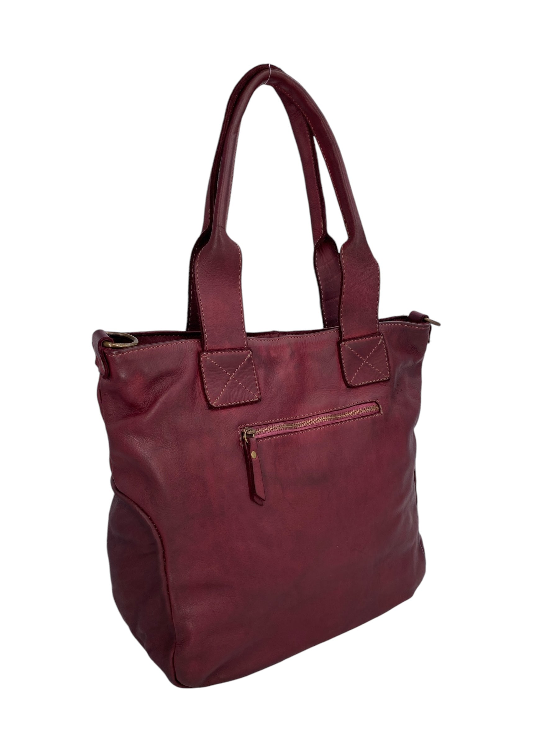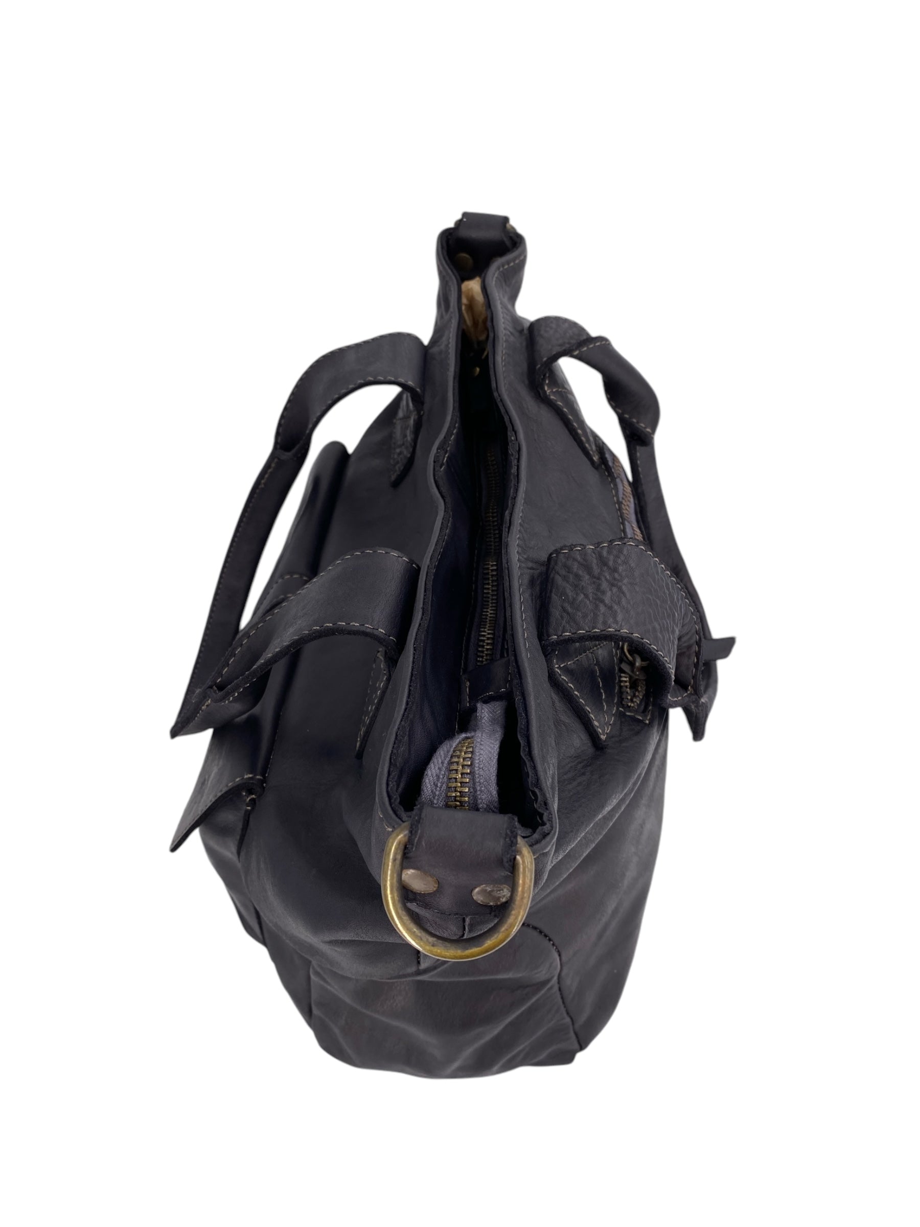 Il design è pratico e funzionale: i doppi manici rinforzati permettono di portarla comodamente a mano, mentre la tracolla regolabile e removibile offre la libertà di indossarla a spalla o crossbody. La tasca frontale con patta e chiusura a bottone aggiunge un dettaglio distintivo e allo stesso tempo utile per riporre piccoli oggetti a portata di mano. I dettagli cuciti e le finiture artigianali testimoniano la cura e la passione dei nostri maestri pellettieri.