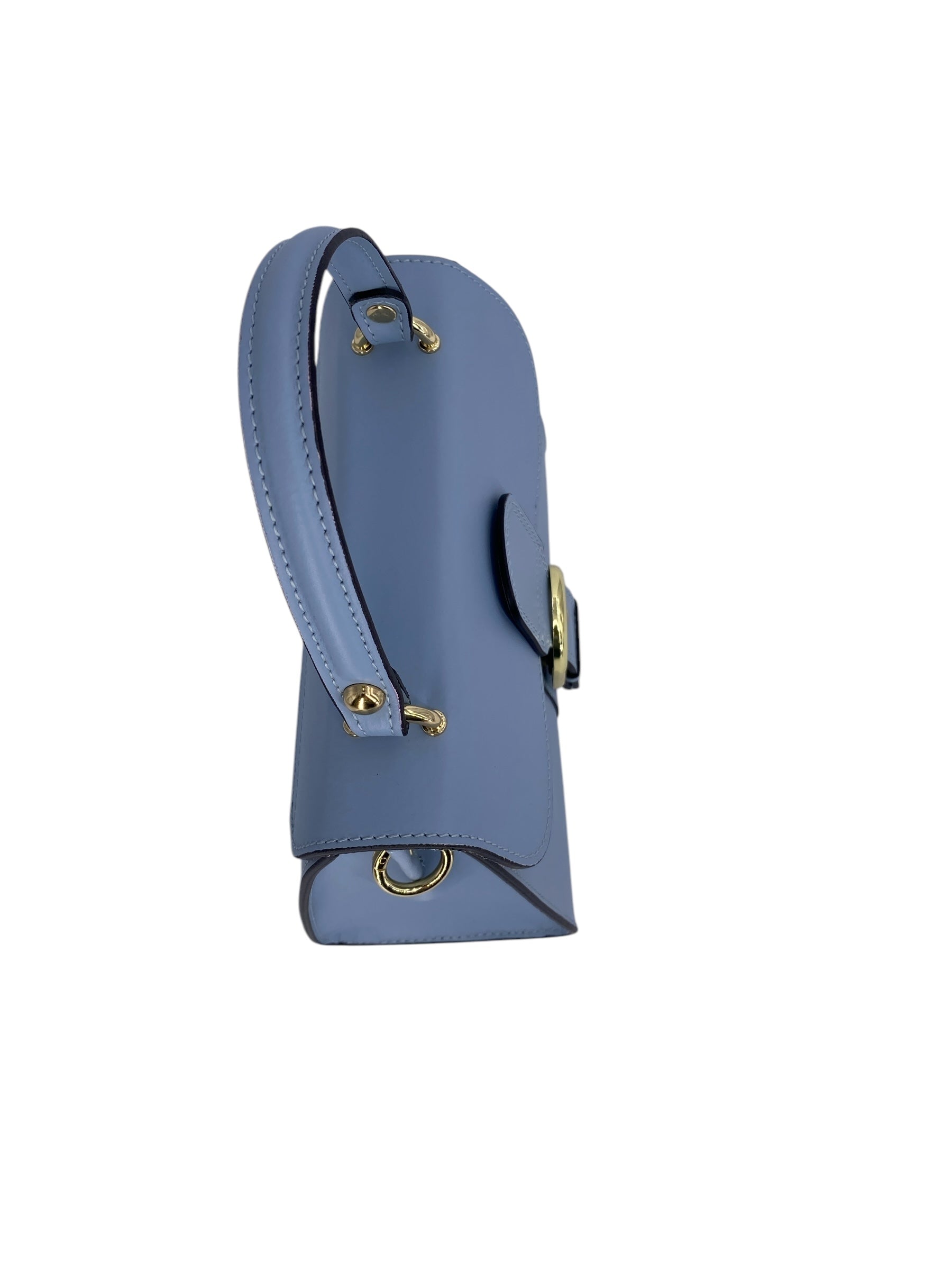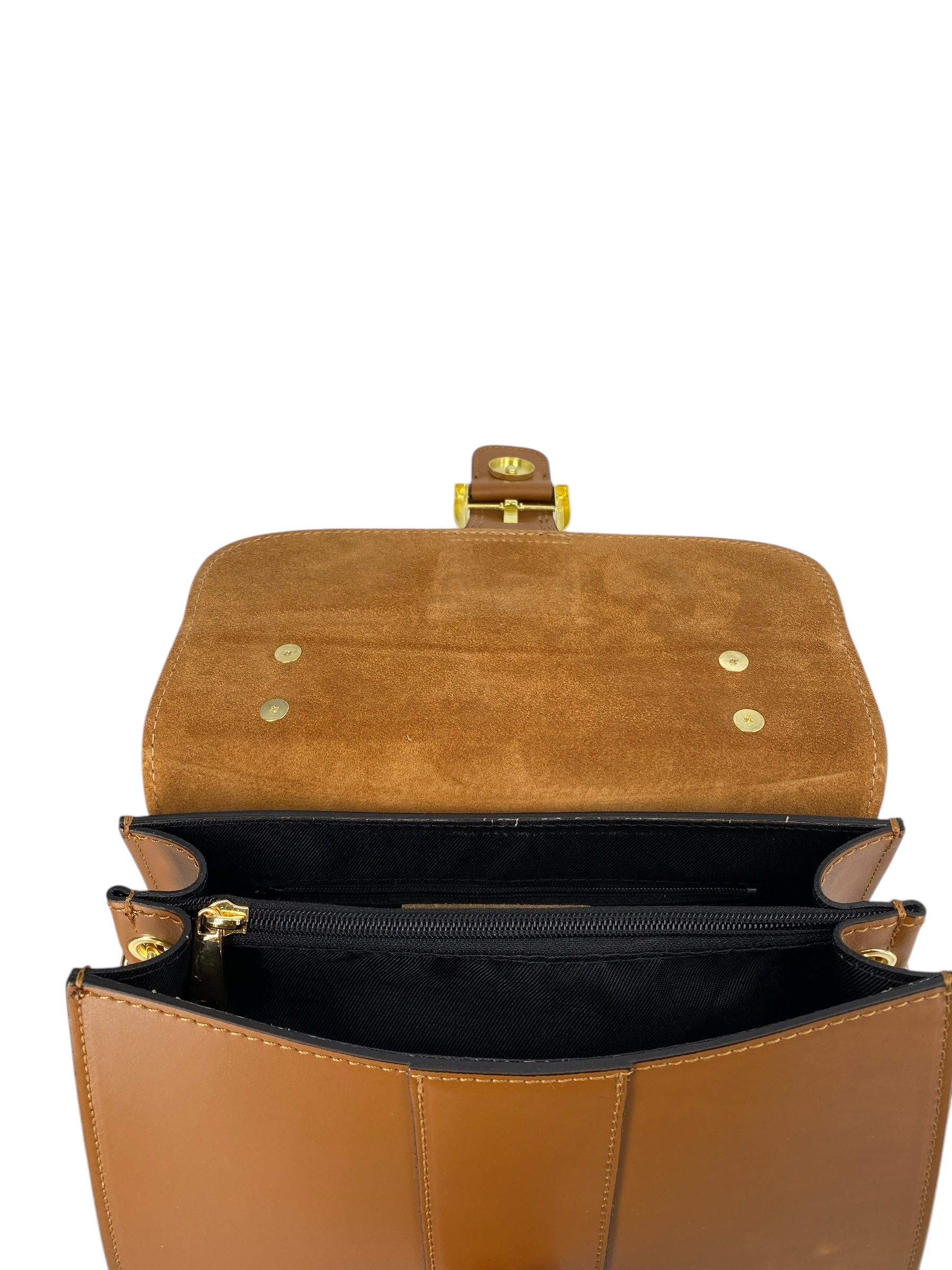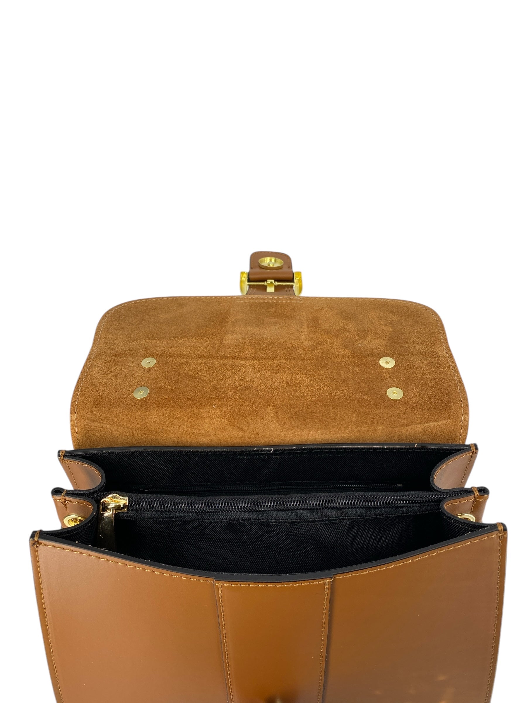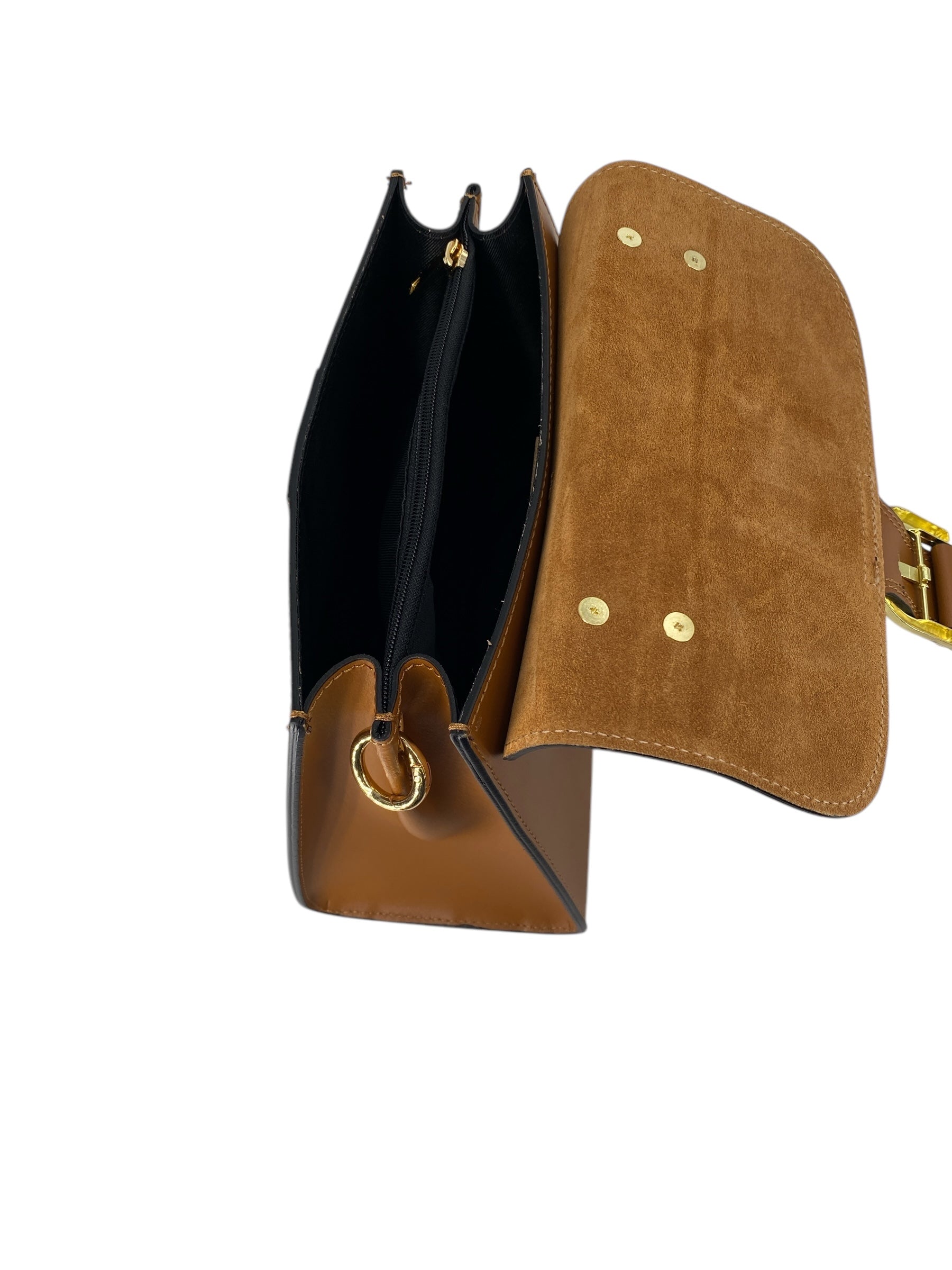 Chiusura: Patta frontale con iconica fibbia dorata a forma di arco, elemento distintivo che unisce funzionalità e stile.