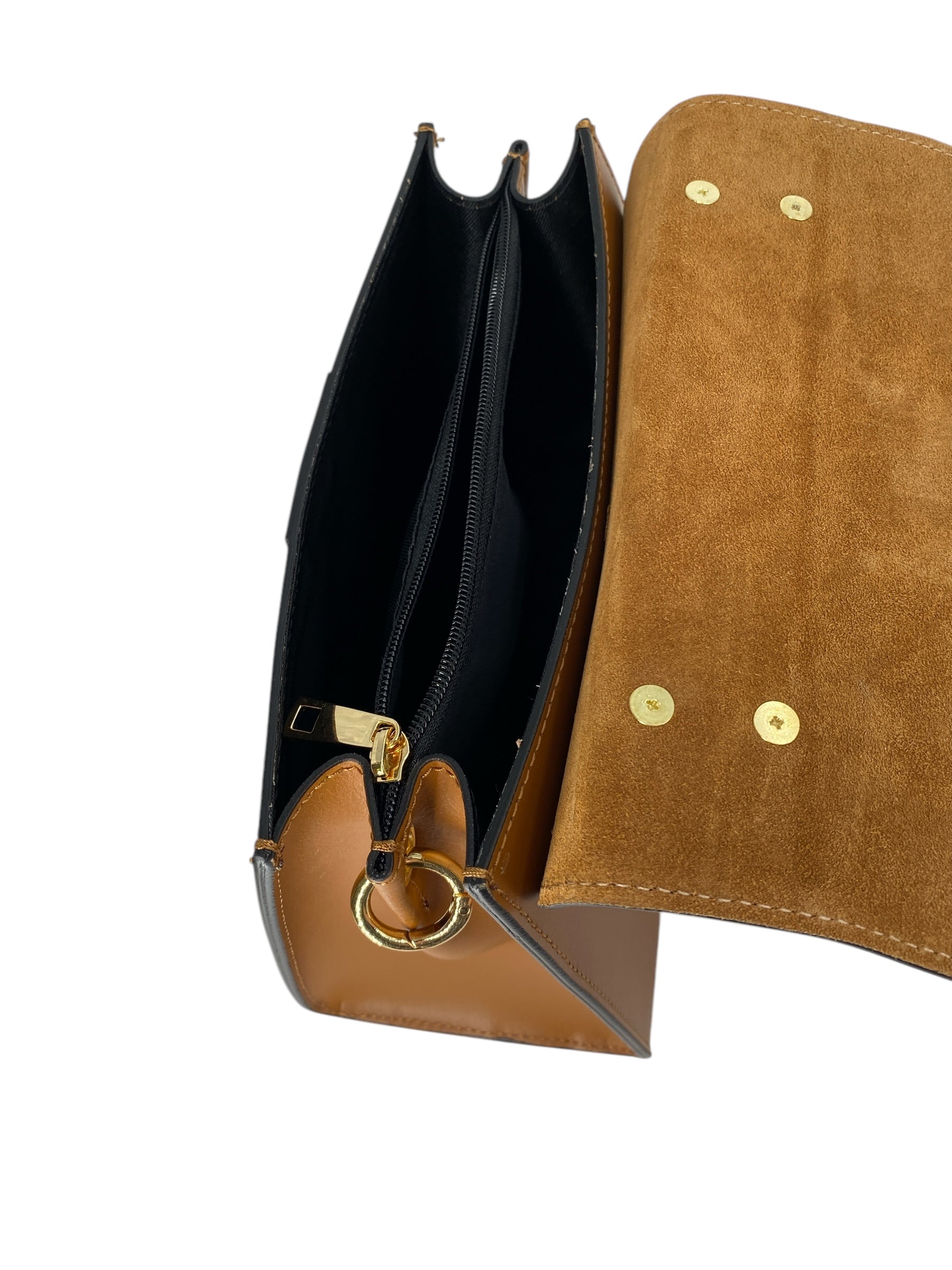 Interno: Foderato in tessuto nero resistente, con suddivisione a tre scomparti principali, di cui uno centrale con chiusura a zip. Ideale per organizzare portafoglio, telefono, chiavi e oggetti personali.