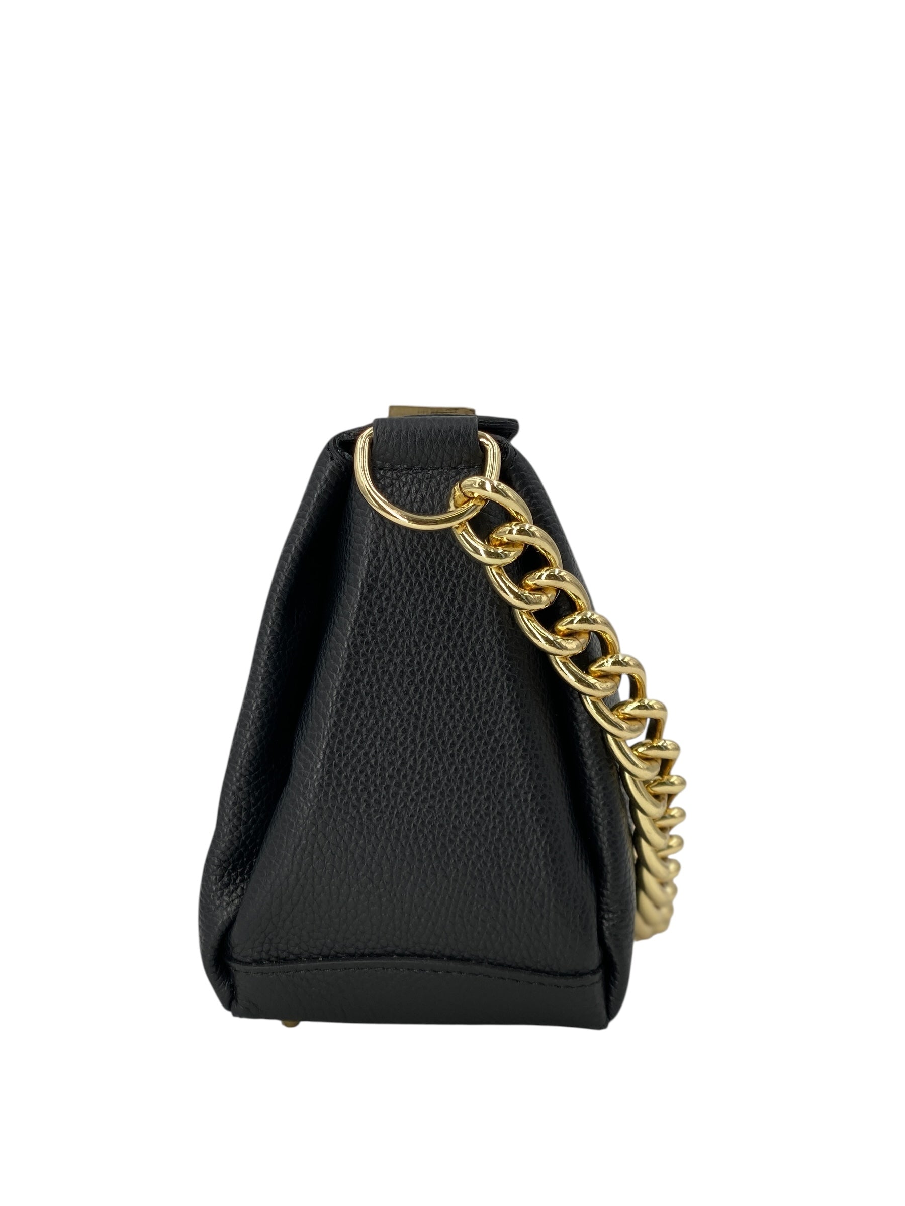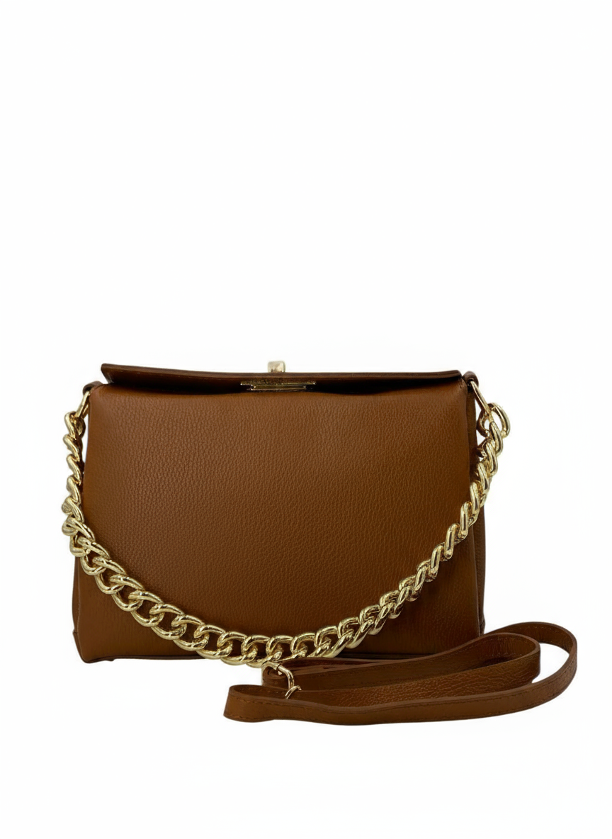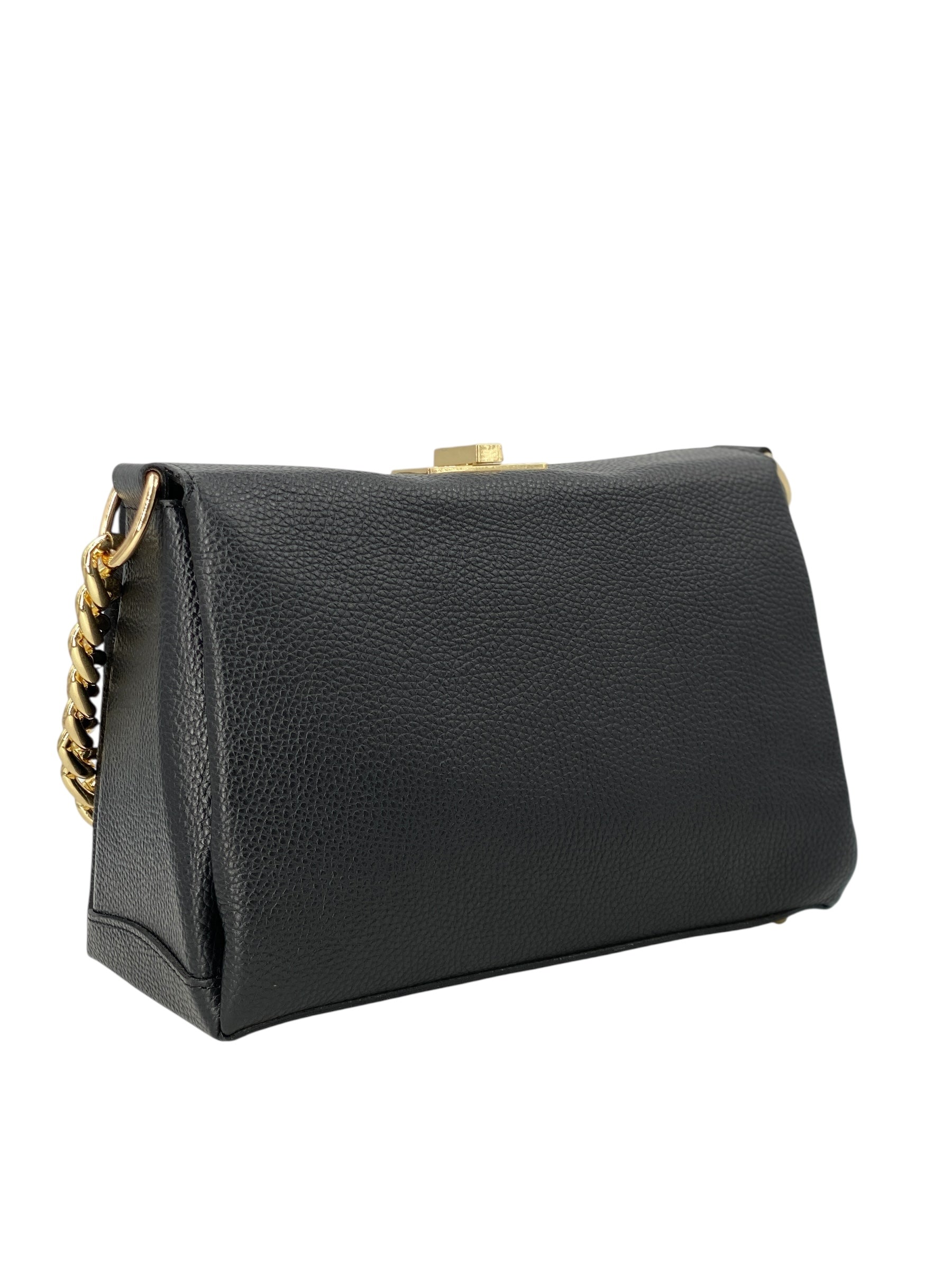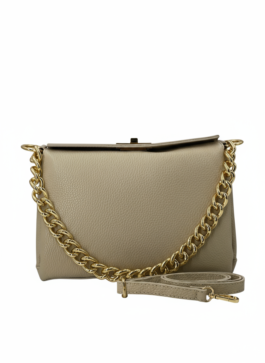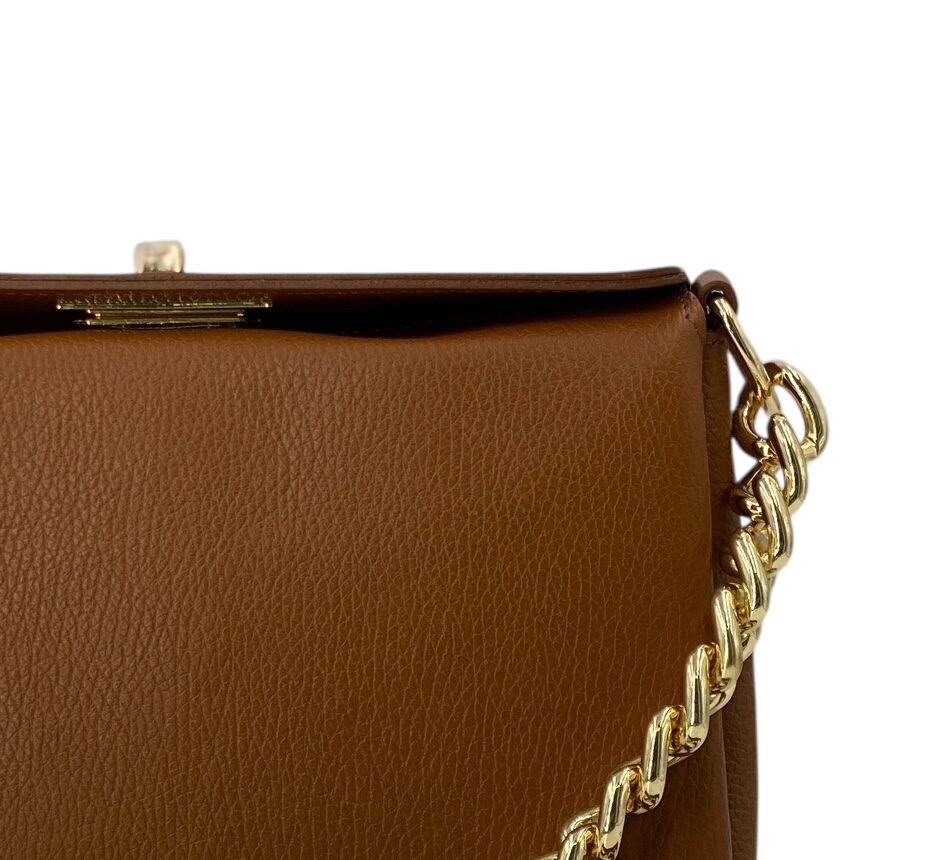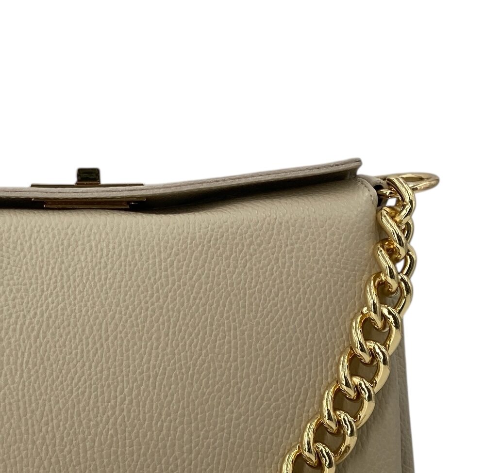 Il suo elemento distintivo è la catena dorata a maglia larga, elegante e luminosa, che può essere utilizzata come manico per portarla a mano, trasformando subito il look in un accessorio statement. In alternativa, la tracolla in pelle regolabile e removibile permette di indossarla comodamente a spalla o a crossbody, rendendola versatile per diverse occasioni.