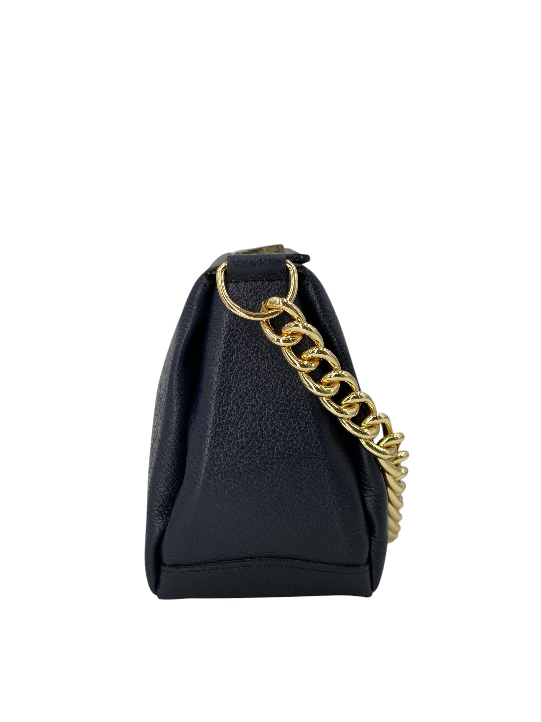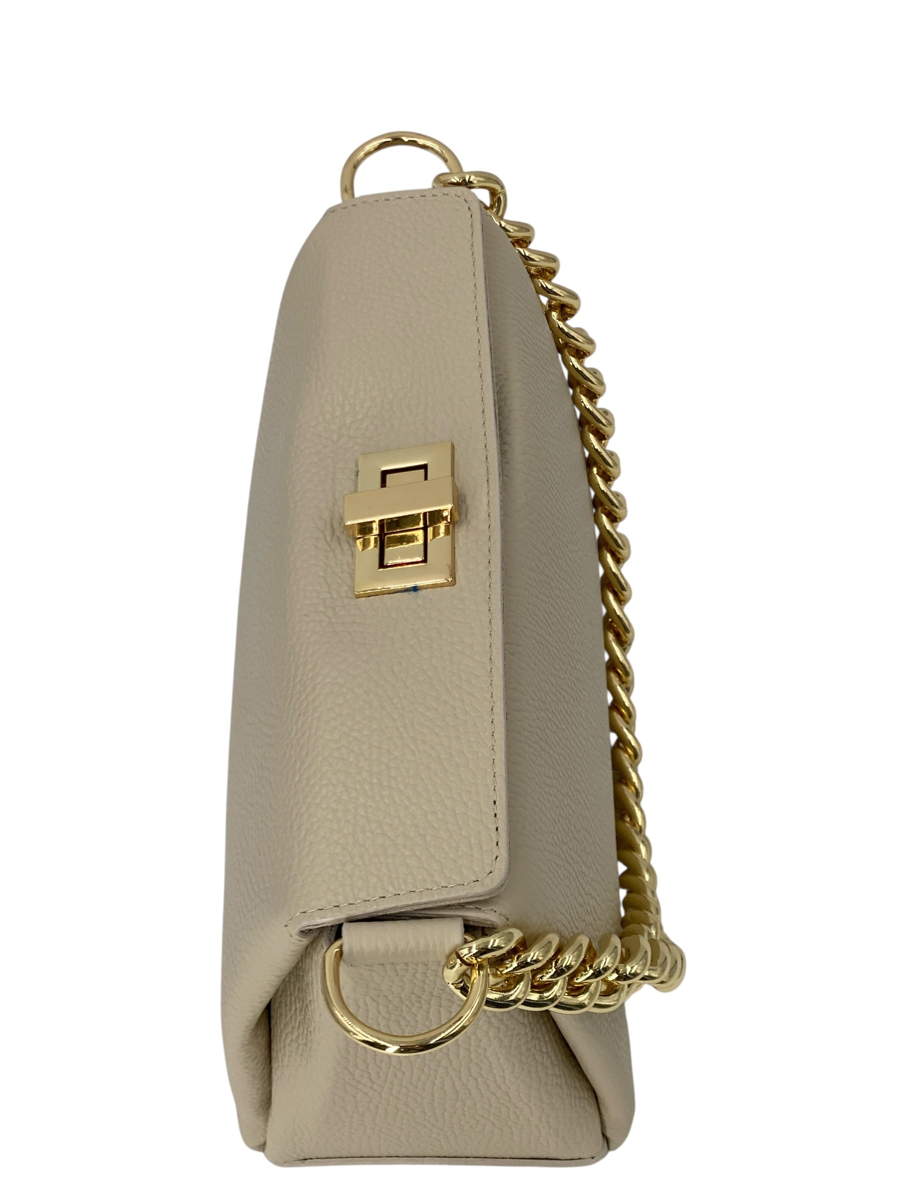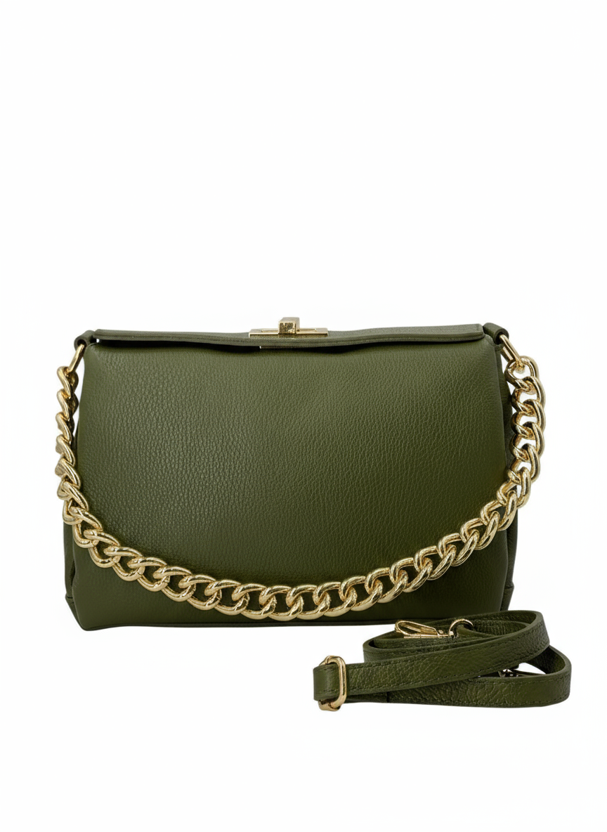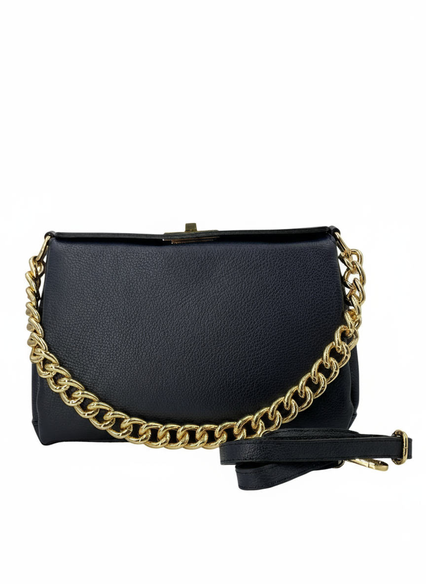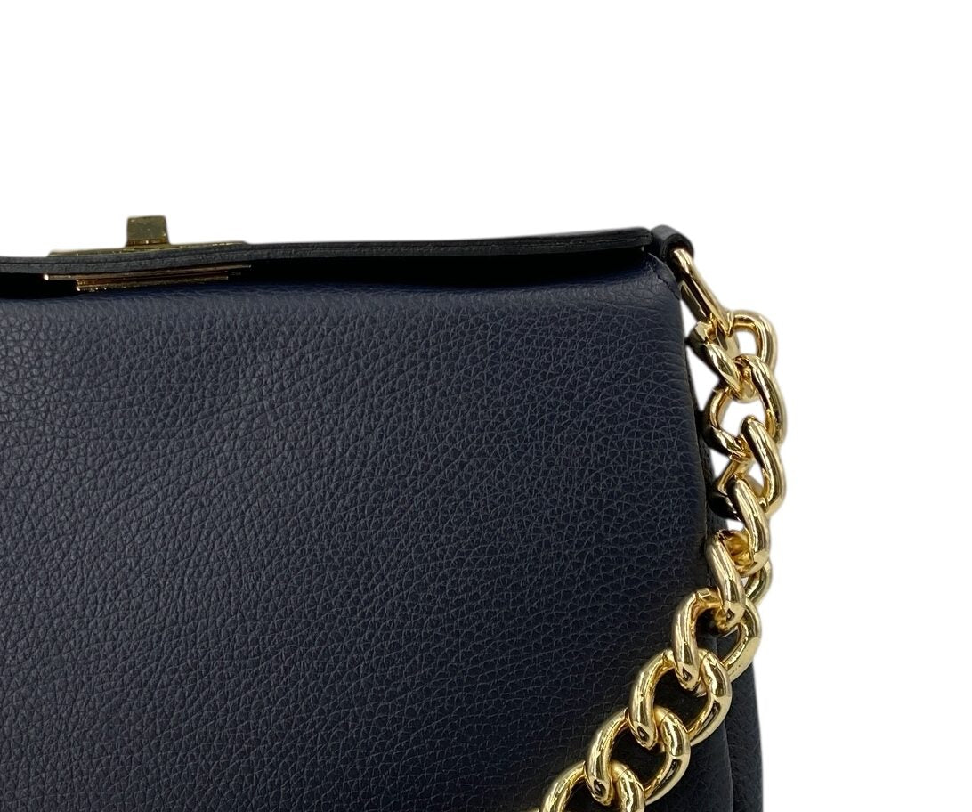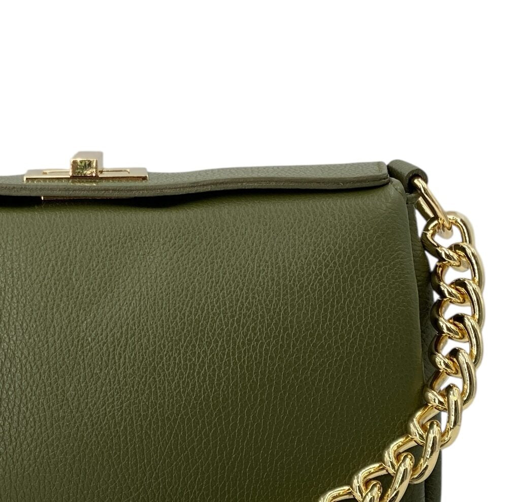 Il suo elemento distintivo è la catena dorata a maglia larga, elegante e luminosa, che può essere utilizzata come manico per portarla a mano, trasformando subito il look in un accessorio statement. In alternativa, la tracolla in pelle regolabile e removibile permette di indossarla comodamente a spalla o a crossbody, rendendola versatile per diverse occasioni.