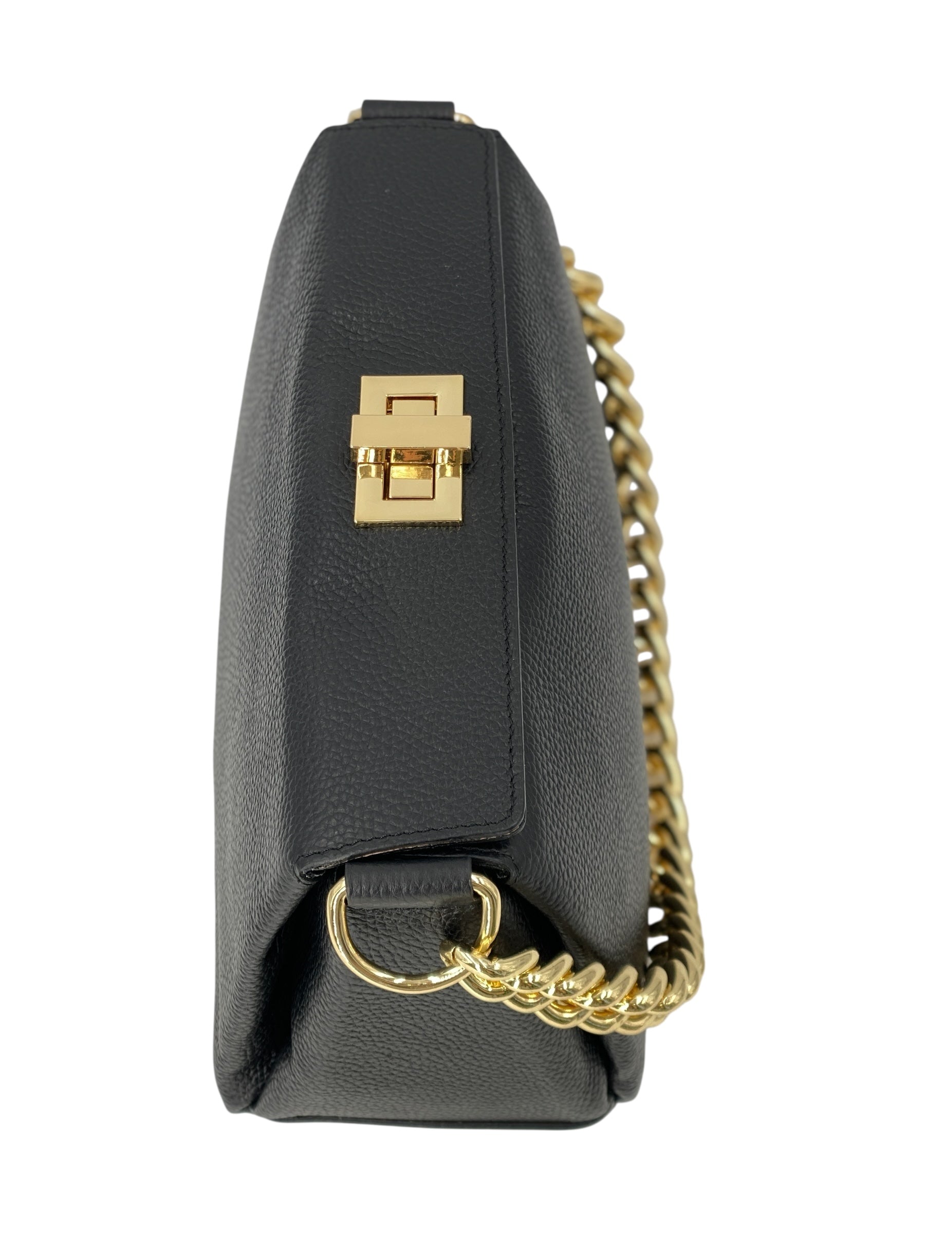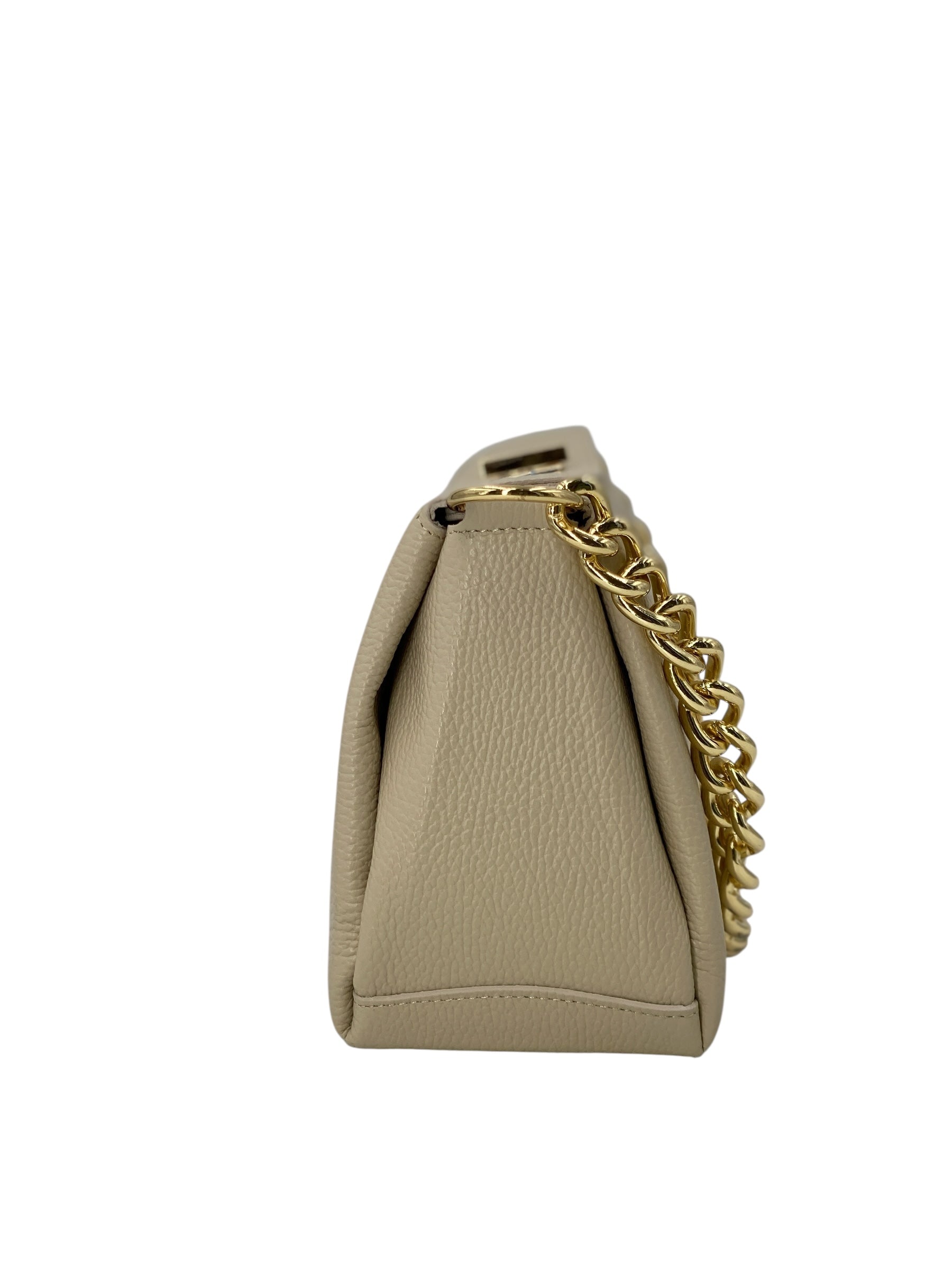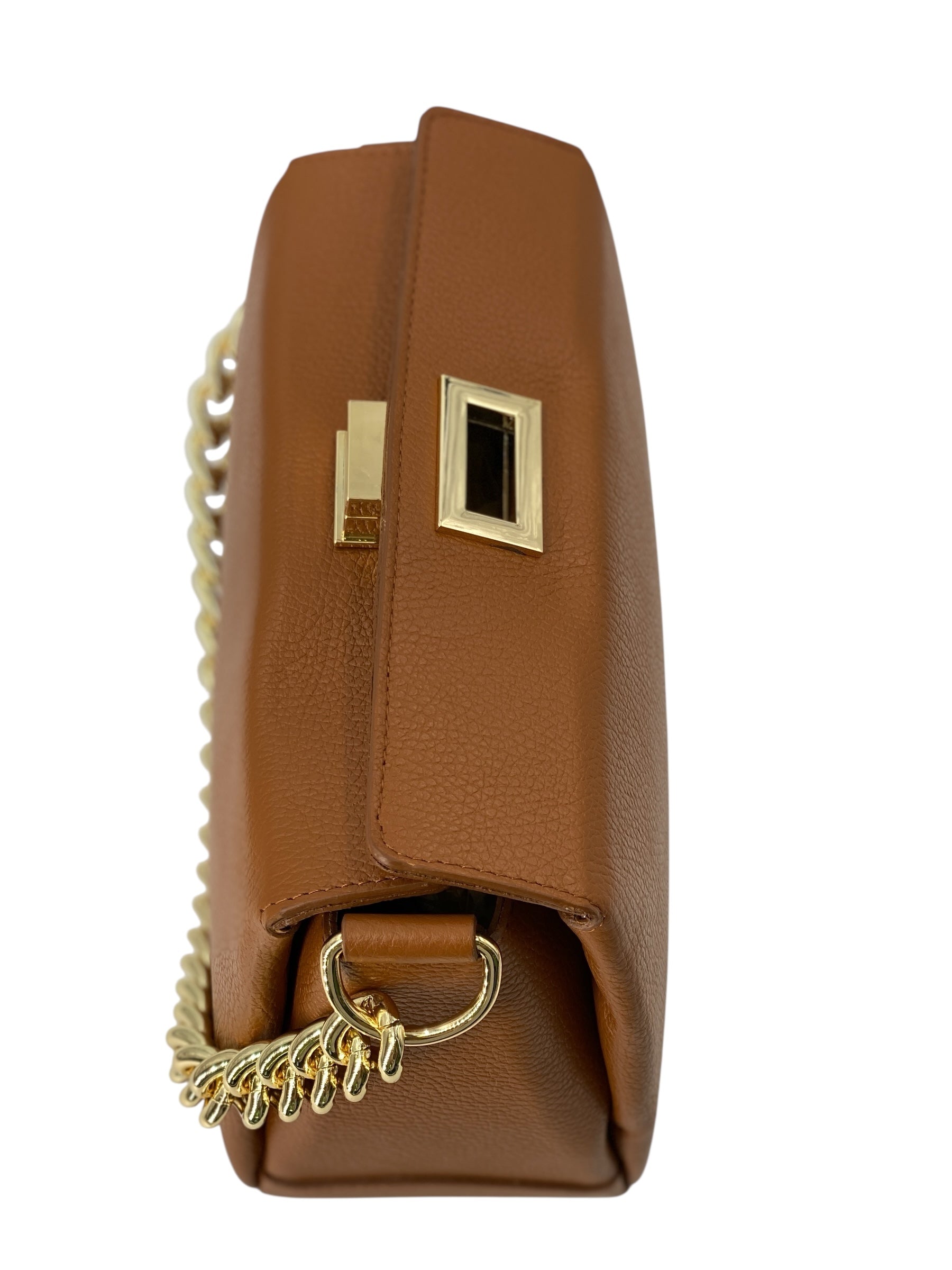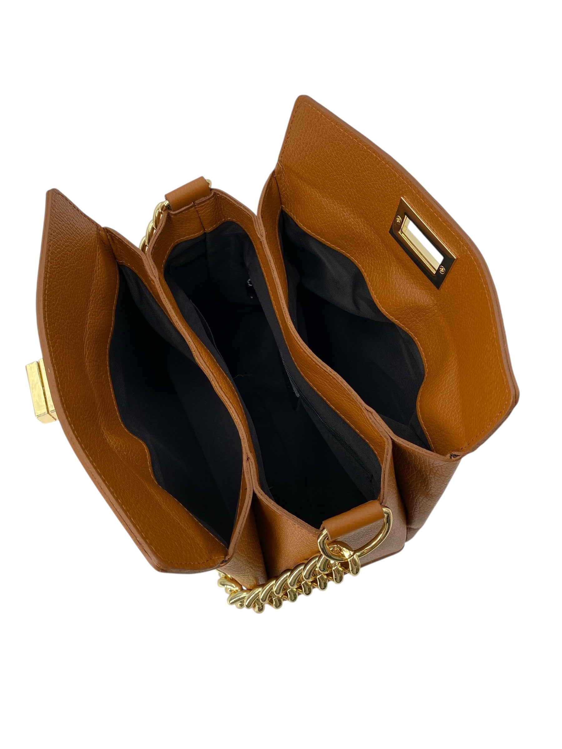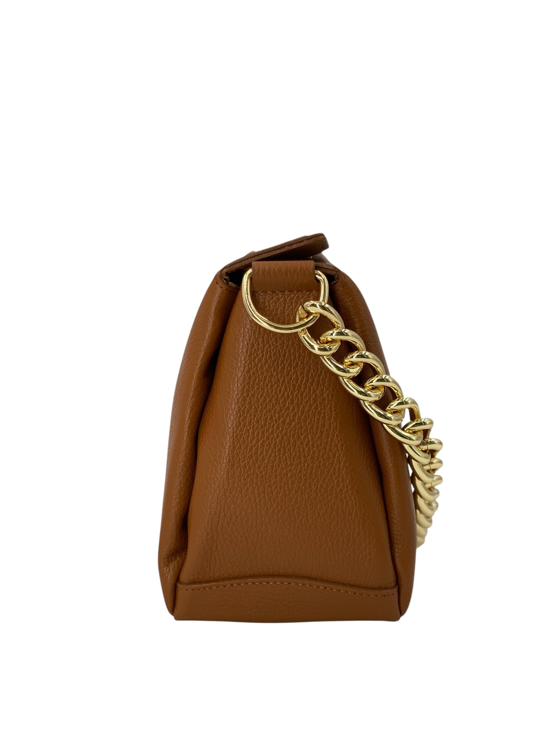 Il suo elemento distintivo è la catena dorata a maglia larga, elegante e luminosa, che può essere utilizzata come manico per portarla a mano, trasformando subito il look in un accessorio statement. In alternativa, la tracolla in pelle regolabile e removibile permette di indossarla comodamente a spalla o a crossbody, rendendola versatile per diverse occasioni.