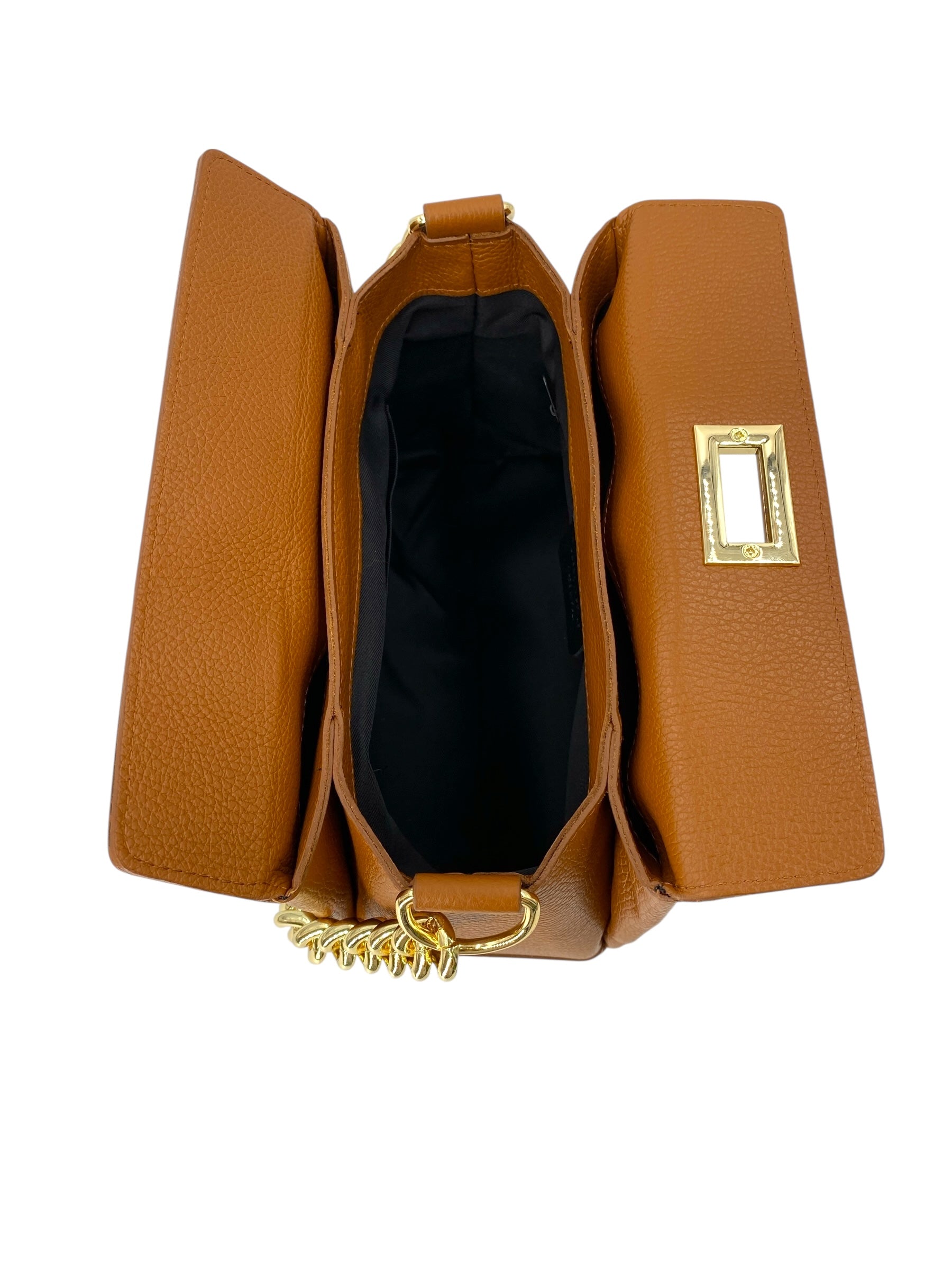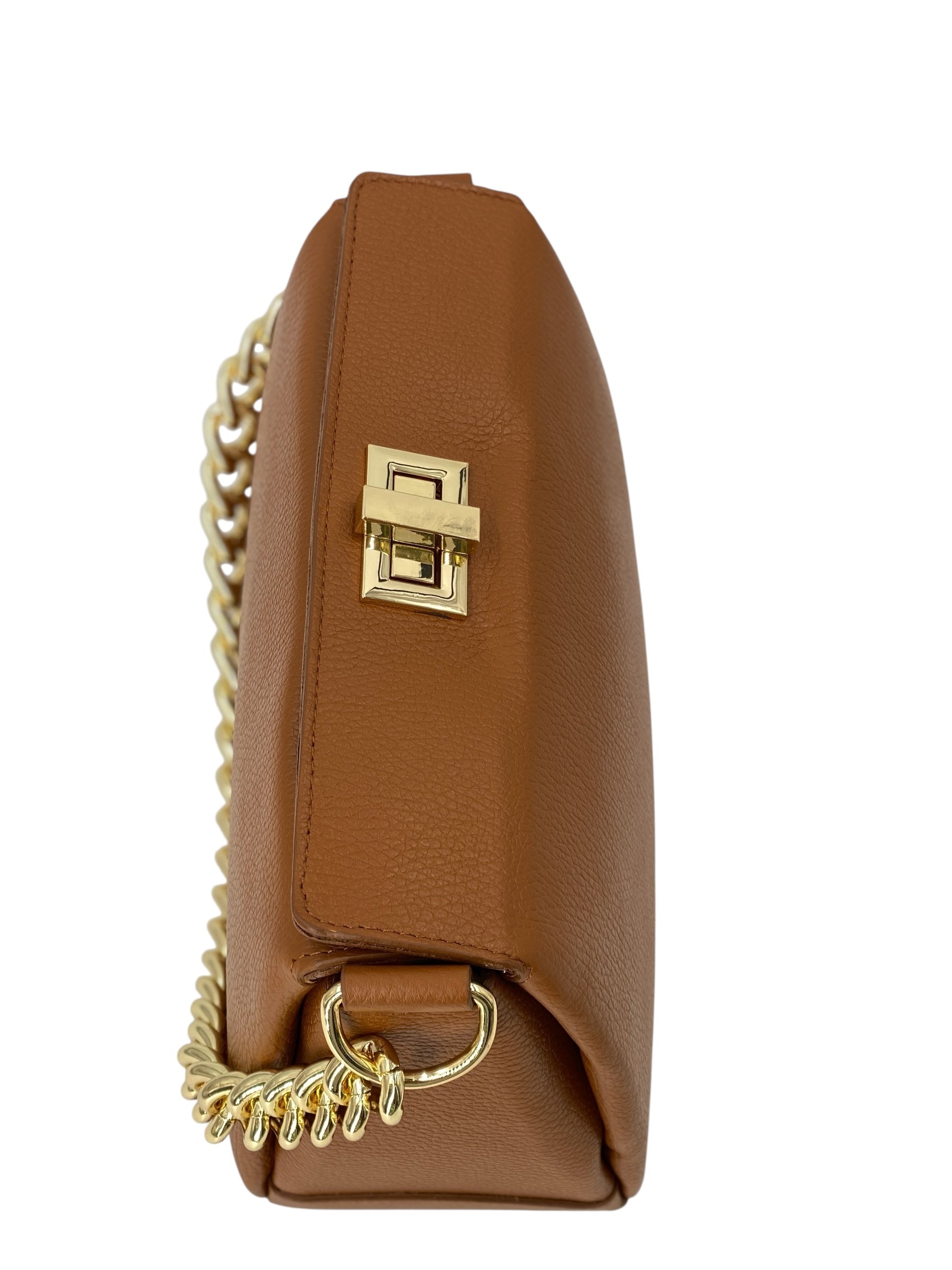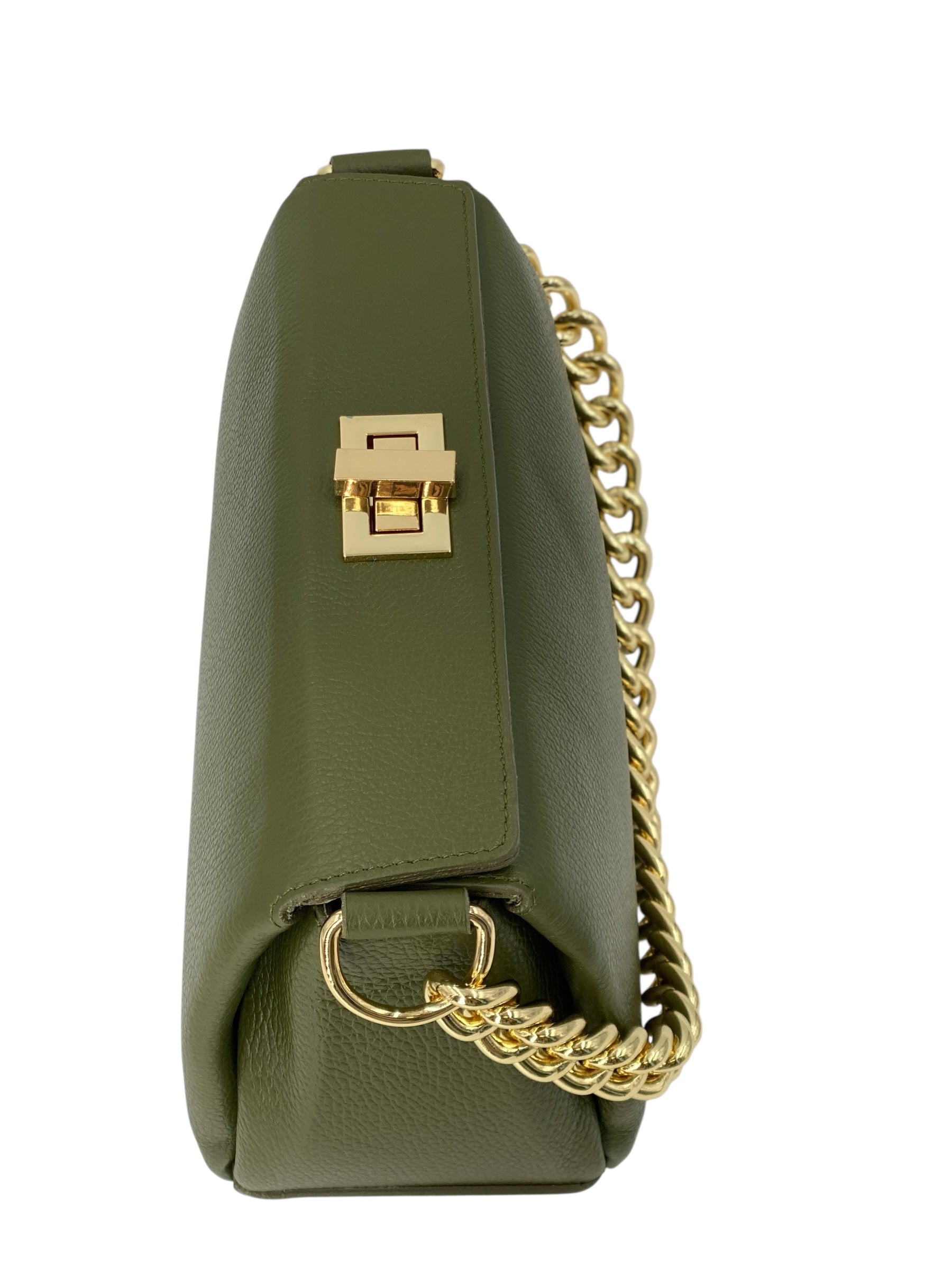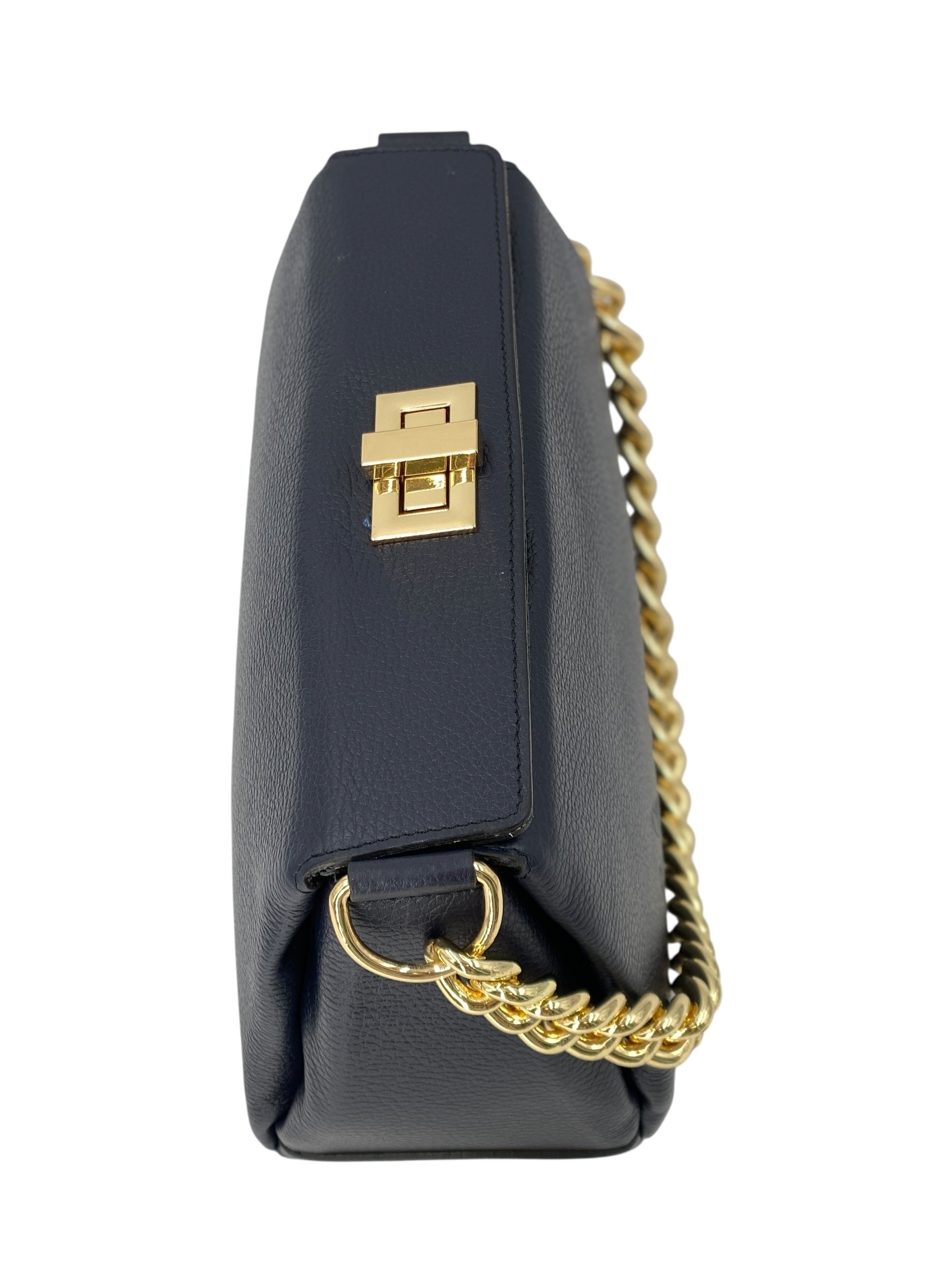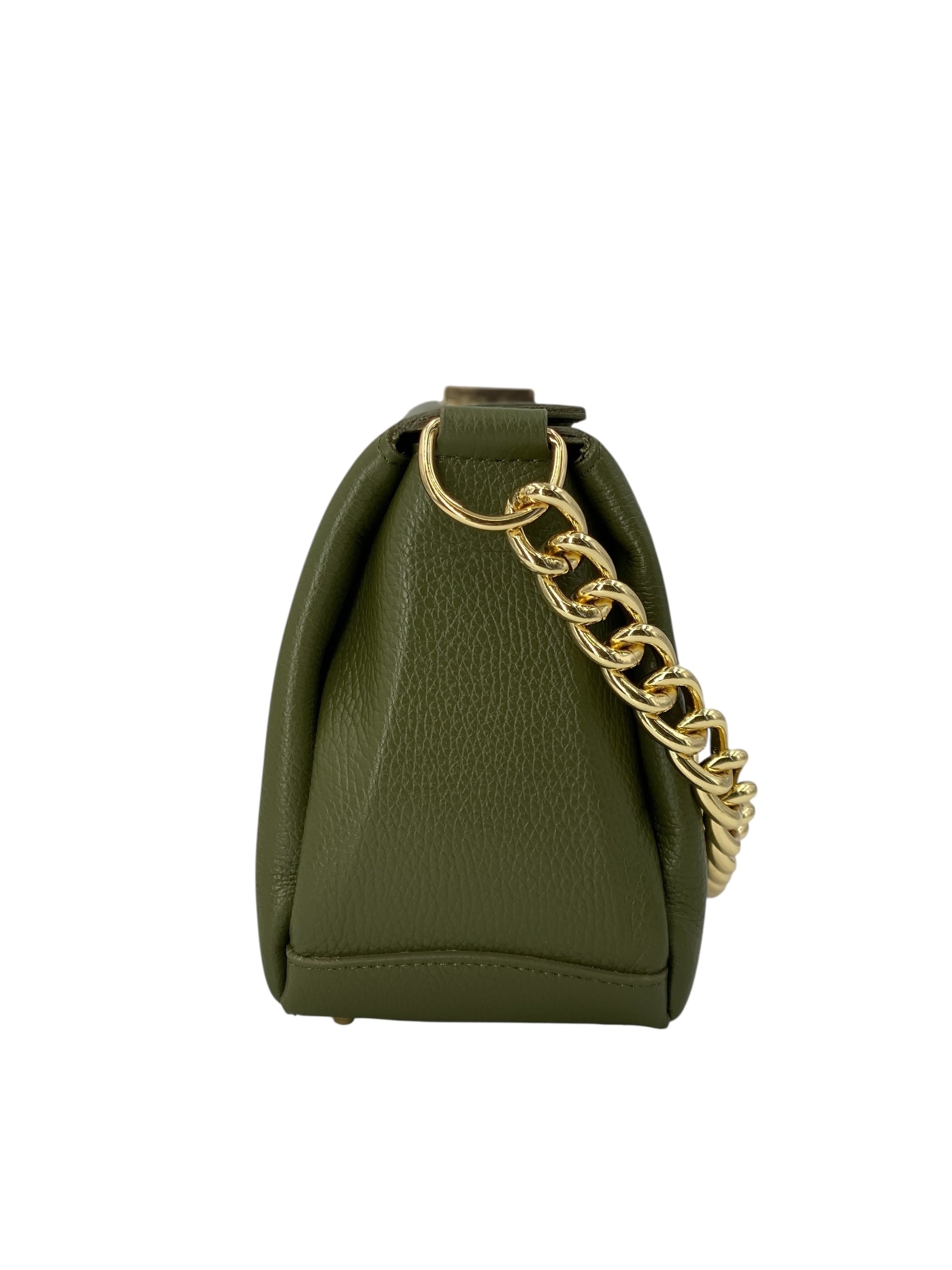Il suo elemento distintivo è la catena dorata a maglia larga, elegante e luminosa, che può essere utilizzata come manico per portarla a mano, trasformando subito il look in un accessorio statement. In alternativa, la tracolla in pelle regolabile e removibile permette di indossarla comodamente a spalla o a crossbody, rendendola versatile per diverse occasioni.