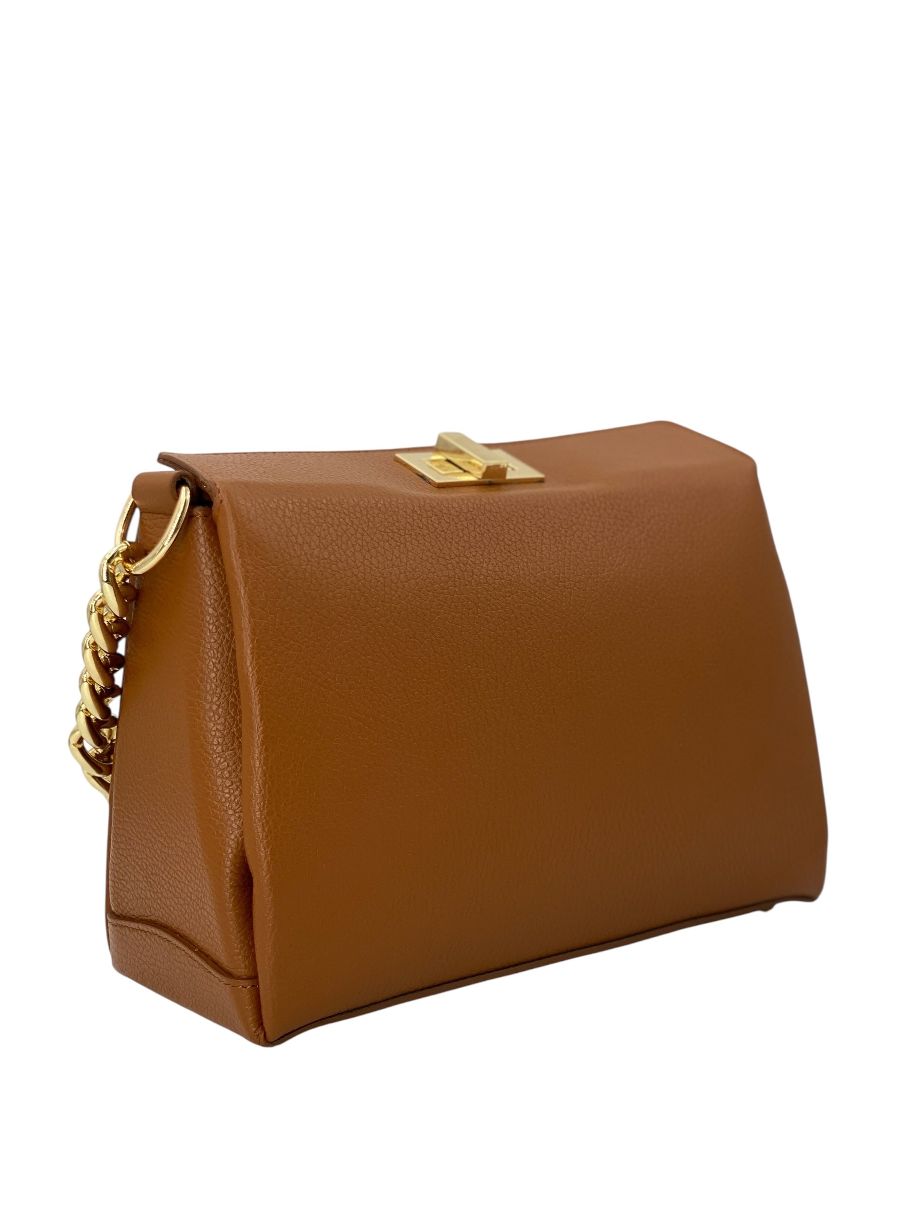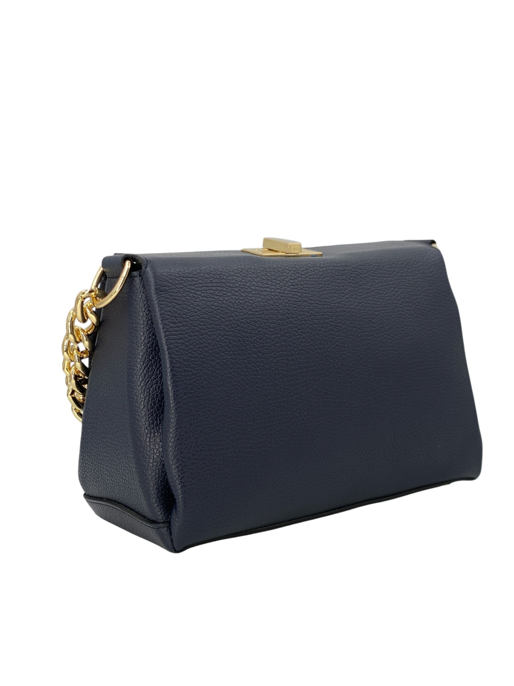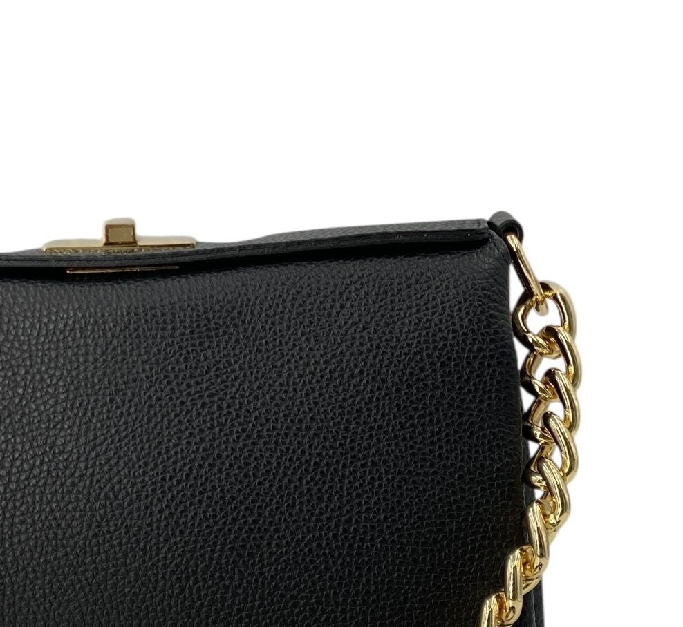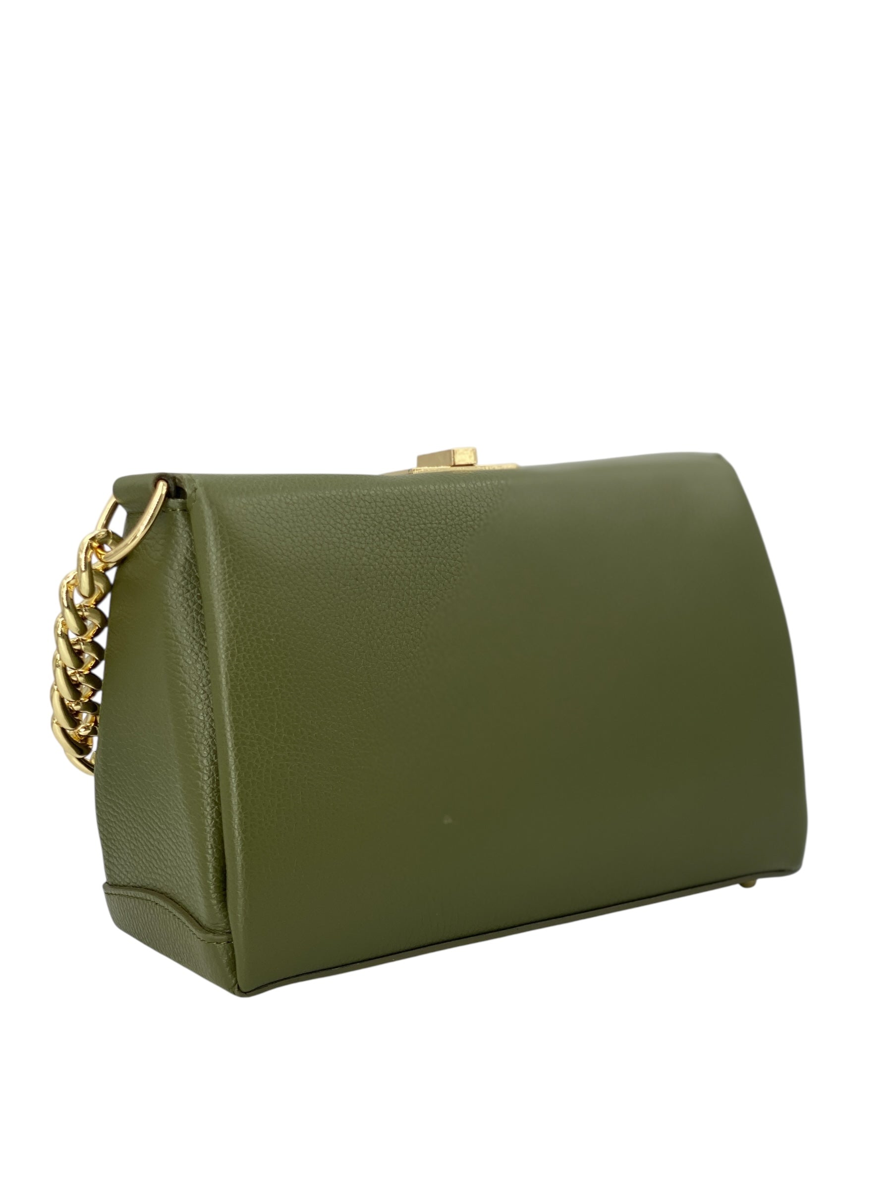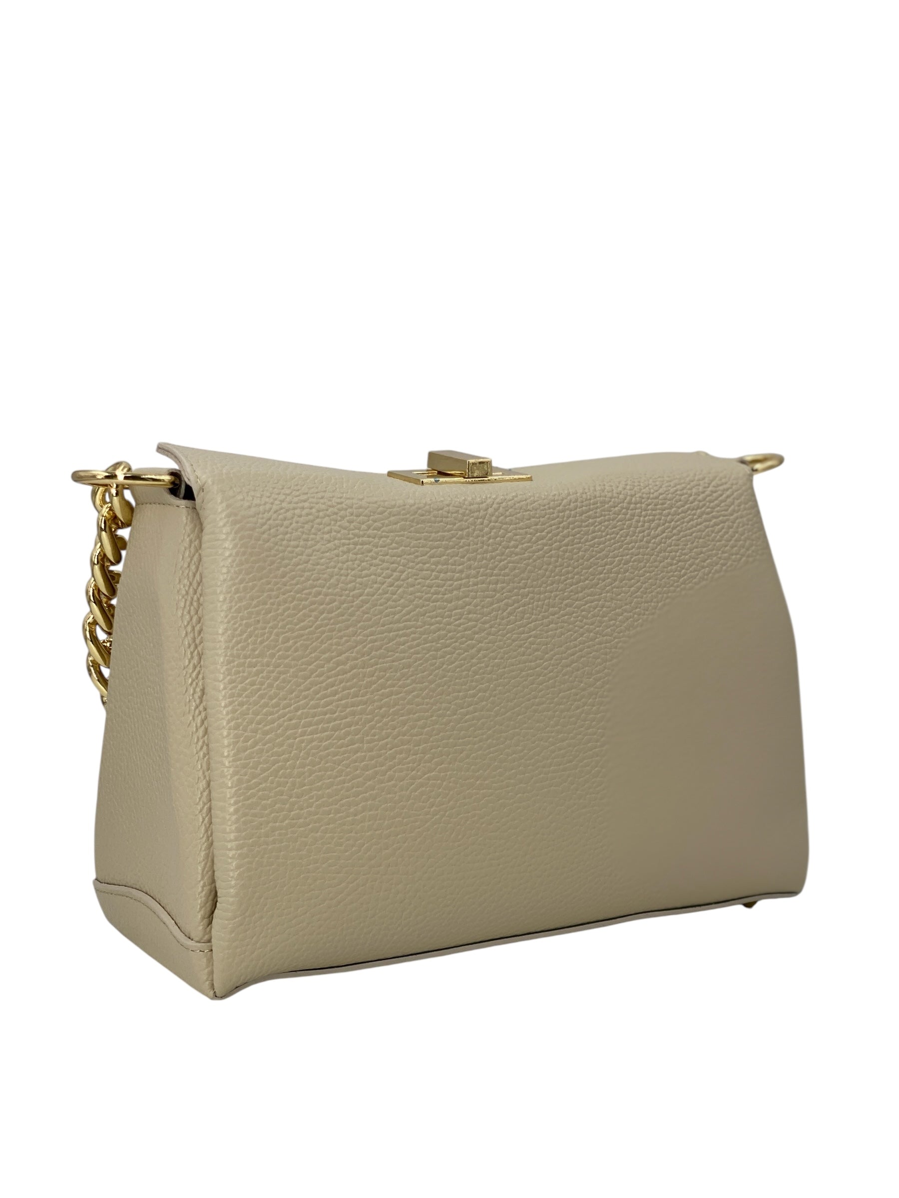Il suo elemento distintivo è la catena dorata a maglia larga, elegante e luminosa, che può essere utilizzata come manico per portarla a mano, trasformando subito il look in un accessorio statement. In alternativa, la tracolla in pelle regolabile e removibile permette di indossarla comodamente a spalla o a crossbody, rendendola versatile per diverse occasioni.