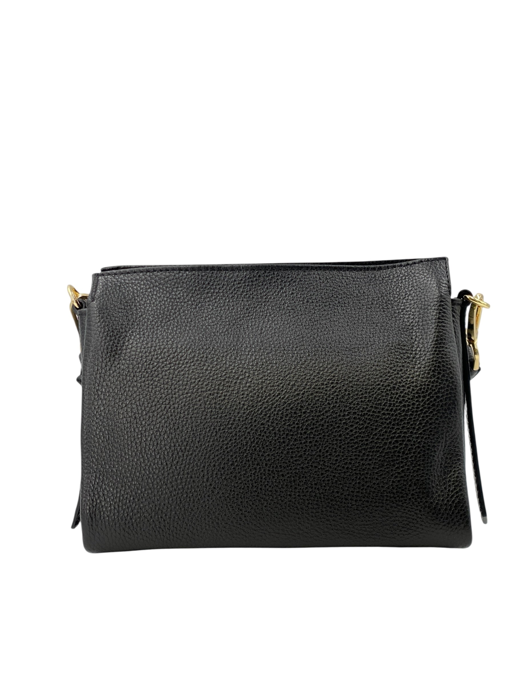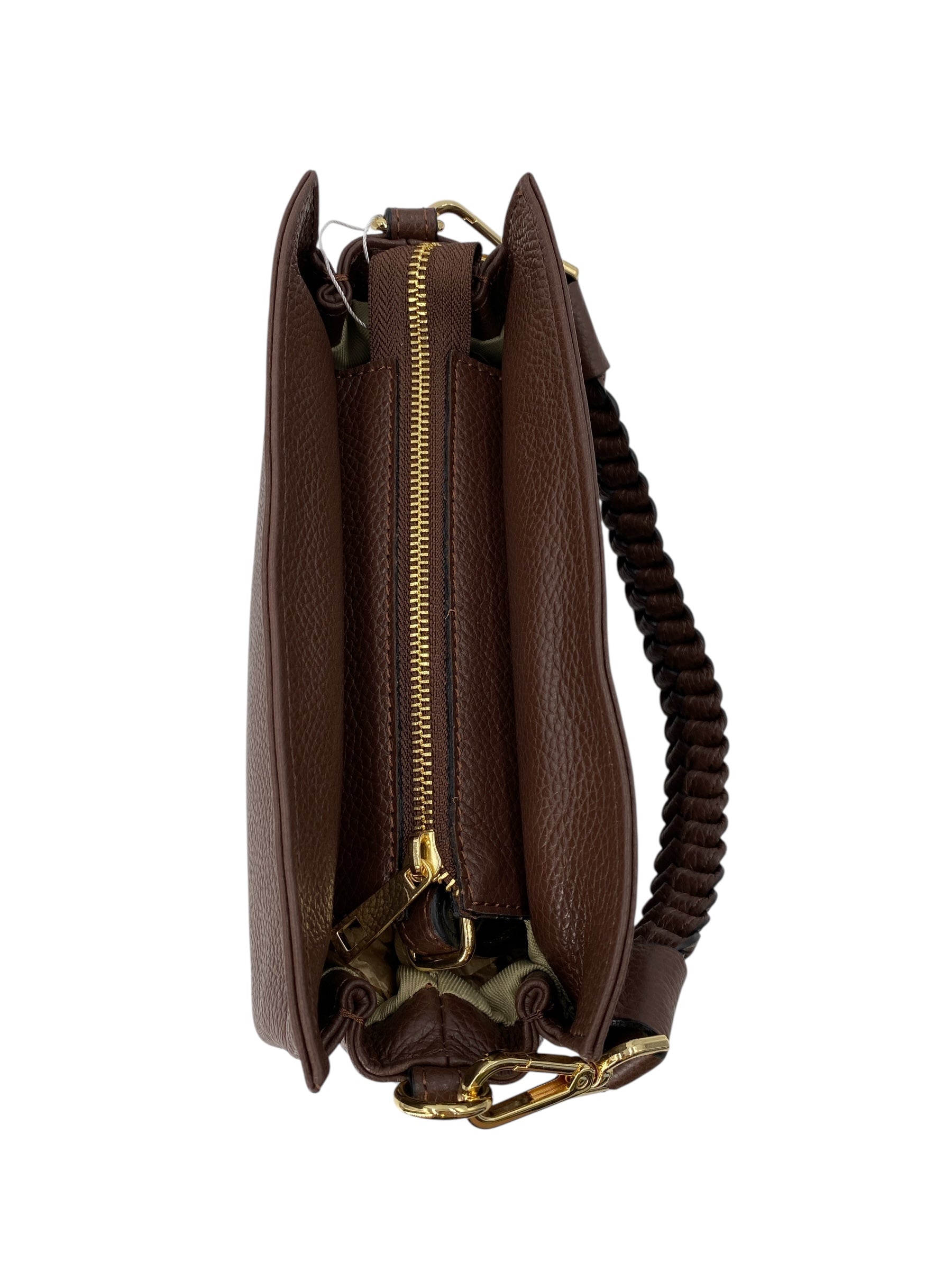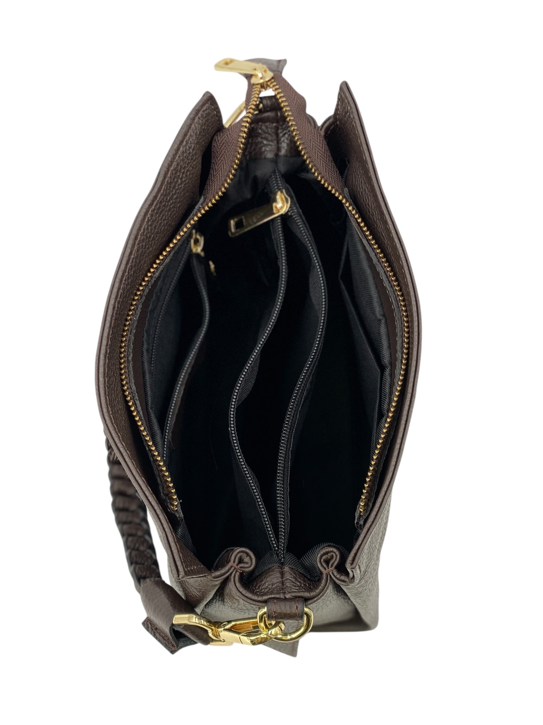 Chiusura esterna principale: zipper in metallo dorato, fluida e sicura, valorizzata da eleganti finiture e moschettoni lucidi.