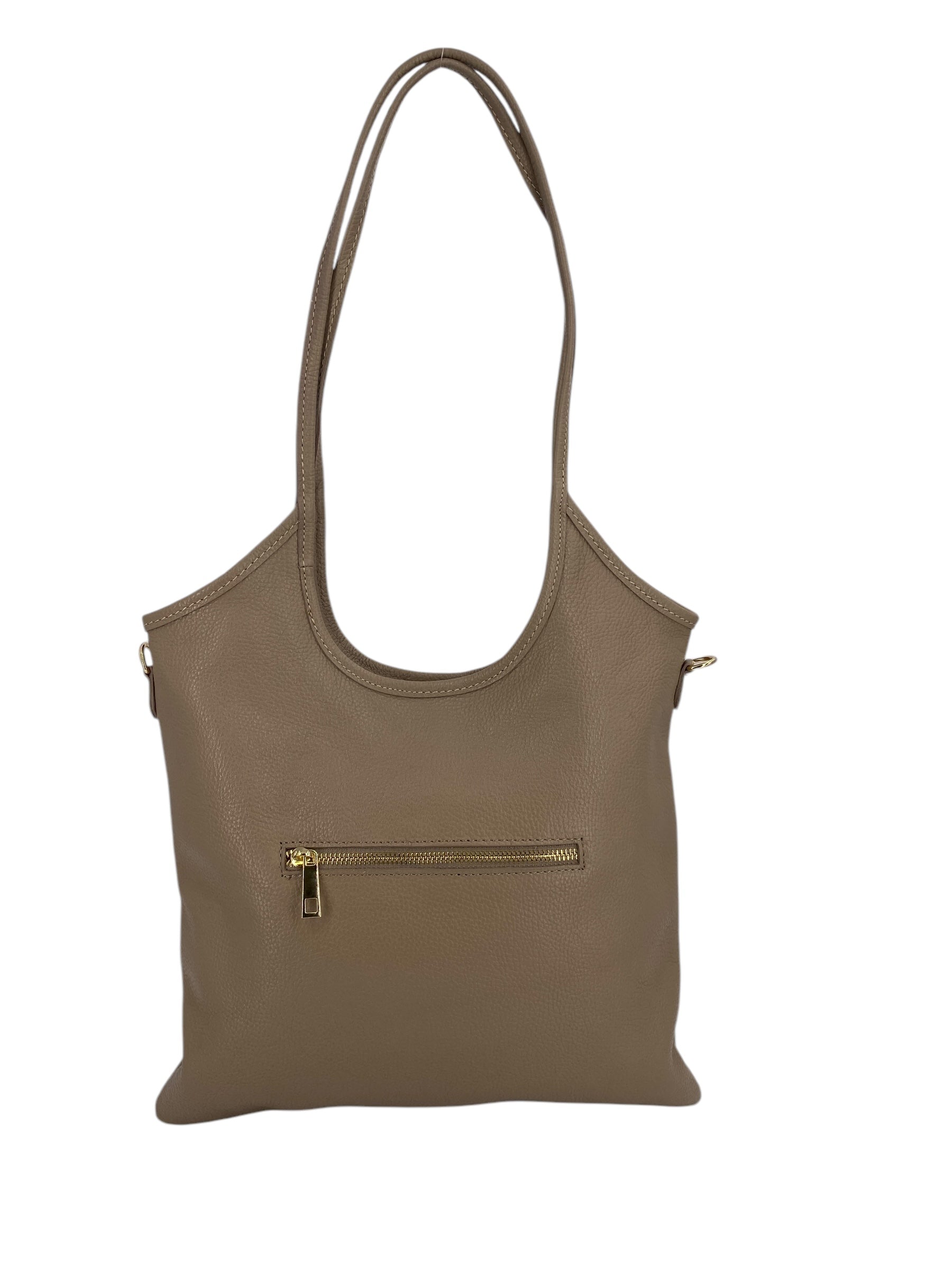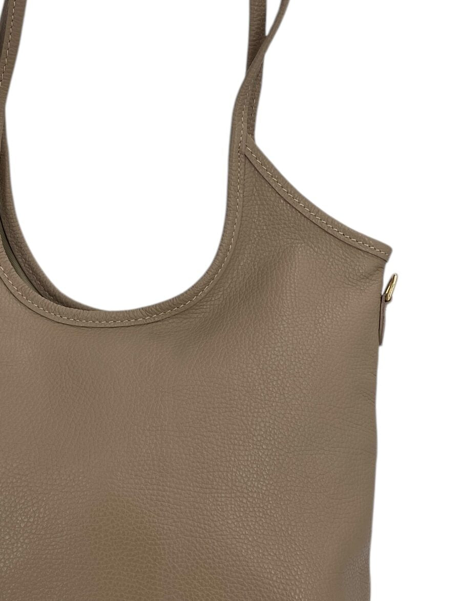 Materiale: Realizzata in morbida pelle di vitello, Made in Italy, dalla texture leggermente martellata e piacevole al tatto. Il colore taupe regala versatilità e raffinatezza, facilmente abbinabile a ogni outfit.