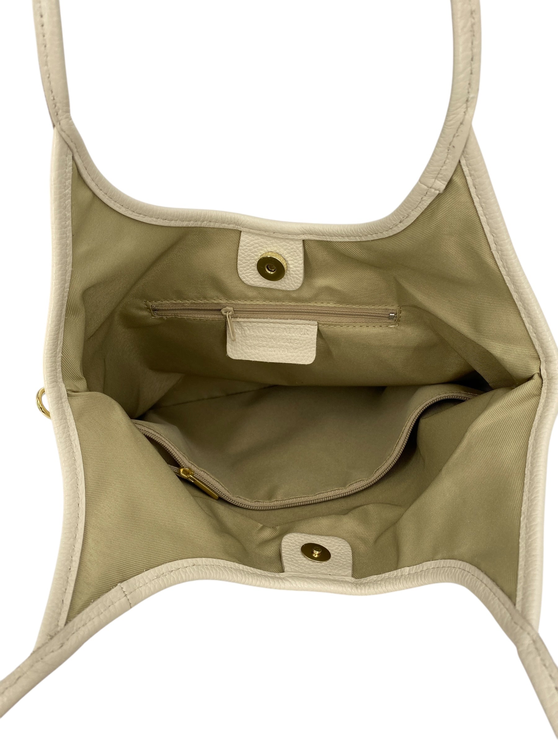 Grazie ai doppi manici lunghi, può essere indossata comodamente a spalla, garantendo praticità senza rinunciare allo stile. La forma morbida ma strutturata ne esalta la funzionalità, permettendo di contenere tutto l’essenziale quotidiano senza appesantire il look.